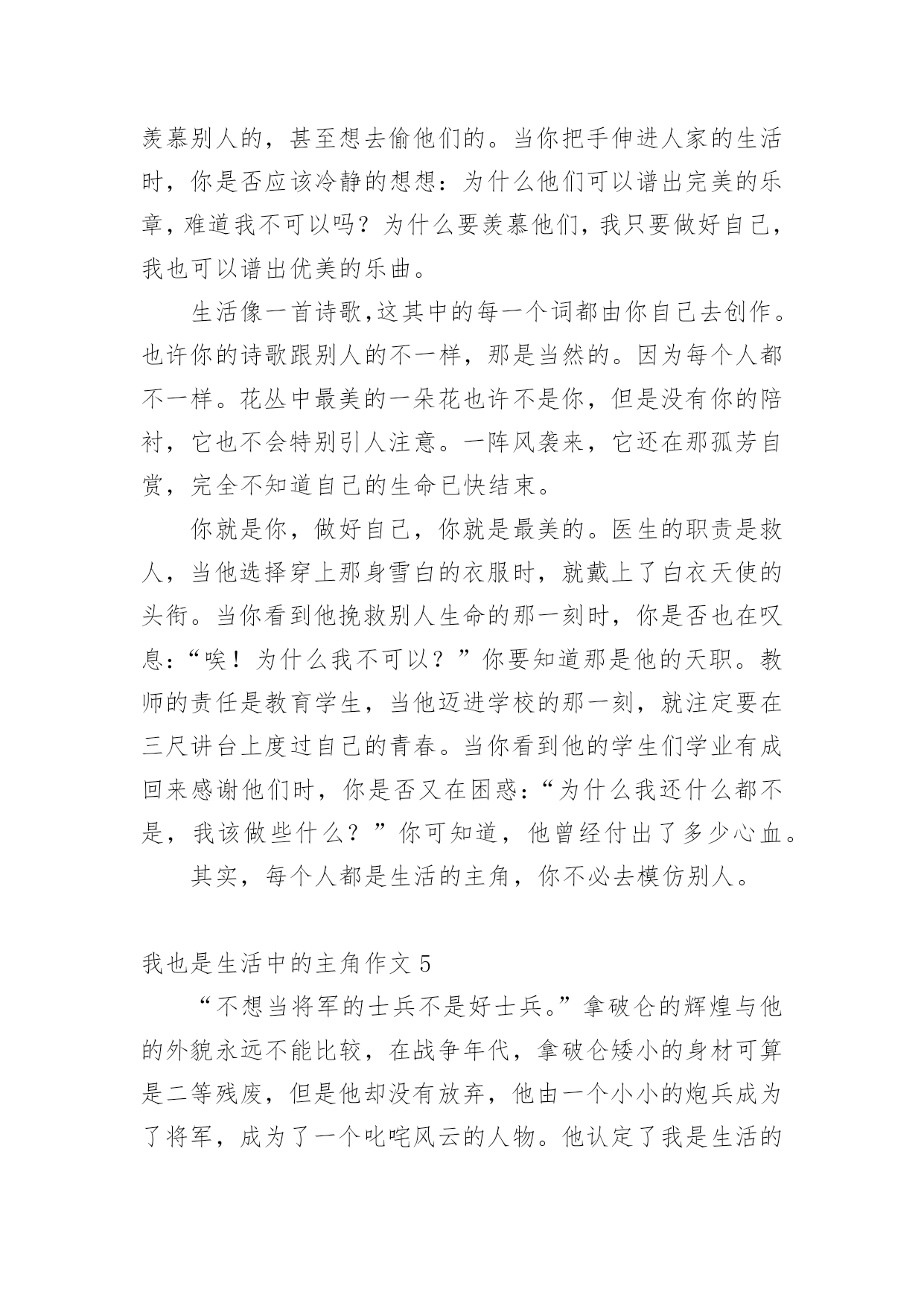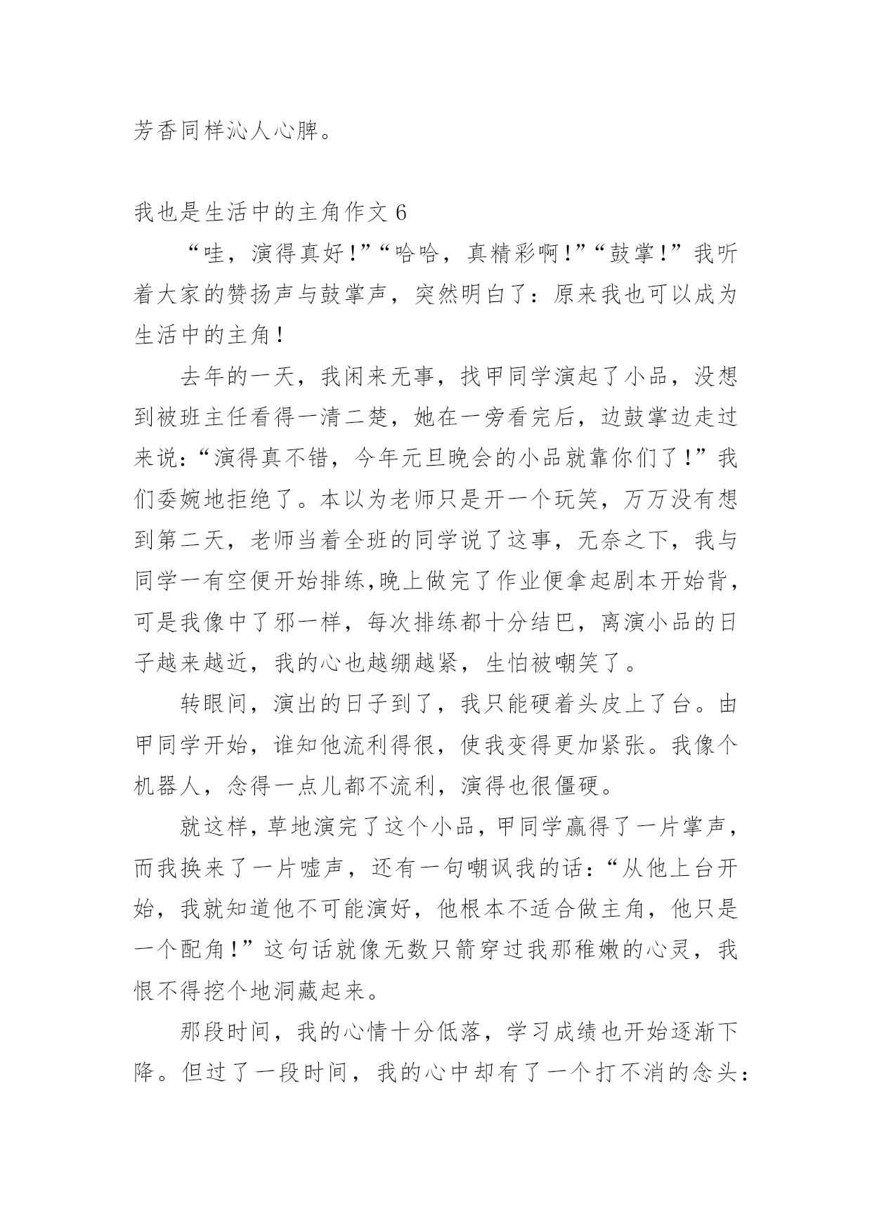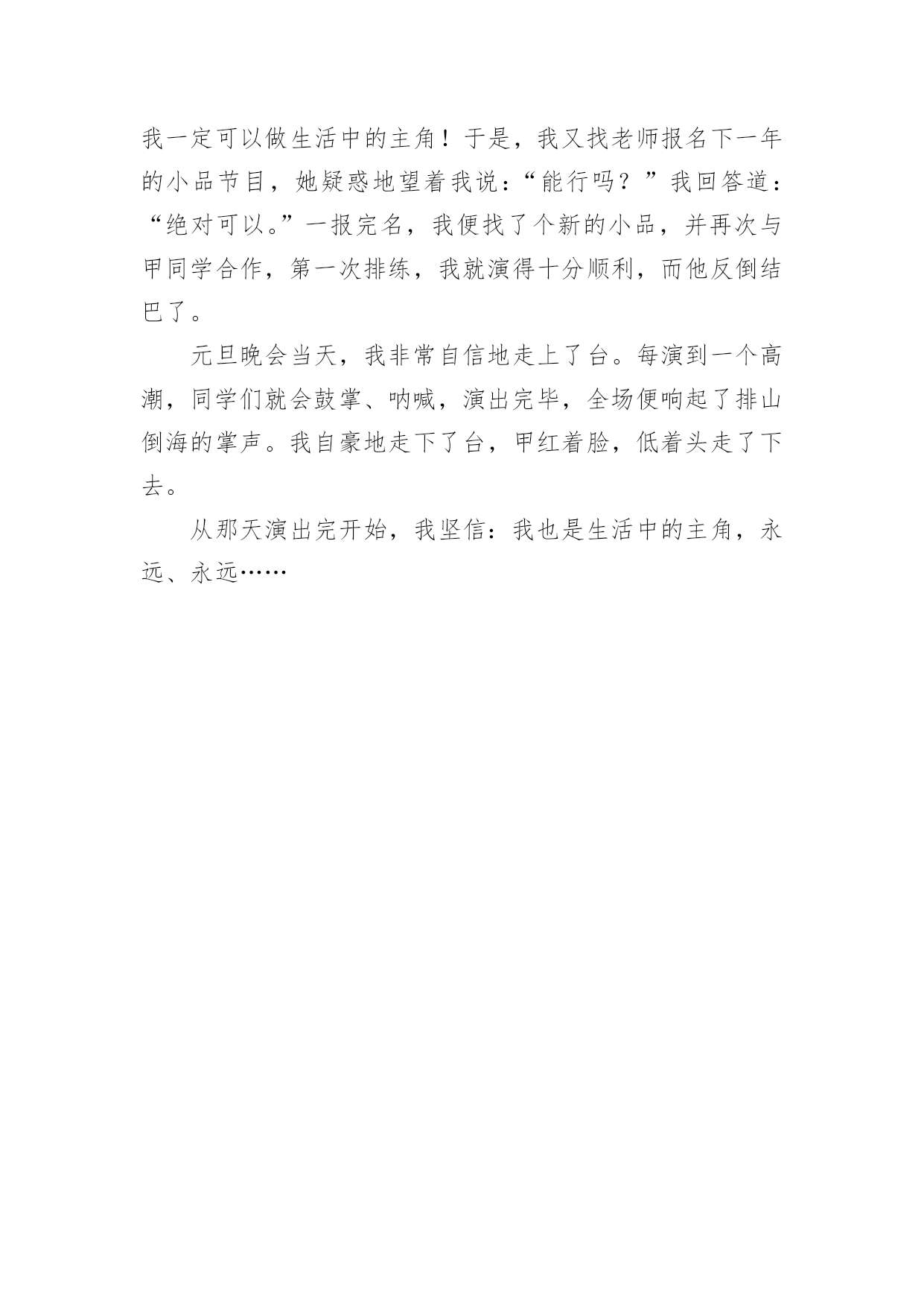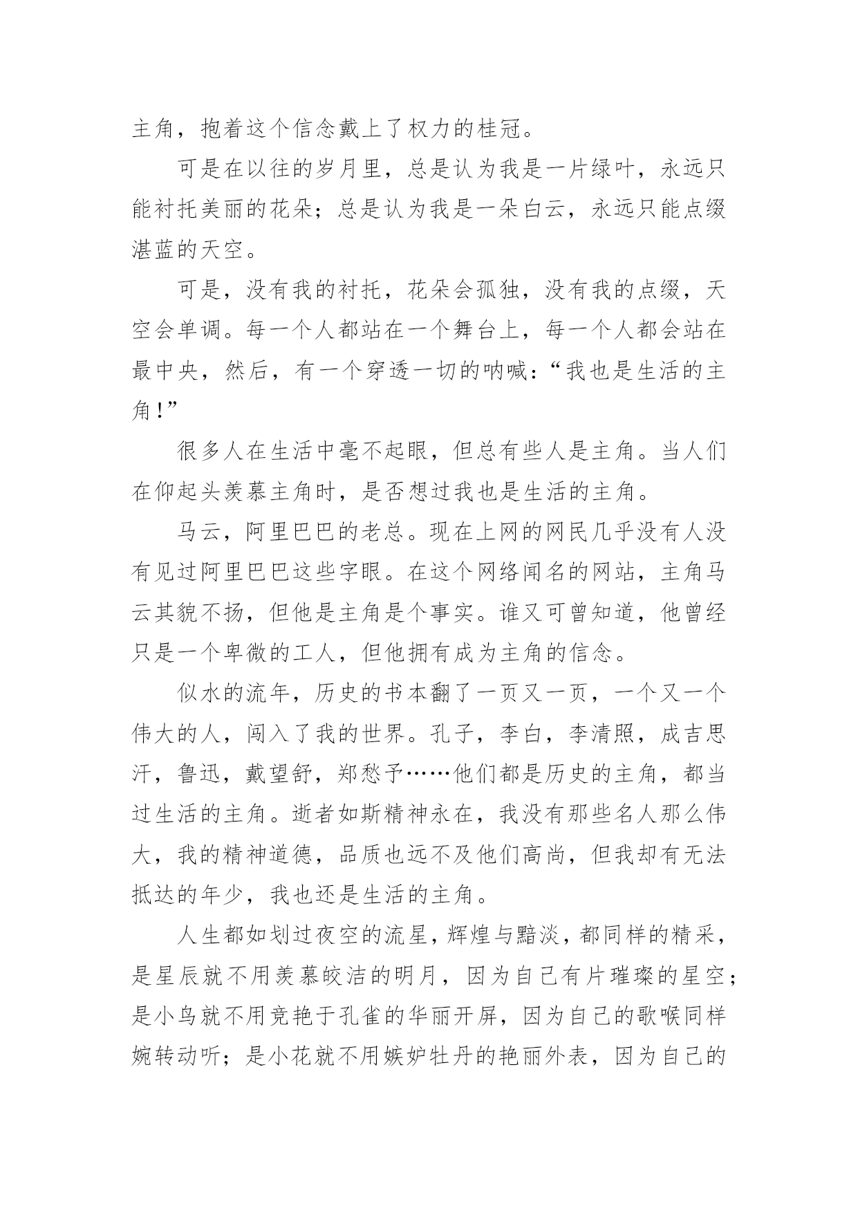 我也是生活中的主角作文我也是生活中的主角作文(6篇)在日常学习、工作抑或是生活中,大家对作文都不陌生吧,作文是由文字组成,经过人的思想考虑,通过语言组织来表达一个主题意义的文体。你知道作文怎样写才规范吗?下面是小编为大家收集的我也是生活中的主角作文,希望对大家有所帮助。我也是生活中的主角作文1时光匆匆,我从初一进入了初二。初二时,我逐渐懂事,懂得的道理多了,当然,受到的挫折也多了,这是我们蜕变的过程。逐渐,我们变得自信,变得敢拼。“失败是成功之母”,没有挫折,哪来得成功?老师在讲台上说道,一阵微风吹过,她的头发飘飘然的,明天轮到我演讲了,而我还没有准备课件,心里这样想着,不禁打了个寒战。回去后,心里郁郁寡欢,我做完作业,来到电脑前,思考着怎样完成。到了11点半,我揉着惺忪的双眼,完成了第三遍排练。次日早晨,我登上了讲台,手心冒着冷汗,眼神飘忽不安地看着黑板,我攥着鼠标,手汗打湿了桌面,不出所料,我在忘词与结巴中完成了演讲,在一片唏嘘中退下了讲台。从那天起,我变得沉默少言,下课后迎着凉风,孤寂地望着掠过的大雁,但我知道有一天我会成为生活的主角。直到那一天,我如愿被分到了一个课题,并与一些懂得组织的人在同小组里,我立即得到了分工:演讲。我如晴天霹雳地接到了这个任务,它犹如我的短板,在合作时拖了我的后腿。过了两天,我收到了课件与演讲稿,足足有两页,并要求脱稿。我充满希望的心犹如被推下桌的杯子一般,水撒杯碎。仅剩几天的准备中,我重新为自己充满了信心,努力地背下了这篇手稿,与其他组员的交流中,使我更加相信自己。演讲的那天到了,我怀揣着信心,抬着头走上了讲台,对着电脑屏幕,我握紧拳头,对着自己说:“我一定能行,一定能成为生活的主角。”我清了清嗓子,声若洪钟地道:“同学们,让我们开始演讲。”握紧鼠标,仿佛它是通往成功的领路人。我流利地背下了演讲稿,即使双手有汗,也只是我的激动引起的。结束后,我朝同学们鞠了躬,下来后,老师不出所料高度地评论了我,尤其是我的“一鸣惊人”。我的心如潮水般起伏,我终于做了生活的主角。我也是生活中的主角作文2前一秒,我竭力往里藏;后一秒,我昂首着亮相。——题记层层记忆被岁月封了尘,厚厚的。就如夜空要被黑暗笼罩一样,我喜欢用影子掩埋自己。也谈不上是喜欢,只是谁都不晓得。看着窗外的墙角上那只小蚂蚁——它仿佛是一个悲剧的主角。怎么爬也爬不上,我感觉自身的孤独更加悲怆忧伤了。头更是沉甸甸的。记不清自己是什么模样的了,却一直记得身体的创伤。我一辈子也觉得。从小只生活在这个狭小的空间,我没有机会去感触这个世界。房间里的窗子实在太小了。我看不清那外面的色彩。或许外面的世界如何鲜艳美丽,我身后的这一切依然是灰色的碳纸图。我的目光再一次移动到那张没有填充色彩的墙上。咦?那只小蚂蚁呢?我仔细洞察那墙底那儿的地上,终于,我看见了一只似有似无的小黑点。它在慢慢移动,仿佛是一种用心的追求——它似乎要爬到那离它遥远的墙角里的小洞穴里。它时而像迷失方向,时而又像要停下来寻找。我突然感觉到,它的影子就像电视上的大特写一样,映入我深深的眼帘。原来,它的一只触角脱离了,它只能靠另一只触角寻找回家的路。啊!原来是与我同病相怜的小家伙。我眼前一亮,我那种信念在脑子里疾速闪过。是的`,原来我的生活并不暗淡,只是我的意念消沉了。那种卑微其实是能摆脱的,只是,只是我不愿意昂首挺胸地直望前方,害怕那与常人不同的生活环境罢了。原来,我也是生活的主角。那只蚂蚁,也是生活的主角。我可以,我愿意脱下那灰色的面具,脱离那疾魔的教唆。我渐渐地,小心翼翼地抬起了头。原来前方的墙是光亮的,只是我只低头看见那被窗遮掩的影子。灰色的影子。这阳光多么刺眼啊!我只是一个缺少四肢的孩子罢了。只要心儿总向往着未来,生活的主角依然是我,不是吗……我也是生活中的主角作文3沙子是渺小的,我们甚至不把它放在眼里,但是,它们经过了贝壳里日复一日,年复一年地沉淀,慢慢地变成了一颗光彩夺目的珍珠。我们生在这辽阔无垠的土地上,我们每个人都是非常渺小的,但也都有成为珍珠的可能。我是一个性格内向的孩子,不喜欢人多的地方。我没有耀眼的成绩,不是别人口中的别人家的孩子,各方面总有人比我做得好。记得有一个秋天,妹妹住院了,我在医院里陪她。就在我去大厅窗口给妹妹拿药的时候,看到一个护士姐姐手里抱着一大堆东西,快速地朝这边走过来,踉踉跄跄地,还大口地喘着粗气,脸颊红彤彤的,就像红苹果。突然,啪的一声响,两大盒药掉在了地上。我赶紧走过去帮护士姐姐捡了起来,她微笑着对我说:谢谢你。我笑了,心里温暖了许久。有一次在舅舅家,天正下着淅淅沥沥的小雨,地面上湿湿滑滑的。下楼扔垃圾的时候,我刚想把手里喝空的矿泉水瓶扔进垃圾桶里,就看到一个骑着破旧三轮车的老爷爷正向我招手,嘴里还说着:小朋友,不要把它扔进垃圾桶里,把它给我吧。于是,