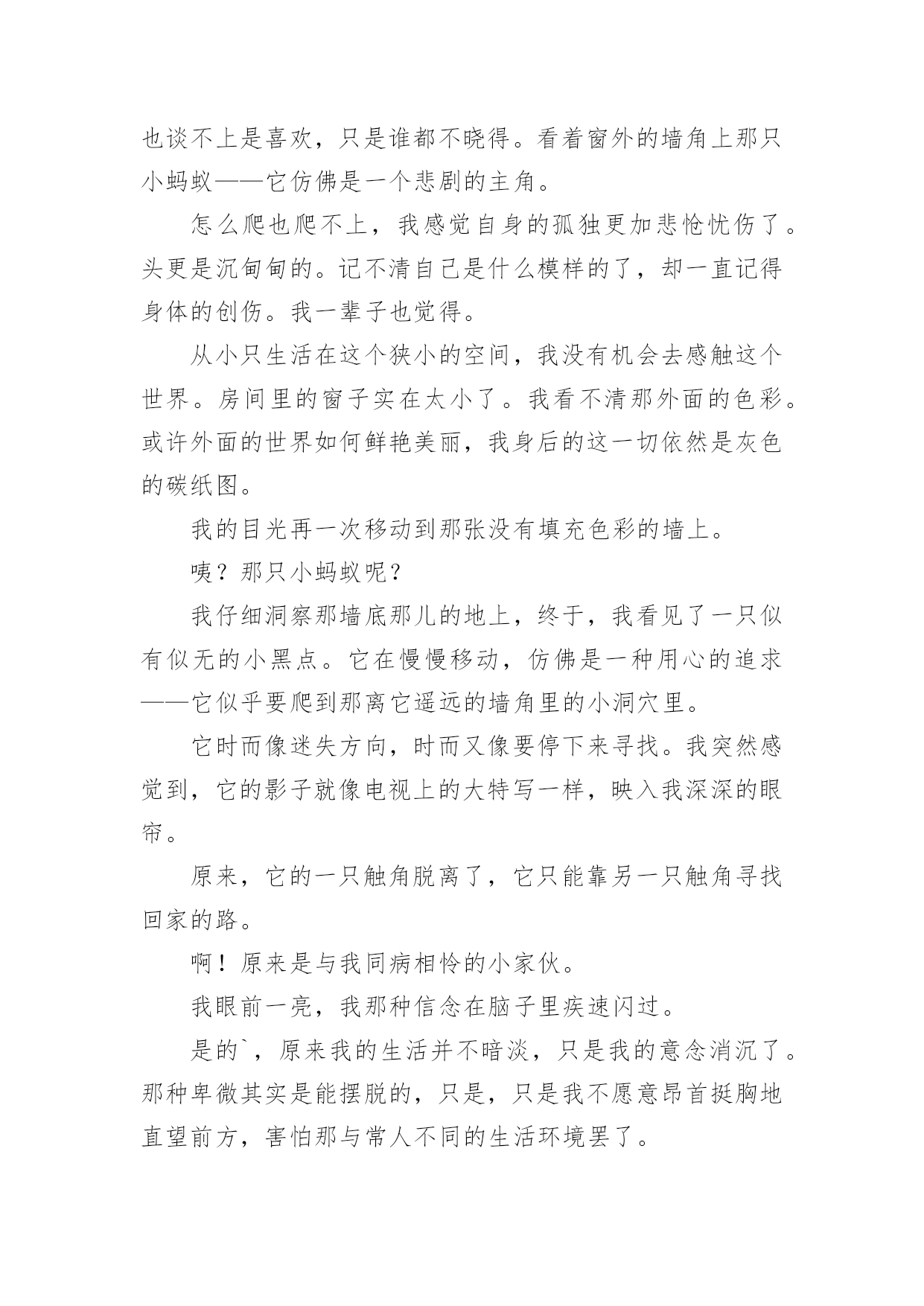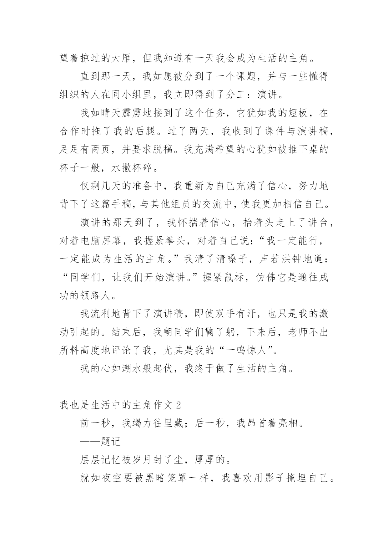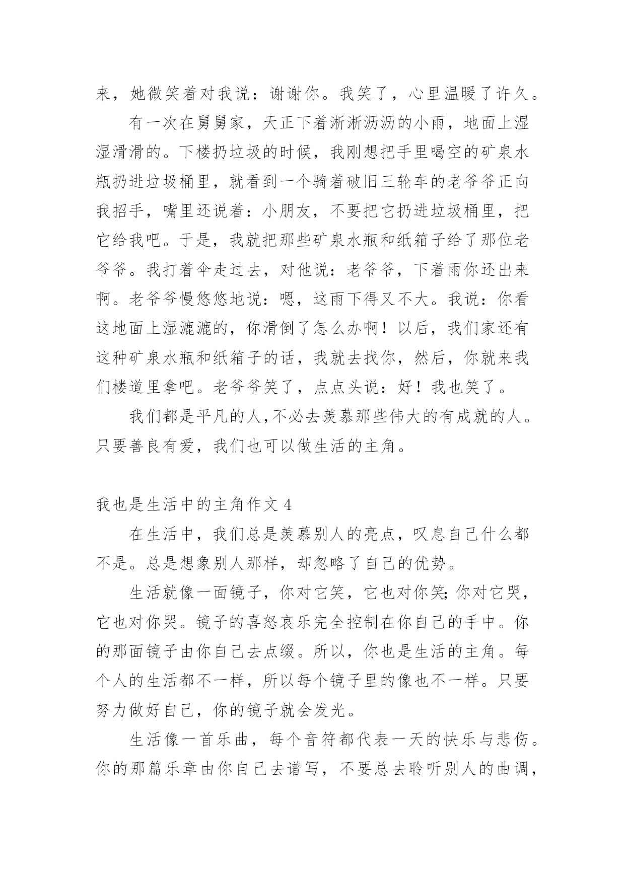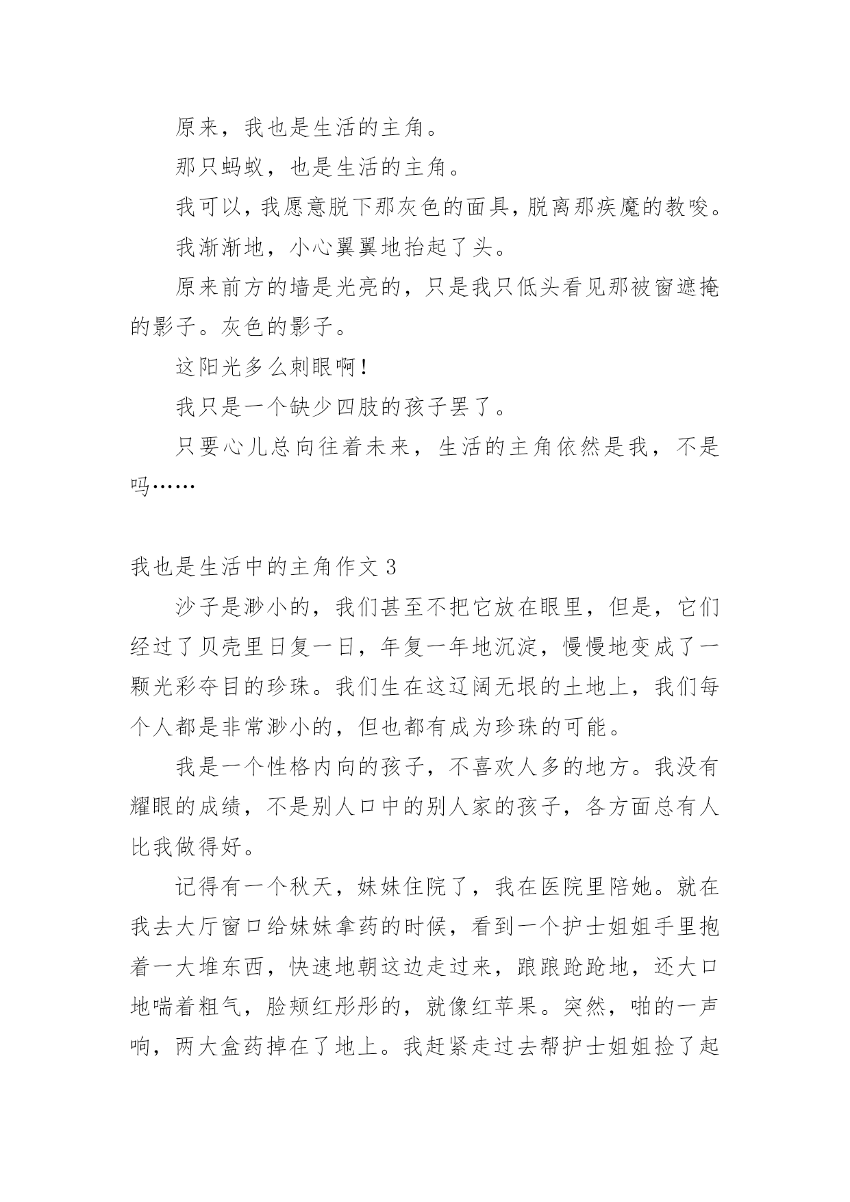 我也是生活中的主角作文我也是生活中的主角作文(6篇)在日常学习、工作抑或是生活中,大家对作文都不陌生吧,作文是由文字组成,经过人的思想考虑,通过语言组织来表达一个主题意义的文体。你知道作文怎样写才规范吗?下面是小编为大家收集的我也是生活中的主角作文,希望对大家有所帮助。我也是生活中的主角作文1时光匆匆,我从初一进入了初二。初二时,我逐渐懂事,懂得的道理多了,当然,受到的挫折也多了,这是我们蜕变的过程。逐渐,我们变得自信,变得敢拼。“失败是成功之母”,没有挫折,哪来得成功?老师在讲台上说道,一阵微风吹过,她的头发飘飘然的,明天轮到我演讲了,而我还没有准备课件,心里这样想着,不禁打了个寒战。回去后,心里郁郁寡欢,我做完作业,来到电脑前,思考着怎样完成。到了11点半,我揉着惺忪的双眼,完成了第三遍排练。次日早晨,我登上了讲台,手心冒着冷汗,眼神飘忽不安地看着黑板,我攥着鼠标,手汗打湿了桌面,不出所料,我在忘词与结巴中完成了演讲,在一片唏嘘中退下了讲台。从那天起,我变得沉默少言,下课后迎着凉风,孤寂地望着掠过的大雁,但我知道有一天我会成为生活的主角。直到那一天,我如愿被分到了一个课题,并与一些懂得组织的人在同小组里,我立即得到了分工:演讲。我如晴天霹雳地接到了这个任务,它犹如我的短板,在合作时拖了我的后腿。过了两天,我收到了课件与演讲稿,足足有两页,并要求脱稿。我充满希望的心犹如被推下桌的杯子一般,水撒杯碎。仅剩几天的准备中,我重新为自己充满了信心,努力地背下了这篇手稿,与其他组员的交流中,使我更加相信自己。演讲的那天到了,我怀揣着信心,抬着头走上了讲台,对着电脑屏幕,我握紧拳头,对着自己说:“我一定能行,一定能成为生活的主角。”我清了清嗓子,声若洪钟地道:“同学们,让我们开始演讲。”握紧鼠标,仿佛它是通往成功的领路人。我流利地背下了演讲稿,即使双手有汗,也只是我的激动引起的。结束后,我朝同学们鞠了躬,下来后,老师不出所料高度地评论了我,尤其是我的“一鸣惊人”。我的心如潮水般起伏,我终于做了生活的主角。我也是生活中的主角作文2前一秒,我竭力往里藏;后一秒,我昂首着亮相。——题记层层记忆被岁月封了尘,厚厚的。就如夜空要被黑暗笼罩一样,我喜欢用影子掩埋自己。也谈不上是喜欢,只是谁都不晓得。看着窗外的墙角上那只小蚂蚁——它仿佛是一个悲剧的主角。怎么爬也爬不上,我感觉自身的孤独更加悲怆忧伤了。头更是沉甸甸的。记不清自己是什么模样的了,却一直记得身体的创伤。我一辈子也觉得。从小只生活在这个狭小的空间,我没有机会去感触这个世界。房间里的窗子实在太小了。我看不清那外面的色彩。或许外面的世界如何鲜艳美丽,我身后的这一切依然是灰色的碳纸图。我的目光再一次移动到那张没有填充色彩的墙上。咦?那只小蚂蚁呢?我仔细洞察那墙底那儿的地上,终于,我看见了一只似有似无的小黑点。它在慢慢移动,仿佛是一种用心的追求——它似乎要爬到那离它遥远的墙角里的小洞穴里。它时而像迷失方向,时而又像要停下来寻找。我突然感觉到,它的影子就像电视上的大特写一样,映入我深深的眼帘。原来,它的一只触角脱离了,它只能靠另一只触角寻找回家的路。啊!原来是与我同病相怜的小家伙。我眼前一亮,我那种信念在脑子里疾速闪过。是的`,原来我的生活并不暗淡,只是我的意念消沉了。那种卑微其实是能摆脱的,只是,只是我不愿意昂首挺胸地直望前方,害怕那与常人不同的生活环境罢了。原来,我也是生活的主角。那只蚂蚁,也是生活的主角。我可以,我愿意脱下那灰色的面具,脱离那疾魔的教唆。我渐渐地,小心翼翼地抬起了头。原来前方的墙是光亮的,只是我只低头看见那被窗遮掩的影子。灰色的影子。这阳光多么刺眼啊!我只是一个缺少四肢的孩子罢了。只要心儿总向往着未来,生活的主角依然是我,不是吗……我也是生活中的主角作文3沙子是渺小的,我们甚至不把它放在眼里,但是,它们经过了贝壳里日复一日,年复一年地沉淀,慢慢地变成了一颗光彩夺目的珍珠。我们生在这辽阔无垠的土地上,我们每个人都是非常渺小的,但也都有成为珍珠的可能。我是一个性格内向的孩子,不喜欢人多的地方。我没有耀眼的成绩,不是别人口中的别人家的孩子,各方面总有人比我做得好。记得有一个秋天,妹妹住院了,我在医院里陪她。就在我去大厅窗口给妹妹拿药的时候,看到一个护士姐姐手里抱着一大堆东西,快速地朝这边走过来,踉踉跄跄地,还大口地喘着粗气,脸颊红彤彤的,就像红苹果。突然,啪的一声响,两大盒药掉在了地上。我赶紧走过去帮护士姐姐捡了起来,她微笑着对我说:谢谢你。我笑了,心里温暖了许久。有一次在舅舅家,天正下着淅淅沥沥的小雨,地面上湿湿滑滑的。下楼扔垃圾的时候,我刚想把手里喝空的矿泉水瓶扔进垃圾桶里,就看到一个骑着破旧三轮车的老爷爷正向我招手,嘴里还说着:小朋友,不要把它扔进垃圾桶里,把它给我吧。于是,