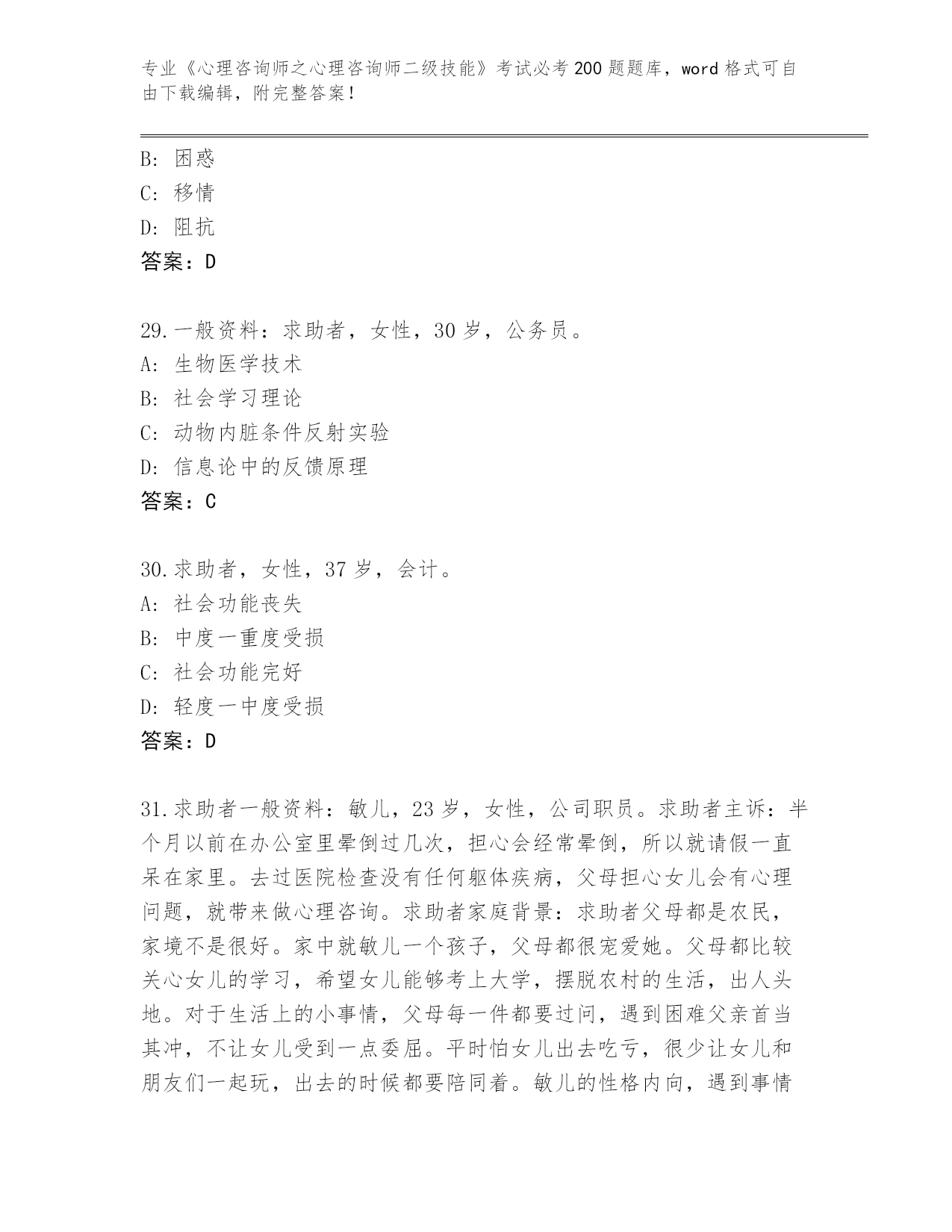 湖北省内部使用《心理咨询师之心理咨询师二级技能》考试必考200题真题题库及答案(真题汇编)