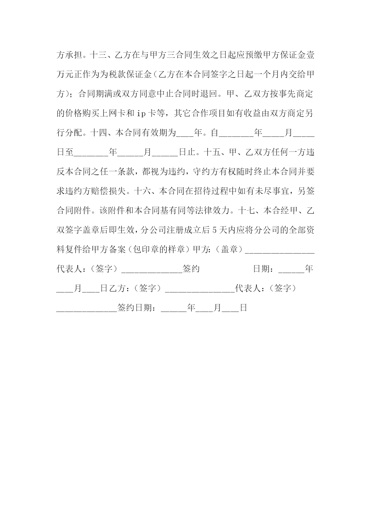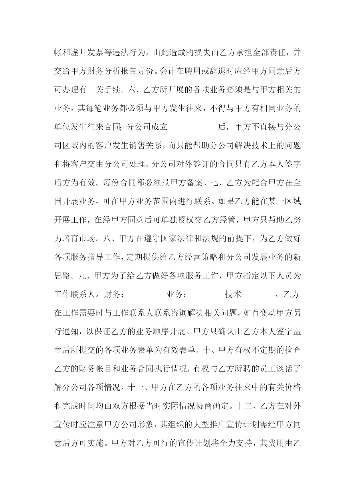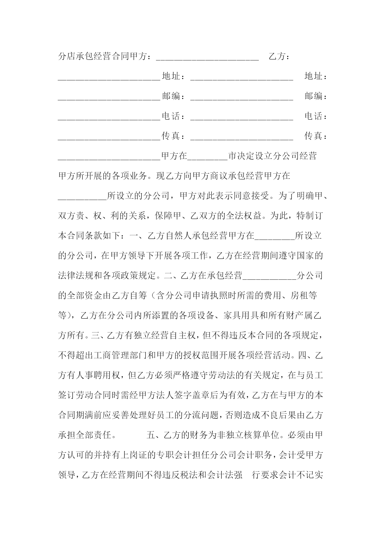 编号:分店承包经营合同甲方乙方签订日期年月日XXXXXX公司(本合同模板为Word格式,可根据您的需要调整内容及格式,欢迎下载。)分店承包经营合同甲方:_______________________乙方:_______________________地址:_______________________地址:_______________________邮编:_______________________邮编:_______________________电话:_______________________电话:_______________________传真:_______________________传真:_______________________甲方在_________市决定设立分公司经营甲方所开展的各项业务。现乙方向甲方商议承包经营甲方在___________所设立的分公司,甲方对此表示同意接受。为了明确甲、双方责、权、利的关系,保障甲、乙双方的全法权益。为此,特制订本合同条款如下:一、乙方自然人承包经营甲方在_________所设立的分公司,在甲方领导下开展各项工作,乙方在经营期间遵守国家的法律法规和各项政策规定。二、乙方在承包经营____________分公司的全部资金由乙方自筹(含分公司申请执照时所需的费用、房租等等),乙方在分公司内所添置的各项设备、家具用具和所有财产属乙方所有。三、乙方有独立经营自主权,但不得违反本合同的各项规定,不得超出工商管理部门和甲方的授权范围开展各项经营活动。四、乙方有人事聘用权,但乙方必须严格遵守劳动法的有关规定,在与员工签订劳动合同时需经甲方法人签字盖章后为有效,乙方在与甲方的本合同期满前应妥善处理好员工的分流问题,否则造成不良后果由乙方承担全部责任。五、乙方的财务为非独立核算单位。必须由甲方认可的并持有上岗证的专职会计担任分公司会计职务,会计受甲方领导,乙方在经营期间不得违反税法和会计法强行要求会计不记实帐和虚开发票等违法行为,由此造成的损失由乙方承担全部责任,并交给甲方财务分析报告壹份。会计在聘用或辞退时应经甲方同意后方可办理有关手续。六、乙方所开展的各项业务必须是与甲方相关的业务,其每笔业务都必须与甲方发生往来,不得与甲方有相同业务的单位发生往来合同;分公司成立后,甲方不直接与分公司区域内的客户发生销售关系,而只能帮助分公司解决技术上的问题和将客户交由分公司处理。分公司对外签订的合同只有乙方本人签字后方为有效。每份合同都必须报甲方备案。七、乙方为配合甲方在全国开展业务,可在甲方业务范围内进行联系。如果乙方能在某一区域开展工作,在经甲方同意后可单独授权交乙方经管,甲方只帮助乙努力培育市场。八、甲方在遵守国家法律和法规的前提下,为乙方做好各项服务指导工作,定期提供给乙方经营策略和分公司发展业务的新思路。九、甲方为了给乙方做好各项服务工作,甲方指定以下人员为工作联系人。财务:_________业务:________技术________。乙方在工作需要时与工作联系人联系咨询解决相关问题,如有变动甲方另行通知,以保证乙方的业务顺序开展。甲方只确认由乙方本人签字盖章后所提交的各项业务表单为有效表单。十、甲方有权不定期的检查乙方的财务帐目和业务合同执行情况,有权与乙方所聘的员工谈话了解分公司各项情况。十一、甲方在乙方的各项业务往来中的有关价格和完成时间均由双方根据当时实际情况协商确定。十二、乙方在对外宣传时应注意甲方公司形象,其组织的大型推广宣传计划需经甲方同意后方可实施。甲方对乙方可行的宣传计划将全力支持,其费用由乙方承担。十三、乙方在与甲方三合同生效之日起应预缴甲方保证金壹万元正作为为税款保证金(乙方在本合同签字之日起一个月内交给甲方);合同期满或双方同意中止合同时退回。甲、乙双方按事先商定的价格购买上网卡和ip卡等,其它合作项目如有收益由双方商定另行分配。十四、本合同有效期为____年。自________年_____月_____日至________年______月______日止。十五、甲、乙双方任何一方违反本合同之任一条款,都视为违约,守约方有权随时终止本合同并要求违约方赔偿损失。十六、本合同在招待过程中如有未尽事宜,另签合同附件。该附件和本合同基有同等法律效力。十七、本合经甲、乙双签字盖章后即生效,分公司注册成立后5天内应将分公司的全部资料复件给甲方备案(包印章的样章)甲方:(盖章)________________代表人:(签字)______________签约日期:______年____月____日乙方:(签字)________________代表人:(签字)______________签约日期:______年____月