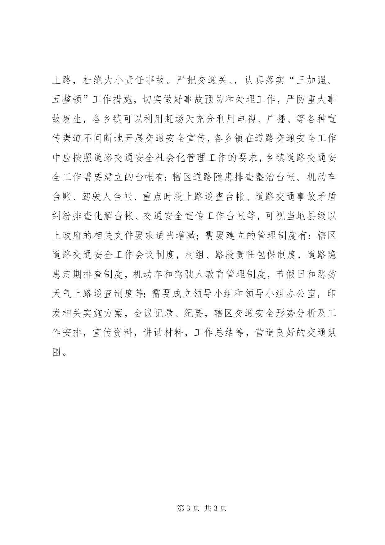 第PAGE\*Arabic\*MERGEFORMAT3页共NUMPAGES\*MERGEFORMAT3页乡镇交通安全检查工作小结年月日,XX县区政府的部署和要求,由县公安局xxx副局长带领我县安监局,交通局、公安局治安科、县交警大队、运管所、消防大队一起到xx县东片区各乡镇进行安全大检查,在检查过程中交通类发现各乡镇有以下问题:1、d镇,镇政府和各职能部门未定期召开道路交通安全联系会议,交通安全宣传不到位,未看到明显效果,未看到宣传材料。镇派出所在路面勤务安排较少,查车登记台账近期未有,在道路安全存在有隐患的路段未登记在册,没有建立健全辖区机动车,驾驶人台账和交通应急救援预案,在辖区内置办红白喜宴的家庭落实“打招呼”制度实施较好。2、h镇政府未定期联系镇派出所,司法所,对辖区企业,学校,各村召开道路交通安全联系会议,未建立辖区内机动车及驾驶员台账,在处理交通事故方面虽有应急救援预案,但分工未明确,在事故预防及处理方面须加强对学生,群众交通安全方面的教育,从而减少事故的发生。在根据大河镇安全工作检查中发现该镇全面工作较好,但存在的小问题较多,应督促该镇进一步完善。3、f镇,在是否定期召开道路交通安全联系会议上,该镇陈述经常性联系镇派出所,镇司法所,村委会不定期对学校,企业进行交通安全宣传,同时在赶场天对赶场群众散发宣传单,但在检查中未看到宣传资料及宣传图片,同时该镇在2012年已建立辖区内机动车及驾驶员台账,在道路安全存在有隐患的路段未登记在册。4、p镇,在检查交通这块,该镇未建立辖区内机动车及驾驶员台账和开展道路交通安全联系会议,同时没有对该辖区有隐患的路段未排查登记,辖区内去年虽与村支书、主任开始接洽“打招呼”制度但未签订责任状,未实施到位。5、j乡,该想在近期由县交警队牵头在本月3日已对该辖区的企业和辖区驾驶员进行交通安全联系会议,在交通宣传方面已制定宣传标语,传单派发群众手中,其他方面有所欠缺。6、s乡,除辖区内机动车及驾驶员台账未健全外,其他较好。7、s镇,因三合镇地处县城内,交通方面都由县交警大队负责。从检查各乡镇安全工作中不难发现,各乡镇对交通管理这块有待完善,而今农民群众生活逐步小康,购买机动车的能力不再是难事,机动车不断增多,从事非法营运的车辆在逐步增多,出现超员,超重,驾驶带病车的不在少数,各乡镇因加大对群众及辖区学校,企业交通方面的知识,严格遵守交通法规和交通管制通知,采取有效措施,杜绝严重交通违法行为,杜绝“带病车”上路,杜绝大小责任事故。严把交通关、,认真落实“三加强、五整顿”工作措施,切实做好事故预防和处理工作,严防重大事故发生,各乡镇可以利用赶场天充分利用电视、广播、等各种宣传渠道不间断地开展交通安全宣传,各乡镇在道路交通安全工作中应按照道路交通安全社会化管理工作的要求,乡镇道路交通安全工作需要建立的台帐有:辖区道路隐患排查整治台帐、机动车台账、驾驶人台帐、重点时段上路巡查台帐、道路交通事故矛盾纠纷排查化解台帐、交通安全宣传工作台帐等,可视当地县级以上政府的相关文件要求适当增减;需要建立的管理制度有:辖区道路交通安全工作会议制度,村组、路段责任包保制度,道路隐患定期排查制度,机动车和驾驶人教育管理制度,节假日和恶劣天气上路巡查制度等;需要成立领导小组和领导小组办公室,印发相关实施方案,会议记录、纪要,辖区交通安全形势分析及工作安排,宣传资料,讲话材料,工作总结等,营造良好的交通氛围。