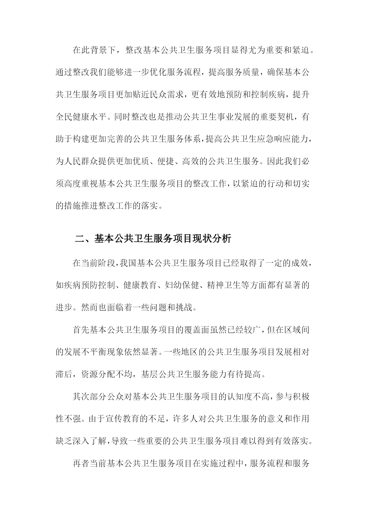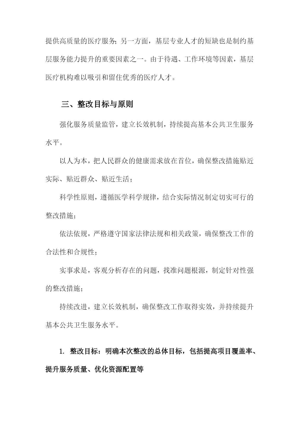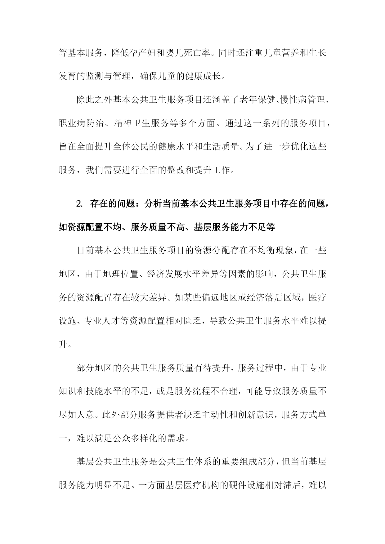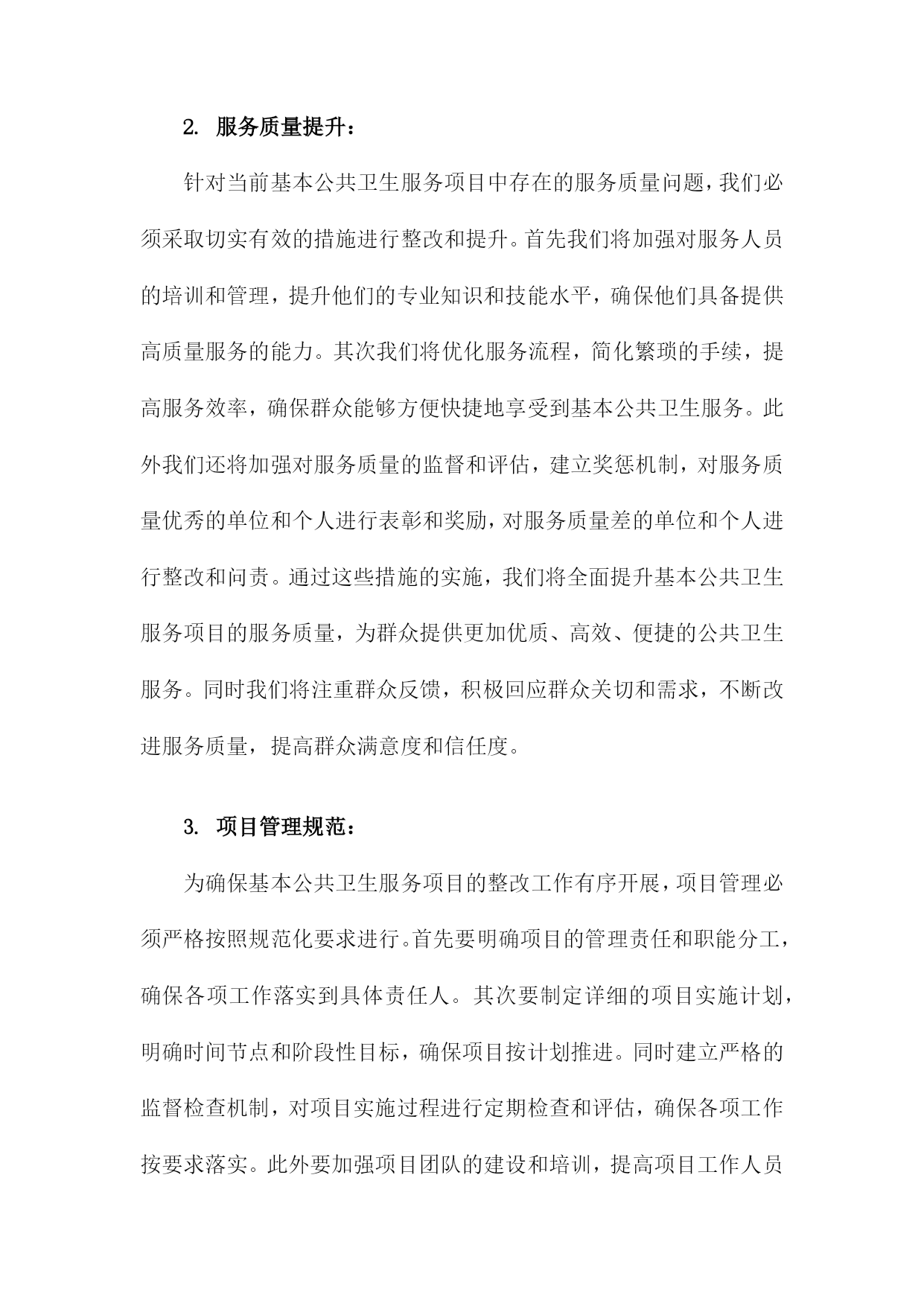 基本公共卫生服务项目整改方案一、简述《基本公共卫生服务项目整改方案》是为了提高基本公共卫生服务的质量和效率,针对当前存在的问题和不足,制定的一项全面整改计划。本整改方案旨在通过系统性的改进措施,提升公共卫生服务的整体水平,保障广大民众的健康权益。通过对现有基本公共卫生服务项目的深入分析和评估,我们发现了一些亟待解决的问题,包括资源配置不均、服务质量不高、项目管理不精细等。因此本整改方案将围绕这些问题展开,提出切实可行的改进措施和实施方案,以确保基本公共卫生服务项目的顺利进行和有效实施。1.背景介绍:简述当前基本公共卫生服务项目的现状及存在的问题,强调整改的重要性和紧迫性当前基本公共卫生服务项目在保障全民健康方面发挥着举足轻重的作用。然而随着社会经济和医疗技术的快速发展,当前基本公共卫生服务项目的现状及存在的问题逐渐凸显。一些地区服务覆盖面不够广泛,资源配置不均衡,服务质量参差不齐,难以满足人民群众日益增长的健康需求。这些问题不仅影响了基本公共卫生服务项目的效能发挥,也制约了公共卫生事业的可持续发展。在此背景下,整改基本公共卫生服务项目显得尤为重要和紧迫。通过整改我们能够进一步优化服务流程,提高服务质量,确保基本公共卫生服务项目更加贴近民众需求,更有效地预防和控制疾病,提升全民健康水平。同时整改也是推动公共卫生事业发展的重要契机,有助于构建更加完善的公共卫生服务体系,提高公共卫生应急响应能力,为人民群众提供更加优质、便捷、高效的公共卫生服务。因此我们必须高度重视基本公共卫生服务项目的整改工作,以紧迫的行动和切实的措施推进整改工作的落实。二、基本公共卫生服务项目现状分析在当前阶段,我国基本公共卫生服务项目已经取得了一定的成效,如疾病预防控制、健康教育、妇幼保健、精神卫生等方面都有显著的进步。然而也面临着一些问题和挑战。首先基本公共卫生服务项目的覆盖面虽然已经较广,但在区域间的发展不平衡现象依然显著。一些地区的公共卫生服务项目发展相对滞后,资源分配不均,基层公共卫生服务能力有待提高。其次部分公众对基本公共卫生服务项目的认知度不高,参与积极性不强。由于宣传教育的不足,许多人对公共卫生服务的意义和作用缺乏深入了解,导致一些重要的公共卫生服务项目难以得到有效落实。再者当前基本公共卫生服务项目在实施过程中,服务流程和服务质量还有待进一步优化。一些服务项目的实施过程繁琐,不够便捷高效,影响了公众的使用体验。同时服务质量的提升也需要进一步加强,以满足公众日益增长的健康需求。此外人才队伍建设也是当前基本公共卫生服务项目面临的一个重要问题。基层公共卫生服务机构的专业技术人员数量不足,部分人员的专业素质和服务能力也需要进一步提高。1.项目覆盖范围:阐述当前基本公共卫生服务项目的覆盖范围,包括疾病预防、健康教育、妇幼保健等方面的服务疾病预防:基本公共卫生服务项目在疾病预防方面扮演着重要角色。这包括对各种常见疾病和流行病的预防和控制工作,如高血压、糖尿病、结核病、艾滋病等。通过定期的疾病监测、疫苗接种、疫情报告和应对等措施,有效预防和减少疾病的发生,保障公众健康。健康教育:健康教育是基本公共卫生服务项目的重要组成部分。项目通过各种渠道和形式,如媒体宣传、健康讲座、宣传册等,普及健康知识,提高公众对健康生活方式、疾病预防和控制、慢性病管理等方面的认知和理解。通过广泛宣传和教育,增强公众的健康意识和自我保健能力。妇幼保健:基本公共卫生服务项目致力于提高妇女的健康水平,保障母婴安全。这包括为孕产妇提供健康教育、产前检查、住院分娩等基本服务,降低孕产妇和婴儿死亡率。同时还注重儿童营养和生长发育的监测与管理,确保儿童的健康成长。除此之外基本公共卫生服务项目还涵盖了老年保健、慢性病管理、职业病防治、精神卫生服务等多个方面。通过这一系列的服务项目,旨在全面提升全体公民的健康水平和生活质量。为了进一步优化这些服务,我们需要进行全面的整改和提升工作。2.存在的问题:分析当前基本公共卫生服务项目中存在的问题,如资源配置不均、服务质量不高、基层服务能力不足等目前基本公共卫生服务项目的资源分配存在不均衡现象,在一些地区,由于地理位置、经济发展水平差异等因素的影响,公共卫生服务的资源配置存在较大差异。如某些偏远地区或经济落后区域,医疗设施、专业人才等资源配置相对匮乏,导致公共卫生服务水平难以提升。部分地区的公共卫生服务质量有待提升,服务过程中,由于专业知识和技能水平的不足,或是服务流程不合理,可能导致服务质量不尽如人意。此外部分服务提供者缺乏主动性和创新意识,服务方式单一,难以满足公众多样化的需求。基层公共卫生服务是公共卫生体系的重要组成部分,但当前基层服务能力明显不足。一方面基层医疗机构的硬件设施相对滞后,难以提供高质量的医疗服务;另一方