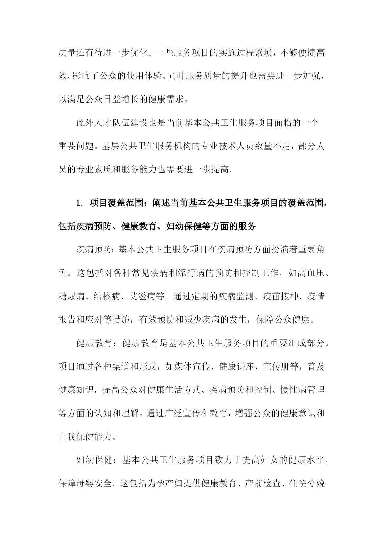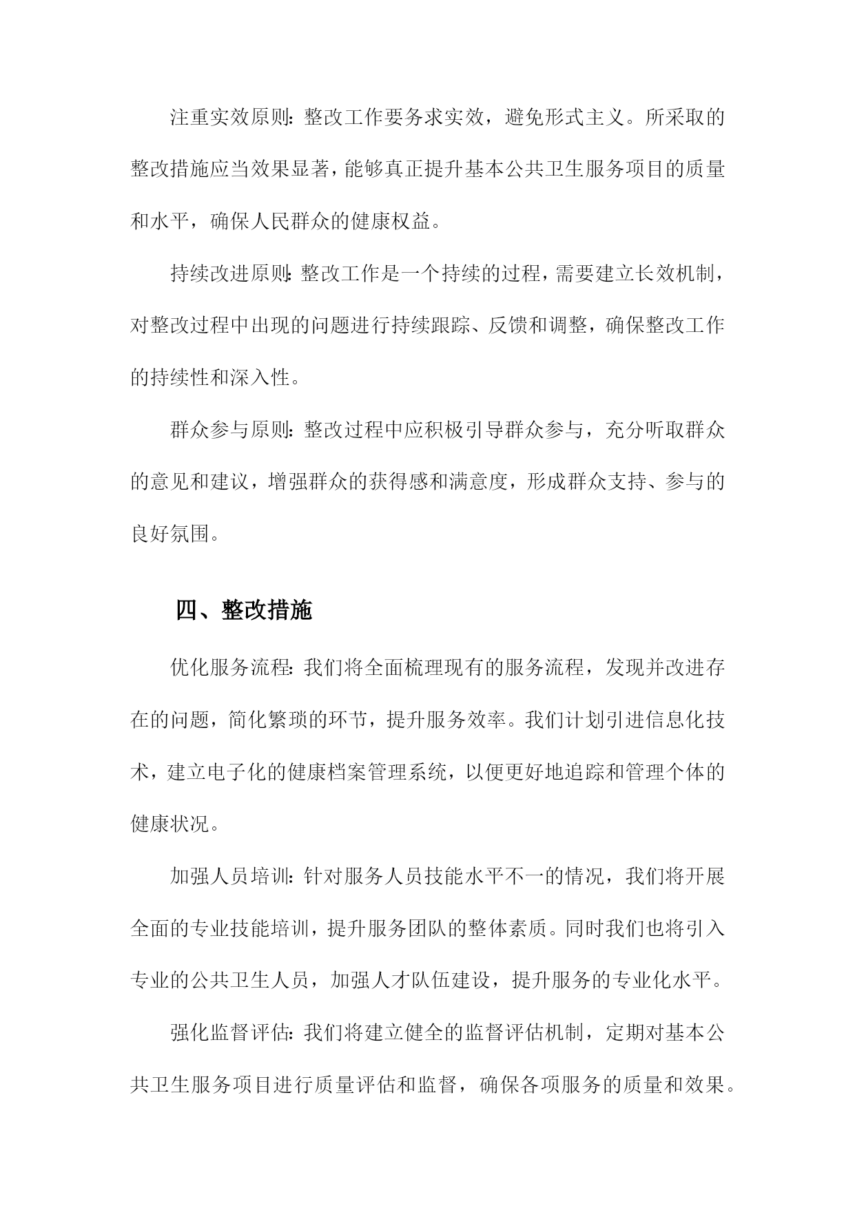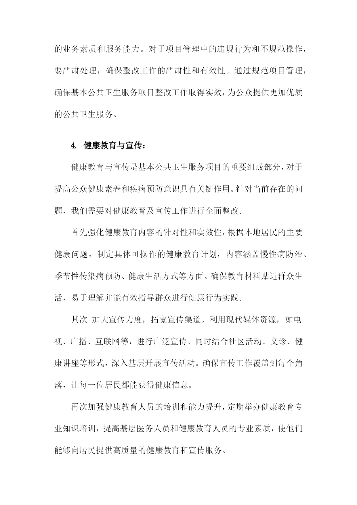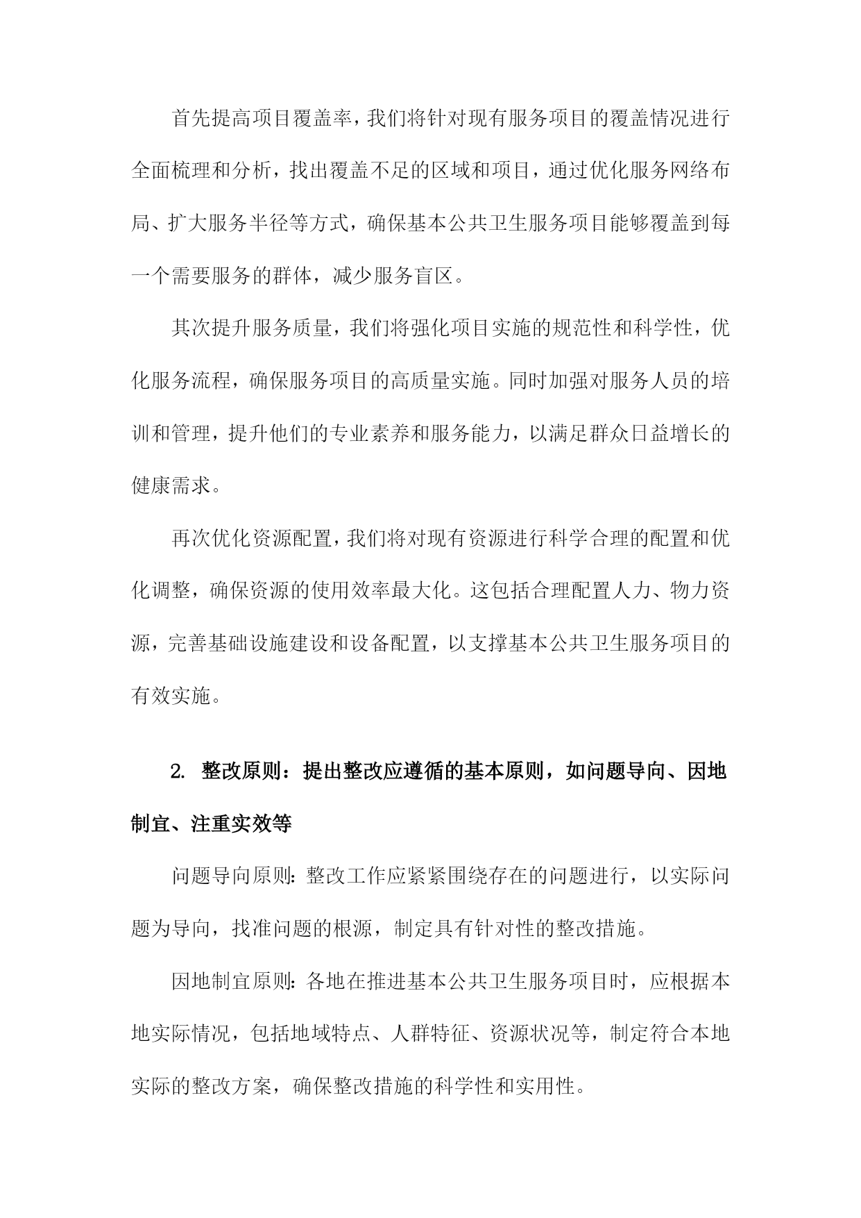 基本公共卫生服务项目整改方案一、简述《基本公共卫生服务项目整改方案》是为了提高基本公共卫生服务的质量和效率,针对当前存在的问题和不足,制定的一项全面整改计划。本整改方案旨在通过系统性的改进措施,提升公共卫生服务的整体水平,保障广大民众的健康权益。通过对现有基本公共卫生服务项目的深入分析和评估,我们发现了一些亟待解决的问题,包括资源配置不均、服务质量不高、项目管理不精细等。因此本整改方案将围绕这些问题展开,提出切实可行的改进措施和实施方案,以确保基本公共卫生服务项目的顺利进行和有效实施。1.背景介绍:简述当前基本公共卫生服务项目的现状及存在的问题,强调整改的重要性和紧迫性当前基本公共卫生服务项目在保障全民健康方面发挥着举足轻重的作用。然而随着社会经济和医疗技术的快速发展,当前基本公共卫生服务项目的现状及存在的问题逐渐凸显。一些地区服务覆盖面不够广泛,资源配置不均衡,服务质量参差不齐,难以满足人民群众日益增长的健康需求。这些问题不仅影响了基本公共卫生服务项目的效能发挥,也制约了公共卫生事业的可持续发展。在此背景下,整改基本公共卫生服务项目显得尤为重要和紧迫。通过整改我们能够进一步优化服务流程,提高服务质量,确保基本公共卫生服务项目更加贴近民众需求,更有效地预防和控制疾病,提升全民健康水平。同时整改也是推动公共卫生事业发展的重要契机,有助于构建更加完善的公共卫生服务体系,提高公共卫生应急响应能力,为人民群众提供更加优质、便捷、高效的公共卫生服务。因此我们必须高度重视基本公共卫生服务项目的整改工作,以紧迫的行动和切实的措施推进整改工作的落实。二、基本公共卫生服务项目现状分析在当前阶段,我国基本公共卫生服务项目已经取得了一定的成效,如疾病预防控制、健康教育、妇幼保健、精神卫生等方面都有显著的进步。然而也面临着一些问题和挑战。首先基本公共卫生服务项目的覆盖面虽然已经较广,但在区域间的发展不平衡现象依然显著。一些地区的公共卫生服务项目发展相对滞后,资源分配不均,基层公共卫生服务能力有待提高。其次部分公众对基本公共卫生服务项目的认知度不高,参与积极性不强。由于宣传教育的不足,许多人对公共卫生服务的意义和作用缺乏深入了解,导致一些重要的公共卫生服务项目难以得到有效落实。再者当前基本公共卫生服务项目在实施过程中,服务流程和服务质量还有待进一步优化。一些服务项目的实施过程繁琐,不够便捷高效,影响了公众的使用体验。同时服务质量的提升也需要进一步加强,以满足公众日益增长的健康需求。此外人才队伍建设也是当前基本公共卫生服务项目面临的一个重要问题。基层公共卫生服务机构的专业技术人员数量不足,部分人员的专业素质和服务能力也需要进一步提高。1.项目覆盖范围:阐述当前基本公共卫生服务项目的覆盖范围,包括疾病预防、健康教育、妇幼保健等方面的服务疾病预防:基本公共卫生服务项目在疾病预防方面扮演着重要角色。这包括对各种常见疾病和流行病的预防和控制工作,如高血压、糖尿病、结核病、艾滋病等。通过定期的疾病监测、疫苗接种、疫情报告和应对等措施,有效预防和减少疾病的发生,保障公众健康。健康教育:健康教育是基本公共卫生服务项目的重要组成部分。项目通过各种渠道和形式,如媒体宣传、健康讲座、宣传册等,普及健康知识,提高公众对健康生活方式、疾病预防和控制、慢性病管理等方面的认知和理解。通过广泛宣传和教育,增强公众的健康意识和自我保健能力。妇幼保健:基本公共卫生服务项目致力于提高妇女的健康水平,保障母婴安全。这包括为孕产妇提供健康教育、产前检查、住院分娩等基本服务,降低孕产妇和婴儿死亡率。同时还注重儿童营养和生长发育的监测与管理,确保儿童的健康成长。除此之外基本公共卫生服务项目还涵盖了老年保健、慢性病管理、职业病防治、精神卫生服务等多个方面。通过这一系列的服务项目,旨在全面提升全体公民的健康水平和生活质量。为了进一步优化这些服务,我们需要进行全面的整改和提升工作。2.存在的问题:分析当前基本公共卫生服务项目中存在的问题,如资源配置不均、服务质量不高、基层服务能力不足等目前基本公共卫生服务项目的资源分配存在不均衡现象,在一些地区,由于地理位置、经济发展水平差异等因素的影响,公共卫生服务的资源配置存在较大差异。如某些偏远地区或经济落后区域,医疗设施、专业人才等资源配置相对匮乏,导致公共卫生服务水平难以提升。部分地区的公共卫生服务质量有待提升,服务过程中,由于专业知识和技能水平的不足,或是服务流程不合理,可能导致服务质量不尽如人意。此外部分服务提供者缺乏主动性和创新意识,服务方式单一,难以满足公众多样化的需求。基层公共卫生服务是公共卫生体系的重要组成部分,但当前基层服务能力明显不足。一方面基层医疗机构的硬件设施相对滞后,难以提供高质量的医疗服务;另一方