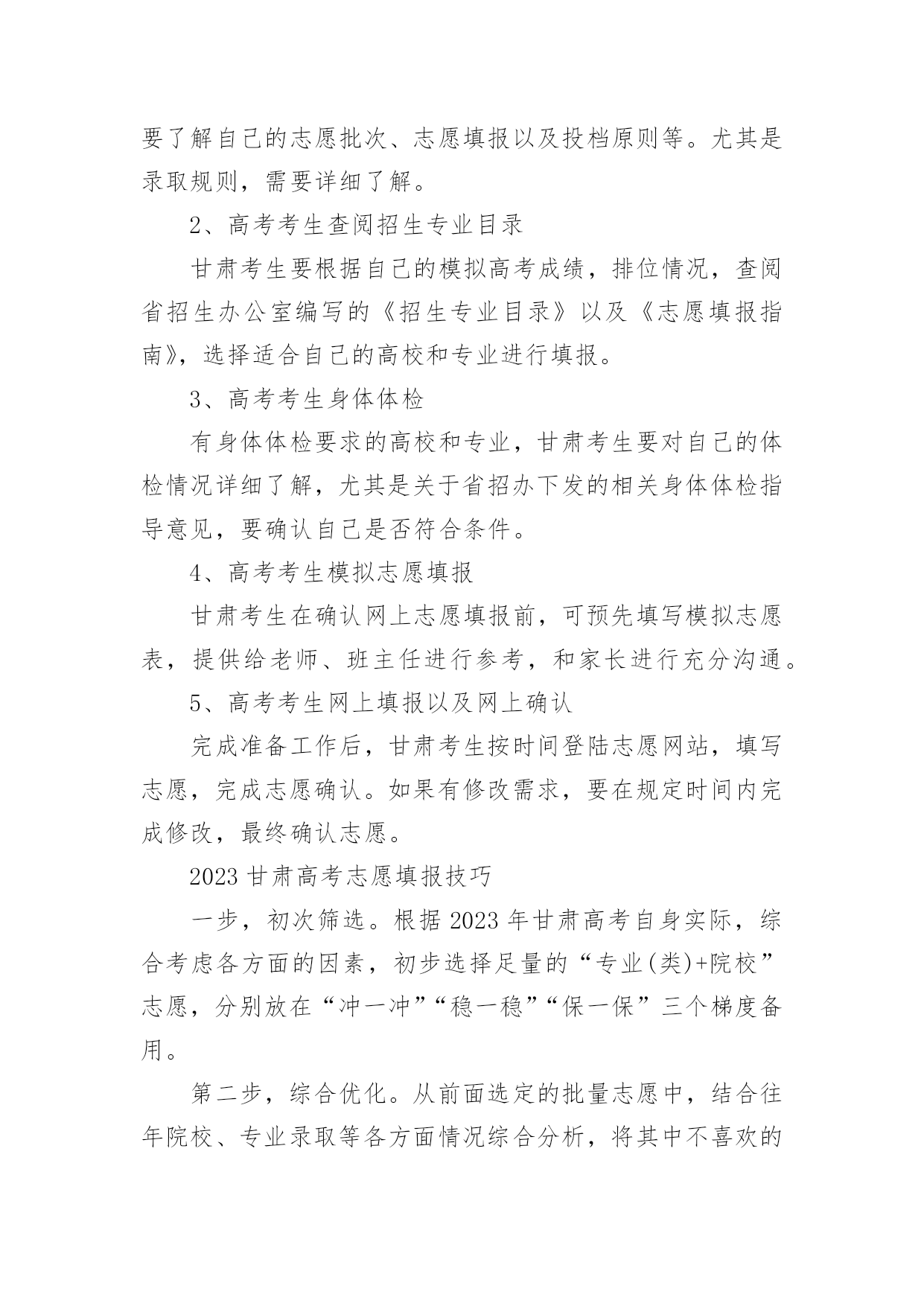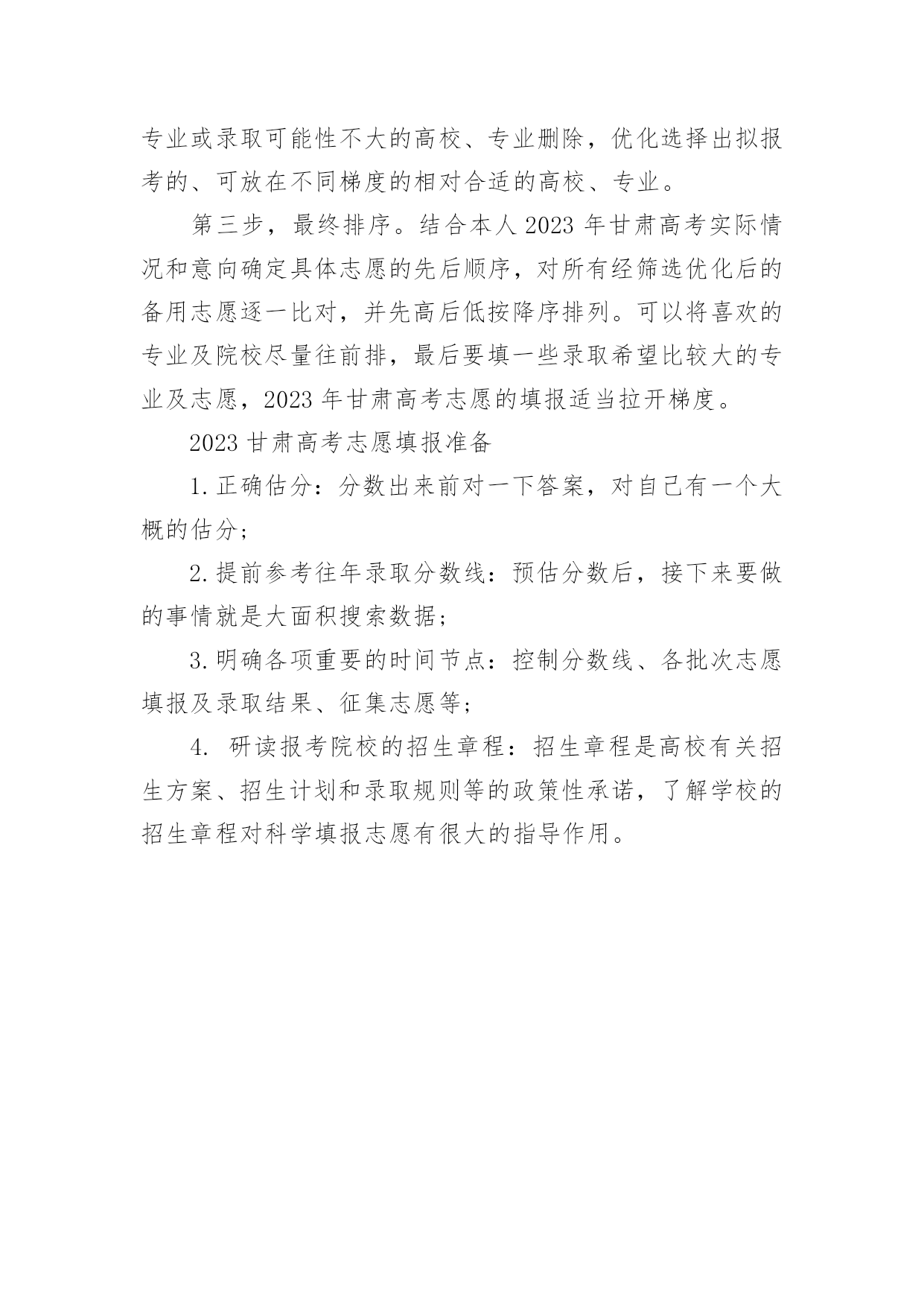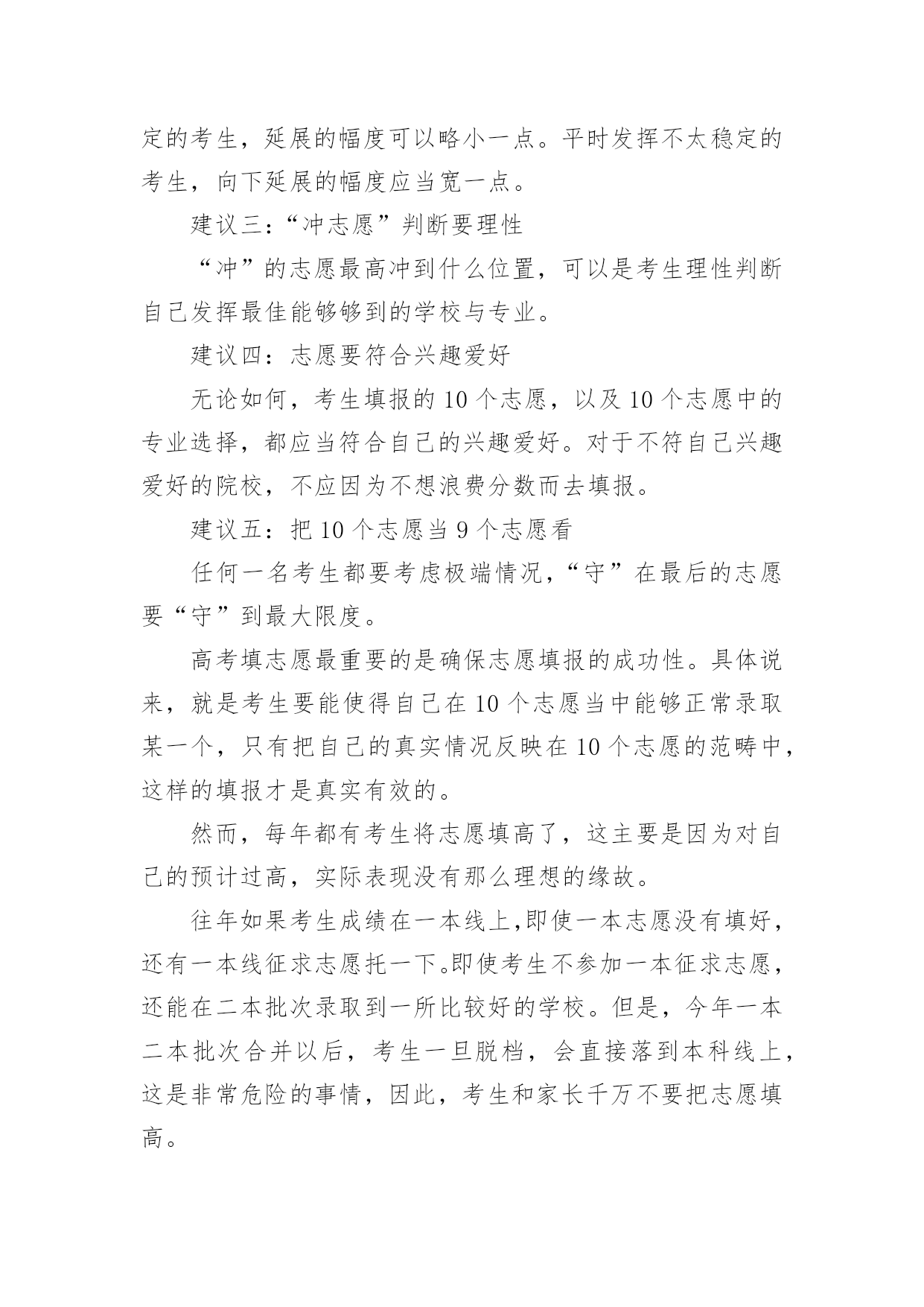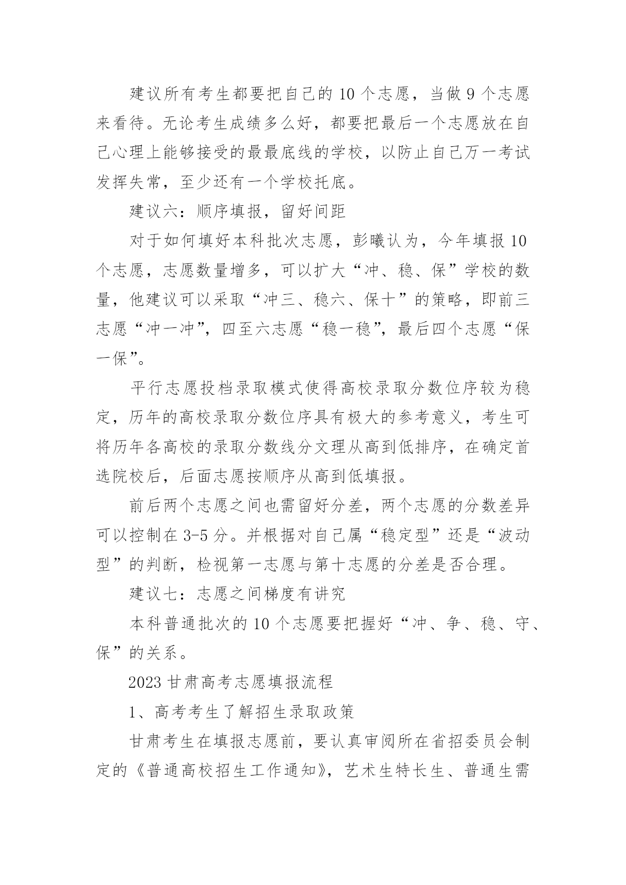 甘肃高考志愿填报指南(热门)2023年甘肃高考志愿填报指南2023甘肃高考志愿填报指南建议一:准确给自己定位填报志愿前,最主要的是要给自己准确定位。“每所高中每年的录取情况基本都差不多。因此,建议考生了解学校往年的文理科一本率、二本率,然后对照自己在学校的排位,来对自己合理定位。”考生应从模拟考试的成绩、从在区内、校内的排名,估算出超常发挥、正常发挥、失常发挥的3个成绩,以此作为填报志愿的基本依据。超常发挥可以作为第一志愿填报依据,失常发挥则作为第十志愿填报依据。估分时也需考虑自身特点:稳定型的,分差可以控制在10-40分之间;波动型的,分差可以控制在50-80分之间。建议二:冲稳守志愿均衡分配本科普通批次的10个志愿要把握好“冲、稳、守”的关系。冲稳守可以各3到4志愿,均衡分配。前几个“冲一冲”的志愿可以高于自己的正常实力,中间几个“稳一稳”的志愿属于自己的正常发挥,而后面几个“守一守”的志愿主要是考虑自己发挥失常的去处。其实冲稳守没有严格界限,把自己正常发挥能够录取的院校志愿放在中间位置,上下做延展为妥。平时发挥比较稳定的考生,延展的幅度可以略小一点。平时发挥不太稳定的考生,向下延展的幅度应当宽一点。建议三:“冲志愿”判断要理性“冲”的志愿最高冲到什么位置,可以是考生理性判断自己发挥最佳能够够到的学校与专业。建议四:志愿要符合兴趣爱好无论如何,考生填报的10个志愿,以及10个志愿中的专业选择,都应当符合自己的兴趣爱好。对于不符自己兴趣爱好的院校,不应因为不想浪费分数而去填报。建议五:把10个志愿当9个志愿看任何一名考生都要考虑极端情况,“守”在最后的志愿要“守”到最大限度。高考填志愿最重要的是确保志愿填报的成功性。具体说来,就是考生要能使得自己在10个志愿当中能够正常录取某一个,只有把自己的真实情况反映在10个志愿的范畴中,这样的填报才是真实有效的。然而,每年都有考生将志愿填高了,这主要是因为对自己的预计过高,实际表现没有那么理想的缘故。往年如果考生成绩在一本线上,即使一本志愿没有填好,还有一本线征求志愿托一下。即使考生不参加一本征求志愿,还能在二本批次录取到一所比较好的学校。但是,今年一本二本批次合并以后,考生一旦脱档,会直接落到本科线上,这是非常危险的事情,因此,考生和家长千万不要把志愿填高。建议所有考生都要把自己的10个志愿,当做9个志愿来看待。无论考生成绩多么好,都要把最后一个志愿放在自己心理上能够接受的最最底线的学校,以防止自己万一考试发挥失常,至少还有一个学校托底。建议六:顺序填报,留好间距对于如何填好本科批次志愿,彭曦认为,今年填报10个志愿,志愿数量增多,可以扩大“冲、稳、保”学校的数量,他建议可以采取“冲三、稳六、保十”的策略,即前三志愿“冲一冲”,四至六志愿“稳一稳”,最后四个志愿“保一保”。平行志愿投档录取模式使得高校录取分数位序较为稳定,历年的高校录取分数位序具有极大的参考意义,考生可将历年各高校的录取分数线分文理从高到低排序,在确定首选院校后,后面志愿按顺序从高到低填报。前后两个志愿之间也需留好分差,两个志愿的分数差异可以控制在3-5分。并根据对自己属“稳定型”还是“波动型”的判断,检视第一志愿与第十志愿的分差是否合理。建议七:志愿之间梯度有讲究本科普通批次的10个志愿要把握好“冲、争、稳、守、保”的关系。2023甘肃高考志愿填报流程1、高考考生了解招生录取政策甘肃考生在填报志愿前,要认真审阅所在省招委员会制定的《普通高校招生工作通知》,艺术生特长生、普通生需要了解自己的志愿批次、志愿填报以及投档原则等。尤其是录取规则,需要详细了解。2、高考考生查阅招生专业目录甘肃考生要根据自己的模拟高考成绩,排位情况,查阅省招生办公室编写的《招生专业目录》以及《志愿填报指南》,选择适合自己的高校和专业进行填报。3、高考考生身体体检有身体体检要求的高校和专业,甘肃考生要对自己的体检情况详细了解,尤其是关于省招办下发的相关身体体检指导意见,要确认自己是否符合条件。4、高考考生模拟志愿填报甘肃考生在确认网上志愿填报前,可预先填写模拟志愿表,提供给老师、班主任进行参考,和家长进行充分沟通。5、高考考生网上填报以及网上确认完成准备工作后,甘肃考生按时间登陆志愿网站,填写志愿,完成志愿确认。如果有修改需求,要在规定时间内完成修改,最终确认志愿。2023甘肃高考志愿填报技巧一步,初次筛选。根据2023年甘肃高考自身实际,综合考虑各方面的因素,初步选择足量的“专业(类)+院校”志愿,分别放在“冲一冲”“稳一稳”“保一保”三个梯度备用。第二步,综合优化。从前面选定的批量志愿中,结合往年院校、专业录取等各方面情况综合分析,将其中不喜欢的专业或录取可能性不大的高校、专业删除,优化选择出拟报考的、可放在不同梯度的相对合适的高校、专