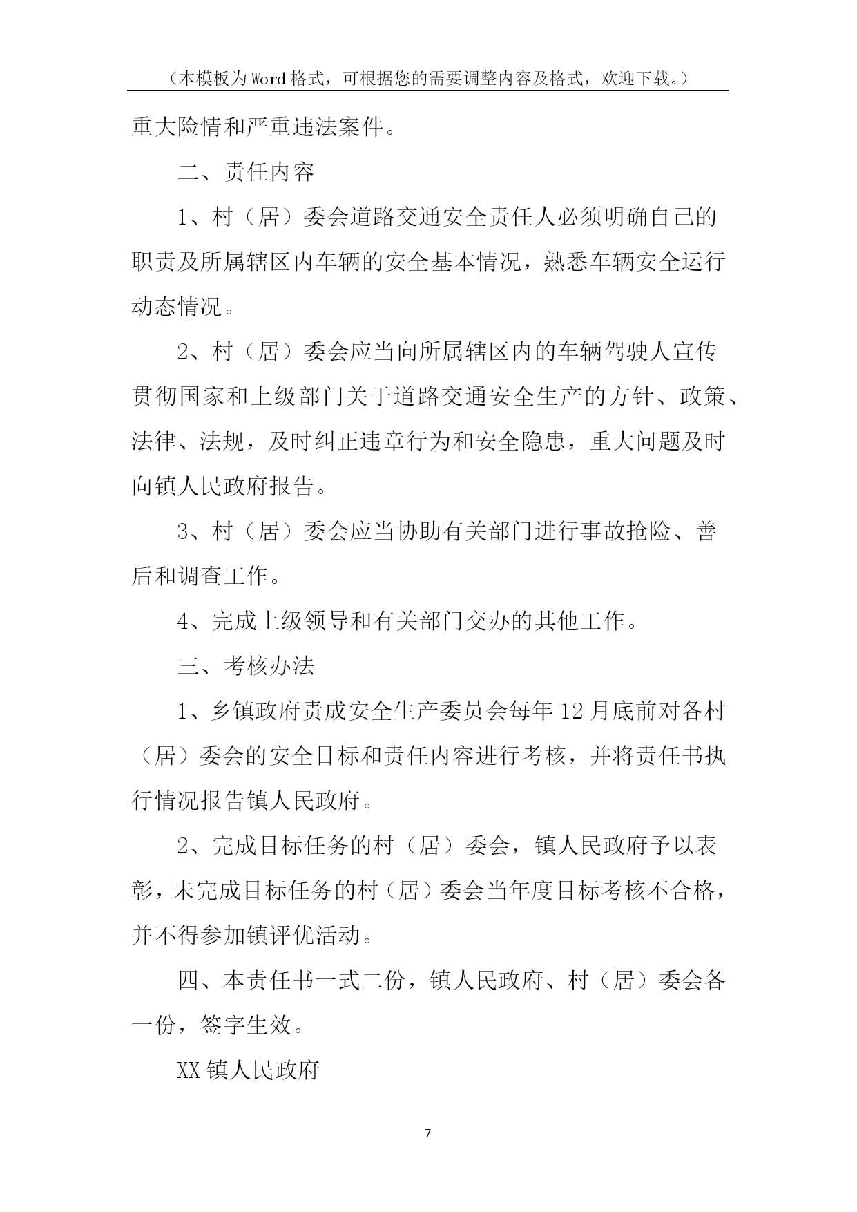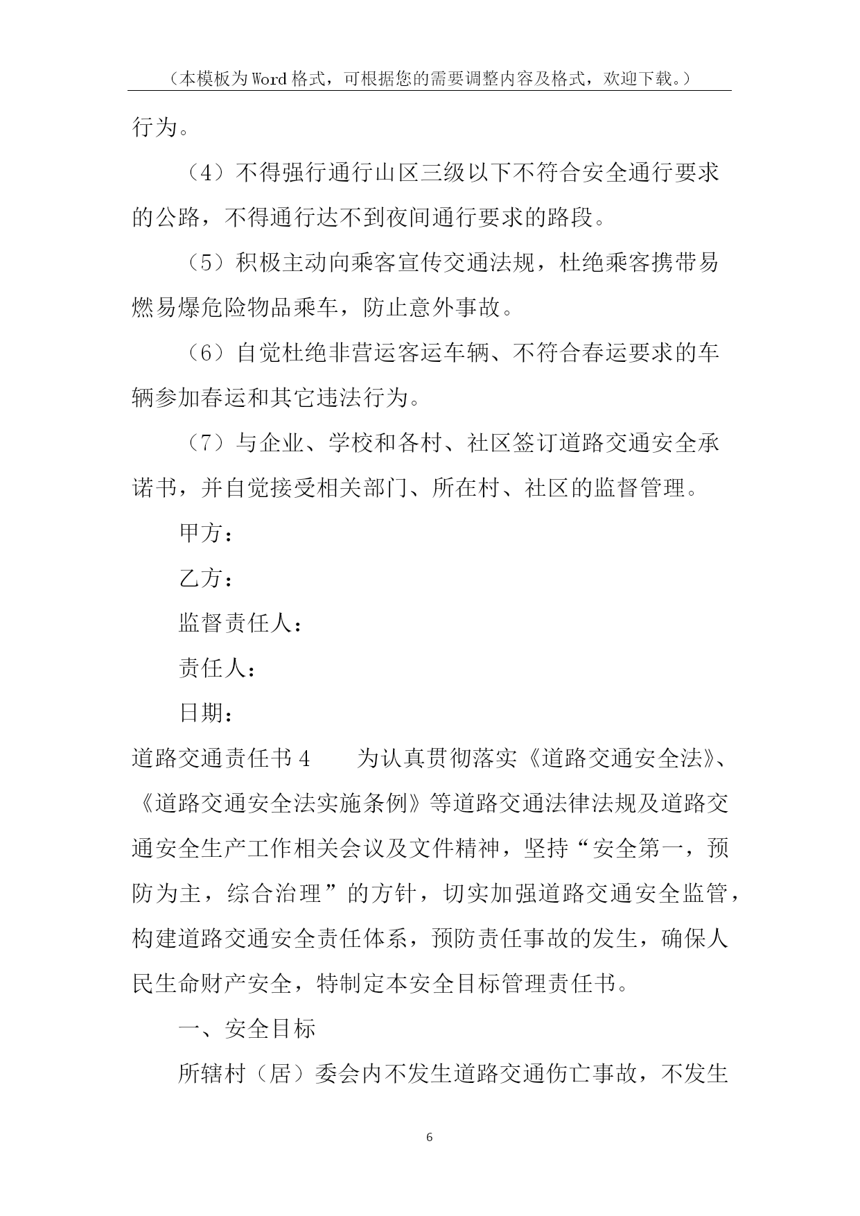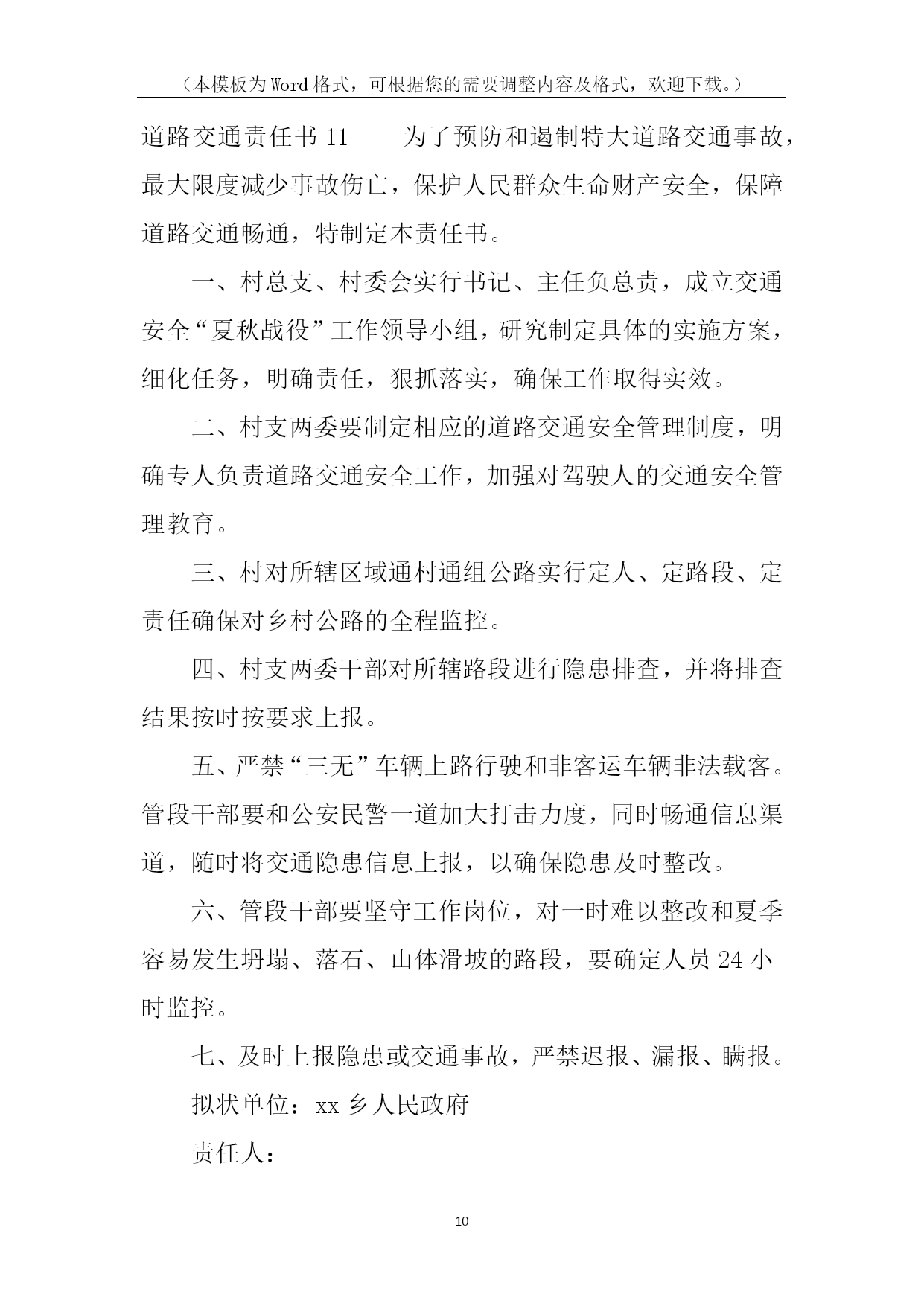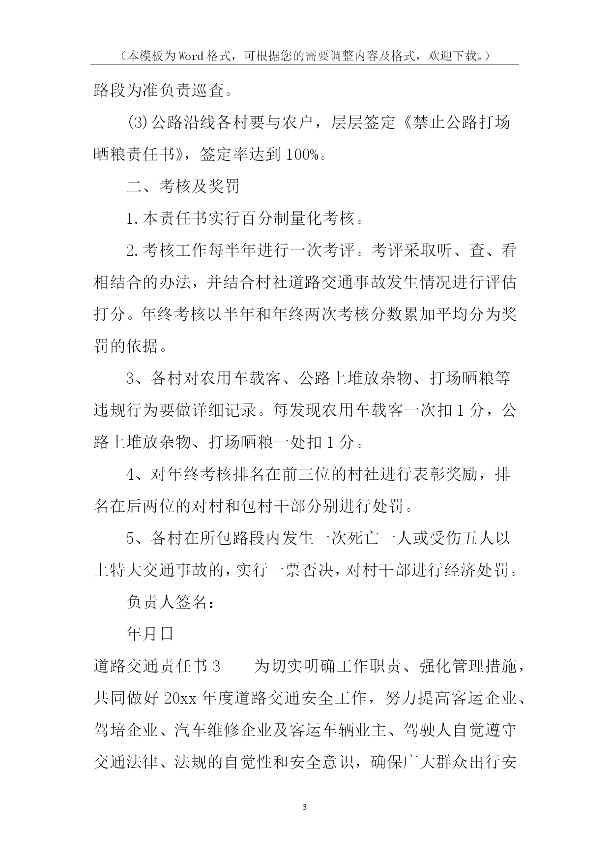 (本模板为Word格式,可根据您的需要调整内容及格式,欢迎下载。)PAGE\*MERGEFORMAT14道路交通责任书道路交通责任书1为有效预防和减少交通事故,努力消除道路交通安全隐患,保障广大师生道路交通安全,确保20xx年我校道路交通事故死亡人数为零的既定目标,特制定本责任书:1、各学校要将道路交通安全工作纳入学校工作的重要议事日程,对预防道路交通安全工作有安排、有检查、有落实,并将道路交通安全工作纳入学校综合治理考核范围,实行目标管理,签定责任书。2、将道路交通安全工作纳入学校法制课程,教育广大师生遵守道路交通安全法规。公路沿线学校要组织教师护送学生过马路。3、开展交通平安宣传教育,加大交通安全宣传力度。教育学生遵守交通安全法规,从小树立交通安全意识。学校要组织开展道路交通安全知识演讲比赛,交通安全伴我行等活动。4、南川中心学校年终对完成上述责任目标的情况组织考核,对成绩显著的学校通报表扬。xxx中心学校校长签字:各小学校长签字:二0xxx年九月一日道路交通责任书2为了有效预防和减少道路交通事故,控制交通事故发生总量和死亡人数,维护全乡人民生命财产安全,特制定本责任书。一、考核内容1.组织领导(10分)(1)建立预防道路交通事故工作领导小组,将交通安全管理工作纳入重要议事日程,定期开会研究,经常督促检查;(2)确定专抓领导,落实专职人员,制定工作措施,正常开展工作。2.安全宣传(30分)(1)各村全年组织专题宣传活动不得少于3次(以会议、图片、录音、录像宣传为准);(2)各村配合巡查单位在所辖段和村社组织大型专题宣传不得少于3次。(3)各村配合交警队以图片展、播放录像等宣传手段,进学校校、进社区开展宣传20场(次)以上。3.基础工作(60分)(1)各村对本村内的农用车、摩托车等机动车辆进行调查摸底,建立《村社五小车辆基础台帐》,督促无牌证车辆挂牌,做好安全教育工作;(2)按照属地原则,实行划段包干管理,以本村本辖区路段为准负责巡查。(3)公路沿线各村要与农户,层层签定《禁止公路打场晒粮责任书》,签定率达到100%。二、考核及奖罚1.本责任书实行百分制量化考核。2.考核工作每半年进行一次考评。考评采取听、查、看相结合的办法,并结合村社道路交通事故发生情况进行评估打分。年终考核以半年和年终两次考核分数累加平均分为奖罚的依据。3、各村对农用车载客、公路上堆放杂物、打场晒粮等违规行为要做详细记录。每发现农用车载客一次扣1分,公路上堆放杂物、打场晒粮一处扣1分。4、对年终考核排名在前三位的村社进行表彰奖励,排名在后两位的对村和包村干部分别进行处罚。5、各村在所包路段内发生一次死亡一人或受伤五人以上特大交通事故的,实行一票否决,对村干部进行经济处罚。负责人签名:年月日道路交通责任书3为切实明确工作职责、强化管理措施,共同做好20xx年度道路交通安全工作,努力提高客运企业、驾培企业、汽车维修企业及客运车辆业主、驾驶人自觉遵守交通法律、法规的自觉性和安全意识,确保广大群众出行安全,杜绝重、特大道路交通事故,镇人民政府(以下简称甲方)特同各村、相关学校、相关企业(以下简称乙方)签订如下安全责任书:一、甲方履行职责:1、按照道路交通法律、法规和各级政府的要求,及时指导、督促乙方把生产经营活动中的各项安全措施落实到位。2、按照属地管理原则,落实政府的监管责任。3、依法严厉查处“超载、超员、超速、驾疲劳车、驾故障车、酒后驾车、无证驾车、不按规定超车、违规停车”等违反《道路交通安全法》的违法行为。4、开展经常性的检查,督促乙方定期开展交通安全宣传教育培训和其它相关工作。5、启动事故问责机制。对各村、社区、企业和客运车主、驾驶人因发生严重交通违法行为或重大以上恶性交通责任事故的,依法追究有关人员的责任。二、乙方履行职责:1、在生产经营过程中,要严格遵守道路交通、驾驶培训、汽车维修等相关法律、法规、行业标准和操作规程。2、严格落实企业安全生产主体责任制度。企业要严格遵守《贵州省生产经营建设单位安全生产主体责任的规定》(黔府办发〔20xx〕31号)文件精神,逐级建立企业管理人员、职能部门、车间班组、各工种的岗位安全生产责任制,形成涵盖全员、全过程、全方位的责任体系,做到责任无盲区、管理无死角。3、制定并严格执行安全生产规章制度。4、建立完善的监管台账,并及时更新信息。5、加强宣传教育培训工作。每季度必须对企业员工、驾驶人进行定期安全培训,并要有记录;在重点部位和醒目处要书写永久性宣传标语和布标;建立交通安全宣传专栏。6、严格执行隐患排查治理制度。7、重点宣传“五个严禁”、“九个一律”等规定,并严格执行。8、严格执行企业生产技术管理和设备安全管理制度。积极推广应用先进适用的新技术、新工艺、新装备和新材料,提高企业本质安全水平。9、积极履