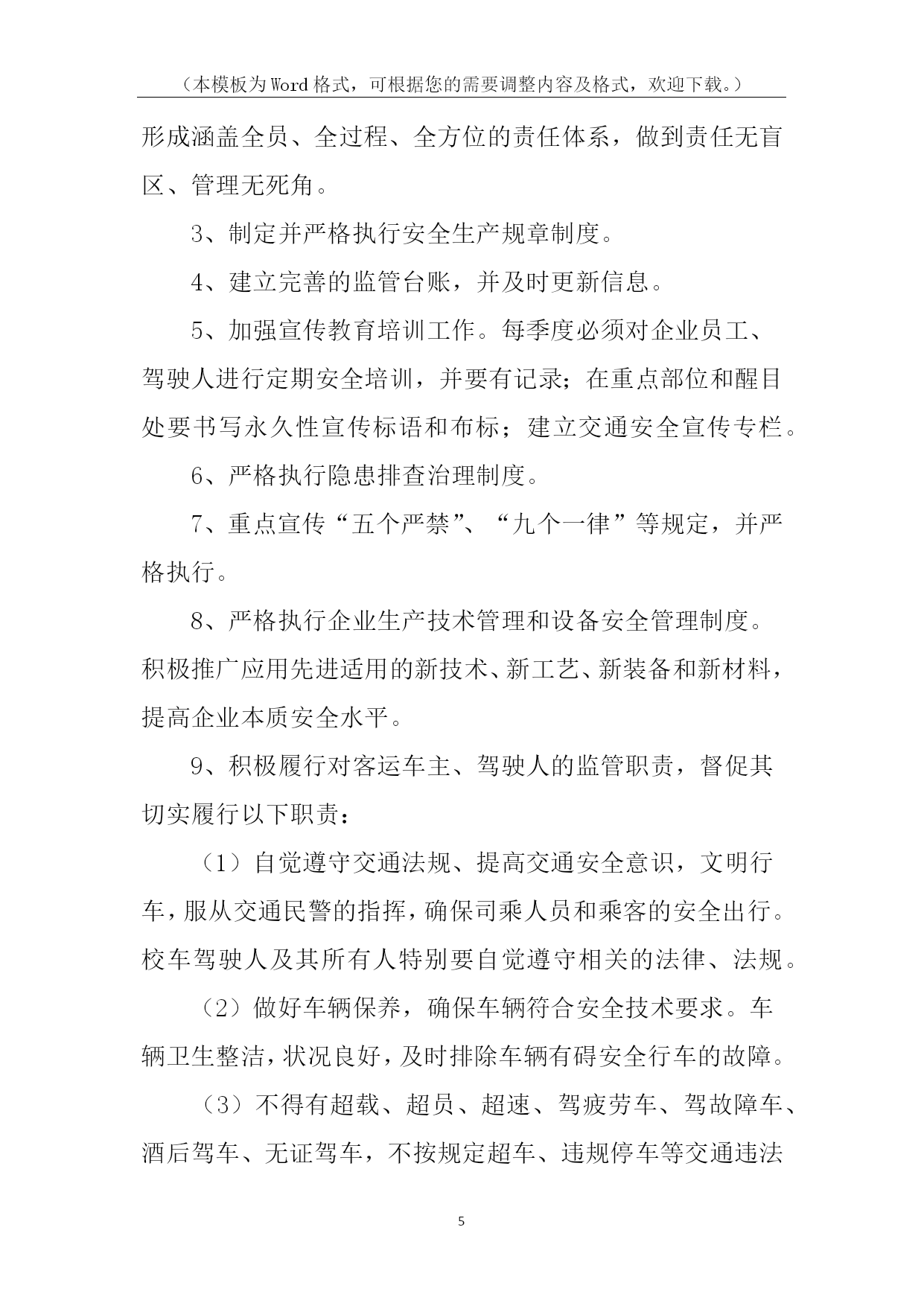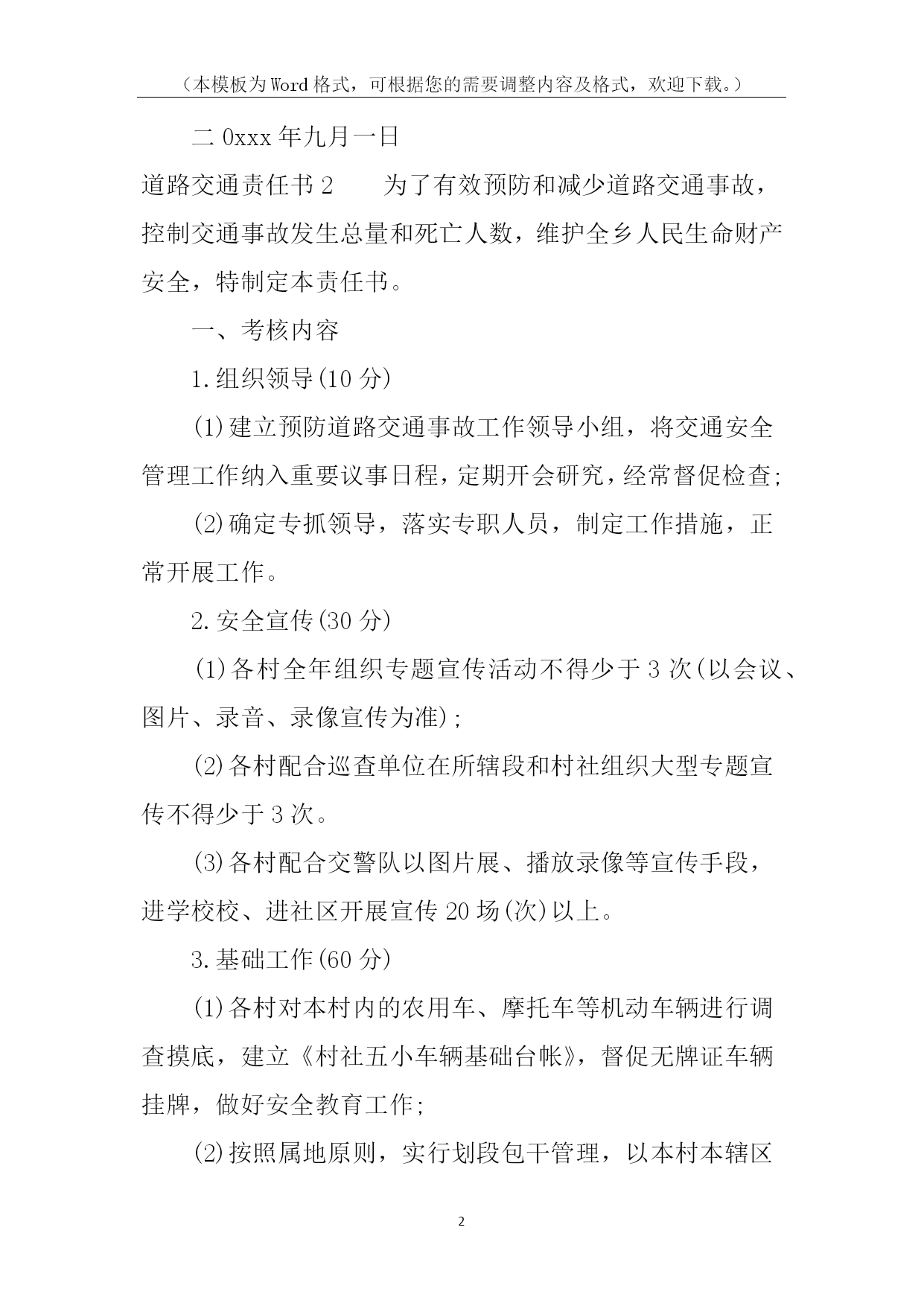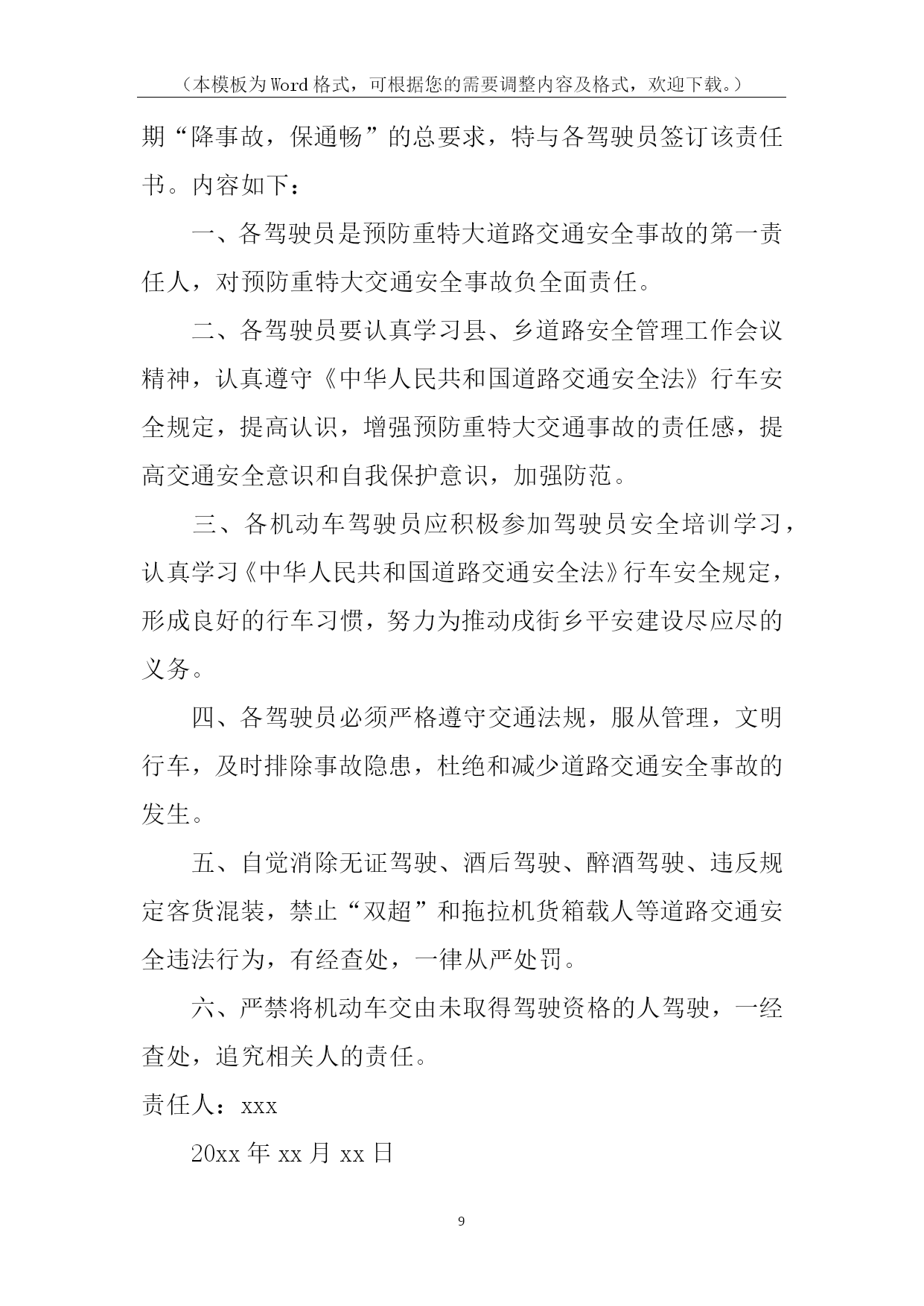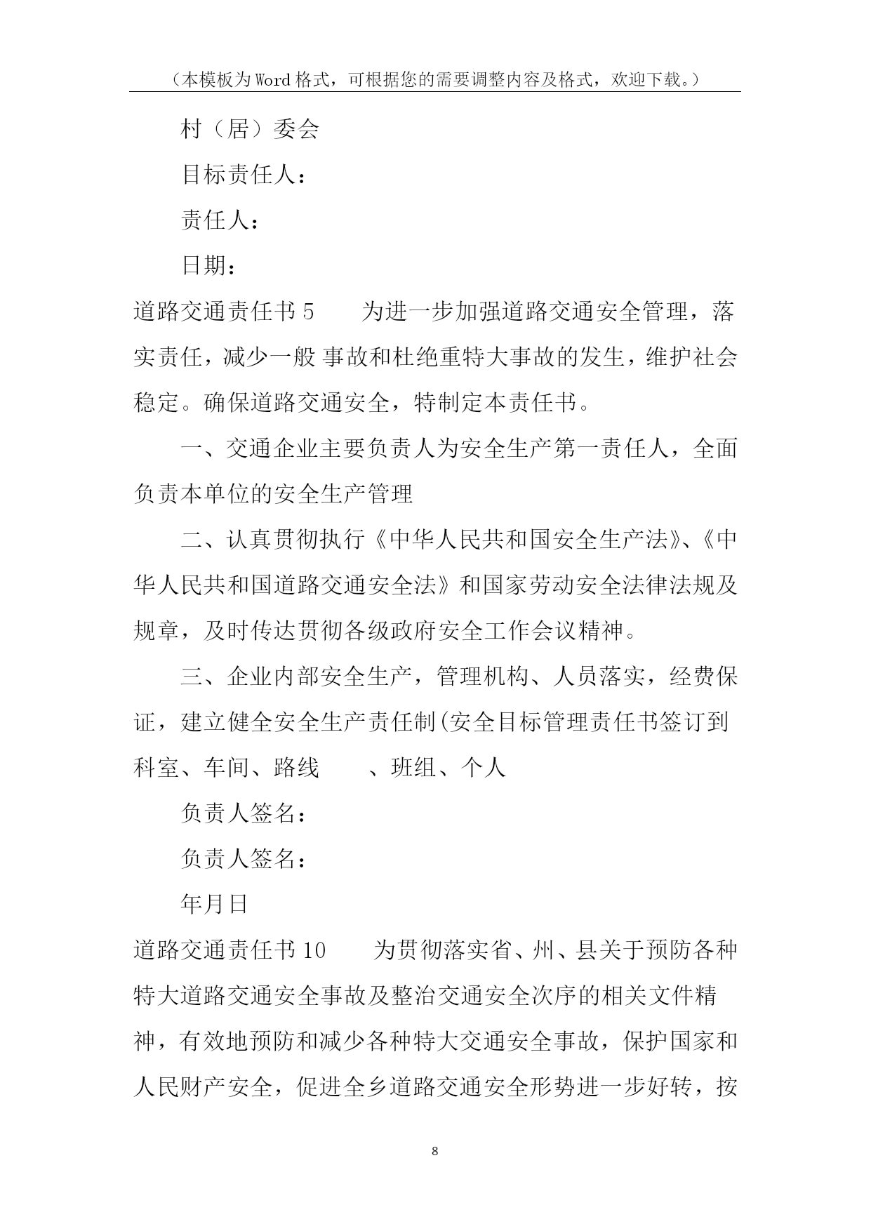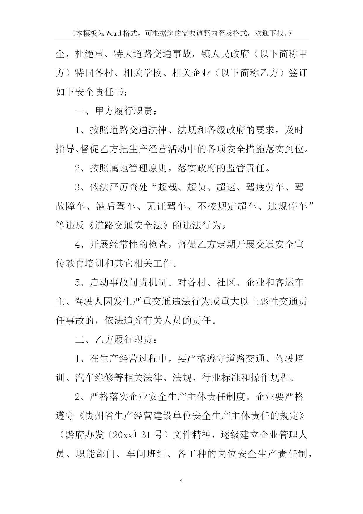 (本模板为Word格式,可根据您的需要调整内容及格式,欢迎下载。)PAGE\*MERGEFORMAT14道路交通责任书道路交通责任书1为有效预防和减少交通事故,努力消除道路交通安全隐患,保障广大师生道路交通安全,确保20xx年我校道路交通事故死亡人数为零的既定目标,特制定本责任书:1、各学校要将道路交通安全工作纳入学校工作的重要议事日程,对预防道路交通安全工作有安排、有检查、有落实,并将道路交通安全工作纳入学校综合治理考核范围,实行目标管理,签定责任书。2、将道路交通安全工作纳入学校法制课程,教育广大师生遵守道路交通安全法规。公路沿线学校要组织教师护送学生过马路。3、开展交通平安宣传教育,加大交通安全宣传力度。教育学生遵守交通安全法规,从小树立交通安全意识。学校要组织开展道路交通安全知识演讲比赛,交通安全伴我行等活动。4、南川中心学校年终对完成上述责任目标的情况组织考核,对成绩显著的学校通报表扬。xxx中心学校校长签字:各小学校长签字:二0xxx年九月一日道路交通责任书2为了有效预防和减少道路交通事故,控制交通事故发生总量和死亡人数,维护全乡人民生命财产安全,特制定本责任书。一、考核内容1.组织领导(10分)(1)建立预防道路交通事故工作领导小组,将交通安全管理工作纳入重要议事日程,定期开会研究,经常督促检查;(2)确定专抓领导,落实专职人员,制定工作措施,正常开展工作。2.安全宣传(30分)(1)各村全年组织专题宣传活动不得少于3次(以会议、图片、录音、录像宣传为准);(2)各村配合巡查单位在所辖段和村社组织大型专题宣传不得少于3次。(3)各村配合交警队以图片展、播放录像等宣传手段,进学校校、进社区开展宣传20场(次)以上。3.基础工作(60分)(1)各村对本村内的农用车、摩托车等机动车辆进行调查摸底,建立《村社五小车辆基础台帐》,督促无牌证车辆挂牌,做好安全教育工作;(2)按照属地原则,实行划段包干管理,以本村本辖区路段为准负责巡查。(3)公路沿线各村要与农户,层层签定《禁止公路打场晒粮责任书》,签定率达到100%。二、考核及奖罚1.本责任书实行百分制量化考核。2.考核工作每半年进行一次考评。考评采取听、查、看相结合的办法,并结合村社道路交通事故发生情况进行评估打分。年终考核以半年和年终两次考核分数累加平均分为奖罚的依据。3、各村对农用车载客、公路上堆放杂物、打场晒粮等违规行为要做详细记录。每发现农用车载客一次扣1分,公路上堆放杂物、打场晒粮一处扣1分。4、对年终考核排名在前三位的村社进行表彰奖励,排名在后两位的对村和包村干部分别进行处罚。5、各村在所包路段内发生一次死亡一人或受伤五人以上特大交通事故的,实行一票否决,对村干部进行经济处罚。负责人签名:年月日道路交通责任书3为切实明确工作职责、强化管理措施,共同做好20xx年度道路交通安全工作,努力提高客运企业、驾培企业、汽车维修企业及客运车辆业主、驾驶人自觉遵守交通法律、法规的自觉性和安全意识,确保广大群众出行安全,杜绝重、特大道路交通事故,镇人民政府(以下简称甲方)特同各村、相关学校、相关企业(以下简称乙方)签订如下安全责任书:一、甲方履行职责:1、按照道路交通法律、法规和各级政府的要求,及时指导、督促乙方把生产经营活动中的各项安全措施落实到位。2、按照属地管理原则,落实政府的监管责任。3、依法严厉查处“超载、超员、超速、驾疲劳车、驾故障车、酒后驾车、无证驾车、不按规定超车、违规停车”等违反《道路交通安全法》的违法行为。4、开展经常性的检查,督促乙方定期开展交通安全宣传教育培训和其它相关工作。5、启动事故问责机制。对各村、社区、企业和客运车主、驾驶人因发生严重交通违法行为或重大以上恶性交通责任事故的,依法追究有关人员的责任。二、乙方履行职责:1、在生产经营过程中,要严格遵守道路交通、驾驶培训、汽车维修等相关法律、法规、行业标准和操作规程。2、严格落实企业安全生产主体责任制度。企业要严格遵守《贵州省生产经营建设单位安全生产主体责任的规定》(黔府办发〔20xx〕31号)文件精神,逐级建立企业管理人员、职能部门、车间班组、各工种的岗位安全生产责任制,形成涵盖全员、全过程、全方位的责任体系,做到责任无盲区、管理无死角。3、制定并严格执行安全生产规章制度。4、建立完善的监管台账,并及时更新信息。5、加强宣传教育培训工作。每季度必须对企业员工、驾驶人进行定期安全培训,并要有记录;在重点部位和醒目处要书写永久性宣传标语和布标;建立交通安全宣传专栏。6、严格执行隐患排查治理制度。7、重点宣传“五个严禁”、“九个一律”等规定,并严格执行。8、严格执行企业生产技术管理和设备安全管理制度。积极推广应用先进适用的新技术、新工艺、新装备和新材料,提高企业本质安全水平。9、积极履