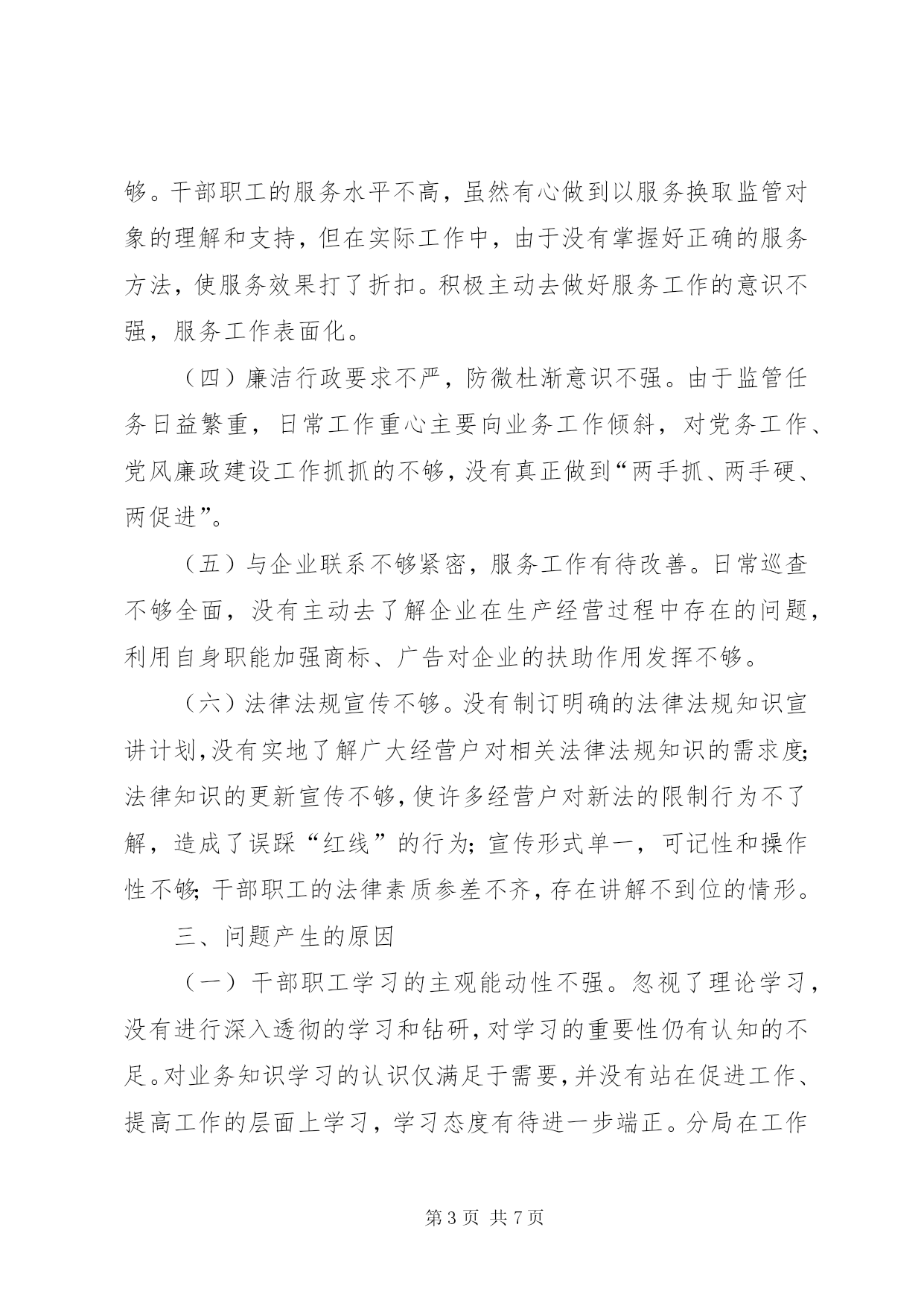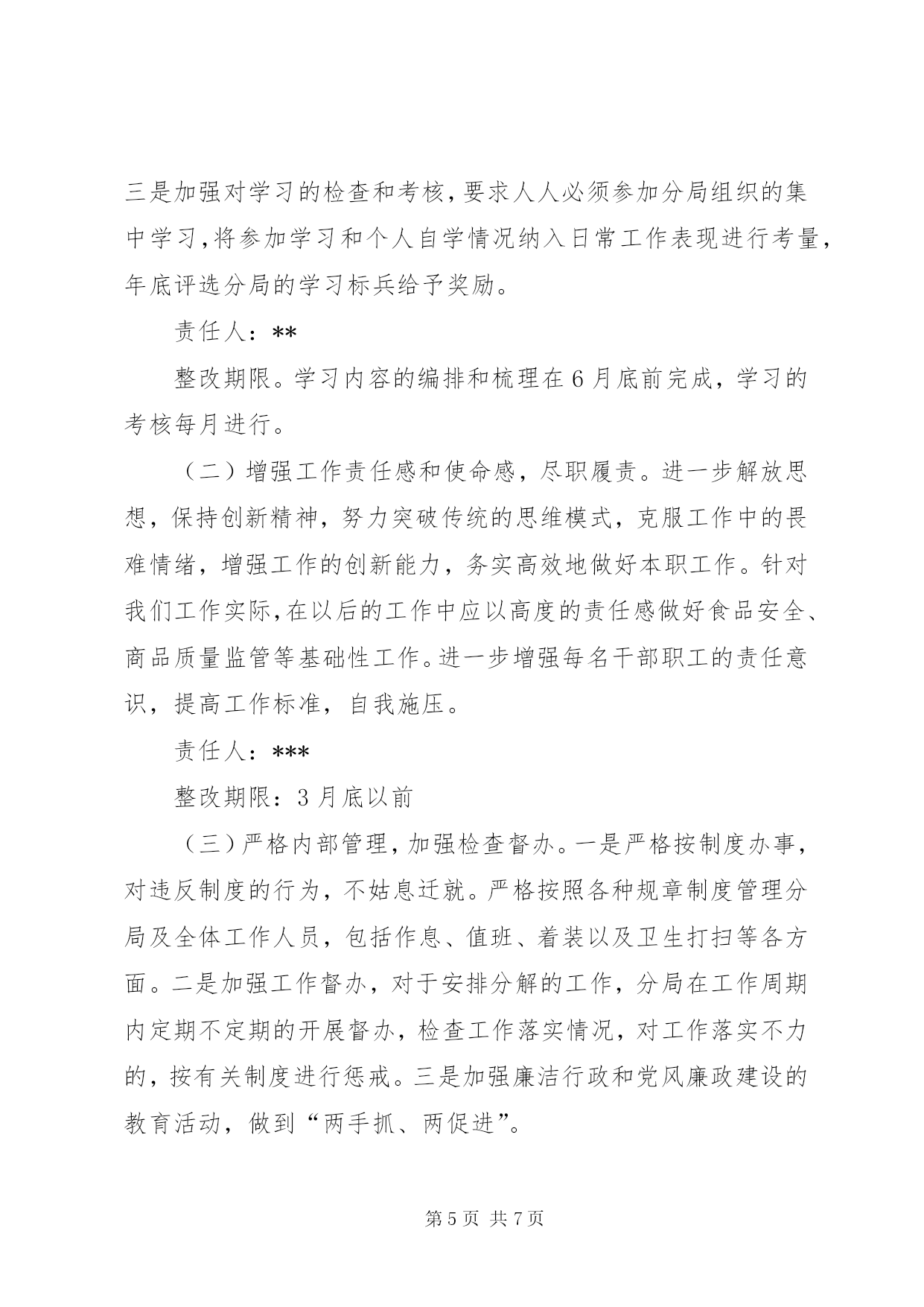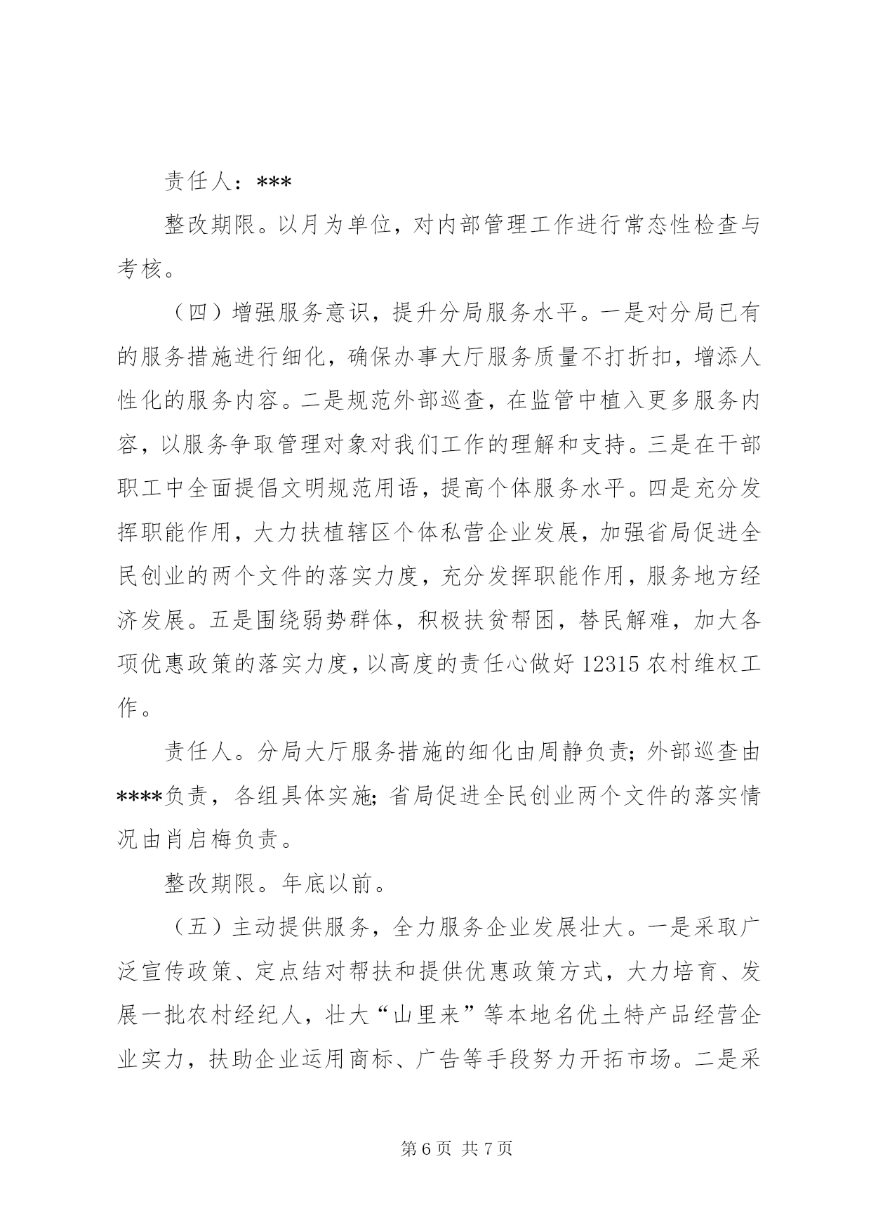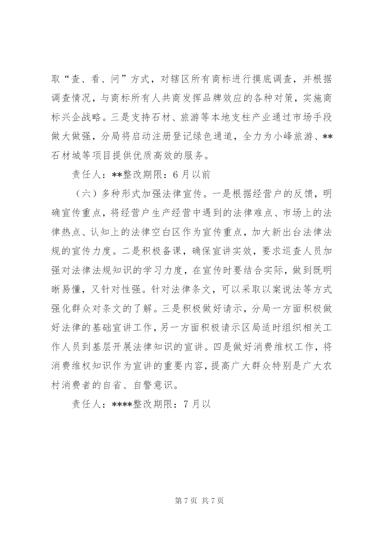 第PAGE\*Arabic\*MERGEFORMAT7页共NUMPAGES\*MERGEFORMAT7页工商局作风建设整改方案工商局作风建设整改方案根据《“两项活动”实施方案》的要求,通过发放征求意见函、上门征求意见、组织干部职工自我评查等方式,全面查摆了分局工作中存在的问题,深入分析了问题存在的原因。为确保学习教育活动能从根本上解决分局与干部职工身上存在的问题,更好地促进工作开展,分局结合查摆出来的问题,特制订以下整改方案。一、整改目标及原则通过整改,努力解决分局干部职工在工作作风、思想观念、执法行为、廉洁行政、工作效能等方面存在的突出问题;努力提高工作人员的履责意识和执行能力;努力解决分局在内部管理、执行落实、学习创新上存在的薄弱环节;努力打造政令通畅、运转优化的基层工商执法主体;努力实现又好又快,服务与促进地方经济发展。在具体整改工作中,必须坚持在具体实践工作中检验整改效果,务求实效的原则;必须坚持长期学习的原则;必须坚持统筹兼顾,逐一整改到位的原则。二、存在的问题(一)学习开展得不够深入,学习组织工作有待进一步完善。一是学习的随意性较大,年初,分局严格制订了当年的学习计划,并将学习责任细化到个人,但在学习活动的开展上,随意性较大,没有严格按照规定的时间和课程循序渐进的开展学习。二是分局组织学习的内容单一,形式不够灵活,学习多以上级文件代替学习计划中规定的内容。三是主动学习的风气不浓,不够积极主动,没有做到虚心求学;而干部职工在学习过程中仍存在不求甚解的现象,没有深入进行业务工作的钻研。四是学习不够平衡,存在重业务、轻理论的现象。(二)工作作风不够扎实,内部管理不够严格。主要表现在:一是分局对工作的检查督办力度不大,对上级交办和基础业务工作都能及时安排下去,但对落实情况检查督办的不够;二是虽然建立了一整套切合分局实际的内部管理制度,但在实际中对违反管理制度的行为口头警戒的多,严格按制度兑现的少;三是创新意识不强,工作标准要求不高,只求过得去、不求过得硬,各项工作疲于应付,没有真正静下心来思考如何解决工作中存在的诸如监管不到位、监管手段单一等顽疾,工作方法老套、成效不显;四是单位执行力有待加强;五是食品安全、商品质量监管等到重点工作仍有不到位的地方。(三)服务举措不够细,服务效果不显。表现在工作中自觉不自觉存在重收费、轻服务,有些服务发展方面的工作局限在说的多、做的少,发挥职能作用不够,比如在服务新农村建设方面,充分利用商标、广告、合同等职能作用主动为农民和企业服务不够。干部职工的服务水平不高,虽然有心做到以服务换取监管对象的理解和支持,但在实际工作中,由于没有掌握好正确的服务方法,使服务效果打了折扣。积极主动去做好服务工作的意识不强,服务工作表面化。(四)廉洁行政要求不严,防微杜渐意识不强。由于监管任务日益繁重,日常工作重心主要向业务工作倾斜,对党务工作、党风廉政建设工作抓抓的不够,没有真正做到“两手抓、两手硬、两促进”。(五)与企业联系不够紧密,服务工作有待改善。日常巡查不够全面,没有主动去了解企业在生产经营过程中存在的问题,利用自身职能加强商标、广告对企业的扶助作用发挥不够。(六)法律法规宣传不够。没有制订明确的法律法规知识宣讲计划,没有实地了解广大经营户对相关法律法规知识的需求度;法律知识的更新宣传不够,使许多经营户对新法的限制行为不了解,造成了误踩“红线”的行为;宣传形式单一,可记性和操作性不够;干部职工的法律素质参差不齐,存在讲解不到位的情形。三、问题产生的原因(一)干部职工学习的主观能动性不强。忽视了理论学习,没有进行深入透彻的学习和钻研,对学习的重要性仍有认知的不足。对业务知识学习的认识仅满足于需要,并没有站在促进工作、提高工作的层面上学习,学习态度有待进一步端正。分局在工作安排的时候对学习的侧重和对学习的抓落实不够。(二)服务观念仍显弱化。在实际工作中,没有自觉地把群众的满意程度作为检验自身工作成效的最高标准。日常工作中,服务措施不够具体,不够实在。(三)部分干部职工对自己定位不准。在日常工作中,要求不高,仅满足于一般工作标准,对自己职务、岗位的理解和对自己肩负的责任认识不够,依赖性强,不能积极主动开展工作,独挡一面的能力不足。四、整改措施针对查摆出来的问题及其存在的根源,分局组织全体干部职工召开专题会议进行认真讨论和深入剖析,明确了整改责任人和整改期,并提出了以下主要的整改措施。(一)不断加强学习。一是认真做好学习的组织工作,将学习和日常业务工作一起安排,争取每周组织干部职工开展一次集中学习,继续推动和完善“轮值主讲”制度,提高学习的主动性。二是科学编排学习内容,既要深入学习党的理论知识和十七大精神,学会用科学发展观的要求审视自己的工作,又要增加学习的工商局作风建设整改方案宽度