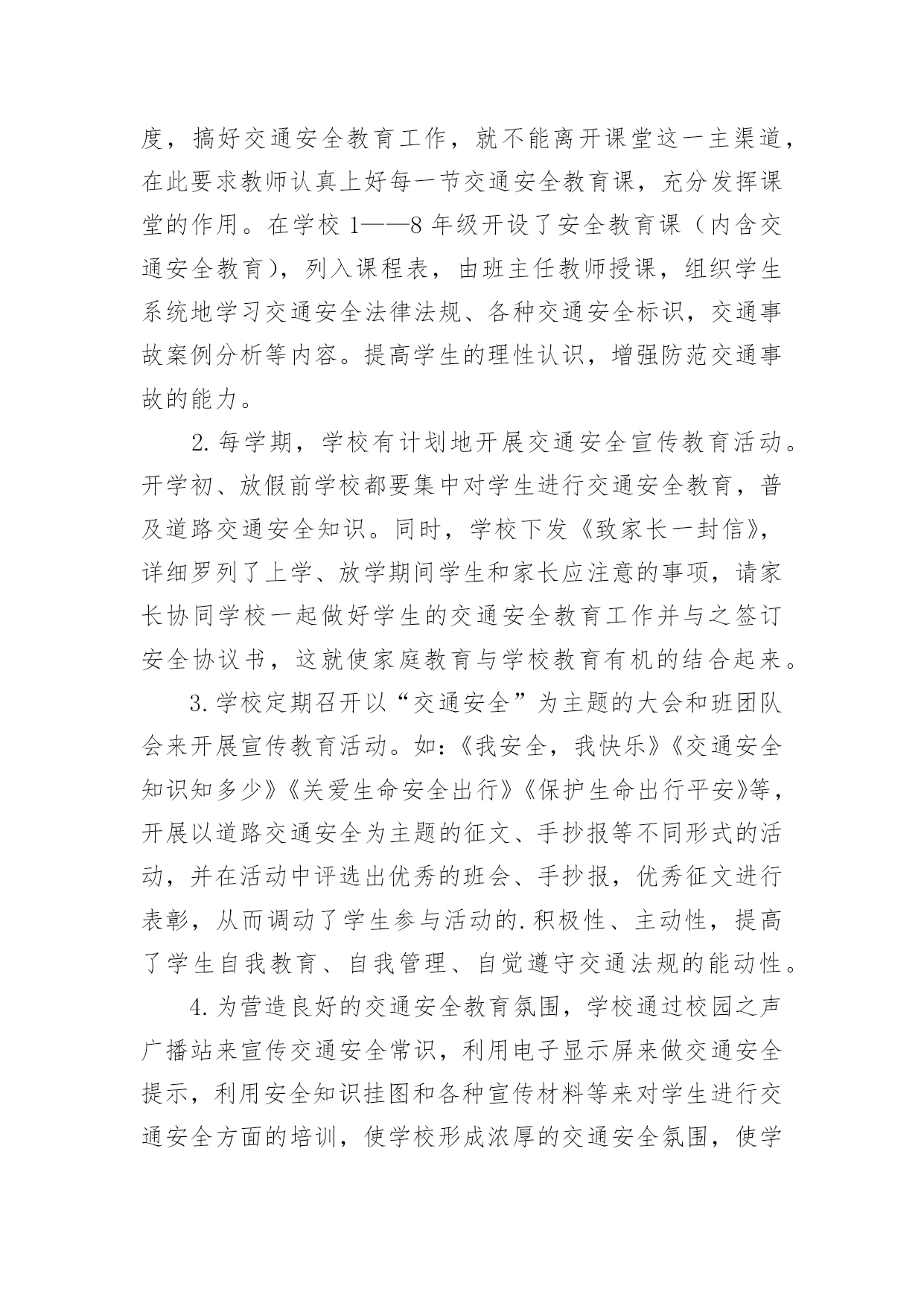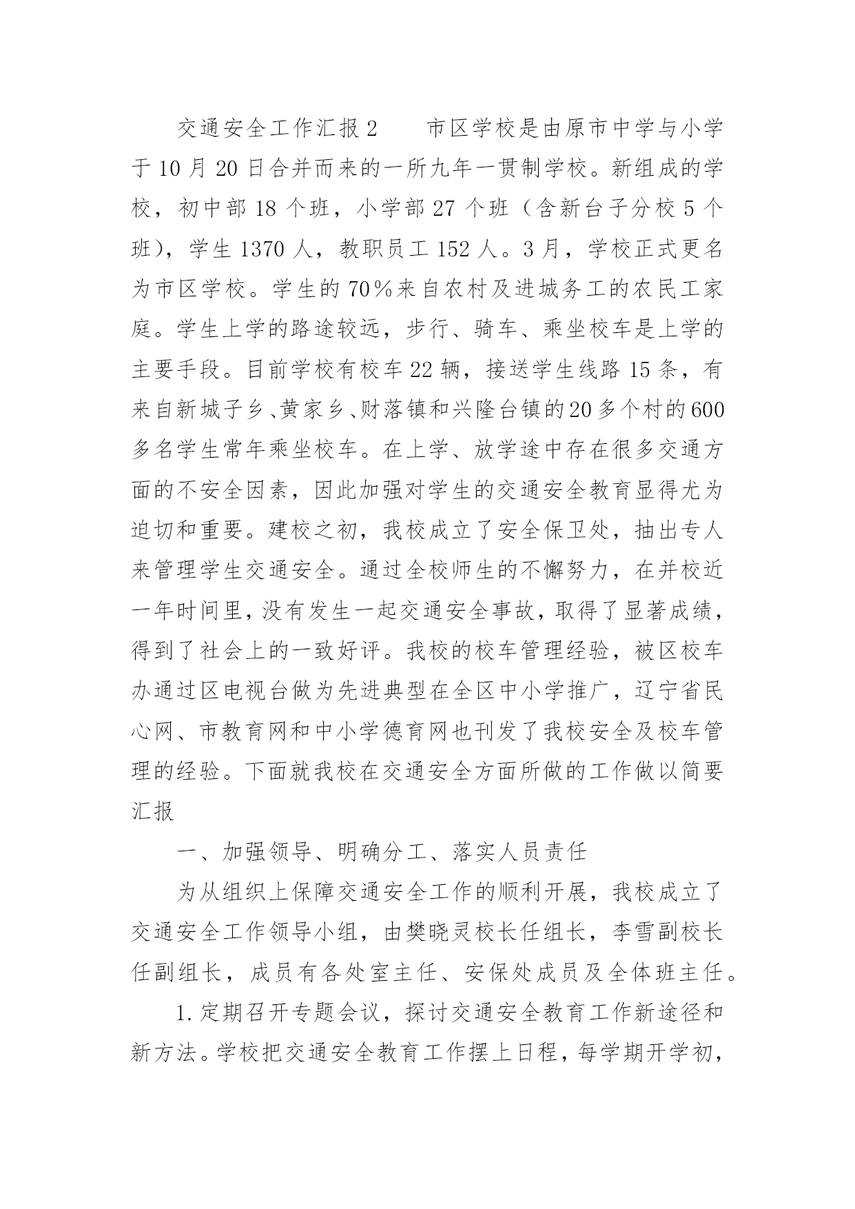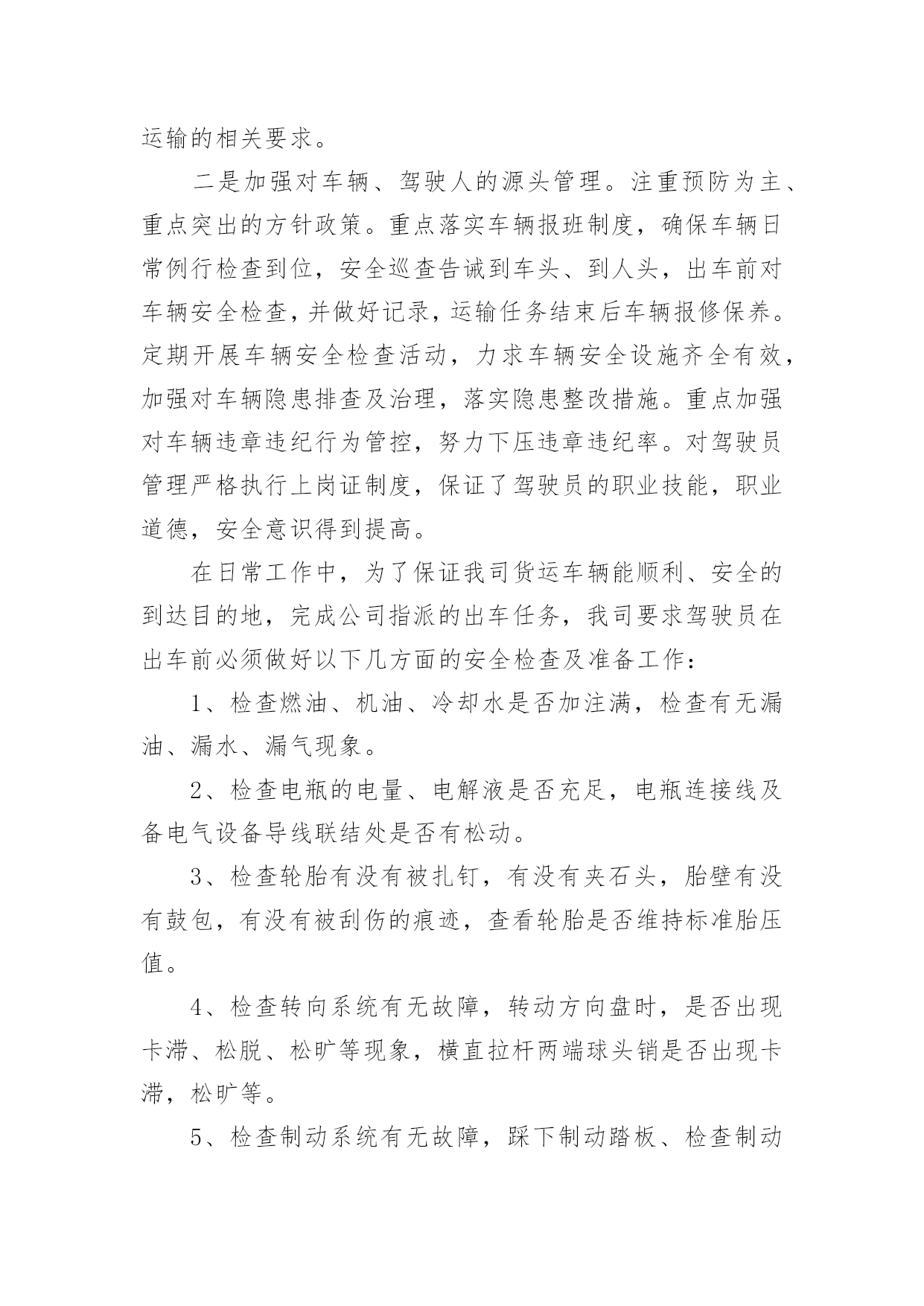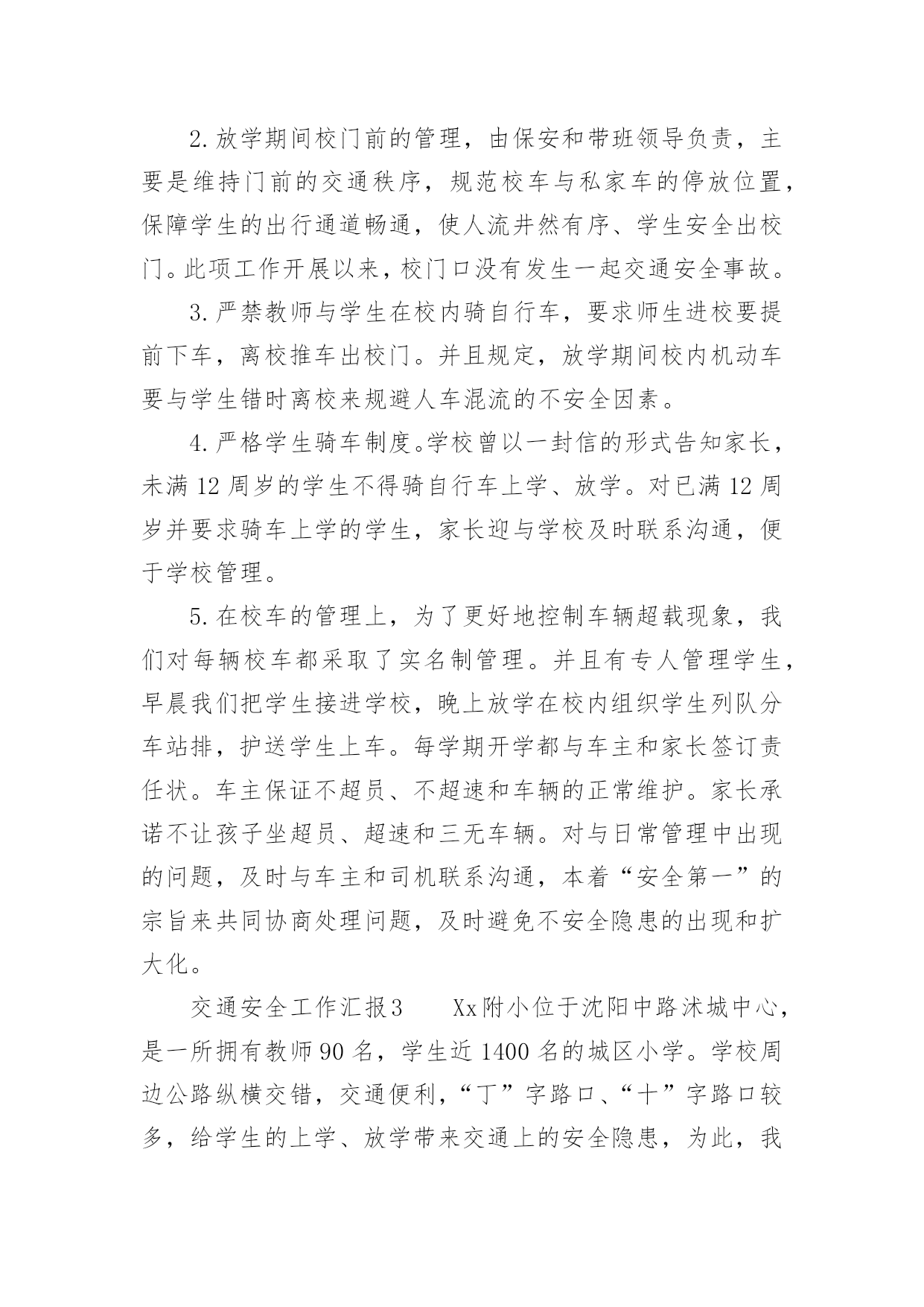 交通安全工作汇报交通安全工作汇报(通用8篇)无论是身处学校还是步入社会,汇报的使用范围越来越广,汇报时,要熟悉掌握汇报内容,做到条理清晰,主次分明,说了那么多,你会写汇报吗?以下是小编精心整理的交通安全工作汇报(通用8篇),欢迎阅读与收藏。交通安全工作汇报1在20xx年,我司围绕“安全第一,预防为主”的方针,紧紧围绕xxxx公司相关安全管理规定,突出开展安全隐患排查整治工作,加强安全生产运输的监管管理,消除安全隐患。结合我公司实际情况集中展开了安全生产自查工作,主要体现在以下几方面:一、加强安全管理,明确工作目标我司按照“部门具体负责,全员人人有责”的安全管理格局,明确安全责任制。一是领导全天值班,手机保持24小时畅通;二是与驾驶员签订安全责任书,明确安全责任,确保安全完成运输任务;三是加强从业人员的安全运输知识、业务技能培训,全公司安全员持证率100%;四是加大安全资金投入,对车辆安全设备更新、添置,增加安全防范力度;五是做好年终安全考核工作,明确考核范围和考核办法。二、抓好隐患整改排查工作1、认真做好“查隐患、抓整改、重落实、保安全”,安全隐患排查治理,在安全隐患排查治理过程中,首先实行安全检查与自查,并对每次查出的安全隐患进行复查,并做好相关记录台账。2、加大对车辆的监控力度,认真做好超速、疲劳驾驶等违章帮教工作。公司GPS、北斗,微信等平台实行24小时监控,发现车辆超速、疲劳驾驶等违章行为及时提醒教育并给予相应的处罚,确保车辆运输安全在可控范围内。3、抓好恶劣天气条件下安全工作,为保障对冬季雨、雪、雾天气下行车安全,公司制定了相应的应急方案和措施,利用微信工作群、短信等平台为驾驶员及时发送天气预警信息,尤其是对执行长途运输任务须执行夜间行驶等任务的驾驶员,通过GPS、北斗在途系统监控,掌握其车辆动态,若经过特殊路段,第一时间电话提醒驾驶员注意行车安全。安排安全员督促驾驶员做好出车前的检查工作(按公司规定的.检查表一一落实到位),雨季重点检查集装箱、灯光、转向、制动、轮胎、GPS设备、雨刮器,对存在问题的及时整改,杜绝安检不合格的车辆执行任务。抓好每天出车前交待,通过领导、安全员、调度员重点交待特殊天气及特殊路段行车的注意事项。三、加强安全教育培训学习力度我司安全培训和教育学习工作达到四个落实的总要求,即:人员落实、时间落实、效果落实。公司全体从业人员均为安全培训和教育学习的对象,均应无条件地、自觉地参加公司组织的各种教育培训课程,车辆驾驶员为培训重点。驾驶员主要培训驾驶员职业道德教育、法纪教育、道路运输常识和现场急救知识教育、安全驾驶和机械安全常识教育、道路具体事故案例分析为主。其他从业人员主要培训职业道德教育、法纪教育、业务操作安全知识教育等为主。公司的教育培训工作每个月举行一次,每次不少于2课时。教育培训工作的形式应形象生动,内容丰富多彩,也可采用“请进来、走出去”的方式,即请执法人员(运管、交警、刑警和其他法律工作者)上课,到事故发生地(也可以用音像制品代替)直击现场等。在微信群里发放交通安全宣传视频、交通安全法律法规,不断加强驾驶员业务知识、操作技能的强化培训和处置突发事件的特殊培训,增强驾驶员的安全意识和应急处置能力。主持学习的安全员,必须有内容、有形式、有记录、有签字,严防走过场,搞形式主义或代签字。授课人课前要认真准备讲义和教材,保证授课质量,达到良好的讲义培训效果。对因故未能参加安全培训和讲义学习人员,要及时组织补课;对无故不参加安全培训和教育学习的人员旷工论处,并要脱产补课。安全管理人员每半年要进行一次安全培训和教育学习的工作总结,并对下半年的教育培训工作做出安排,真正实现从“要我安全”到“我要安全”的转变。四、健全安全生产管理制度一是以全面落实安全生产为核心,完善相关法律法规、公司管理规章制度,落实安全责任主体,层层抓落实的责任体系,责任到个人。严格按照“安全生产标准化”要求,建立健全安全管理台帐,保证各项台帐真实、有效。针对驾驶员建立“一人一档”,车辆建立“一车一档”确认满足安全运输的相关要求。二是加强对车辆、驾驶人的源头管理。注重预防为主、重点突出的方针政策。重点落实车辆报班制度,确保车辆日常例行检查到位,安全巡查告诫到车头、到人头,出车前对车辆安全检查,并做好记录,运输任务结束后车辆报修保养。定期开展车辆安全检查活动,力求车辆安全设施齐全有效,加强对车辆隐患排查及治理,落实隐患整改措施。重点加强对车辆违章违纪行为管控,努力下压违章违纪率。对驾驶员管理严格执行上岗证制度,保证了驾驶员的职业技能,职业道德,安全意识得到提高。在日常工作中,为了保证我司货运车辆能顺利、安全的到达目的地,完成公司指派的出车任务,我司要求驾驶员在出车前必须做好以下几方面的安全检查及准备工作:1、检查燃油、机油、冷却水