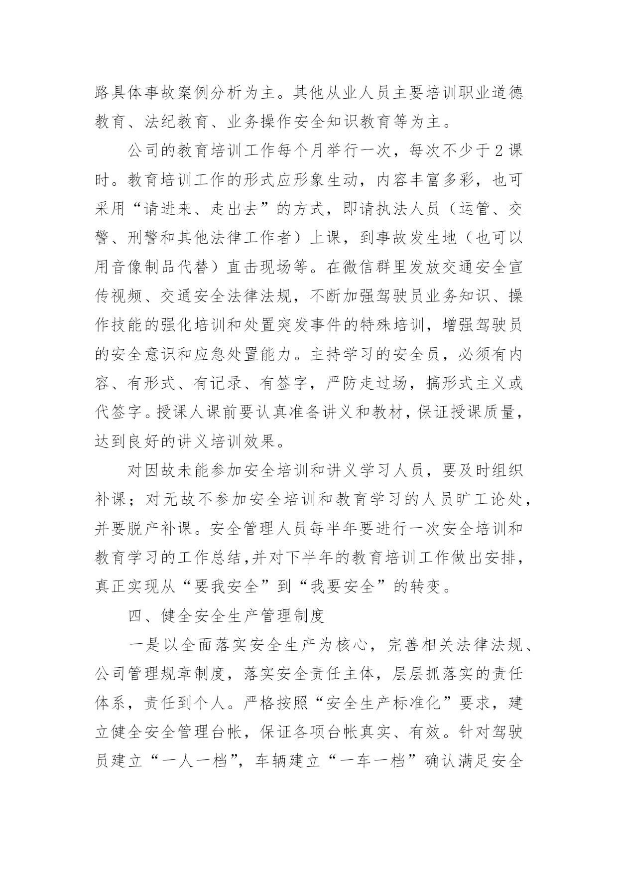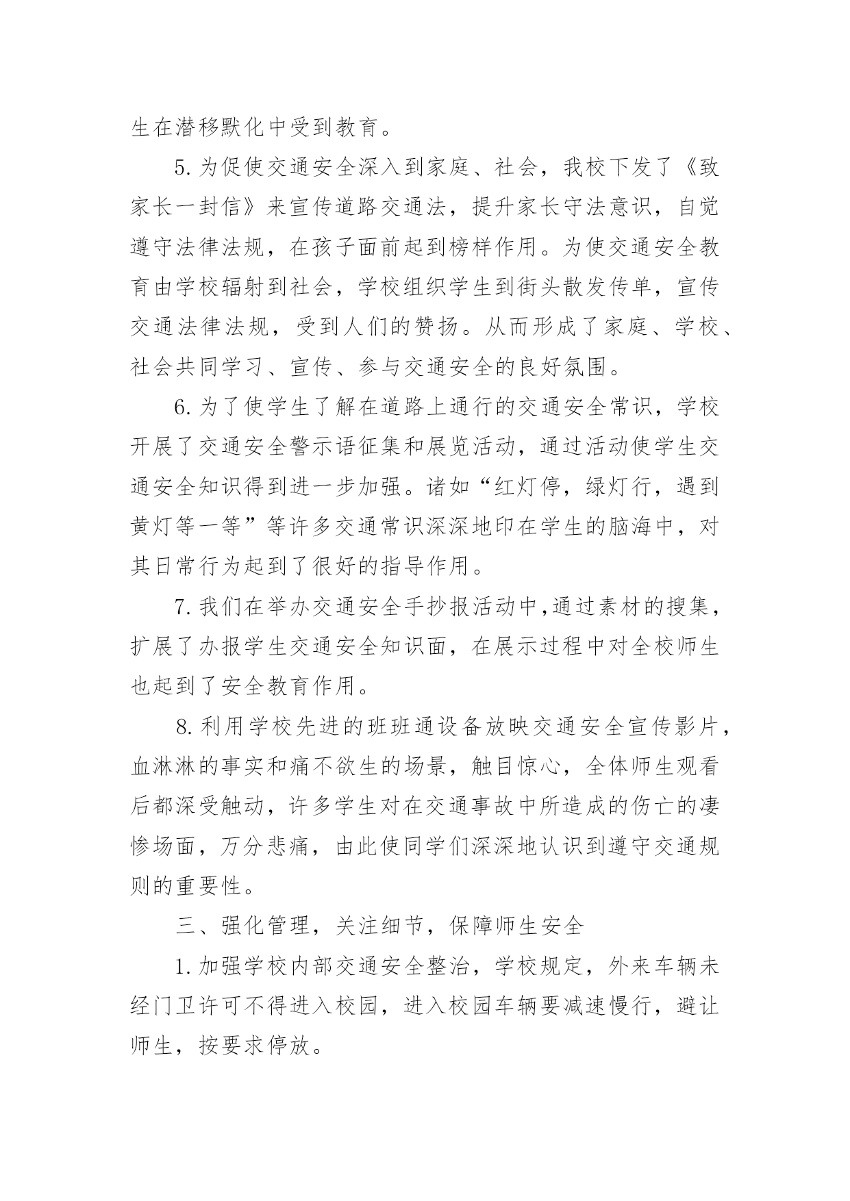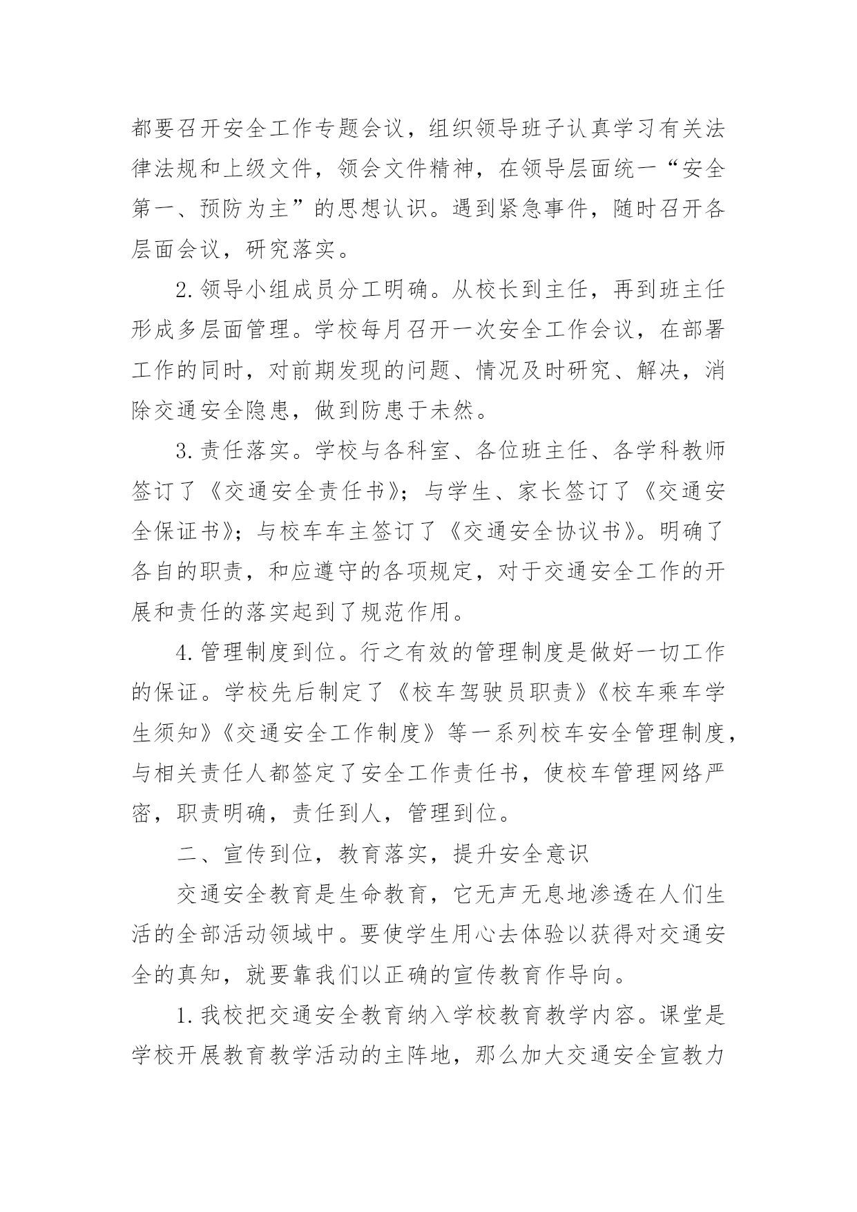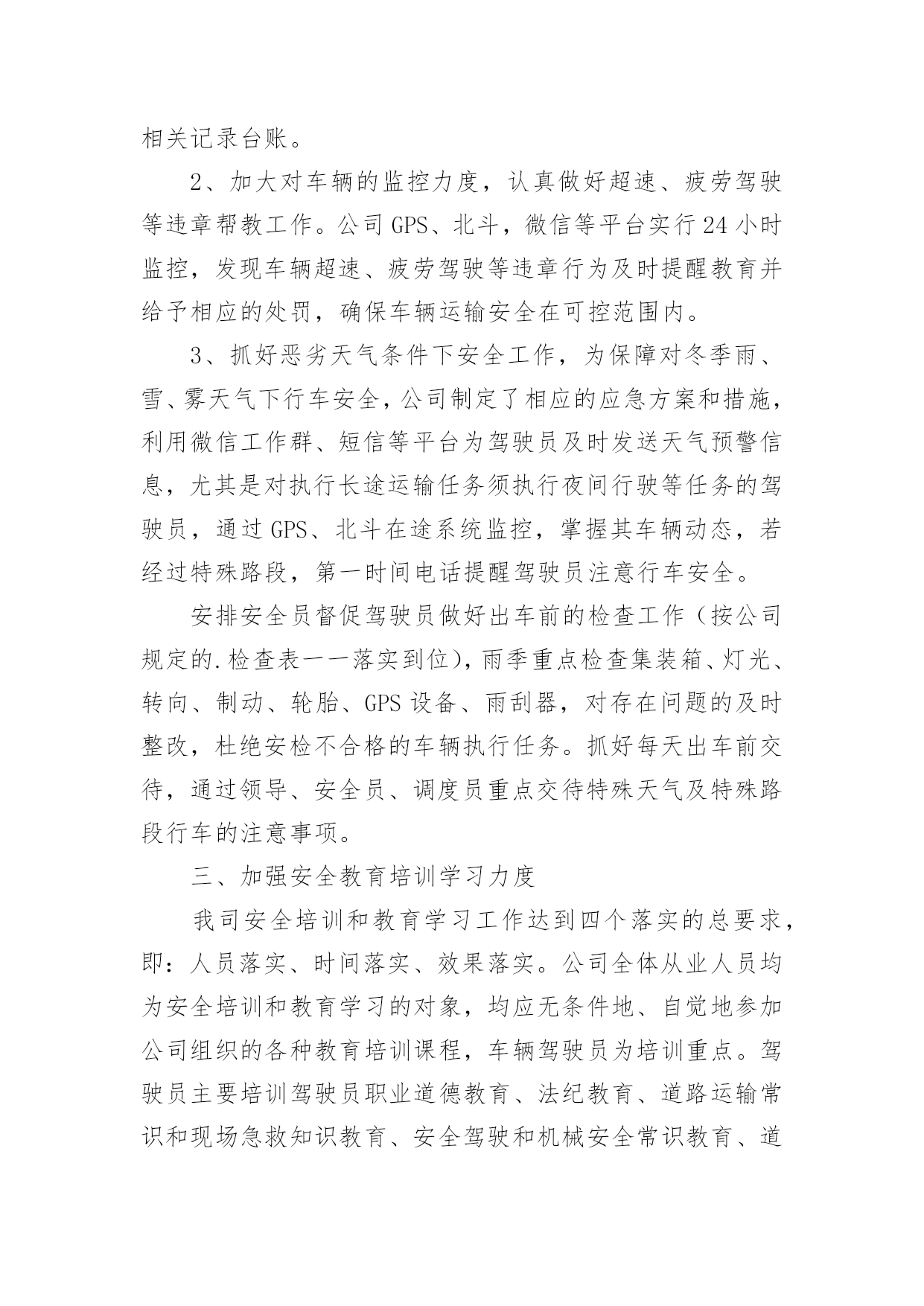 交通安全工作汇报交通安全工作汇报(通用8篇)无论是身处学校还是步入社会,汇报的使用范围越来越广,汇报时,要熟悉掌握汇报内容,做到条理清晰,主次分明,说了那么多,你会写汇报吗?以下是小编精心整理的交通安全工作汇报(通用8篇),欢迎阅读与收藏。交通安全工作汇报1在20xx年,我司围绕“安全第一,预防为主”的方针,紧紧围绕xxxx公司相关安全管理规定,突出开展安全隐患排查整治工作,加强安全生产运输的监管管理,消除安全隐患。结合我公司实际情况集中展开了安全生产自查工作,主要体现在以下几方面:一、加强安全管理,明确工作目标我司按照“部门具体负责,全员人人有责”的安全管理格局,明确安全责任制。一是领导全天值班,手机保持24小时畅通;二是与驾驶员签订安全责任书,明确安全责任,确保安全完成运输任务;三是加强从业人员的安全运输知识、业务技能培训,全公司安全员持证率100%;四是加大安全资金投入,对车辆安全设备更新、添置,增加安全防范力度;五是做好年终安全考核工作,明确考核范围和考核办法。二、抓好隐患整改排查工作1、认真做好“查隐患、抓整改、重落实、保安全”,安全隐患排查治理,在安全隐患排查治理过程中,首先实行安全检查与自查,并对每次查出的安全隐患进行复查,并做好相关记录台账。2、加大对车辆的监控力度,认真做好超速、疲劳驾驶等违章帮教工作。公司GPS、北斗,微信等平台实行24小时监控,发现车辆超速、疲劳驾驶等违章行为及时提醒教育并给予相应的处罚,确保车辆运输安全在可控范围内。3、抓好恶劣天气条件下安全工作,为保障对冬季雨、雪、雾天气下行车安全,公司制定了相应的应急方案和措施,利用微信工作群、短信等平台为驾驶员及时发送天气预警信息,尤其是对执行长途运输任务须执行夜间行驶等任务的驾驶员,通过GPS、北斗在途系统监控,掌握其车辆动态,若经过特殊路段,第一时间电话提醒驾驶员注意行车安全。安排安全员督促驾驶员做好出车前的检查工作(按公司规定的.检查表一一落实到位),雨季重点检查集装箱、灯光、转向、制动、轮胎、GPS设备、雨刮器,对存在问题的及时整改,杜绝安检不合格的车辆执行任务。抓好每天出车前交待,通过领导、安全员、调度员重点交待特殊天气及特殊路段行车的注意事项。三、加强安全教育培训学习力度我司安全培训和教育学习工作达到四个落实的总要求,即:人员落实、时间落实、效果落实。公司全体从业人员均为安全培训和教育学习的对象,均应无条件地、自觉地参加公司组织的各种教育培训课程,车辆驾驶员为培训重点。驾驶员主要培训驾驶员职业道德教育、法纪教育、道路运输常识和现场急救知识教育、安全驾驶和机械安全常识教育、道路具体事故案例分析为主。其他从业人员主要培训职业道德教育、法纪教育、业务操作安全知识教育等为主。公司的教育培训工作每个月举行一次,每次不少于2课时。教育培训工作的形式应形象生动,内容丰富多彩,也可采用“请进来、走出去”的方式,即请执法人员(运管、交警、刑警和其他法律工作者)上课,到事故发生地(也可以用音像制品代替)直击现场等。在微信群里发放交通安全宣传视频、交通安全法律法规,不断加强驾驶员业务知识、操作技能的强化培训和处置突发事件的特殊培训,增强驾驶员的安全意识和应急处置能力。主持学习的安全员,必须有内容、有形式、有记录、有签字,严防走过场,搞形式主义或代签字。授课人课前要认真准备讲义和教材,保证授课质量,达到良好的讲义培训效果。对因故未能参加安全培训和讲义学习人员,要及时组织补课;对无故不参加安全培训和教育学习的人员旷工论处,并要脱产补课。安全管理人员每半年要进行一次安全培训和教育学习的工作总结,并对下半年的教育培训工作做出安排,真正实现从“要我安全”到“我要安全”的转变。四、健全安全生产管理制度一是以全面落实安全生产为核心,完善相关法律法规、公司管理规章制度,落实安全责任主体,层层抓落实的责任体系,责任到个人。严格按照“安全生产标准化”要求,建立健全安全管理台帐,保证各项台帐真实、有效。针对驾驶员建立“一人一档”,车辆建立“一车一档”确认满足安全运输的相关要求。二是加强对车辆、驾驶人的源头管理。注重预防为主、重点突出的方针政策。重点落实车辆报班制度,确保车辆日常例行检查到位,安全巡查告诫到车头、到人头,出车前对车辆安全检查,并做好记录,运输任务结束后车辆报修保养。定期开展车辆安全检查活动,力求车辆安全设施齐全有效,加强对车辆隐患排查及治理,落实隐患整改措施。重点加强对车辆违章违纪行为管控,努力下压违章违纪率。对驾驶员管理严格执行上岗证制度,保证了驾驶员的职业技能,职业道德,安全意识得到提高。在日常工作中,为了保证我司货运车辆能顺利、安全的到达目的地,完成公司指派的出车任务,我司要求驾驶员在出车前必须做好以下几方面的安全检查及准备工作:1、检查燃油、机油、冷却水
