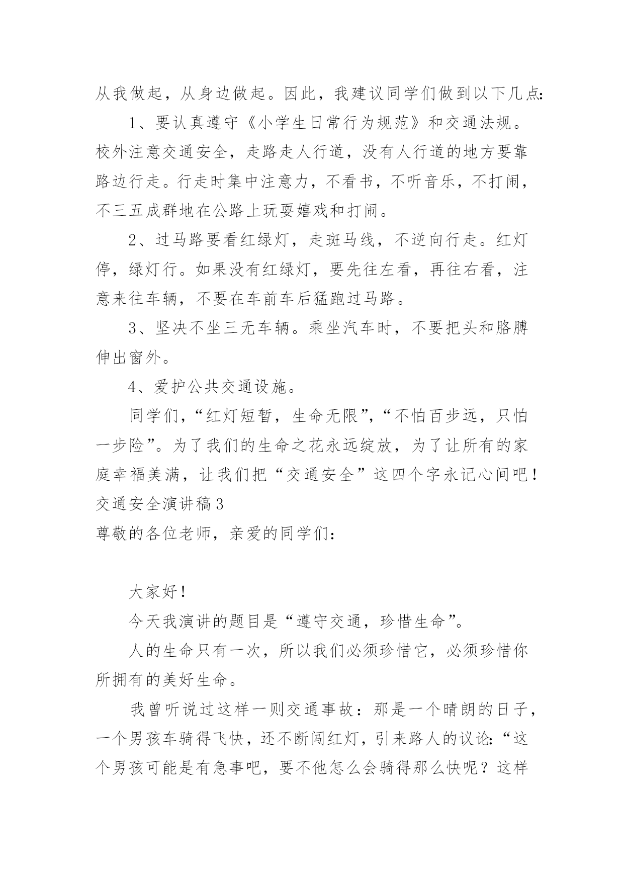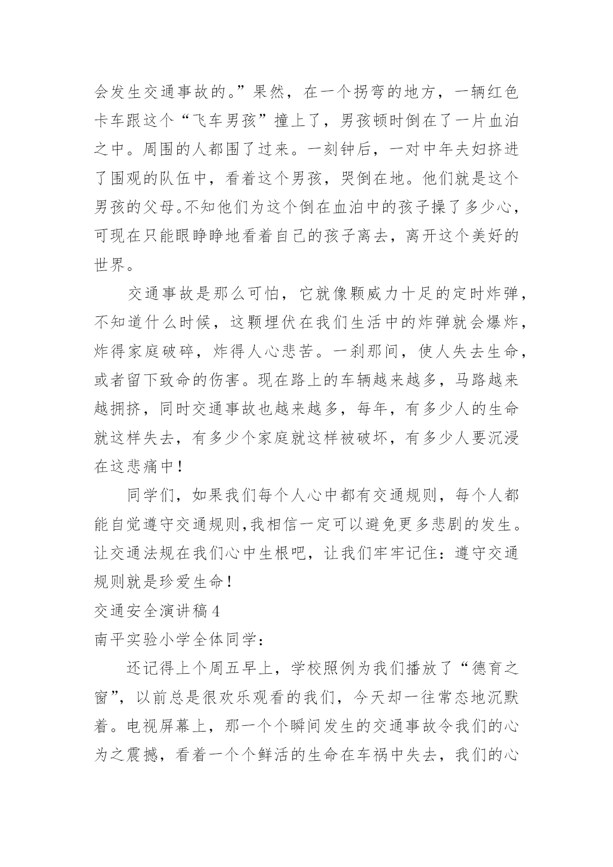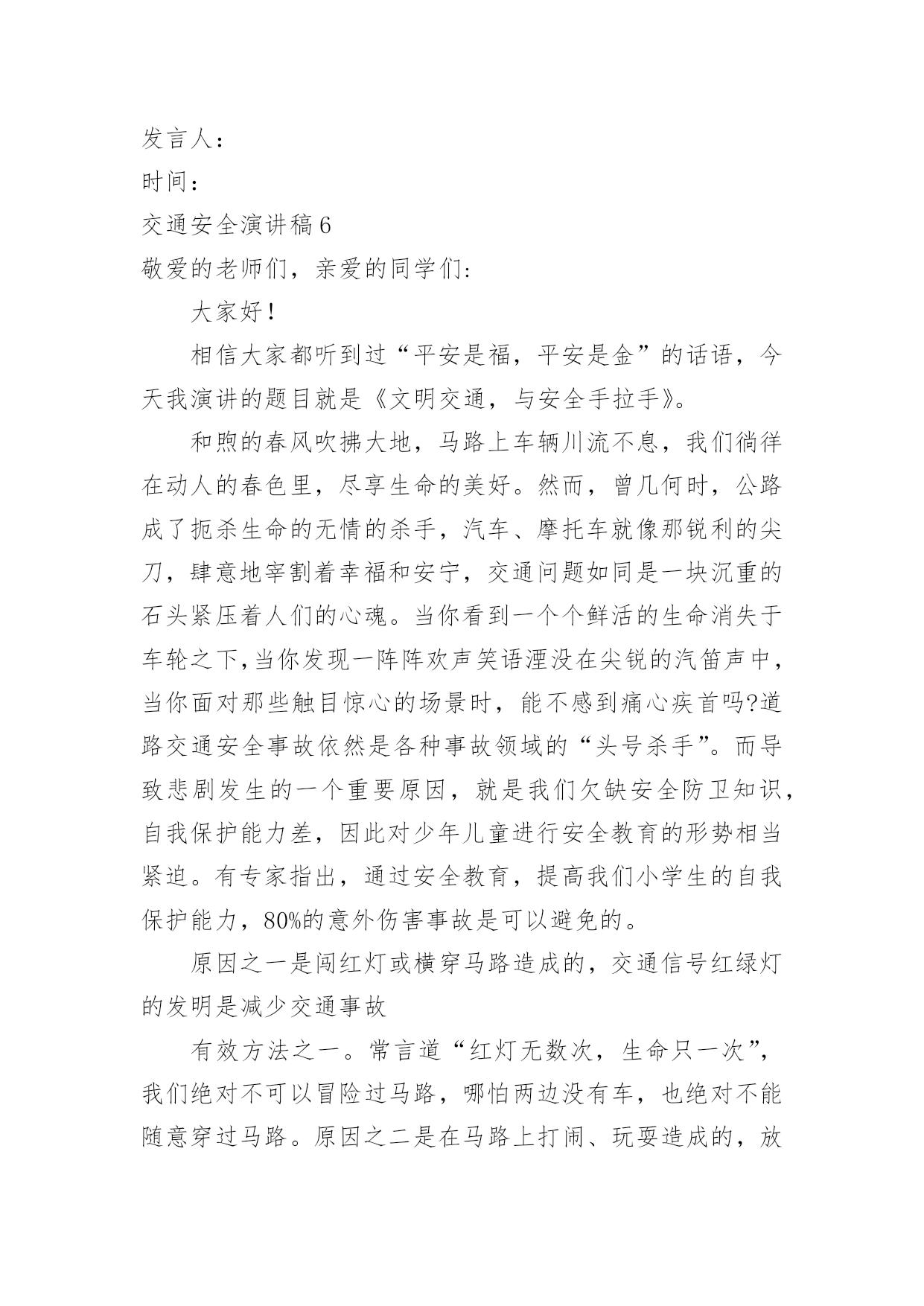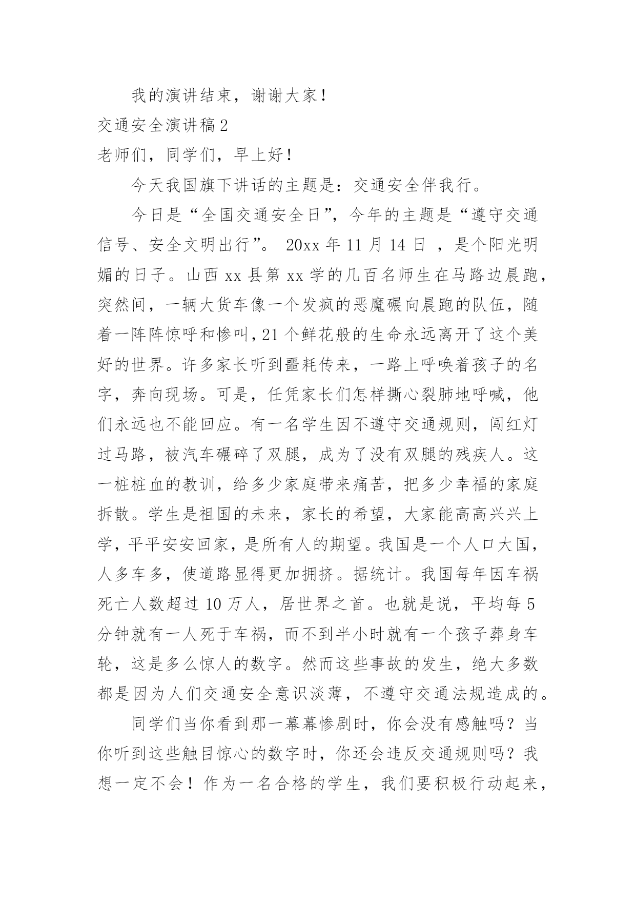 交通安全演讲稿交通安全演讲稿【热】演讲稿可以帮助发言者更好的表达。在现在社会,需要使用演讲稿的事情愈发增多,你写演讲稿时总是没有新意?以下是小编收集整理的交通安全演讲稿,欢迎阅读与收藏。交通安全演讲稿1亲爱的老师、同学们:大家好!最近,为了防止行人横穿马路,我市相关部门在好多马路上都安装了防护栏。尽管如此,一些行人为了自己方便,不顾安危翻越护栏,横穿马路。记得去年的一天,在河南理工大学门口附近,有一位60多岁的爷爷过马路时,看见马路上暂时没有过往的车辆,就翻越护栏。没想到在翻越过程中,没抓紧护栏,失手摔在了马路中央的护栏旁边。当时,我和妈妈正好路过,亲眼目睹了整个过程,那位爷爷在摔倒后就昏迷了。所以我想告诉大家,翻越护栏、横穿马路是非常危险的,即使没有车辆过往,我们也要遵守交通规则,因为意外可能随时都会发生。我想对那些不遵守交通规则的叔叔、阿姨、爷爷、奶奶们说:过马路时,一定要走斑马线或走天桥,千万不要翻越护栏,因为你们是我们小朋友的学习榜样。我的演讲结束,谢谢大家!交通安全演讲稿2老师们,同学们,早上好!今天我国旗下讲话的主题是:交通安全伴我行。今日是“全国交通安全日”,今年的主题是“遵守交通信号、安全文明出行”。20xx年11月14日,是个阳光明媚的日子。山西xx县第xx学的几百名师生在马路边晨跑,突然间,一辆大货车像一个发疯的恶魔碾向晨跑的队伍,随着一阵阵惊呼和惨叫,21个鲜花般的生命永远离开了这个美好的世界。许多家长听到噩耗传来,一路上呼唤着孩子的名字,奔向现场。可是,任凭家长们怎样撕心裂肺地呼喊,他们永远也不能回应。有一名学生因不遵守交通规则,闯红灯过马路,被汽车碾碎了双腿,成为了没有双腿的残疾人。这一桩桩血的教训,给多少家庭带来痛苦,把多少幸福的家庭拆散。学生是祖国的未来,家长的希望,大家能高高兴兴上学,平平安安回家,是所有人的期望。我国是一个人口大国,人多车多,使道路显得更加拥挤。据统计。我国每年因车祸死亡人数超过10万人,居世界之首。也就是说,平均每5分钟就有一人死于车祸,而不到半小时就有一个孩子葬身车轮,这是多么惊人的数字。然而这些事故的发生,绝大多数都是因为人们交通安全意识淡薄,不遵守交通法规造成的。同学们当你看到那一幕幕惨剧时,你会没有感触吗?当你听到这些触目惊心的数字时,你还会违反交通规则吗?我想一定不会!作为一名合格的学生,我们要积极行动起来,从我做起,从身边做起。因此,我建议同学们做到以下几点:1、要认真遵守《小学生日常行为规范》和交通法规。校外注意交通安全,走路走人行道,没有人行道的地方要靠路边行走。行走时集中注意力,不看书,不听音乐,不打闹,不三五成群地在公路上玩耍嬉戏和打闹。2、过马路要看红绿灯,走斑马线,不逆向行走。红灯停,绿灯行。如果没有红绿灯,要先往左看,再往右看,注意来往车辆,不要在车前车后猛跑过马路。3、坚决不坐三无车辆。乘坐汽车时,不要把头和胳膊伸出窗外。4、爱护公共交通设施。同学们,“红灯短暂,生命无限”,“不怕百步远,只怕一步险”。为了我们的生命之花永远绽放,为了让所有的家庭幸福美满,让我们把“交通安全”这四个字永记心间吧!交通安全演讲稿3尊敬的各位老师,亲爱的同学们:大家好!今天我演讲的题目是“遵守交通,珍惜生命”。人的生命只有一次,所以我们必须珍惜它,必须珍惜你所拥有的美好生命。我曾听说过这样一则交通事故:那是一个晴朗的日子,一个男孩车骑得飞快,还不断闯红灯,引来路人的议论:“这个男孩可能是有急事吧,要不他怎么会骑得那么快呢?这样会发生交通事故的。”果然,在一个拐弯的地方,一辆红色卡车跟这个“飞车男孩”撞上了,男孩顿时倒在了一片血泊之中。周围的人都围了过来。一刻钟后,一对中年夫妇挤进了围观的队伍中,看着这个男孩,哭倒在地。他们就是这个男孩的父母。不知他们为这个倒在血泊中的孩子操了多少心,可现在只能眼睁睁地看着自己的孩子离去,离开这个美好的世界。交通事故是那么可怕,它就像颗威力十足的定时炸弹,不知道什么时候,这颗埋伏在我们生活中的炸弹就会爆炸,炸得家庭破碎,炸得人心悲苦。一刹那间,使人失去生命,或者留下致命的伤害。现在路上的车辆越来越多,马路越来越拥挤,同时交通事故也越来越多,每年,有多少人的生命就这样失去,有多少个家庭就这样被破坏,有多少人要沉浸在这悲痛中!同学们,如果我们每个人心中都有交通规则,每个人都能自觉遵守交通规则,我相信一定可以避免更多悲剧的发生。让交通法规在我们心中生根吧,让我们牢牢记住:遵守交通规则就是珍爱生命!交通安全演讲稿4南平实验小学全体同学:还记得上个周五早上,学校照例为我们播放了“德育之窗”,以前总是很欢乐观看的我们,今天却一往常态地沉默着。电视屏幕上,那一个个瞬间发生的交通事故令我们的心为之震撼,看着一个个鲜活的生命在车祸中失去,我们的心为之疼