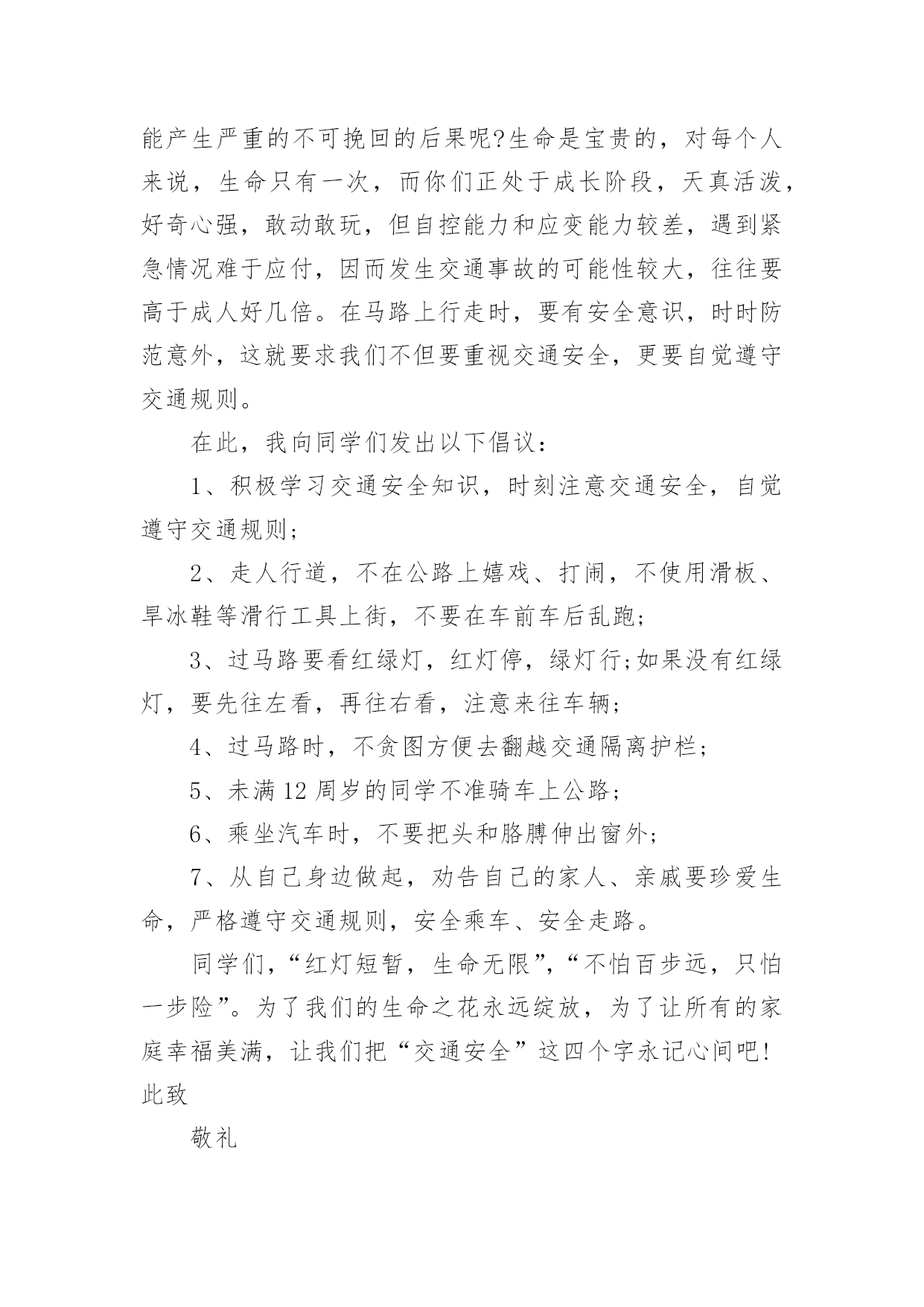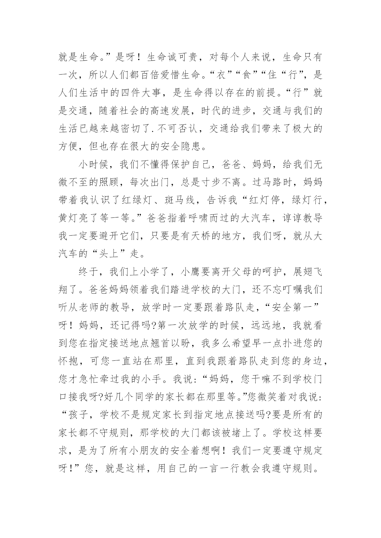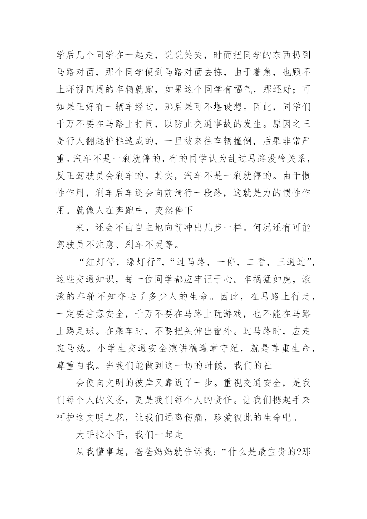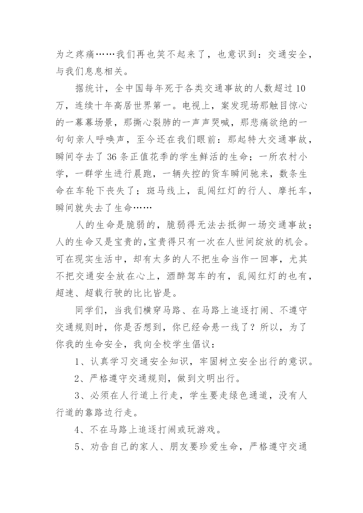 交通安全演讲稿交通安全演讲稿【热】演讲稿可以帮助发言者更好的表达。在现在社会,需要使用演讲稿的事情愈发增多,你写演讲稿时总是没有新意?以下是小编收集整理的交通安全演讲稿,欢迎阅读与收藏。交通安全演讲稿1亲爱的老师、同学们:大家好!最近,为了防止行人横穿马路,我市相关部门在好多马路上都安装了防护栏。尽管如此,一些行人为了自己方便,不顾安危翻越护栏,横穿马路。记得去年的一天,在河南理工大学门口附近,有一位60多岁的爷爷过马路时,看见马路上暂时没有过往的车辆,就翻越护栏。没想到在翻越过程中,没抓紧护栏,失手摔在了马路中央的护栏旁边。当时,我和妈妈正好路过,亲眼目睹了整个过程,那位爷爷在摔倒后就昏迷了。所以我想告诉大家,翻越护栏、横穿马路是非常危险的,即使没有车辆过往,我们也要遵守交通规则,因为意外可能随时都会发生。我想对那些不遵守交通规则的叔叔、阿姨、爷爷、奶奶们说:过马路时,一定要走斑马线或走天桥,千万不要翻越护栏,因为你们是我们小朋友的学习榜样。我的演讲结束,谢谢大家!交通安全演讲稿2老师们,同学们,早上好!今天我国旗下讲话的主题是:交通安全伴我行。今日是“全国交通安全日”,今年的主题是“遵守交通信号、安全文明出行”。20xx年11月14日,是个阳光明媚的日子。山西xx县第xx学的几百名师生在马路边晨跑,突然间,一辆大货车像一个发疯的恶魔碾向晨跑的队伍,随着一阵阵惊呼和惨叫,21个鲜花般的生命永远离开了这个美好的世界。许多家长听到噩耗传来,一路上呼唤着孩子的名字,奔向现场。可是,任凭家长们怎样撕心裂肺地呼喊,他们永远也不能回应。有一名学生因不遵守交通规则,闯红灯过马路,被汽车碾碎了双腿,成为了没有双腿的残疾人。这一桩桩血的教训,给多少家庭带来痛苦,把多少幸福的家庭拆散。学生是祖国的未来,家长的希望,大家能高高兴兴上学,平平安安回家,是所有人的期望。我国是一个人口大国,人多车多,使道路显得更加拥挤。据统计。我国每年因车祸死亡人数超过10万人,居世界之首。也就是说,平均每5分钟就有一人死于车祸,而不到半小时就有一个孩子葬身车轮,这是多么惊人的数字。然而这些事故的发生,绝大多数都是因为人们交通安全意识淡薄,不遵守交通法规造成的。同学们当你看到那一幕幕惨剧时,你会没有感触吗?当你听到这些触目惊心的数字时,你还会违反交通规则吗?我想一定不会!作为一名合格的学生,我们要积极行动起来,从我做起,从身边做起。因此,我建议同学们做到以下几点:1、要认真遵守《小学生日常行为规范》和交通法规。校外注意交通安全,走路走人行道,没有人行道的地方要靠路边行走。行走时集中注意力,不看书,不听音乐,不打闹,不三五成群地在公路上玩耍嬉戏和打闹。2、过马路要看红绿灯,走斑马线,不逆向行走。红灯停,绿灯行。如果没有红绿灯,要先往左看,再往右看,注意来往车辆,不要在车前车后猛跑过马路。3、坚决不坐三无车辆。乘坐汽车时,不要把头和胳膊伸出窗外。4、爱护公共交通设施。同学们,“红灯短暂,生命无限”,“不怕百步远,只怕一步险”。为了我们的生命之花永远绽放,为了让所有的家庭幸福美满,让我们把“交通安全”这四个字永记心间吧!交通安全演讲稿3尊敬的各位老师,亲爱的同学们:大家好!今天我演讲的题目是“遵守交通,珍惜生命”。人的生命只有一次,所以我们必须珍惜它,必须珍惜你所拥有的美好生命。我曾听说过这样一则交通事故:那是一个晴朗的日子,一个男孩车骑得飞快,还不断闯红灯,引来路人的议论:“这个男孩可能是有急事吧,要不他怎么会骑得那么快呢?这样会发生交通事故的。”果然,在一个拐弯的地方,一辆红色卡车跟这个“飞车男孩”撞上了,男孩顿时倒在了一片血泊之中。周围的人都围了过来。一刻钟后,一对中年夫妇挤进了围观的队伍中,看着这个男孩,哭倒在地。他们就是这个男孩的父母。不知他们为这个倒在血泊中的孩子操了多少心,可现在只能眼睁睁地看着自己的孩子离去,离开这个美好的世界。交通事故是那么可怕,它就像颗威力十足的定时炸弹,不知道什么时候,这颗埋伏在我们生活中的炸弹就会爆炸,炸得家庭破碎,炸得人心悲苦。一刹那间,使人失去生命,或者留下致命的伤害。现在路上的车辆越来越多,马路越来越拥挤,同时交通事故也越来越多,每年,有多少人的生命就这样失去,有多少个家庭就这样被破坏,有多少人要沉浸在这悲痛中!同学们,如果我们每个人心中都有交通规则,每个人都能自觉遵守交通规则,我相信一定可以避免更多悲剧的发生。让交通法规在我们心中生根吧,让我们牢牢记住:遵守交通规则就是珍爱生命!交通安全演讲稿4南平实验小学全体同学:还记得上个周五早上,学校照例为我们播放了“德育之窗”,以前总是很欢乐观看的我们,今天却一往常态地沉默着。电视屏幕上,那一个个瞬间发生的交通事故令我们的心为之震撼,看着一个个鲜活的生命在车祸中失去,我们的心为之疼