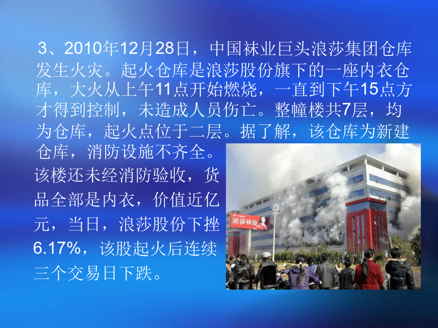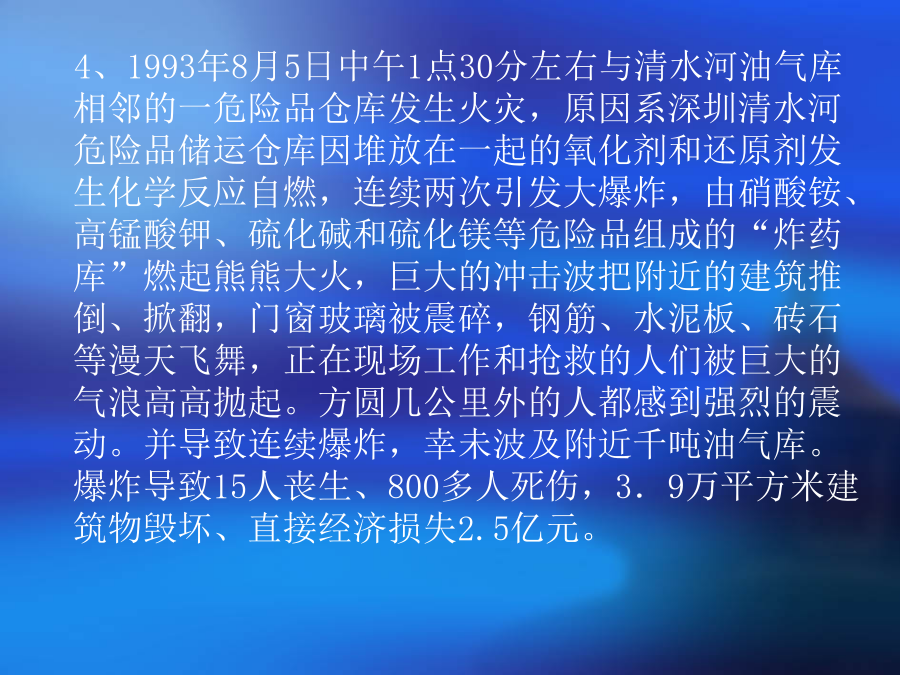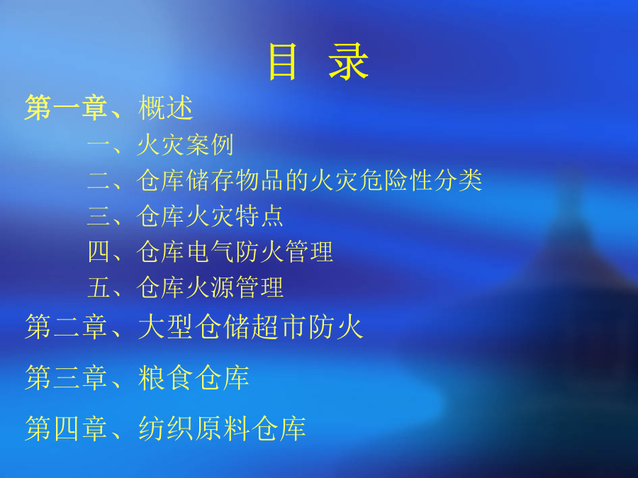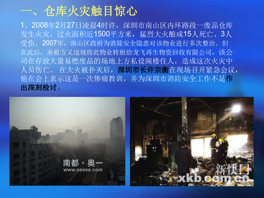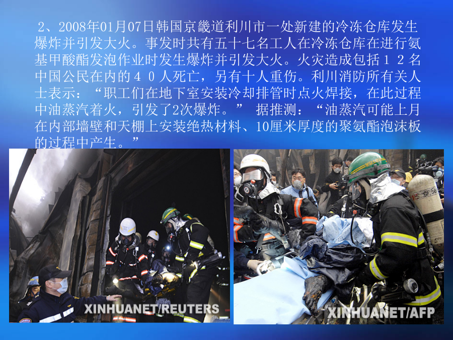 仓库消防安全管理教程***消防支队目录第一章、概述一、火灾案例二、仓库储存物品的火灾危险性分类三、仓库火灾特点四、仓库电气防火管理五、仓库火源管理第二章、大型仓储超市防火第三章、粮食仓库第四章、纺织原料仓库第五章、冷冻冷藏仓库第六章、高架仓库第七章、日用百货仓库第一章概述一、仓库火灾触目惊心1、2008年2月27日凌晨4时许,深圳市南山区内环路段一废品仓库发生火灾,过火面积近1500平方米,猛烈大火酿成15人死亡、3人受伤,2007年,南山区政府为消除安全隐患对该物业进行多次整治。但在此后,承租方又违规将此物业转租给龙飞再生物资回收有限公司,该公司在存放大量易燃废品的场地上方私设阁楼住人,造成这次火灾中人员伤亡。在大火被扑灭后,深圳市长许宗衡在现场召开紧急会议,他在会上表示这是一次惨痛教训,并为深圳市消防安全工作不足作出深刻检讨。2、2008年01月07日韩国京畿道利川市一处新建的冷冻仓库发生爆炸并引发大火。事发时共有五十七名工人在冷冻仓库在进行氨基甲酸酯发泡作业时发生爆炸并引发大火。火灾造成包括12名中国公民在内的40人死亡,另有十人重伤。利川消防所有关人士表示:“职工们在地下室安装冷却排管时点火焊接,在此过程中油蒸汽着火,引发了2次爆炸。”据推测:“油蒸汽可能上月在内部墙壁和天棚上安装绝热材料、10厘米厚度的聚氨酯泡沫板的过程中产生。”地下室顶棚被炸穿3、2010年12月28日,中国袜业巨头浪莎集团仓库发生火灾。起火仓库是浪莎股份旗下的一座内衣仓库,大火从上午11点开始燃烧,一直到下午15点方才得到控制,未造成人员伤亡。整幢楼共7层,均为仓库,起火点位于二层。据了解,该仓库为新建仓库,消防设施不齐全。该楼还未经消防验收,货品全部是内衣,价值近亿元,当日,浪莎股份下挫6.17%,该股起火后连续三个交易日下跌。4、1993年8月5日中午1点30分左右与清水河油气库相邻的一危险品仓库发生火灾,原因系深圳清水河危险品储运仓库因堆放在一起的氧化剂和还原剂发生化学反应自燃,连续两次引发大爆炸,由硝酸铵、高锰酸钾、硫化碱和硫化镁等危险品组成的“炸药库”燃起熊熊大火,巨大的冲击波把附近的建筑推倒、掀翻,门窗玻璃被震碎,钢筋、水泥板、砖石等漫天飞舞,正在现场工作和抢救的人们被巨大的气浪高高抛起。方圆几公里外的人都感到强烈的震动。并导致连续爆炸,幸未波及附近千吨油气库。爆炸导致15人丧生、800多人死伤,3.9万平方米建筑物毁坏、直接经济损失2.5亿元。5、1989年8月12日9时55分,中国石油天然气总公司黄岛油库其5号半地下储油罐被雷电击中,致使罐内储存的1.6万吨原油燃烧,火焰高达数十米,形成3400余平方米的大火。这场火灾造成97人伤亡,其中死亡19人(灭火人员),伤78人,共烧毁12消防车,原油4万多吨,毁坏民房4000多m²,毁坏路面2万㎡;直接经济损失3540万元。这场大火是由一种滚地雷引起的。(“滚地雷”是一种球状雷。球状雷和线状雷不同,它不是一闪即逝,而是能延续一段时间。它的直径一般在20厘米左右,能在地上滚动,穿过墙壁。如果这种“滚地雷”在油库内滚动,遇到油蒸气就会引起燃烧或者爆炸。另外,由于它在地面上滚动,所以,避雷针并不能完全阻止它的“行动”,这如同低空飞行的飞机能逃避雷达的搜索一样。)这次首先爆炸起火的5号罐是钢筋混凝土罐,罐体壁有许多钢筋,其中有不少组了闭合回路,但没有互相连结后接地。因此在发生雷击时,这些闭合回路中,产生了很强的感生电动势和感生电流。在钢筋连接点,由于接触电阻过大,产生了高温或电火花,将油蒸气引爆。二、仓库储存物品的火灾危险性分类依据《建筑设计防火规范》,我国将储存物品的火灾危险性分为甲、乙、丙、丁戊5类。甲类1.常温能全部或局部自行分解导致自燃或爆炸的物质。硝化棉、黄磷2.具有强烈氧化性,遇有机物或硫磺等无机物极易燃烧或爆炸的氧化剂。氯酸钾、过氧化钠;3.遇酸、受热、强烈冲击或摩擦时能燃烧或爆炸的物质。硝酸胺、过氧化钠;4.闪点﹤28℃的易燃物。苯、汽油、60度以上白酒;4.助燃气体。氧气、压缩空气;5.爆炸下限>10%的可燃气体。一氧化碳、氨气;6.常温下与空气接触能缓慢氧化积热不散而自燃的物质.油布、油纸;丙类1.闪点≧60℃的可燃液体。柴油、石蜡机油;2.固体可燃物。棉、毛、丝、麻;丁类难燃烧物品。水泥戊类非燃烧物品。铁三、仓库火灾特点1、易发生,损失大;1989年8月12日,黄岛油库火灾(直接经济损失3540万元)1993年8月5日,深圳安贸储运公司清水河仓库火灾(2.5亿)四、仓库火灾原因(2)仓库照明管理不善。主要有仓库照明灯具选用不当、堆垛超高未保持灯距、照明施工质量差导致灯