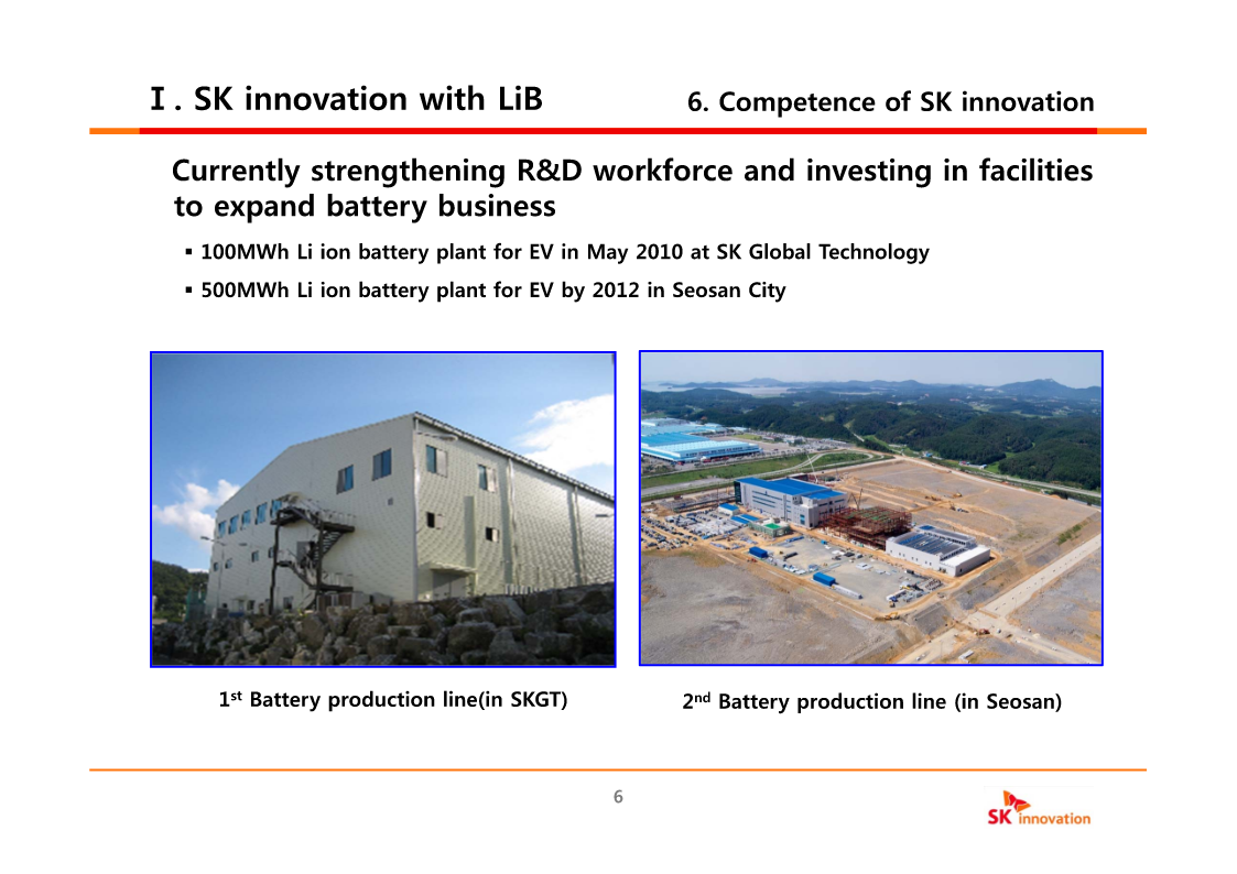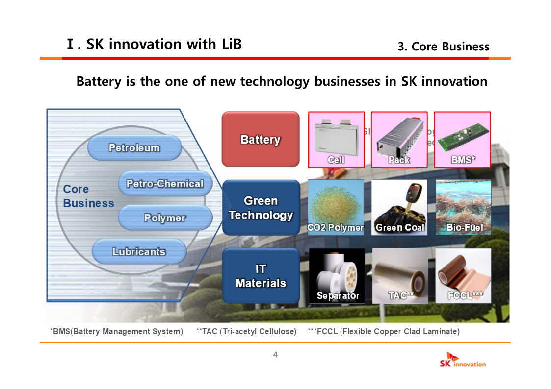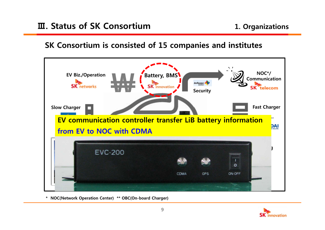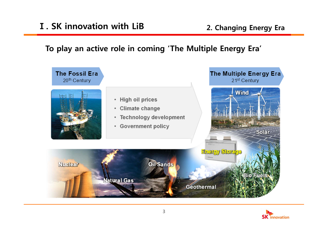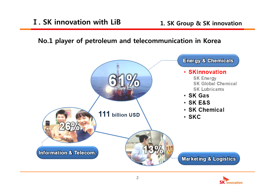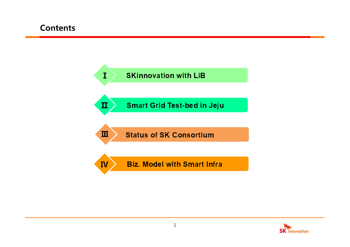 SmartTransportationinJejuNov.11.18SKinnovationContentsⅠSKinnovationwithLiBⅡSmartGridTest-bedinJejuⅢStatusofSKConsortiumⅣBiz.ModelwithSmartInfra1Ⅰ.SKinnovationwithLiB1.SKGroup&SKinnovationNo.1playerofpetroleumandtelecommunicationinKoreaEnergy&Chemicals•SKinnovationSKEnergy61%SKGlobalChemicalSKLubricants•SKGas•SKE&S•SKChemical111billionUSD•SKC26%Information&Telecom.13%Marketing&Logistics2Ⅰ.SKinnovationwithLiB2.ChangingEnergyEraToplayanactiveroleincoming‘TheMultipleEnergyEra’TheFossilEraTheMultipleEnergyEra20thCentury21stCenturyWind•Highoilprices•Climatechange•Technologydevelopment•GovernmentpolicySolarEnergyStorageNuclearOilSandsBioFuelsNaturalGasGeothermal3Ⅰ.SKinnovationwithLiB3.CoreBusinessBatteryistheoneofnewtechnologybusinessesinSKinnovationSKGlobalTechnologyCenterBatteryinDaejeon,KoreaPetroleumCellPackBMS*CorePetro-ChemicalBusinessGreenPolymerTechnologyCO2PolymerGreenCoalBio-FuelLubricantsITMaterialsSeparatorTAC**FCCL****BMS(BatteryManagementSystem)**TAC(Tri-acetylCellulose)***FCCL(FlexibleCopperCladLaminate)4Ⅰ.SKinnovationwithLiB4.ProductsLine-upEntireprocessfromkeycomponentstobatterypackMaterialBatteryEVSeparatorVehicleBMSPackCellModule5Ⅰ.SKinnovationwithLiB6.CompetenceofSKinnovationCurrentlystrengtheningR&Dworkforceandinvestinginfacilitiestoexpandbatterybusiness.100MWhLiionbatteryplantforEVinMay2010atSKGlobalTechnology.500MWhLiionbatteryplantforEVby2012inSeosanCity1stBatteryproductionline(inSKGT)2ndBatteryproductionline(inSeosan)6Ⅰ.SKinnovationwithLiB6.CompetenceofSKinnovationCurrentlystrengtheningR&Dworkforceandinvestinginfacilitiestoexpandbatterybusiness.100MWhLiionbatteryEndofplantConstructionforEVinMay2010:EarlyatSKGlobalof2012Technology.500MWhLiionbatteryplantforEVby2012inSeosanCity1stBatteryproductionline(inSKGT)2ndBatteryproductionline(inSeosan)(2011.8.29.SKISeosanBatteryPlant)7Ⅱ.SmartGridTest-bedinJejuSKinnovationisl