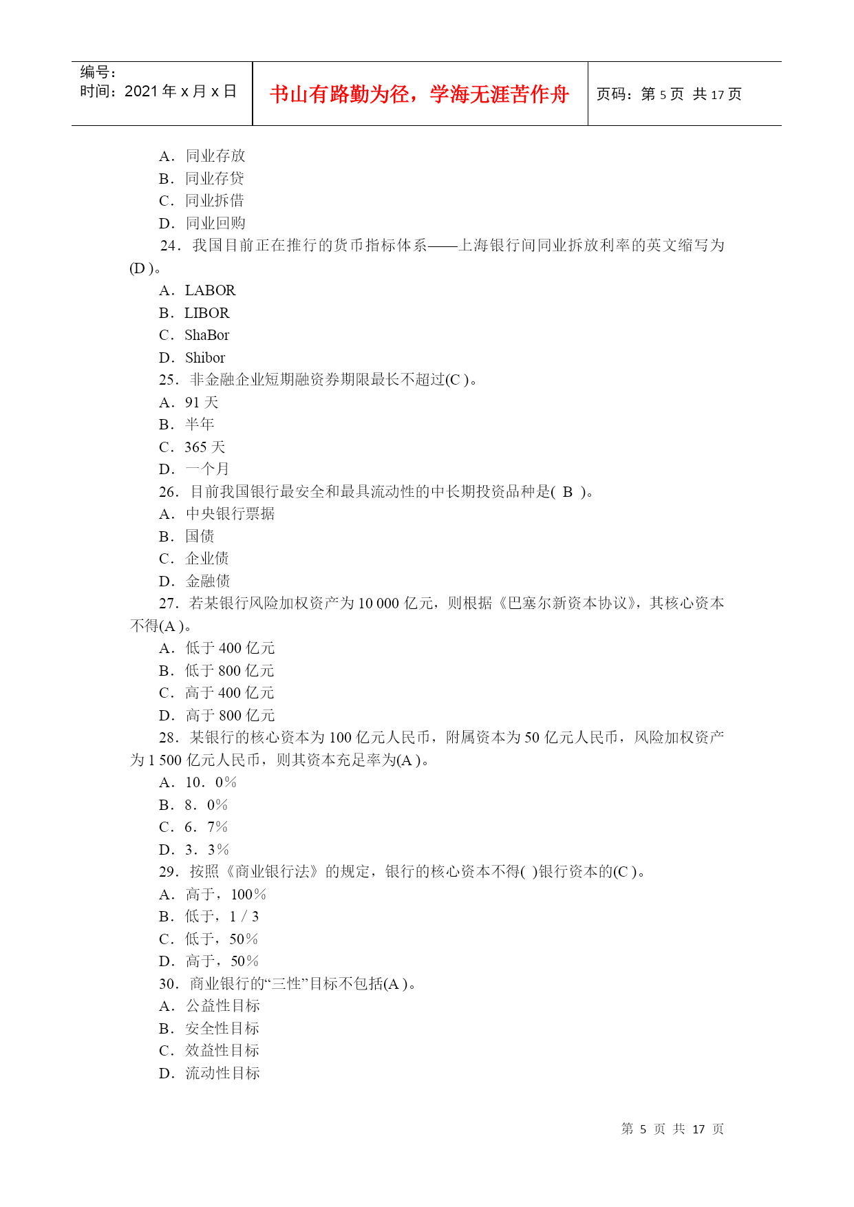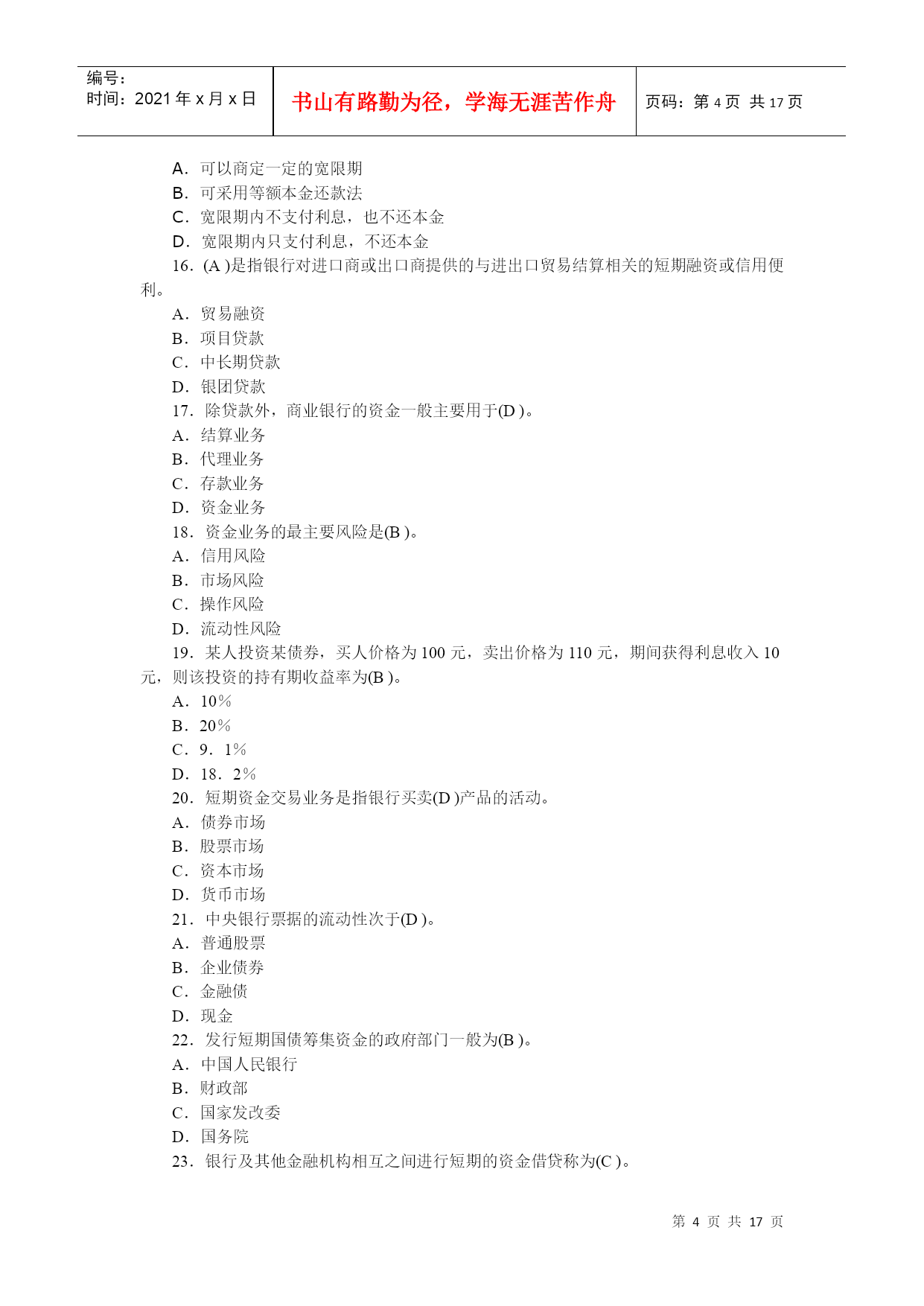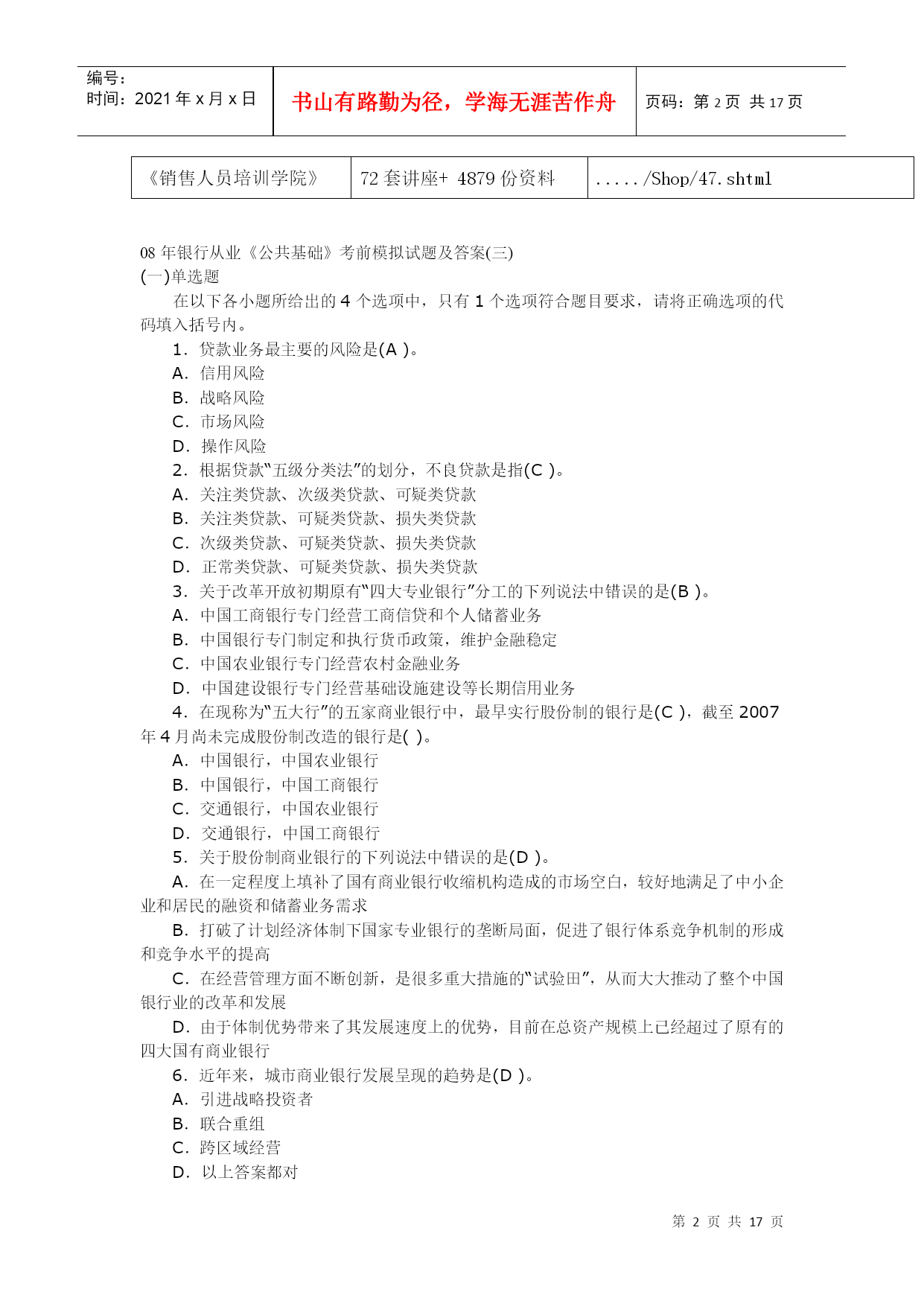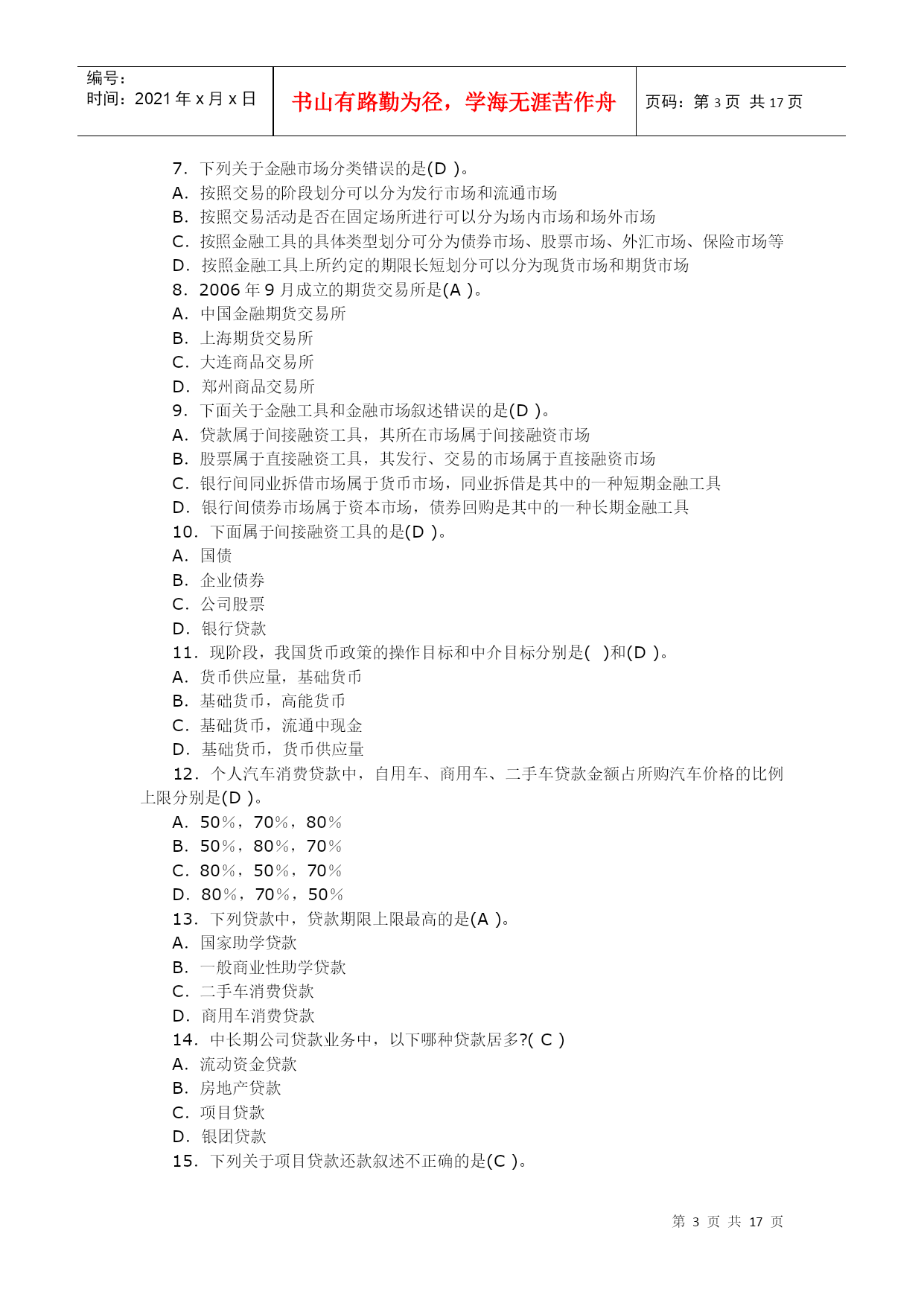 编号:时间:2021年x月x日书山有路勤为径,学海无涯苦作舟页码:第PAGE17页共NUMPAGES17页第PAGE\*MERGEFORMAT17页共NUMPAGES\*MERGEFORMAT17页HYPERLINK"...../"更多资料请访问.(.....)更多企业学院:...../Shop/《中小企业管理全能版》183套讲座+89700份资料...../Shop/40.shtml《总经理、高层管理》49套讲座+16388份资料...../Shop/38.shtml《中层管理学院》46套讲座+6020份资料...../Shop/39.shtml《国学智慧、易经》46套讲座...../Shop/41.shtml《人力资源学院》56套讲座+27123份资料...../Shop/44.shtml《各阶段员工培训学院》77套讲座+324份资料...../Shop/49.shtml《员工管理企业学院》67套讲座+8720份资料...../Shop/42.shtml《工厂生产管理学院》52套讲座+13920份资料...../Shop/43.shtml《财务管理学院》53套讲座+17945份资料...../Shop/45.shtml《销售经理学院》56套讲座+14350份资料...../Shop/46.shtml《销售人员培训学院》72套讲座+4879份资料...../Shop/47.shtml08年银行从业《公共基础》考前模拟试题及答案(三)(一)单选题在以下各小题所给出的4个选项中,只有1个选项符合题目要求,请将正确选项的代码填入括号内。1.贷款业务最主要的风险是(A)。A.信用风险B.战略风险C.市场风险D.操作风险2.根据贷款“五级分类法”的划分,不良贷款是指(C)。A.关注类贷款、次级类贷款、可疑类贷款B.关注类贷款、可疑类贷款、损失类贷款C.次级类贷款、可疑类贷款、损失类贷款D.正常类贷款、可疑类贷款、损失类贷款3.关于改革开放初期原有“四大专业银行”分工的下列说法中错误的是(B)。A.中国工商银行专门经营工商信贷和个人储蓄业务B.中国银行专门制定和执行货币政策,维护金融稳定C.中国农业银行专门经营农村金融业务D.中国建设银行专门经营基础设施建设等长期信用业务4.在现称为“五大行”的五家商业银行中,最早实行股份制的银行是(C),截至2007年4月尚未完成股份制改造的银行是()。A.中国银行,中国农业银行B.中国银行,中国工商银行C.交通银行,中国农业银行D.交通银行,中国工商银行5.关于股份制商业银行的下列说法中错误的是(D)。A.在一定程度上填补了国有商业银行收缩机构造成的市场空白,较好地满足了中小企业和居民的融资和储蓄业务需求B.打破了计划经济体制下国家专业银行的垄断局面,促进了银行体系竞争机制的形成和竞争水平的提高C.在经营管理方面不断创新,是很多重大措施的“试验田”,从而大大推动了整个中国银行业的改革和发展D.由于体制优势带来了其发展速度上的优势,目前在总资产规模上已经超过了原有的四大国有商业银行6.近年来,城市商业银行发展呈现的趋势是(D)。A.引进战略投资者B.联合重组C.跨区域经营D.以上答案都对7.下列关于金融市场分类错误的是(D)。A.按照交易的阶段划分可以分为发行市场和流通市场B.按照交易活动是否在固定场所进行可以分为场内市场和场外市场C.按照金融工具的具体类型划分可分为债券市场、股票市场、外汇市场、保险市场等D.按照金融工具上所约定的期限长短划分可以分为现货市场和期货市场8.2006年9月成立的期货交易所是(A)。A.中国金融期货交易所B.上海期货交易所C.大连商品交易所D.郑州商品交易所9.下面关于金融工具和金融市场叙述错误的是(D)。A.贷款属于间接融资工具,其所在市场属于间接融资市场B.股票属于直接融资工具,其发行、交易的市场属于直接融资市场C.银行间同业拆借市场属于货币市场,同业拆借是其中的一种短期金融工具D.银行间债券市场属于资本市场,债券回购是其中的一种长期金融工具10.下面属于间接融资工具的是(D)。A.国债B.企业债券C.公司股票D.银行贷款11.现阶段,我国货币政策的操作目标和中介目标分别是()和(D)。A.货币供应量,基础货币B.基础货币,高能货币C.基础货币,流通中现金D.基础货币,货币供应量12.个人汽车消费贷款中,自用车、商用车、二手车贷款金额占所购汽车价格的比例上限分别是(D)。A.50%,70%,80%B.50%,80%,70%C.80%,50%,70%D.80%,70%,50%13.下列贷款中,贷款期限上限最高的是(A)。A.国家助学贷款B.一般商业性助学贷款C.二手车消费贷款D.商用车消费贷款14