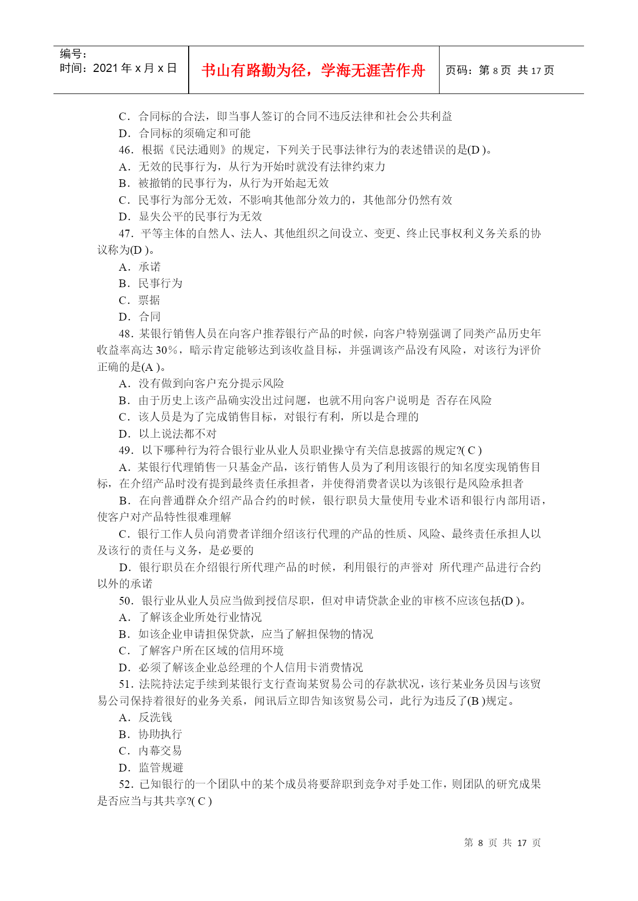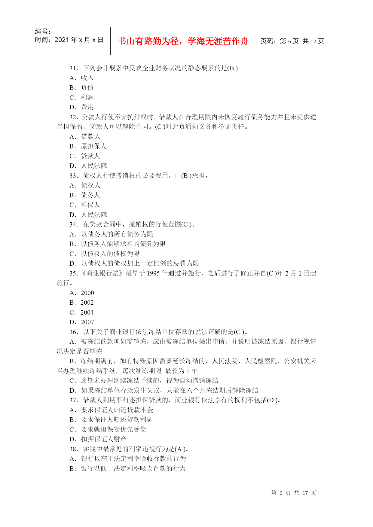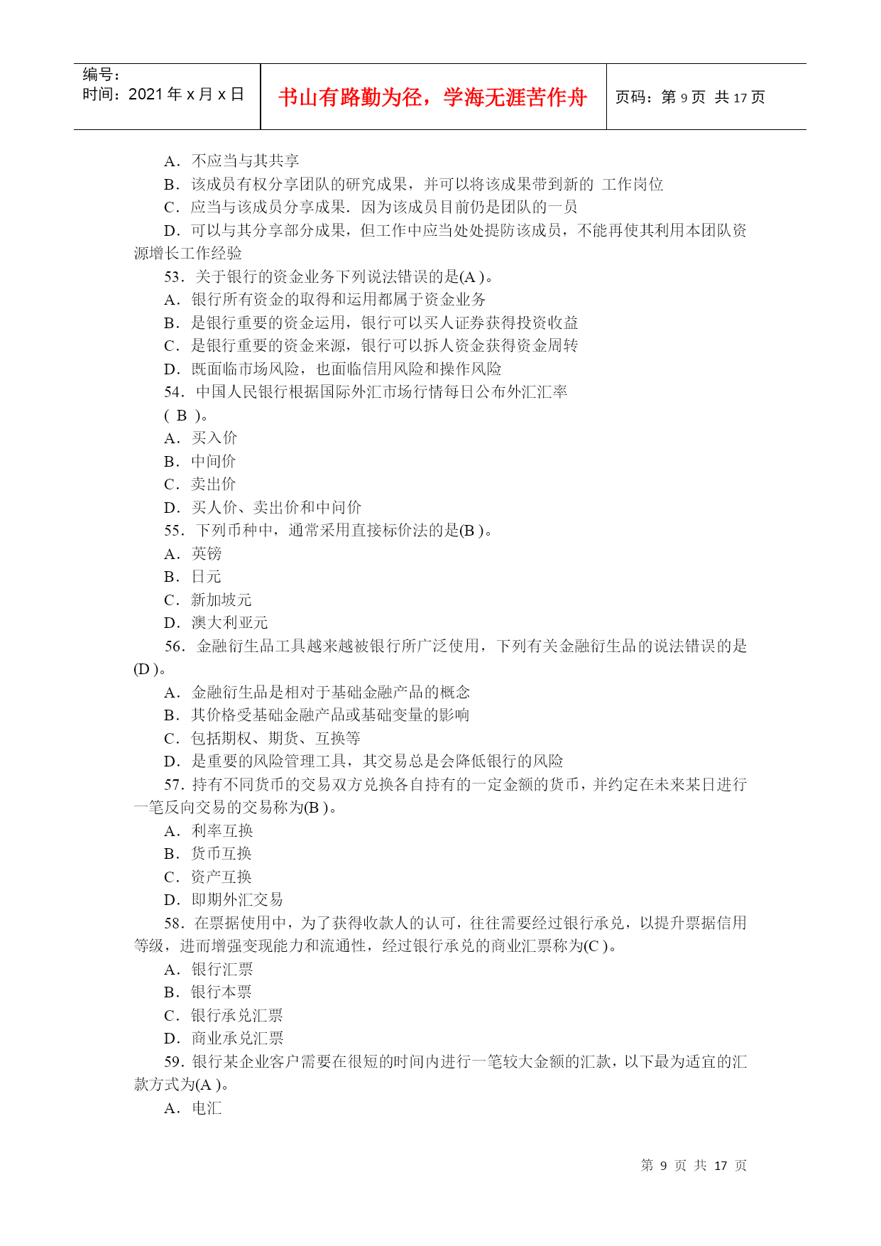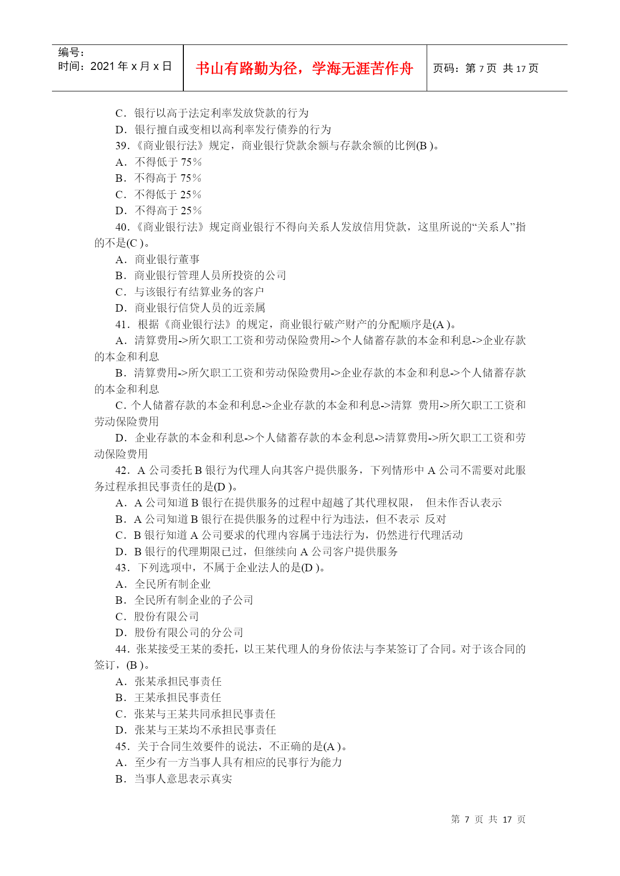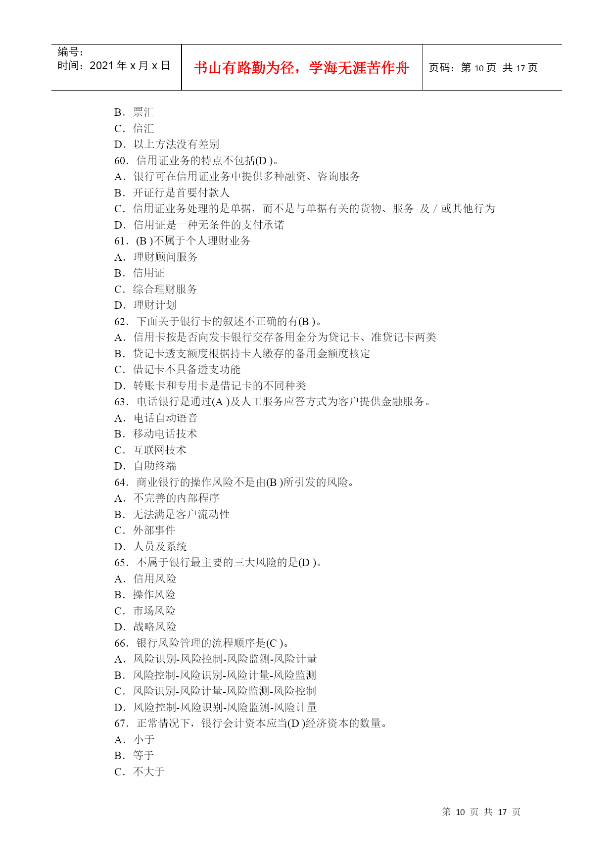 编号:时间:2021年x月x日书山有路勤为径,学海无涯苦作舟页码:第PAGE17页共NUMPAGES17页第PAGE\*MERGEFORMAT17页共NUMPAGES\*MERGEFORMAT17页HYPERLINK"...../"更多资料请访问.(.....)更多企业学院:...../Shop/《中小企业管理全能版》183套讲座+89700份资料...../Shop/40.shtml《总经理、高层管理》49套讲座+16388份资料...../Shop/38.shtml《中层管理学院》46套讲座+6020份资料...../Shop/39.shtml《国学智慧、易经》46套讲座...../Shop/41.shtml《人力资源学院》56套讲座+27123份资料...../Shop/44.shtml《各阶段员工培训学院》77套讲座+324份资料...../Shop/49.shtml《员工管理企业学院》67套讲座+8720份资料...../Shop/42.shtml《工厂生产管理学院》52套讲座+13920份资料...../Shop/43.shtml《财务管理学院》53套讲座+17945份资料...../Shop/45.shtml《销售经理学院》56套讲座+14350份资料...../Shop/46.shtml《销售人员培训学院》72套讲座+4879份资料...../Shop/47.shtml08年银行从业《公共基础》考前模拟试题及答案(三)(一)单选题在以下各小题所给出的4个选项中,只有1个选项符合题目要求,请将正确选项的代码填入括号内。1.贷款业务最主要的风险是(A)。A.信用风险B.战略风险C.市场风险D.操作风险2.根据贷款“五级分类法”的划分,不良贷款是指(C)。A.关注类贷款、次级类贷款、可疑类贷款B.关注类贷款、可疑类贷款、损失类贷款C.次级类贷款、可疑类贷款、损失类贷款D.正常类贷款、可疑类贷款、损失类贷款3.关于改革开放初期原有“四大专业银行”分工的下列说法中错误的是(B)。A.中国工商银行专门经营工商信贷和个人储蓄业务B.中国银行专门制定和执行货币政策,维护金融稳定C.中国农业银行专门经营农村金融业务D.中国建设银行专门经营基础设施建设等长期信用业务4.在现称为“五大行”的五家商业银行中,最早实行股份制的银行是(C),截至2007年4月尚未完成股份制改造的银行是()。A.中国银行,中国农业银行B.中国银行,中国工商银行C.交通银行,中国农业银行D.交通银行,中国工商银行5.关于股份制商业银行的下列说法中错误的是(D)。A.在一定程度上填补了国有商业银行收缩机构造成的市场空白,较好地满足了中小企业和居民的融资和储蓄业务需求B.打破了计划经济体制下国家专业银行的垄断局面,促进了银行体系竞争机制的形成和竞争水平的提高C.在经营管理方面不断创新,是很多重大措施的“试验田”,从而大大推动了整个中国银行业的改革和发展D.由于体制优势带来了其发展速度上的优势,目前在总资产规模上已经超过了原有的四大国有商业银行6.近年来,城市商业银行发展呈现的趋势是(D)。A.引进战略投资者B.联合重组C.跨区域经营D.以上答案都对7.下列关于金融市场分类错误的是(D)。A.按照交易的阶段划分可以分为发行市场和流通市场B.按照交易活动是否在固定场所进行可以分为场内市场和场外市场C.按照金融工具的具体类型划分可分为债券市场、股票市场、外汇市场、保险市场等D.按照金融工具上所约定的期限长短划分可以分为现货市场和期货市场8.2006年9月成立的期货交易所是(A)。A.中国金融期货交易所B.上海期货交易所C.大连商品交易所D.郑州商品交易所9.下面关于金融工具和金融市场叙述错误的是(D)。A.贷款属于间接融资工具,其所在市场属于间接融资市场B.股票属于直接融资工具,其发行、交易的市场属于直接融资市场C.银行间同业拆借市场属于货币市场,同业拆借是其中的一种短期金融工具D.银行间债券市场属于资本市场,债券回购是其中的一种长期金融工具10.下面属于间接融资工具的是(D)。A.国债B.企业债券C.公司股票D.银行贷款11.现阶段,我国货币政策的操作目标和中介目标分别是()和(D)。A.货币供应量,基础货币B.基础货币,高能货币C.基础货币,流通中现金D.基础货币,货币供应量12.个人汽车消费贷款中,自用车、商用车、二手车贷款金额占所购汽车价格的比例上限分别是(D)。A.50%,70%,80%B.50%,80%,70%C.80%,50%,70%D.80%,70%,50%13.下列贷款中,贷款期限上限最高的是(A)。A.国家助学贷款B.一般商业性助学贷款C.二手车消费贷款D.商用车消费贷款14