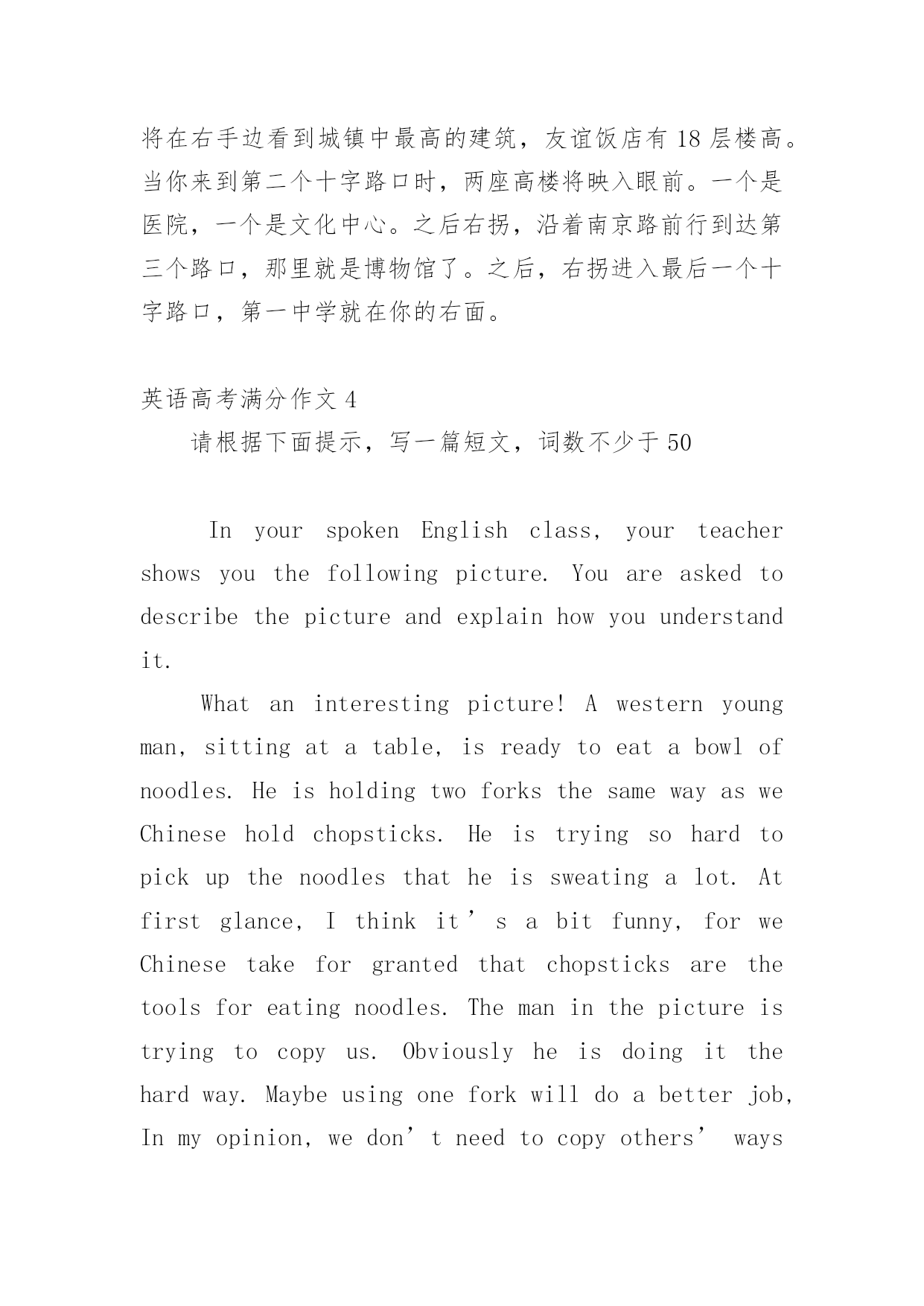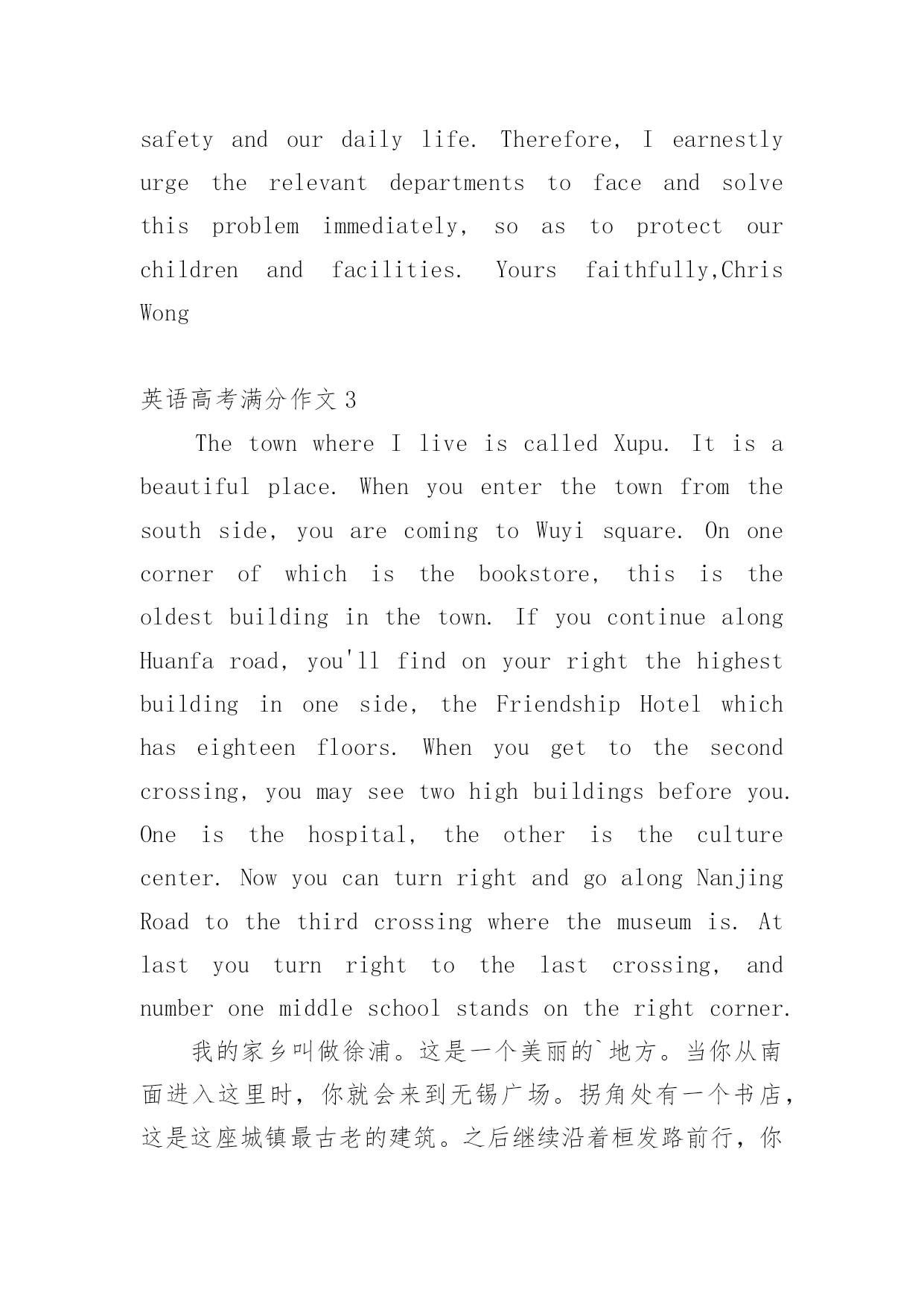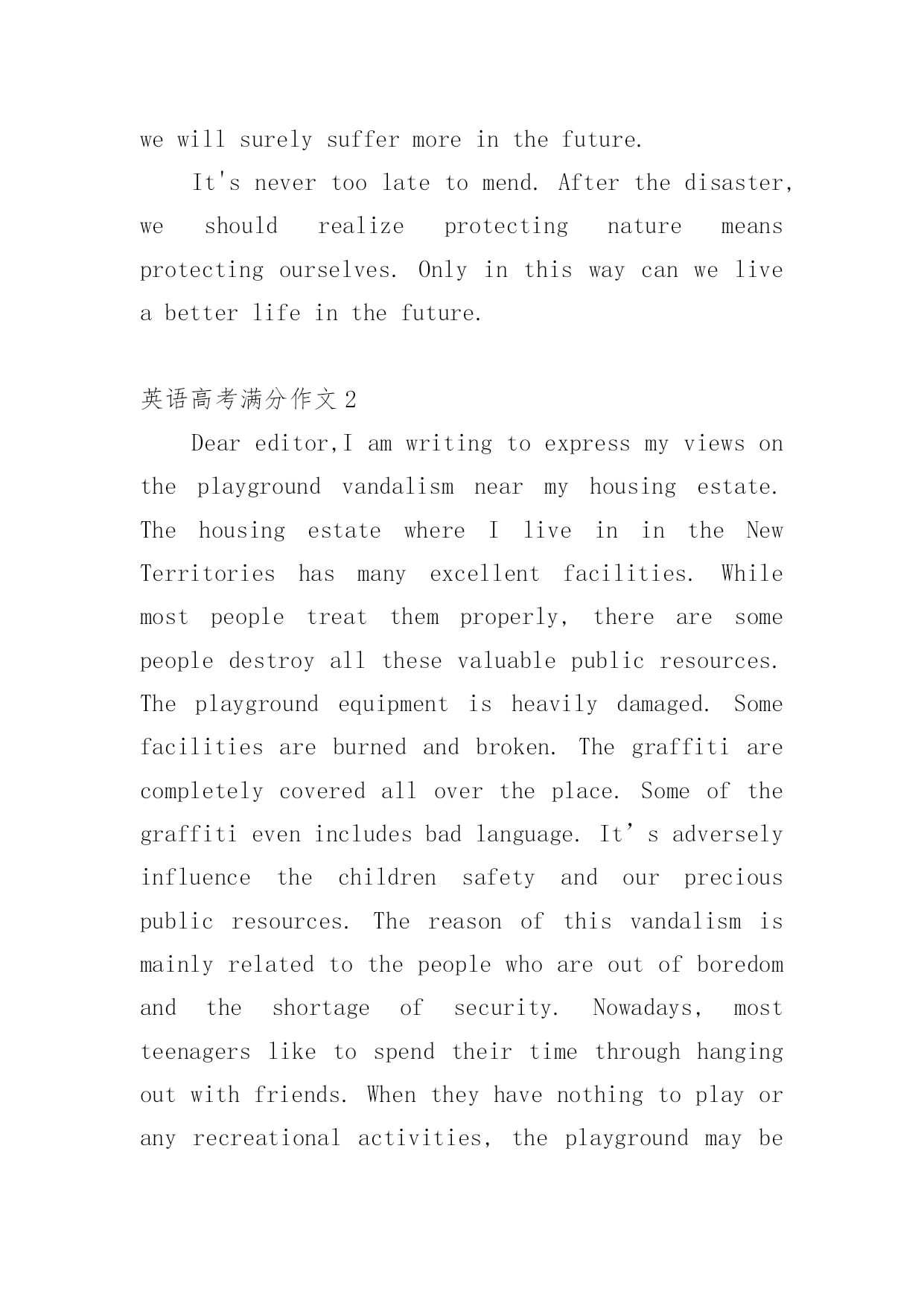 英语高考满分作文在学习、工作、生活中,大家都不可避免地要接触到作文吧,通过作文可以把我们那些零零散散的思想,聚集在一块。你知道作文怎样写才规范吗?以下是小编为大家整理的英语高考满分作文,希望能够帮助到大家。英语高考满分作文1Atpresent,everyoneisgreatlyconcernedaboutthesouthwestdrought.SomethinkwecanfightthedroughtbyprayingforrainbymeansoftheInternet——usingthemoderntooltodotheprimitivething,whichIthinkisinvain.Facedwiththeterribledrought,weshouldtakeeffectivemeasurestosettletheissue.Firstly,wemustprotecttrees.Treesplayanimportantpartinwaterandsoilconservation.Peoplearesufferingfromthedroughtbecauseplentyoftreeshavebeencutdownwithoutlimits.Ifwecontinuetodoso,wewillbepunishedbynature.Secondly,weshouldtrytosavewater.Waterisanecessityinourdailylife.Besides,waterresourcesarelimited,soweshouldn'twasteit.Ifwedon’tkickthebadhabitofwastingwater,wewillsurelysuffermoreinthefuture.It'snevertoolatetomend.Afterthedisaster,weshouldrealizeprotectingnaturemeansprotectingourselves.Onlyinthiswaycanweliveabetterlifeinthefuture.英语高考满分作文2Deareditor,Iamwritingtoexpressmyviewsontheplaygroundvandalismnearmyhousingestate.ThehousingestatewhereIliveinintheNewTerritorieshasmanyexcellentfacilities.Whilemostpeopletreatthemproperly,therearesomepeopledestroyallthesevaluablepublicresources.Theplaygroundequipmentisheavilydamaged.Somefacilitiesareburnedandbroken.Thegraffitiarecompletelycoveredallovertheplace.Someofthegraffitievenincludesbadlanguage.It’sadverselyinfluencethechildrensafetyandourpreciouspublicresources.Thereasonofthisvandalismismainlyrelatedtothepeoplewhoareoutofboredomandtheshortageofsecurity.Nowadays,mostteenagersliketospendtheirtimethroughhangingoutwithfriends.Whentheyhavenothingtoplayoranyrecreationalactivities,theplaygroundmaybetargetedasanamusementforspendingtheirtime.Duetoteenagersarenowintheprocessofbuildingself-worthandself-esteem,theywilltrytodosomethingoverinordertogetthepeerrecognition.Forinstant,theteenagerspretendtobealeaderthroughdestroyingthefacilities.Intheserecentyears,theseselfishandirresponsiblebehaviorsunderthefabricating,exaggeratingfromsocialmedia,startedbecomingrationalized