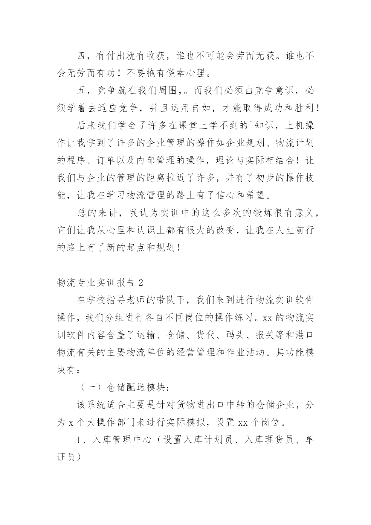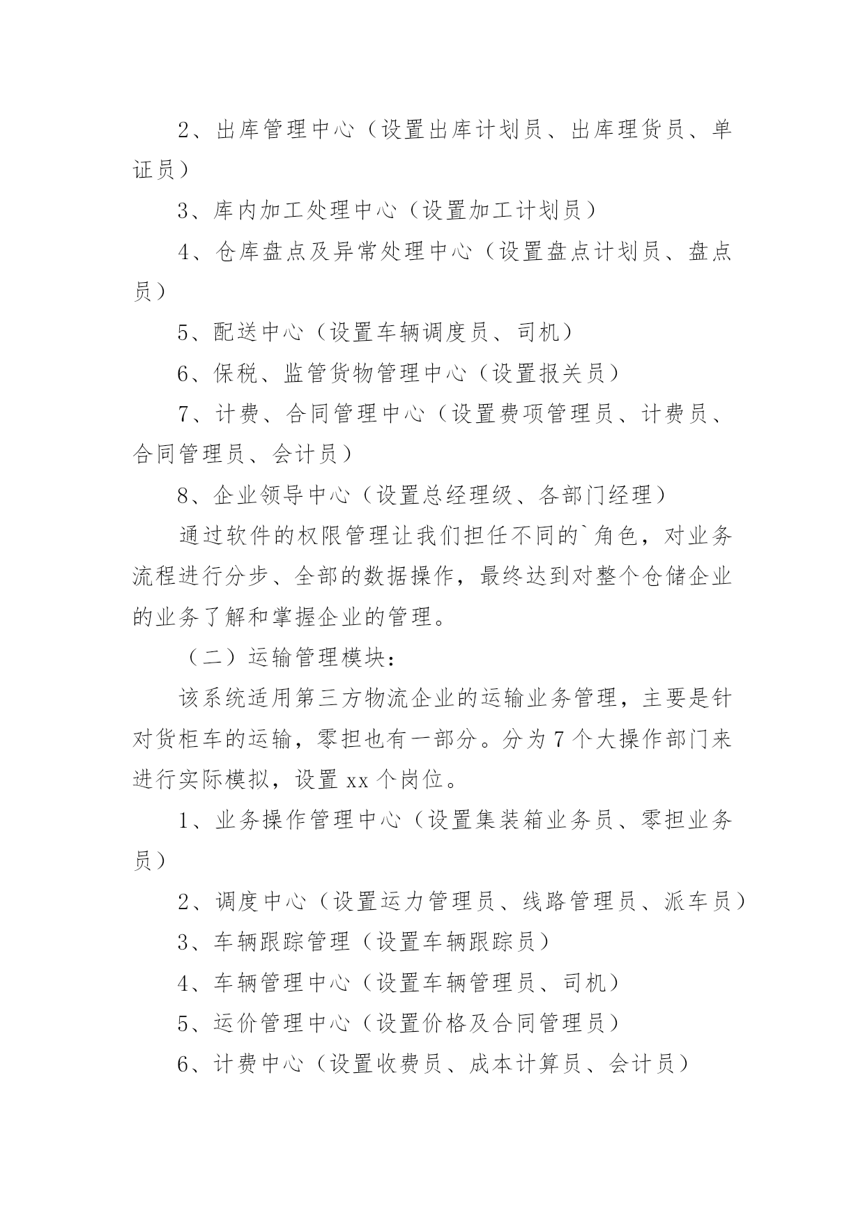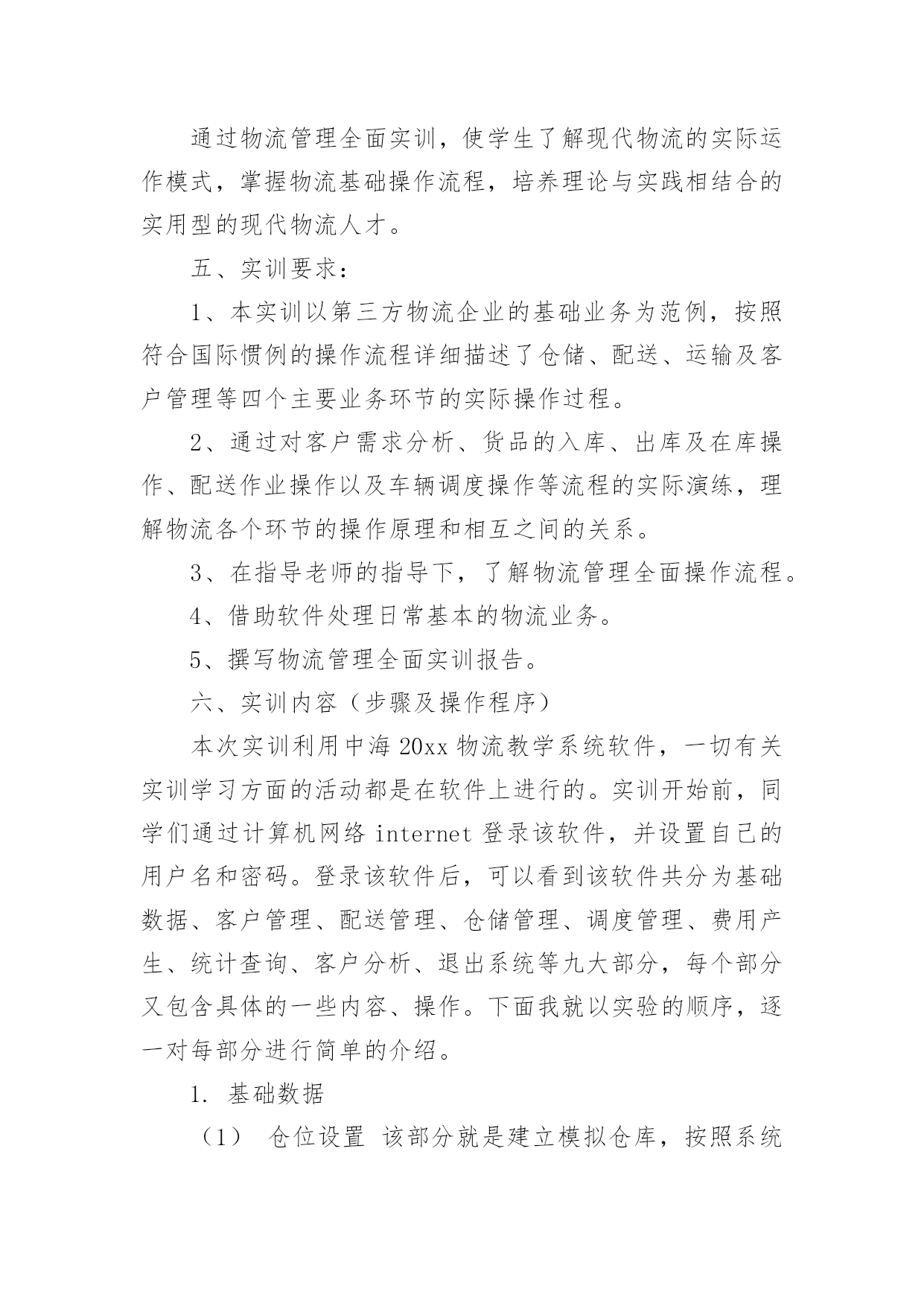 物流专业实训报告在经济飞速发展的今天,报告不再是罕见的东西,报告包含标题、正文、结尾等。那么一般报告是怎么写的呢?下面是小编帮大家整理的物流专业实训报告,仅供参考,欢迎大家阅读。物流专业实训报告115天转眼既逝,回顾实训生活,收获是很丰富的。记得,刚开始何总就给我们说带着我们看戏,顿时我感到了轻松愉快,接着就像何总说的一样,我们在这15天了,确实玩的轻松,而且学到了很多东西,而给我印象最深刻就是12月25号圣诞节,但我们并没有像往年那样计划着如何过圣诞,而是做了一次有意义的调研。调查的对象是物流公司,调查内容是:所调查的公司规模和注册资金,以及公司的吞吐量,公司的自运量和托运量,以及对物流人才的需求量和学历。早上,按着昨天的计划,并没有想到会遇到的困难,乘公交六合线,早早的就到达了开发区。下了车,就没有了刚开始的欣喜,因为风很大,扬起的灰尘很多。但我们并没有完全退缩。厂房很多,我们三个队,各有5成员,并不急于进入课题,我们想着后面肯定有更多的厂房等着我们,后来三个队就各自沿着自定的路线朝前走。我们也一直朝前走,不知道在转了几个弯后,看到很少有厂房,就着手做,我们先进去了中国石化集团,在刚开始你推我,我推你,就是不愿开始与保安人员的交谈,最后这个人物只能落到经理的肩上,也许是身单力薄,也许是他们真的很忙,最终我们失败了。后来,我们就这样商量着,进入了另一条街道,看到了南京科盛环保有限公司。首先让保安人员认为自己处在安全的位置上。我们两个人试着和保安人员交涉,那个保安大叔人很好,在这么冷的天,他经不起我们的再三恳求,终于答应我们进去,并打电话给部门经理,把我们的问题给与解决,得到这些数据,我们就高兴得出来了,继续调查,有了第一次的经验,第二次就熟练的多,我们又得到了相应的数据,接着本来打算再去一家厂子去看看,没想到他们的狗就在门口,下得我们不敢进去。就这样,我们又回到了出发点,看到另一队已经回来,我们就慨叹着调查的难度结队而归。下午,我们就上午的调查情况开会交流总结经验,不知别人是如何的感受,但我确实从中学到了东西:一从团队上说,有人说团结就是力量,我认为不假,如果你的对团结不好,任务就完成不了,就像行驶在海上的船没有了前进的动力。二,从与保安人员的交涉中,我学到了人与人之间交流的秘诀,基于别人的信任才能谈话成功,并能得到你想要的数据!三,你必须敢于尝试,尝试,你就有可能成功的机会,不尝试,你永远没有机会成功!不要在困难面前畏首畏尾!四,有付出就有收获,谁也不可能会劳而无获。谁也不会无劳而有功!不要抱有侥幸心理。五,竞争就在我们周围,。而我们必须由竞争意识,必须学着去适应竞争,并且运用自如,才能取得成功和胜利!后来我们学会了许多在课堂上学不到的`知识,上机操作让我学到了许多的企业管理的操作如企业规划、物流计划的程序、订单以及内部管理的操作,理论与实际相结合!让我们与企业的管理的距离拉近了许多,并有了初步的操作技能,让我在学习物流管理的路上有了信心和希望。总的来讲,我认为实训中的这么多次的锻炼很有意义,它们让我从心里和认识上都有很大的改变,让我在人生前行的路上有了新的起点和规划!物流专业实训报告2在学校指导老师的带队下,我们来到进行物流实训软件操作,我们分组进行各自不同岗位的操作练习。xx的物流实训软件内容含盖了运输、仓储、货代、码头、报关等和港口物流有关的主要物流单位的经营管理和作业活动。其功能模块有:(一)仓储配送模块:该系统适合主要是针对货物进出口中转的仓储企业,分为x个大操作部门来进行实际模拟,设置xx个岗位。1、入库管理中心(设置入库计划员、入库理货员、单证员)2、出库管理中心(设置出库计划员、出库理货员、单证员)3、库内加工处理中心(设置加工计划员)4、仓库盘点及异常处理中心(设置盘点计划员、盘点员)5、配送中心(设置车辆调度员、司机)6、保税、监管货物管理中心(设置报关员)7、计费、合同管理中心(设置费项管理员、计费员、合同管理员、会计员)8、企业领导中心(设置总经理级、各部门经理)通过软件的权限管理让我们担任不同的`角色,对业务流程进行分步、全部的数据操作,最终达到对整个仓储企业的业务了解和掌握企业的管理。(二)运输管理模块:该系统适用第三方物流企业的运输业务管理,主要是针对货柜车的运输,零担也有一部分。分为7个大操作部门来进行实际模拟,设置xx个岗位。1、业务操作管理中心(设置集装箱业务员、零担业务员)2、调度中心(设置运力管理员、线路管理员、派车员)3、车辆跟踪管理(设置车辆跟踪员)4、车辆管理中心(设置车辆管理员、司机)5、运价管理中心(设置价格及合同管理员)6、计费中心(设置收费员、成本计算员、会计员)7、企业领导中心(设置总经理级、各部门经理)通过软件的权限管理担任不同的角色,对业务流程进行分步、全部的