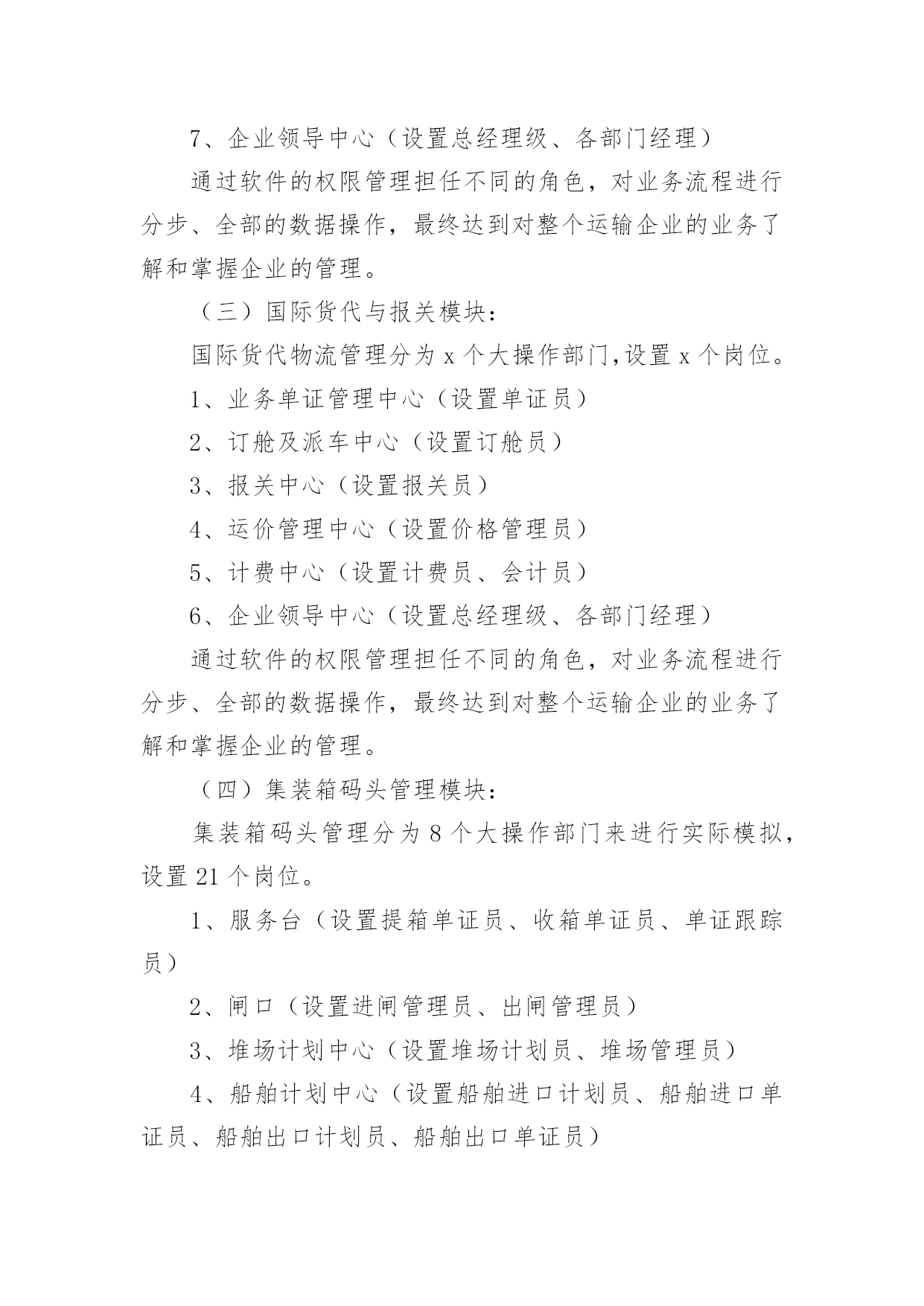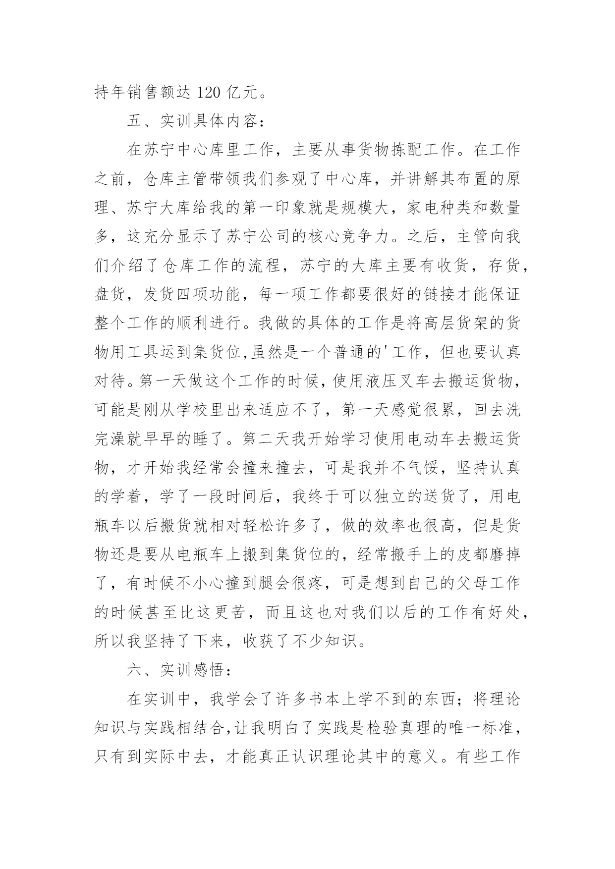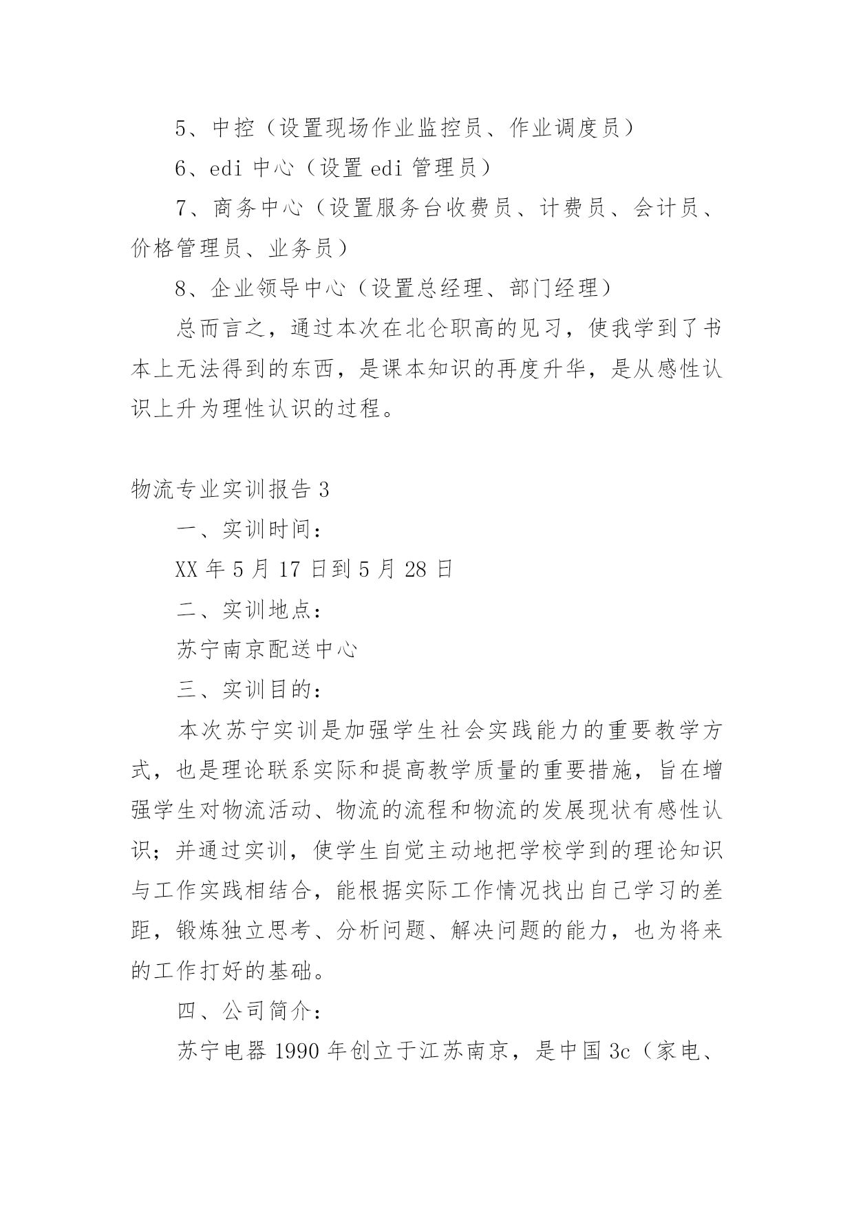 物流专业实训报告在经济飞速发展的今天,报告不再是罕见的东西,报告包含标题、正文、结尾等。那么一般报告是怎么写的呢?下面是小编帮大家整理的物流专业实训报告,仅供参考,欢迎大家阅读。物流专业实训报告115天转眼既逝,回顾实训生活,收获是很丰富的。记得,刚开始何总就给我们说带着我们看戏,顿时我感到了轻松愉快,接着就像何总说的一样,我们在这15天了,确实玩的轻松,而且学到了很多东西,而给我印象最深刻就是12月25号圣诞节,但我们并没有像往年那样计划着如何过圣诞,而是做了一次有意义的调研。调查的对象是物流公司,调查内容是:所调查的公司规模和注册资金,以及公司的吞吐量,公司的自运量和托运量,以及对物流人才的需求量和学历。早上,按着昨天的计划,并没有想到会遇到的困难,乘公交六合线,早早的就到达了开发区。下了车,就没有了刚开始的欣喜,因为风很大,扬起的灰尘很多。但我们并没有完全退缩。厂房很多,我们三个队,各有5成员,并不急于进入课题,我们想着后面肯定有更多的厂房等着我们,后来三个队就各自沿着自定的路线朝前走。我们也一直朝前走,不知道在转了几个弯后,看到很少有厂房,就着手做,我们先进去了中国石化集团,在刚开始你推我,我推你,就是不愿开始与保安人员的交谈,最后这个人物只能落到经理的肩上,也许是身单力薄,也许是他们真的很忙,最终我们失败了。后来,我们就这样商量着,进入了另一条街道,看到了南京科盛环保有限公司。首先让保安人员认为自己处在安全的位置上。我们两个人试着和保安人员交涉,那个保安大叔人很好,在这么冷的天,他经不起我们的再三恳求,终于答应我们进去,并打电话给部门经理,把我们的问题给与解决,得到这些数据,我们就高兴得出来了,继续调查,有了第一次的经验,第二次就熟练的多,我们又得到了相应的数据,接着本来打算再去一家厂子去看看,没想到他们的狗就在门口,下得我们不敢进去。就这样,我们又回到了出发点,看到另一队已经回来,我们就慨叹着调查的难度结队而归。下午,我们就上午的调查情况开会交流总结经验,不知别人是如何的感受,但我确实从中学到了东西:一从团队上说,有人说团结就是力量,我认为不假,如果你的对团结不好,任务就完成不了,就像行驶在海上的船没有了前进的动力。二,从与保安人员的交涉中,我学到了人与人之间交流的秘诀,基于别人的信任才能谈话成功,并能得到你想要的数据!三,你必须敢于尝试,尝试,你就有可能成功的机会,不尝试,你永远没有机会成功!不要在困难面前畏首畏尾!四,有付出就有收获,谁也不可能会劳而无获。谁也不会无劳而有功!不要抱有侥幸心理。五,竞争就在我们周围,。而我们必须由竞争意识,必须学着去适应竞争,并且运用自如,才能取得成功和胜利!后来我们学会了许多在课堂上学不到的`知识,上机操作让我学到了许多的企业管理的操作如企业规划、物流计划的程序、订单以及内部管理的操作,理论与实际相结合!让我们与企业的管理的距离拉近了许多,并有了初步的操作技能,让我在学习物流管理的路上有了信心和希望。总的来讲,我认为实训中的这么多次的锻炼很有意义,它们让我从心里和认识上都有很大的改变,让我在人生前行的路上有了新的起点和规划!物流专业实训报告2在学校指导老师的带队下,我们来到进行物流实训软件操作,我们分组进行各自不同岗位的操作练习。xx的物流实训软件内容含盖了运输、仓储、货代、码头、报关等和港口物流有关的主要物流单位的经营管理和作业活动。其功能模块有:(一)仓储配送模块:该系统适合主要是针对货物进出口中转的仓储企业,分为x个大操作部门来进行实际模拟,设置xx个岗位。1、入库管理中心(设置入库计划员、入库理货员、单证员)2、出库管理中心(设置出库计划员、出库理货员、单证员)3、库内加工处理中心(设置加工计划员)4、仓库盘点及异常处理中心(设置盘点计划员、盘点员)5、配送中心(设置车辆调度员、司机)6、保税、监管货物管理中心(设置报关员)7、计费、合同管理中心(设置费项管理员、计费员、合同管理员、会计员)8、企业领导中心(设置总经理级、各部门经理)通过软件的权限管理让我们担任不同的`角色,对业务流程进行分步、全部的数据操作,最终达到对整个仓储企业的业务了解和掌握企业的管理。(二)运输管理模块:该系统适用第三方物流企业的运输业务管理,主要是针对货柜车的运输,零担也有一部分。分为7个大操作部门来进行实际模拟,设置xx个岗位。1、业务操作管理中心(设置集装箱业务员、零担业务员)2、调度中心(设置运力管理员、线路管理员、派车员)3、车辆跟踪管理(设置车辆跟踪员)4、车辆管理中心(设置车辆管理员、司机)5、运价管理中心(设置价格及合同管理员)6、计费中心(设置收费员、成本计算员、会计员)7、企业领导中心(设置总经理级、各部门经理)通过软件的权限管理担任不同的角色,对业务流程进行分步、全部的