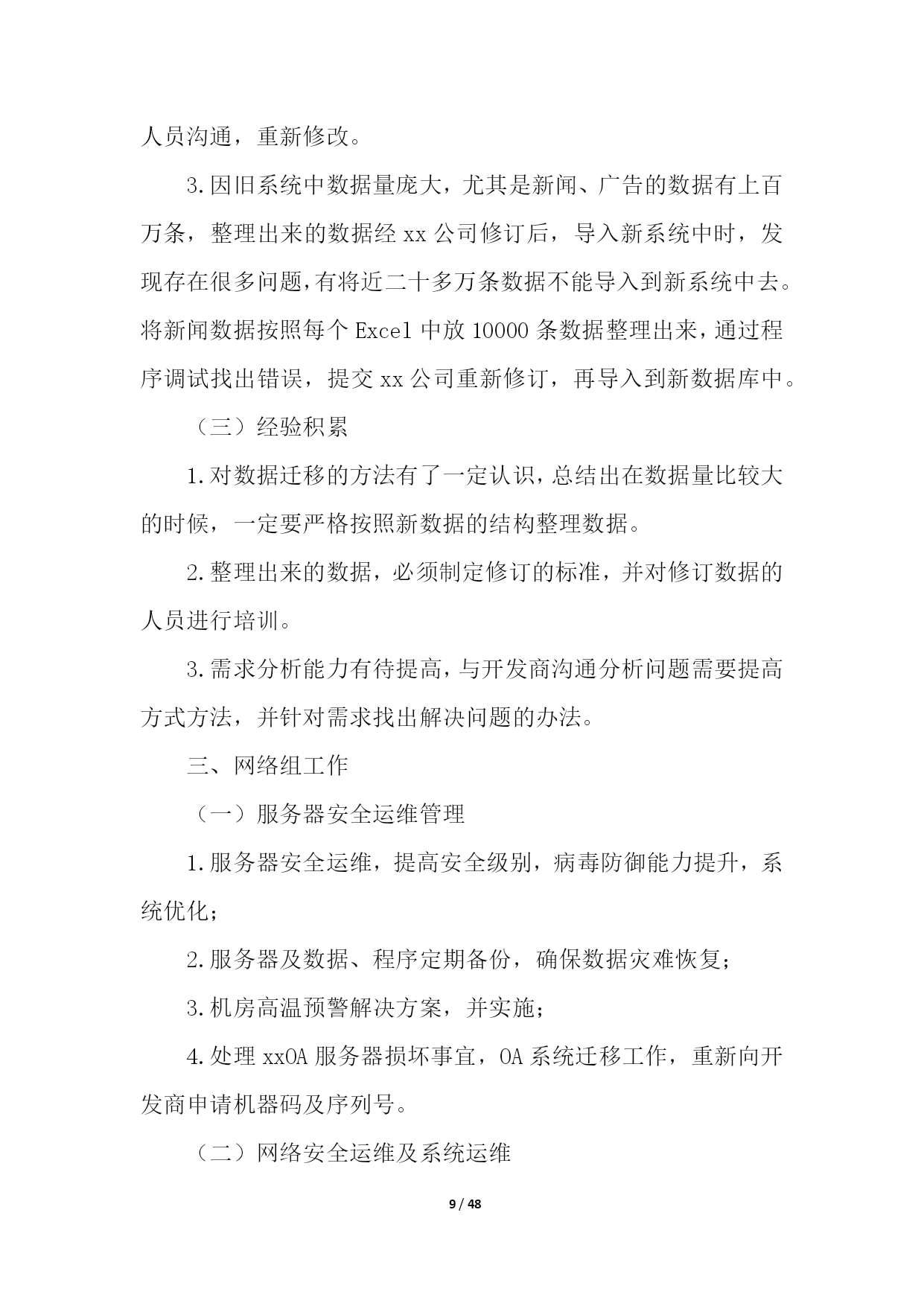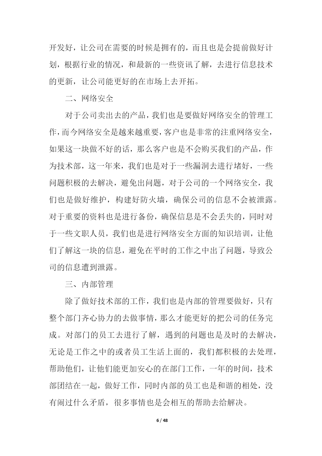 PAGE48/NUMPAGES48技术部年终工作总结(精选15篇)技术部年终工作总结篇1在这一年的时间里,自己在车间领导的带领下,和同事团结合作下,学到了很多的知识,工作上取得圆满成功。为了更好地完成工作,总结经验,扬长避短,提高自己的业务技能,现将工作情况总结如下:一,工作方面在这一年里,我还从事压片工序的工作。我们三个品种,四个规格交替生产。顺利完成了公司和车间交给的生产任务,一次性合格率100%,保证了市场的需求。现场管理,工艺,卫生,安全,质量,纪律等在车间和公司检查中保持零纪录。这一年里我换了不少的搭档,每来一位新人,我都认真教给他机器的安全操作,和现场工艺操作,以便他们很快适应压片工作。在暑假中我和车间机修人员检查压片机的性能,排除故障,进行全面地维护保养,保证了以后的顺利生产。在实际工作中,也存在一些不足的地方。主要是近期压片中发现片面有裂片和裂纹的现象,影响了片子的美观,也存在一定的质量隐患。我和同事们认真排查找原因,原料是主要的原因。在不能更改原料的情况下,我们调整机器参数,换机器换模具,片面稍微有点改善,但还不能根本解决。其次班组建设,现场管理搞得不是很好,没有抓到细处。二,思想方面从主观意识到该为谁工作,怎样工作。摆正态度,“态度决定一切”。有了正确的态度,才能运用正确的方法,找到正确的方向,进而取得正确的结果。我一直认为工作不该是一个任务或者负担,应该是一种乐趣,是一种享受,而只有你对它产生兴趣,彻底的爱上它,你才能充分的体会到其中的快乐。可以说,懂得享受工作,你才懂得如何成功,期间来不得半点勉强。能力问题,又可以分成专业能力和基本能力。具体到人,专业能力决定了你适合于某种工作,基本能力,包括自信力,协作能力,承担责任的能力,冒险精神,以及发展潜力等,将直接决定工作的生命力。一个在事业上成功的人,必是两种能力能够很好地协调发展和运作的人。三,工作目标在今后的工作中,我会加倍的努力学习专业知识,掌握更多的业务技能,为将来的工作打好坚实的基础。在作风上,能遵章守纪、团结同事、务真求实、乐观上进,始终保持严谨认真的工作态度和一丝不苟的工作作风,勤勤恳恳,任劳任怨。始终做到老老实实做人,勤勤恳恳做事,勤劳简朴的生活,时刻牢记自己的责任和义务,严格要求自己,在任何时候都要努力完成领导交给的任务。搞好班组建设,把每一项工作抓得细处,做到细化管理。今后我将以崭新的精神状态投入到工作当中,努力学习,提高工作效率,熟练业务能力。积极响应公司加强管理的措施,遵守公司的规章制度,做好本职工作。技术部年终工作总结篇220xx年,是成熟的一年,工作经验、处事能力、社会交流等等一切都是从无到有,从有到会,从会到稳,这一过程都离不开公司领导的带领和个人的努力。20xx年,也是感恩的一年,真心感谢临港污水处理有限公司给大家提供磨练自己的机会,更感谢公司领导一直以来的信任与栽培,同时也感谢公司全体同事们的支持与帮助。生产技术部的主要工作内容和职责有企业入网的层层跟进,为公司各方的安全提供保障,市政主管的巡查和维护。要把工作完成感觉是很容易的,可实际把工作做得出色、有创造性却是很不容易的。所以,我们要明白,在各个岗位都有发展才能、增长知识的机会。如果我们能以充分的热情去做最平凡的工作,也能成为最精巧的员工;如果以冷淡的态度去做最高尚的工作,也不过是个平庸的工匠。倘若能处处以主动、努力的精神来工作,那么无论在怎样的岗位上都能丰富他人生的经历。拥有积极的心态,就会拥有一生的成功。回顾即将过去的20xx年度,对公司来说是攻坚破冰的一年,生产技术部在黄总的领导下,克服困难、不断完善部门的管理,在过去的一年当中,企业入网、安全事项、市政管网巡查维护基本上做到尽职尽责,及时跟进、发现、处理问题。在20xx年我们将继续努力,做好本职工作,不断完善自我,新的一年已经开始了,现在的我将过去一年中工作的心得体会作一个汇报。通过日常工作积累我对工作岗位的认识一直以来市政管网的巡查与维护是服务于厂区的生产和处理,良好的管网是厂区污水处理的基本条件,其重要性不言而喻。我们要有敏锐的感觉,能够及时的做好预警、防范和补救措施。而企业的入网更是一个重要部分,现如今国家对环境保护的重视,更给我们敲响警钟,企业是排污大户与重点排查对象,我们要稳抓、稳跟。对企业进行准确的、实时的监察。同时,安全工作更是重中之重,一切的工作与生产都要以安全为前提,安全之事无小事,对此我部门毫不松懈,一路跟进严查,排除安全隐患,保证安全设施的完善和安全生产的进行。日常基本工作1、市政主管:从对主管线路和巡查工作的陌生到对线路和走向的熟悉,对主干管的查漏、偷接私接做到仔细到位排查。逐渐熟悉明确了管网出现的问题、位置和补救措施。做到一天一到两次小查,一月一大查。并进行巡查台帐记录