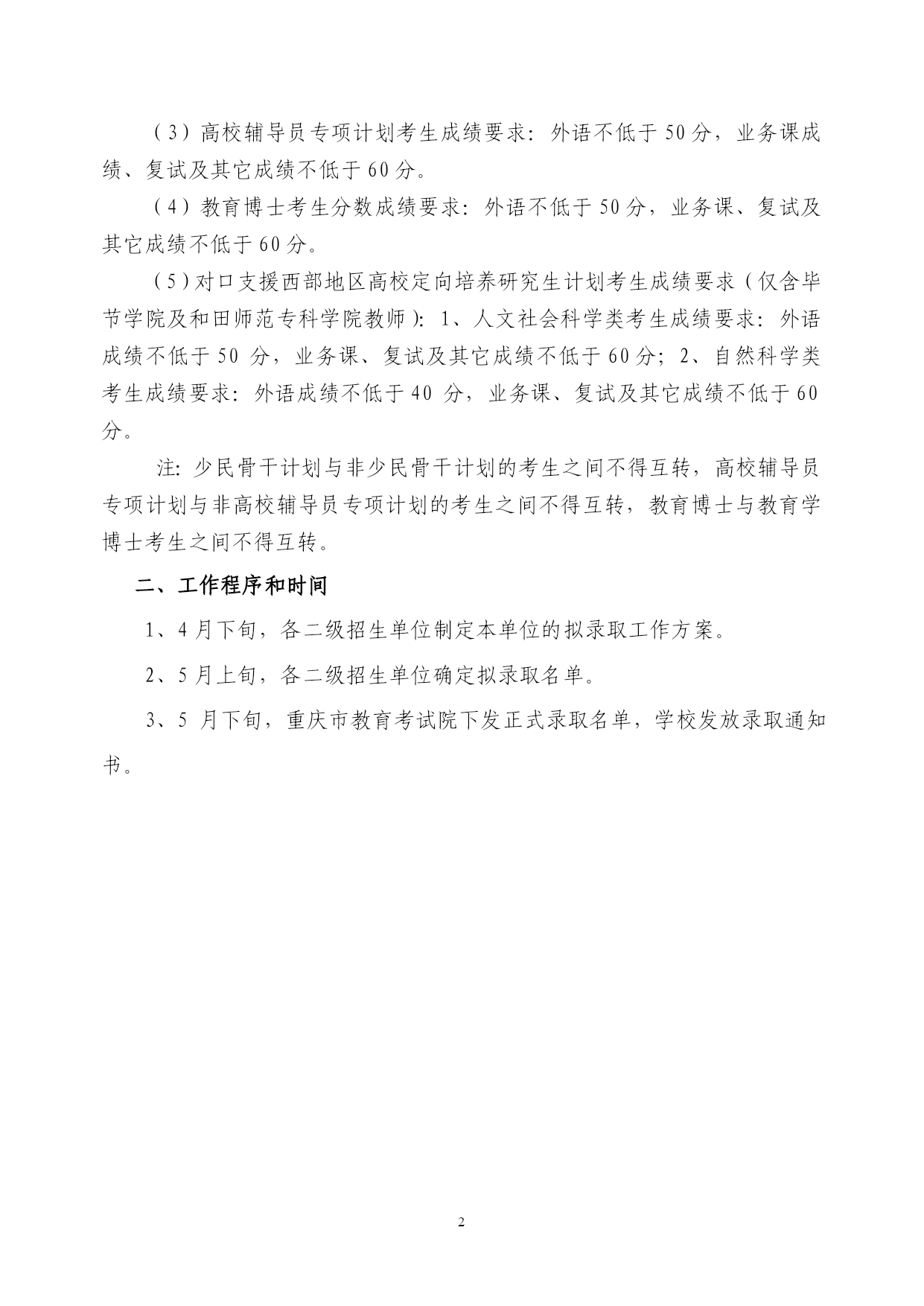 西南大学2013年博士研究生招生拟录取成绩要求及工作安排一、普通招考考生初试、复试及其它成绩要求为优化生源结构,本着公平、公正、公开的选拔原则,经学校研究生招生领导小组研究决定,公开招考考生初试、复试及其它成绩基本要求如下:(1)普通招考考生成绩要求:学科专业外语成绩要求业务课、复试及其它成绩要求人文科学(中国语言文学、哲学、外国语言文学、中国史)不低于55分不低于60分社会科学(马克思主义理论、教育学、心理学、农林经济管理)不低于50分不低于60分自然科学(数学、统计学、化学、生物学、生态学、地理学、食品科学与工程、农业工程、作物学、园艺学、植物保护、农业资源与环境、畜牧学、水产)不低于40分不低于60分(2)少数民族高层次骨干人才计划成绩要求:1、根据教育部文件规定及学校实际,经学校研究生招生领导小组研究决定,各博士招生专业拟录取少数民族高层次骨干人才计划汉族考生人数不得超过汉族拟录取总人数的10%;2、少数民族高层次骨干人才计划中汉族考生成绩要求:外语不低于65分,业务课、复试及其它成绩不低于60分;3、少数民族高层次骨干人才计划中少数民族考生成绩要求:外语不低于38分,业务课、复试及其它成绩不低于60分。(3)高校辅导员专项计划考生成绩要求:外语不低于50分,业务课成绩、复试及其它成绩不低于60分。(4)教育博士考生分数成绩要求:外语不低于50分,业务课、复试及其它成绩不低于60分。(5)对口支援西部地区高校定向培养研究生计划考生成绩要求(仅含毕节学院及和田师范专科学院教师):1、人文社会科学类考生成绩要求:外语成绩不低于50分,业务课、复试及其它成绩不低于60分;2、自然科学类考生成绩要求:外语成绩不低于40分,业务课、复试及其它成绩不低于60分。注:少民骨干计划与非少民骨干计划的考生之间不得互转,高校辅导员专项计划与非高校辅导员专项计划的考生之间不得互转,教育博士与教育学博士考生之间不得互转。二、工作程序和时间1、4月下旬,各二级招生单位制定本单位的拟录取工作方案。2、5月上旬,各二级招生单位确定拟录取名单。3、5月下旬,重庆市教育考试院下发正式录取名单,学校发放录取通知书。