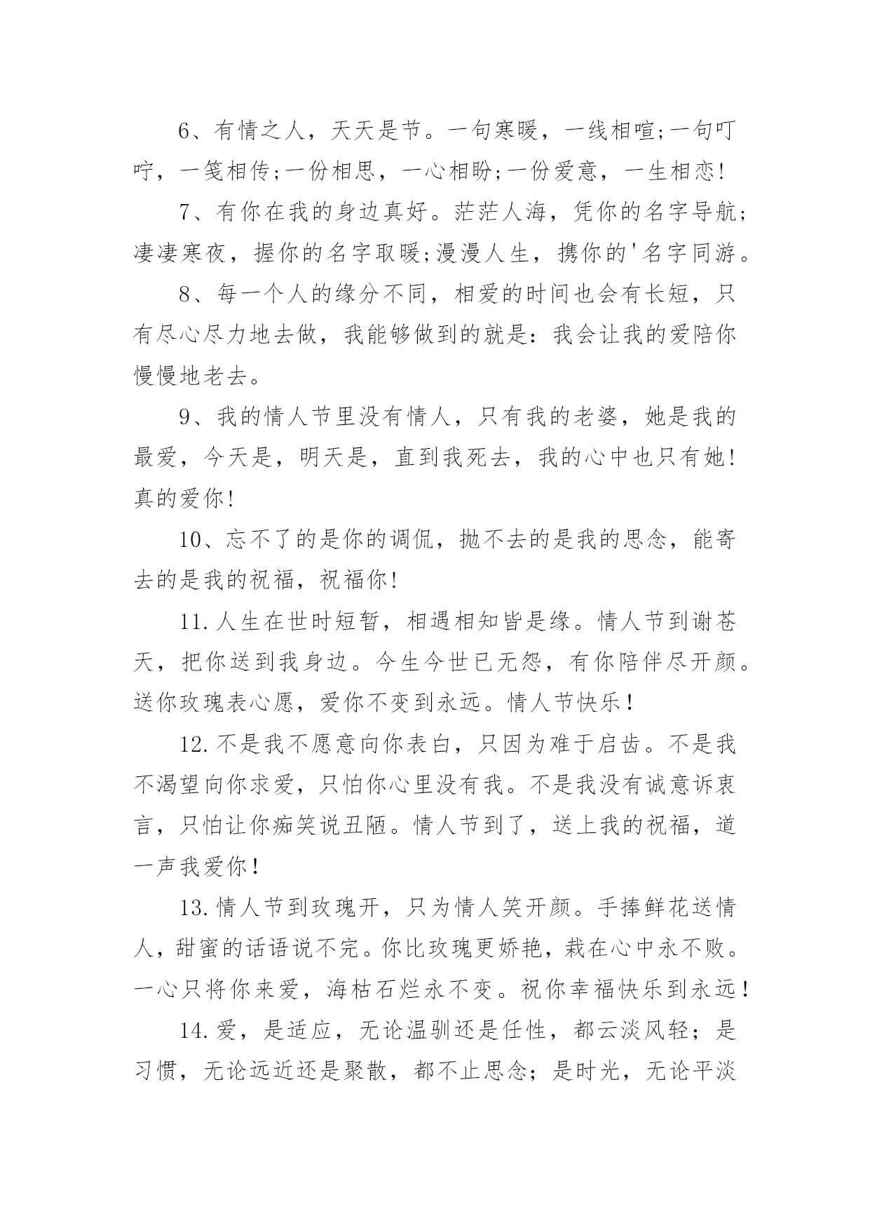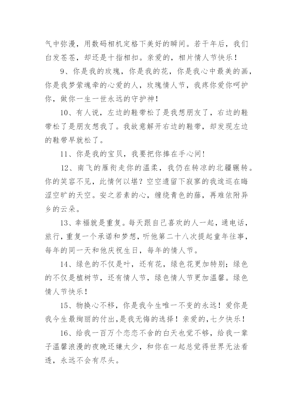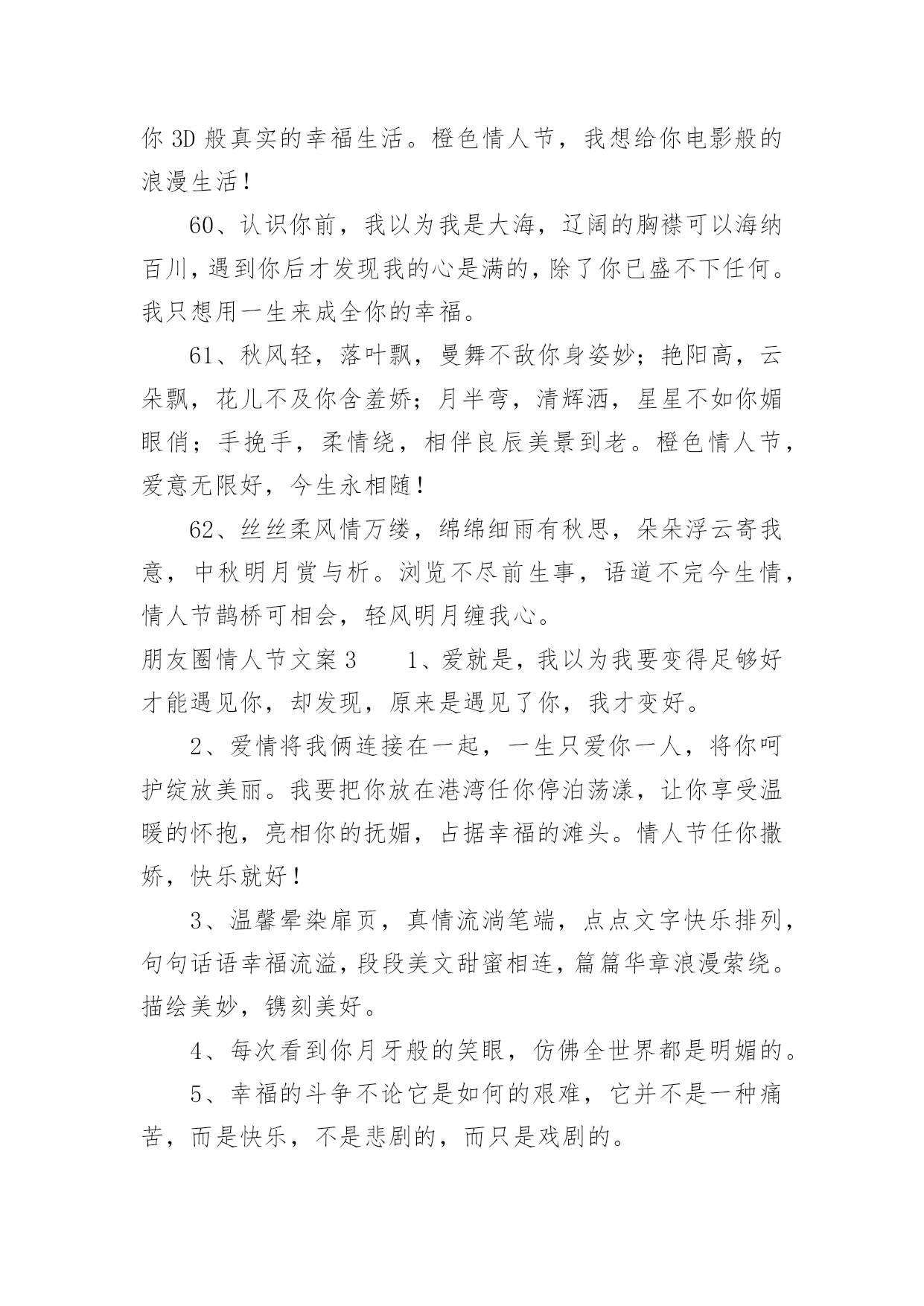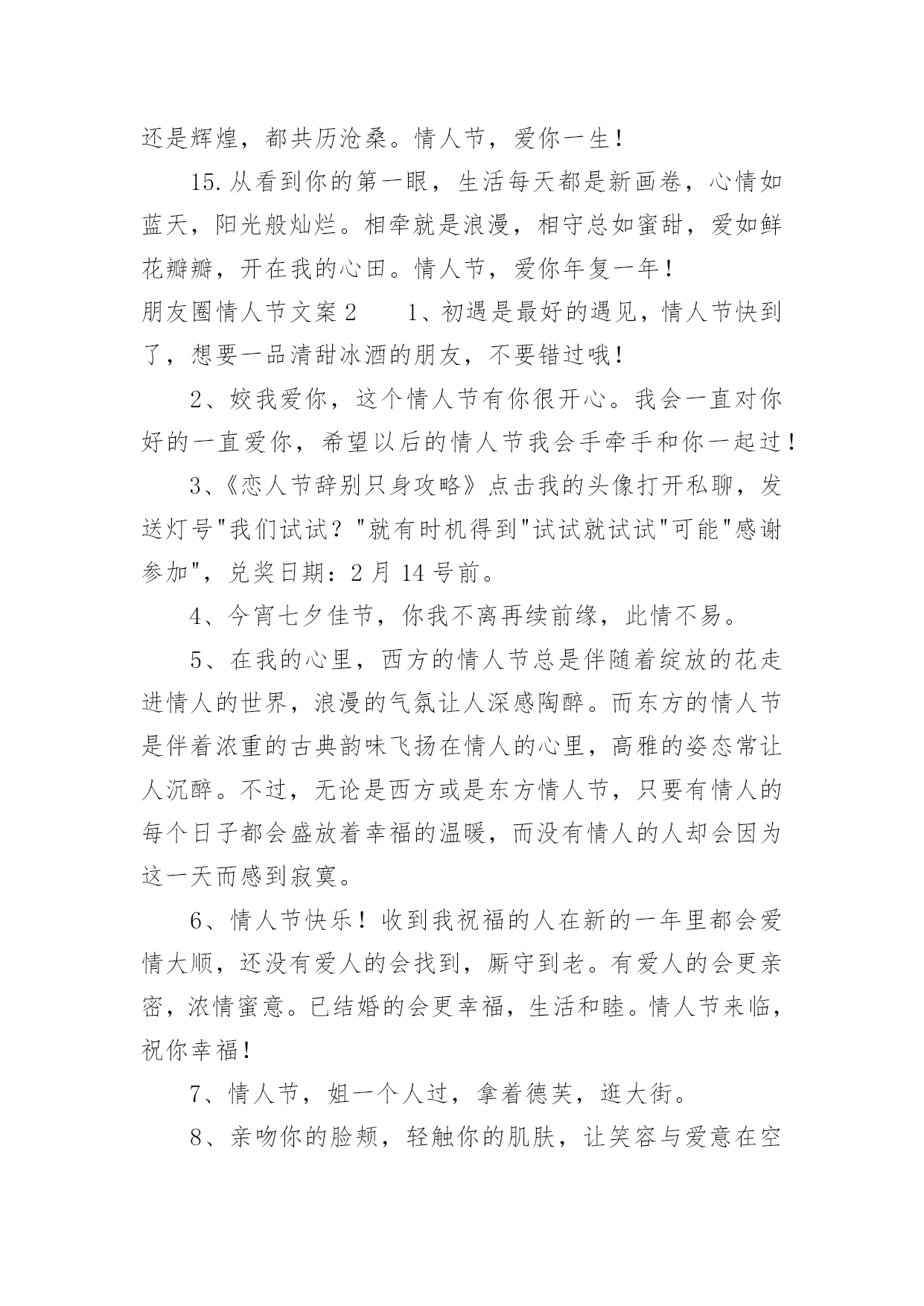 朋友圈情人节文案朋友圈情人节文案无论是在学校还是在社会中,越来越多人热衷于在线上发表文案,文案用以记录和分享生活日常。什么样的文案才是独特的呢?以下是小编精心整理的朋友圈情人节文案,欢迎大家分享。朋友圈情人节文案11、戒烟容易,戒你太难。当爱恋的病毒悄然而至,当你把从我心中下载的初吻放进回收站,我决定把爱情低格,让回忆格式化。你知道我的心在哭泣吗?2、泥是窝的嘴矮!泥是窝的蒙香!窝深情地看着泥!窝要对泥说,窝矮泥!(请大声朗读)3、情人节这一天其实可短暂了,手一拉一松,一个情人没了,嚎~?手再一拉不松,变老婆了,嚎~?情人节这一天最痛苦的事儿是啥,知道不?就是“和情人一起过,手都不让拉”情人节这一天最最痛苦的事儿是啥,知道不?就是“手都拉完了,情人和别人过了”情人节这一天最最最痛苦的事儿是啥,知道不?就是“拉着小情人的手在街上走,碰见老婆还拉着别人的手”4、给爱一张不老的容颜,让相爱过都终身不变;给爱一个不悔的誓言,让相爱过都彼此思念;给爱一片辽阔的蓝天,让那真爱充满人间。情人节幸福快乐!5、情书是我写的,玫瑰是我送的,照片是我拿的,电话是我打的,信息是我发的,祝情人节幸福快乐!6、有情之人,天天是节。一句寒暖,一线相喧;一句叮咛,一笺相传;一份相思,一心相盼;一份爱意,一生相恋!7、有你在我的身边真好。茫茫人海,凭你的名字导航;凄凄寒夜,握你的名字取暖;漫漫人生,携你的'名字同游。8、每一个人的缘分不同,相爱的时间也会有长短,只有尽心尽力地去做,我能够做到的就是:我会让我的爱陪你慢慢地老去。9、我的情人节里没有情人,只有我的老婆,她是我的最爱,今天是,明天是,直到我死去,我的心中也只有她!真的爱你!10、忘不了的是你的调侃,抛不去的是我的思念,能寄去的是我的祝福,祝福你!11.人生在世时短暂,相遇相知皆是缘。情人节到谢苍天,把你送到我身边。今生今世已无怨,有你陪伴尽开颜。送你玫瑰表心愿,爱你不变到永远。情人节快乐!12.不是我不愿意向你表白,只因为难于启齿。不是我不渴望向你求爱,只怕你心里没有我。不是我没有诚意诉衷言,只怕让你痴笑说丑陋。情人节到了,送上我的祝福,道一声我爱你!13.情人节到玫瑰开,只为情人笑开颜。手捧鲜花送情人,甜蜜的话语说不完。你比玫瑰更娇艳,栽在心中永不败。一心只将你来爱,海枯石烂永不变。祝你幸福快乐到永远!14.爱,是适应,无论温驯还是任性,都云淡风轻;是习惯,无论远近还是聚散,都不止思念;是时光,无论平淡还是辉煌,都共历沧桑。情人节,爱你一生!15.从看到你的第一眼,生活每天都是新画卷,心情如蓝天,阳光般灿烂。相牵就是浪漫,相守总如蜜甜,爱如鲜花瓣瓣,开在我的心田。情人节,爱你年复一年!朋友圈情人节文案21、初遇是最好的遇见,情人节快到了,想要一品清甜冰酒的朋友,不要错过哦!2、姣我爱你,这个情人节有你很开心。我会一直对你好的一直爱你,希望以后的情人节我会手牵手和你一起过!3、《恋人节辞别只身攻略》点击我的头像打开私聊,发送灯号"我们试试?"就有时机得到"试试就试试"可能"感谢参加",兑奖日期:2月14号前。4、今宵七夕佳节,你我不离再续前缘,此情不易。5、在我的心里,西方的情人节总是伴随着绽放的花走进情人的世界,浪漫的气氛让人深感陶醉。而东方的情人节是伴着浓重的古典韵味飞扬在情人的心里,高雅的姿态常让人沉醉。不过,无论是西方或是东方情人节,只要有情人的每个日子都会盛放着幸福的温暖,而没有情人的人却会因为这一天而感到寂寞。6、情人节快乐!收到我祝福的人在新的一年里都会爱情大顺,还没有爱人的会找到,厮守到老。有爱人的会更亲密,浓情蜜意。已结婚的会更幸福,生活和睦。情人节来临,祝你幸福!7、情人节,姐一个人过,拿着德芙,逛大街。8、亲吻你的脸颊,轻触你的肌肤,让笑容与爱意在空气中弥漫,用数码相机定格下美好的瞬间。若干年后,我们白发苍苍,却还是十指相扣。亲爱的,相片情人节快乐!9、你是我的玫瑰,你是我的花,你是我心中最美的画,你是我梦萦魂牵的心爱的人,玫瑰情人节,我疼你爱你呵护你,做你一生一世永远的守护神!10、有人说,左边的鞋带松了是我想朋友了,右边的鞋带松了是朋友想我了。我故意解开右边的鞋带,却发现左边的鞋带早就松了。11、你是我的宝贝,我要把你捧在手心间!12、南飞的雁衔走你的温柔,我仍在转凉的北疆辗转。你的笑容不见,此情何以堪?空空遗留下寂寥的我逡巡在晦涩空旷的天空。安之若素的心,缠绕青色的藤,再难依附异乡的云朵。13、幸福就是重复。每天跟自己喜欢的人一起,通电话,旅行,重复一个承诺和梦想,听他第二十八次提起童年往事,每年的同一天和他庆祝生日,每年的情人节。14、绿色的不仅是叶,还有花,绿色花更加特别;绿色的不仅是植树节,还有情人节,绿色情人节更加温馨。绿色情人节快乐!15、物换心不移,你是我