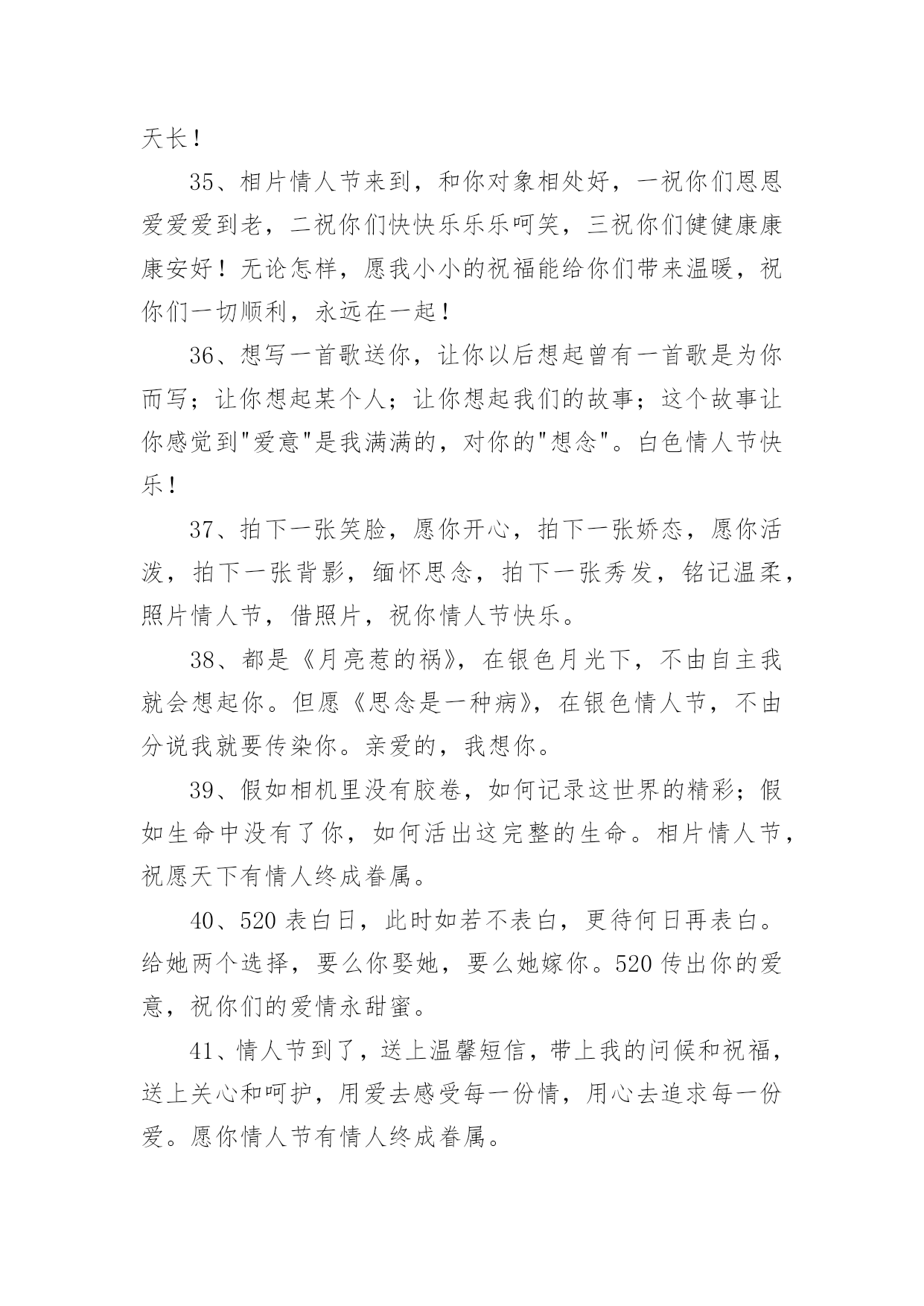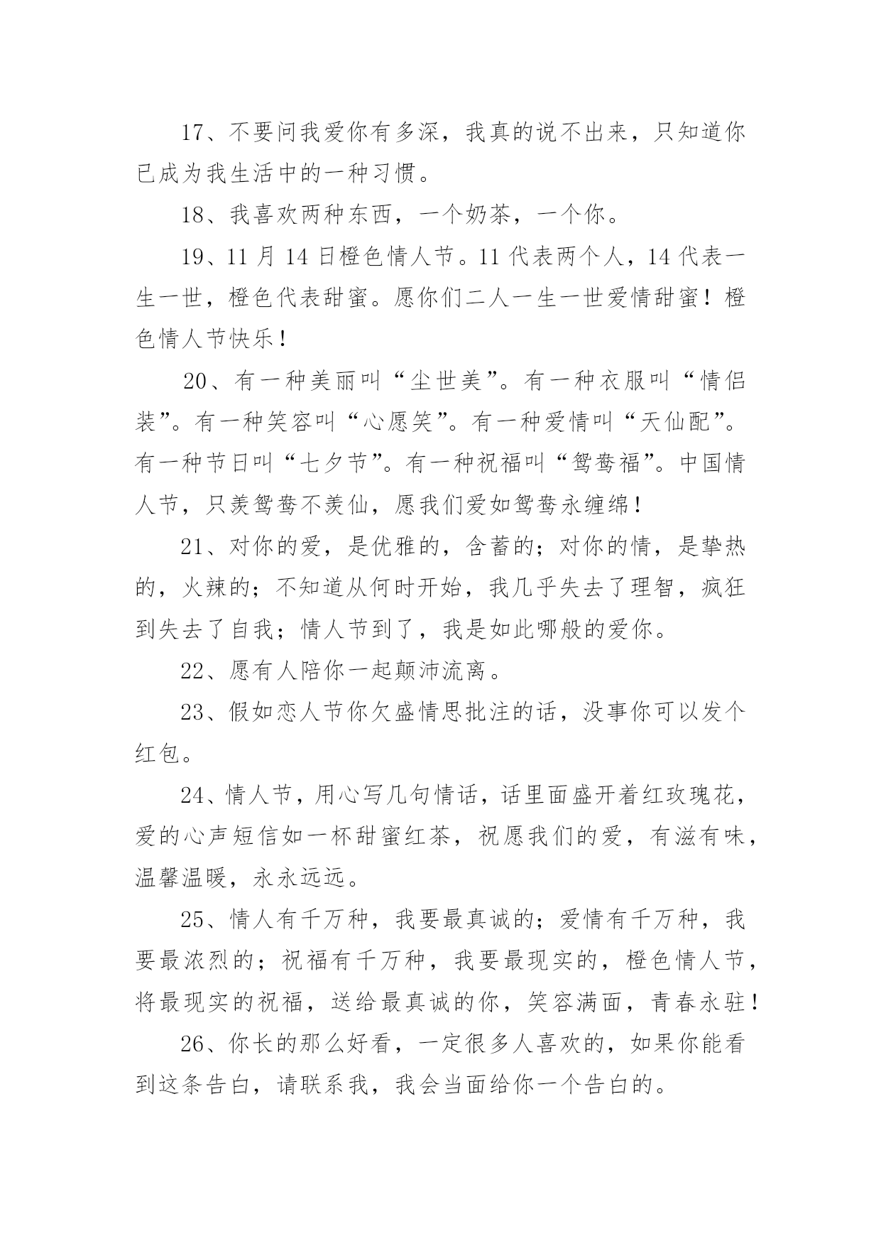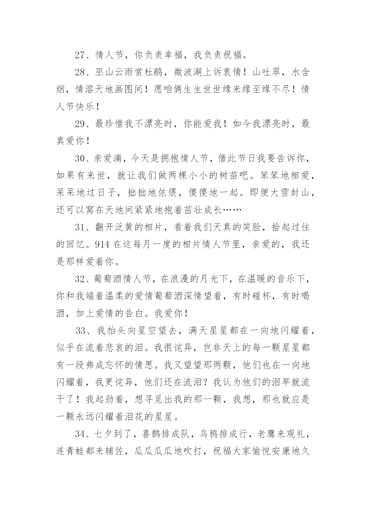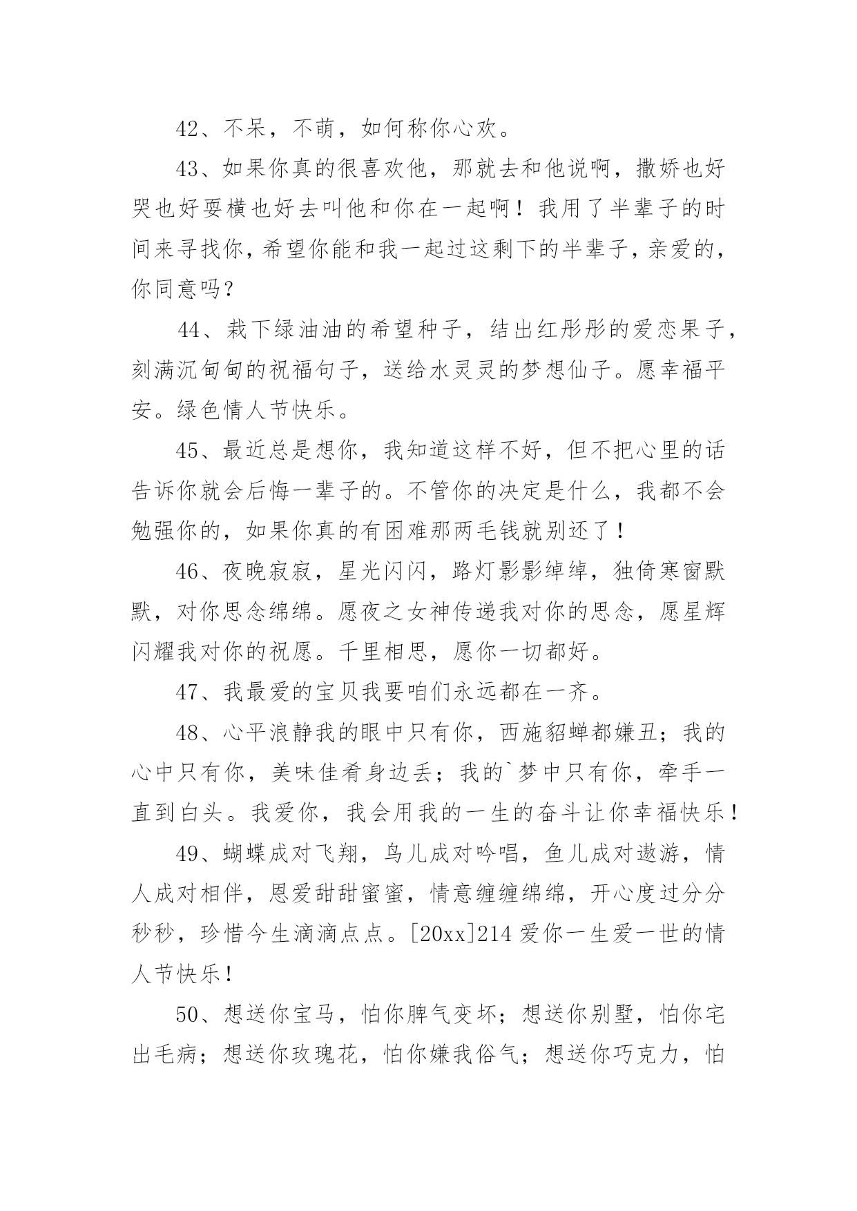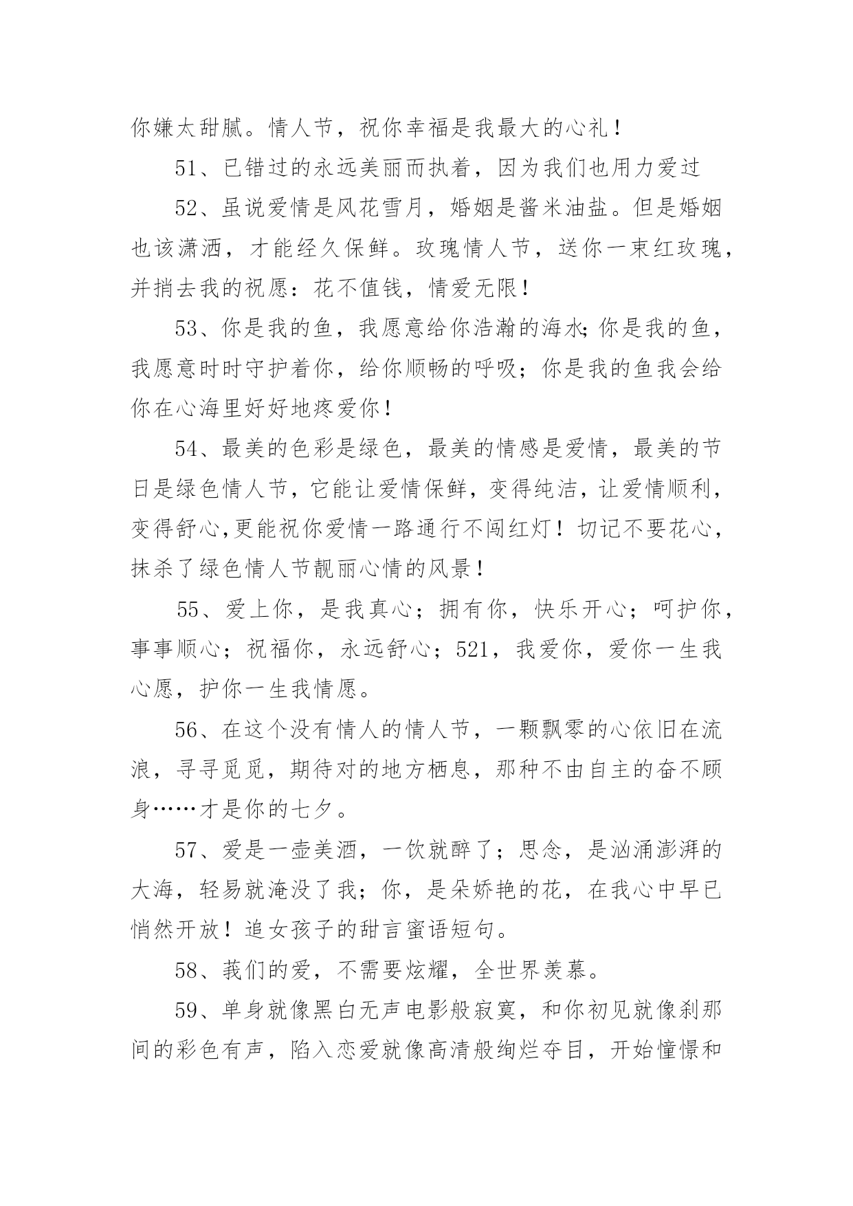 朋友圈情人节文案朋友圈情人节文案无论是在学校还是在社会中,越来越多人热衷于在线上发表文案,文案用以记录和分享生活日常。什么样的文案才是独特的呢?以下是小编精心整理的朋友圈情人节文案,欢迎大家分享。朋友圈情人节文案11、戒烟容易,戒你太难。当爱恋的病毒悄然而至,当你把从我心中下载的初吻放进回收站,我决定把爱情低格,让回忆格式化。你知道我的心在哭泣吗?2、泥是窝的嘴矮!泥是窝的蒙香!窝深情地看着泥!窝要对泥说,窝矮泥!(请大声朗读)3、情人节这一天其实可短暂了,手一拉一松,一个情人没了,嚎~?手再一拉不松,变老婆了,嚎~?情人节这一天最痛苦的事儿是啥,知道不?就是“和情人一起过,手都不让拉”情人节这一天最最痛苦的事儿是啥,知道不?就是“手都拉完了,情人和别人过了”情人节这一天最最最痛苦的事儿是啥,知道不?就是“拉着小情人的手在街上走,碰见老婆还拉着别人的手”4、给爱一张不老的容颜,让相爱过都终身不变;给爱一个不悔的誓言,让相爱过都彼此思念;给爱一片辽阔的蓝天,让那真爱充满人间。情人节幸福快乐!5、情书是我写的,玫瑰是我送的,照片是我拿的,电话是我打的,信息是我发的,祝情人节幸福快乐!6、有情之人,天天是节。一句寒暖,一线相喧;一句叮咛,一笺相传;一份相思,一心相盼;一份爱意,一生相恋!7、有你在我的身边真好。茫茫人海,凭你的名字导航;凄凄寒夜,握你的名字取暖;漫漫人生,携你的'名字同游。8、每一个人的缘分不同,相爱的时间也会有长短,只有尽心尽力地去做,我能够做到的就是:我会让我的爱陪你慢慢地老去。9、我的情人节里没有情人,只有我的老婆,她是我的最爱,今天是,明天是,直到我死去,我的心中也只有她!真的爱你!10、忘不了的是你的调侃,抛不去的是我的思念,能寄去的是我的祝福,祝福你!11.人生在世时短暂,相遇相知皆是缘。情人节到谢苍天,把你送到我身边。今生今世已无怨,有你陪伴尽开颜。送你玫瑰表心愿,爱你不变到永远。情人节快乐!12.不是我不愿意向你表白,只因为难于启齿。不是我不渴望向你求爱,只怕你心里没有我。不是我没有诚意诉衷言,只怕让你痴笑说丑陋。情人节到了,送上我的祝福,道一声我爱你!13.情人节到玫瑰开,只为情人笑开颜。手捧鲜花送情人,甜蜜的话语说不完。你比玫瑰更娇艳,栽在心中永不败。一心只将你来爱,海枯石烂永不变。祝你幸福快乐到永远!14.爱,是适应,无论温驯还是任性,都云淡风轻;是习惯,无论远近还是聚散,都不止思念;是时光,无论平淡还是辉煌,都共历沧桑。情人节,爱你一生!15.从看到你的第一眼,生活每天都是新画卷,心情如蓝天,阳光般灿烂。相牵就是浪漫,相守总如蜜甜,爱如鲜花瓣瓣,开在我的心田。情人节,爱你年复一年!朋友圈情人节文案21、初遇是最好的遇见,情人节快到了,想要一品清甜冰酒的朋友,不要错过哦!2、姣我爱你,这个情人节有你很开心。我会一直对你好的一直爱你,希望以后的情人节我会手牵手和你一起过!3、《恋人节辞别只身攻略》点击我的头像打开私聊,发送灯号"我们试试?"就有时机得到"试试就试试"可能"感谢参加",兑奖日期:2月14号前。4、今宵七夕佳节,你我不离再续前缘,此情不易。5、在我的心里,西方的情人节总是伴随着绽放的花走进情人的世界,浪漫的气氛让人深感陶醉。而东方的情人节是伴着浓重的古典韵味飞扬在情人的心里,高雅的姿态常让人沉醉。不过,无论是西方或是东方情人节,只要有情人的每个日子都会盛放着幸福的温暖,而没有情人的人却会因为这一天而感到寂寞。6、情人节快乐!收到我祝福的人在新的一年里都会爱情大顺,还没有爱人的会找到,厮守到老。有爱人的会更亲密,浓情蜜意。已结婚的会更幸福,生活和睦。情人节来临,祝你幸福!7、情人节,姐一个人过,拿着德芙,逛大街。8、亲吻你的脸颊,轻触你的肌肤,让笑容与爱意在空气中弥漫,用数码相机定格下美好的瞬间。若干年后,我们白发苍苍,却还是十指相扣。亲爱的,相片情人节快乐!9、你是我的玫瑰,你是我的花,你是我心中最美的画,你是我梦萦魂牵的心爱的人,玫瑰情人节,我疼你爱你呵护你,做你一生一世永远的守护神!10、有人说,左边的鞋带松了是我想朋友了,右边的鞋带松了是朋友想我了。我故意解开右边的鞋带,却发现左边的鞋带早就松了。11、你是我的宝贝,我要把你捧在手心间!12、南飞的雁衔走你的温柔,我仍在转凉的北疆辗转。你的笑容不见,此情何以堪?空空遗留下寂寥的我逡巡在晦涩空旷的天空。安之若素的心,缠绕青色的藤,再难依附异乡的云朵。13、幸福就是重复。每天跟自己喜欢的人一起,通电话,旅行,重复一个承诺和梦想,听他第二十八次提起童年往事,每年的同一天和他庆祝生日,每年的情人节。14、绿色的不仅是叶,还有花,绿色花更加特别;绿色的不仅是植树节,还有情人节,绿色情人节更加温馨。绿色情人节快乐!15、物换心不移,你是我