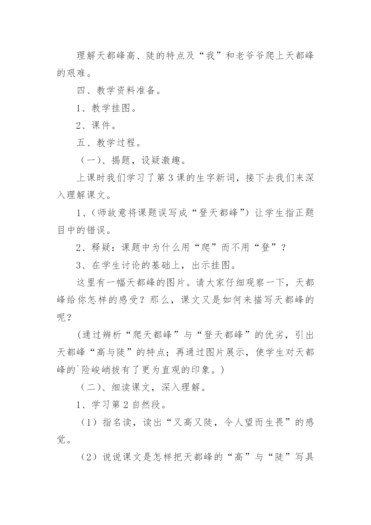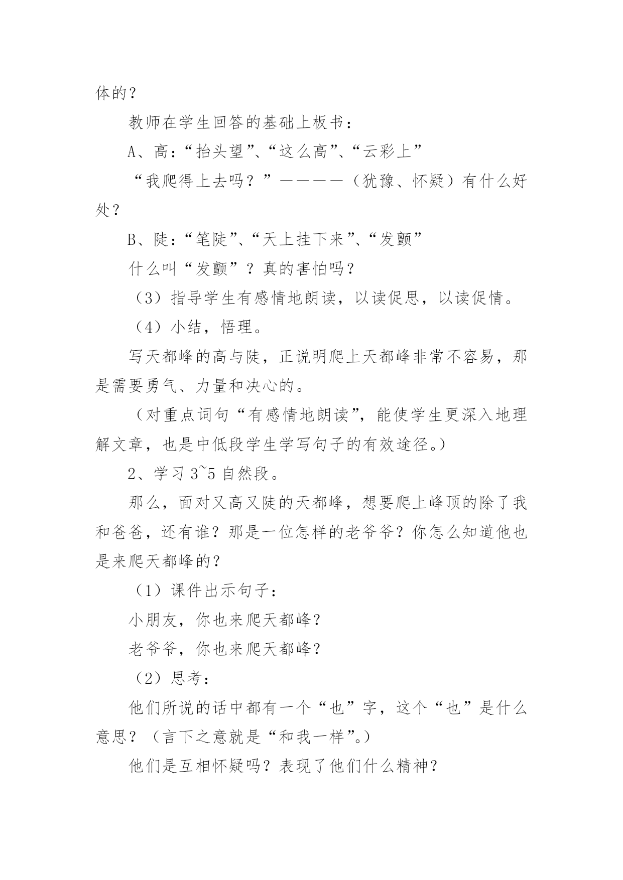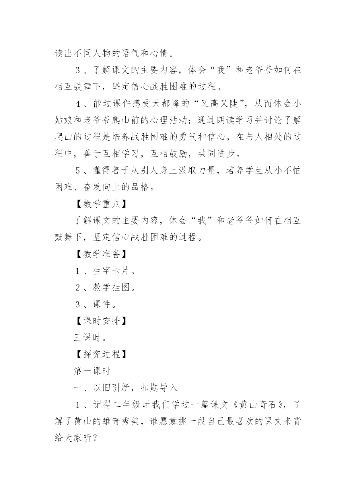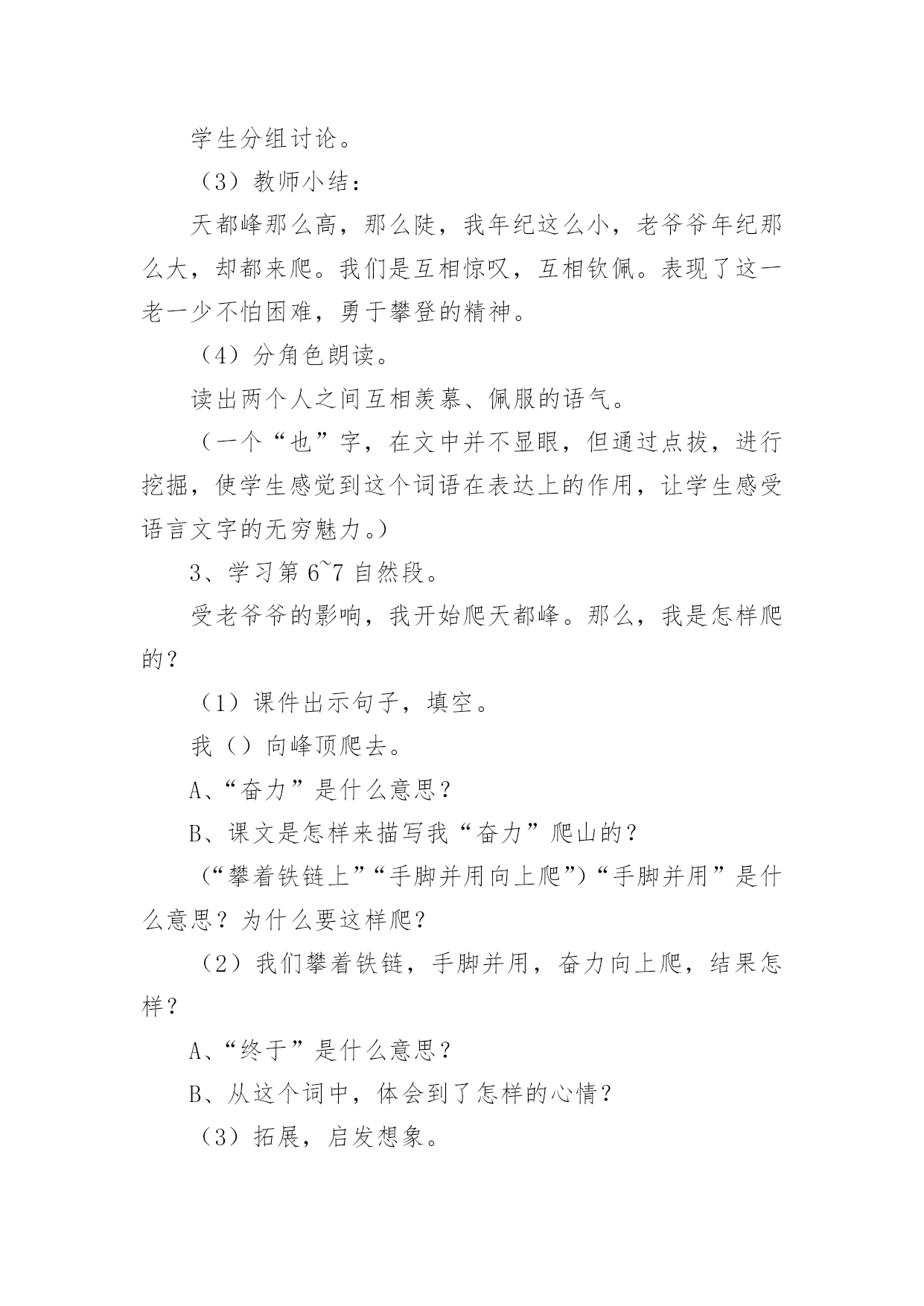 《爬天都峰》教学设计人教版《爬天都峰》教学设计作为一位优秀的人民教师,可能需要进行教学设计编写工作,借助教学设计可以提高教学质量,收到预期的教学效果。那么你有了解过教学设计吗?下面是小编为大家整理的人教版《爬天都峰》教学设计,欢迎阅读与收藏。人教版《爬天都峰》教学设计1一、教材分析。这是一篇精读课文。课文描写了在暑假里,“我”和爸爸去爬天都峰,路遇一位素不相识的老大爷。我们互相鼓励,克服困难,终于爬上了天都峰。在学习了生字新词的基础上,本课转入深究课文内容,以梳理课文条理,在品词析句的基础上解决教学重点。二、教学目标。1、能正确、流利、有感情地朗读课文,重点读好对话,读出不同人物的语气和心情。2、了解课文1~7自然段的内容,体会“我”和老爷爷如何在相互鼓舞下,坚定信心爬上天都峰的过程。3、培养学生从小不怕困难,奋发向上的品格。三、教学重点。理解天都峰高、陡的特点及“我”和老爷爷爬上天都峰的艰难。四、教学资料准备。1、教学挂图。2、课件。五、教学过程。(一)、揭题,设疑激趣。上课时我们学习了第3课的生字新词,接下去我们来深入理解课文。1、(师故意将课题误写成“登天都峰”)让学生指正题目中的错误。2、释疑:课题中为什么用“爬”而不用“登”?3、在学生讨论的基础上,出示挂图。这里有一幅天都峰的图片。请大家仔细观察一下,天都峰给你怎样的感受?那么,课文又是如何来描写天都峰的呢?(通过辨析“爬天都峰”与“登天都峰”的优劣,引出天都峰“高与陡”的特点;再通过图片展示,使学生对天都峰的`险峻峭拔有了更为直观的印象。)(二)、细读课文,深入理解。1、学习第2自然段。(1)指名读,读出“又高又陡,令人望而生畏”的感觉。(2)说说课文是怎样把天都峰的“高”与“陡”写具体的?教师在学生回答的基础上板书:A、高:“抬头望”、“这么高”、“云彩上”“我爬得上去吗?”――――(犹豫、怀疑)有什么好处?B、陡:“笔陡”、“天上挂下来”、“发颤”什么叫“发颤”?真的害怕吗?(3)指导学生有感情地朗读,以读促思,以读促情。(4)小结,悟理。写天都峰的高与陡,正说明爬上天都峰非常不容易,那是需要勇气、力量和决心的。(对重点词句“有感情地朗读”,能使学生更深入地理解文章,也是中低段学生学写句子的有效途径。)2、学习3~5自然段。那么,面对又高又陡的天都峰,想要爬上峰顶的除了我和爸爸,还有谁?那是一位怎样的老爷爷?你怎么知道他也是来爬天都峰的?(1)课件出示句子:小朋友,你也来爬天都峰?老爷爷,你也来爬天都峰?(2)思考:他们所说的话中都有一个“也”字,这个“也”是什么意思?(言下之意就是“和我一样”。)他们是互相怀疑吗?表现了他们什么精神?学生分组讨论。(3)教师小结:天都峰那么高,那么陡,我年纪这么小,老爷爷年纪那么大,却都来爬。我们是互相惊叹,互相钦佩。表现了这一老一少不怕困难,勇于攀登的精神。(4)分角色朗读。读出两个人之间互相羡慕、佩服的语气。(一个“也”字,在文中并不显眼,但通过点拔,进行挖掘,使学生感觉到这个词语在表达上的作用,让学生感受语言文字的无穷魅力。)3、学习第6~7自然段。受老爷爷的影响,我开始爬天都峰。那么,我是怎样爬的?(1)课件出示句子,填空。我()向峰顶爬去。A、“奋力”是什么意思?B、课文是怎样来描写我“奋力”爬山的?(“攀着铁链上”“手脚并用向上爬”)“手脚并用”是什么意思?为什么要这样爬?(2)我们攀着铁链,手脚并用,奋力向上爬,结果怎样?A、“终于”是什么意思?B、从这个词中,体会到了怎样的心情?(3)拓展,启发想象。为什么会有这种感觉呢?假设你是文中的“我”或老爷爷,在爬山途中,你会怎样去鼓励对方?爬上峰顶,“我”和老爷爷会说些什么,做些什么,又会有哪些感觉?(4)指导朗读。(通过创设的语境,让学生自然地融入课文,达到文本合一的境界,并从中领悟做人的道理。)(三)、课堂小结,领悟道理。学习如登山,我们只有不怕困难,知难而上,凭着坚强的毅力、非凡的勇气,才能攀上知识的高峰。(四)布置作业。把课文第2自然段描写天都峰又高又陡的句子抄下来,读一读,背一背。(积累好词好句,学以致用,来拓展语文学习的广阔天地。)[课后反思]《登天都峰》是新课程标准实验教材三年级上册第一组中的第三篇课文。根据教材的体系编排,考虑低年级到中年级的衔接,结合本班学生的实际,我在教学中力图体现以下这些特点:一、紧扣重点段落,理解课文内容。“窥一斑而见全豹。”在学生整体感知课文的基础上,我着力于指导学生学习课文的重点段落——“我”和老爷爷爬天都峰的经过。“我们”在爬山途中,相互鼓励,克服山高路陡的困难,终于一起爬上了天都峰。二、抓住关键语句,感觉人物形象。与主要内容密切相关的那些关键语句的理解,是学懂课文的关键,要把它放到具体的语言环境中去。课文中的许多语