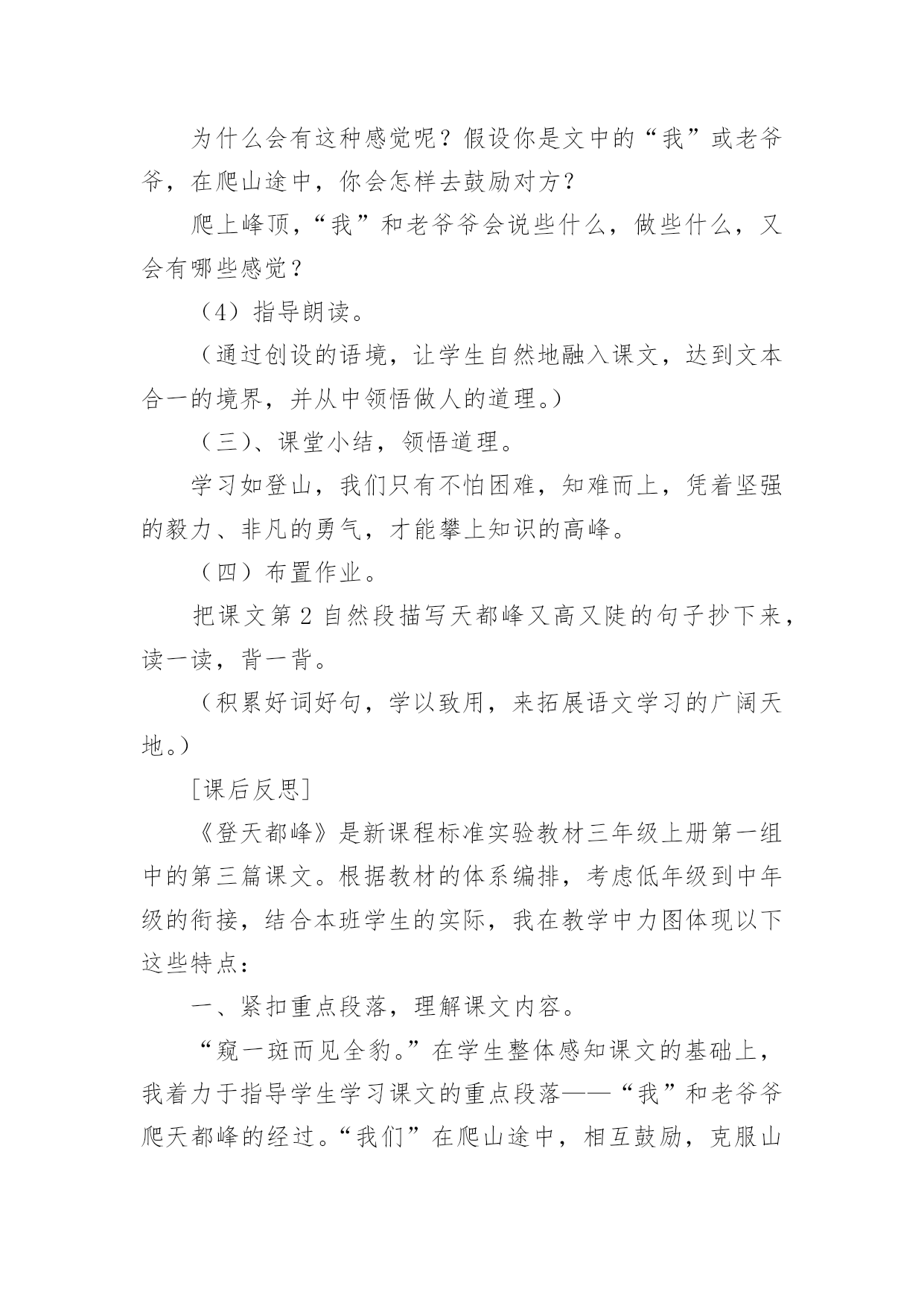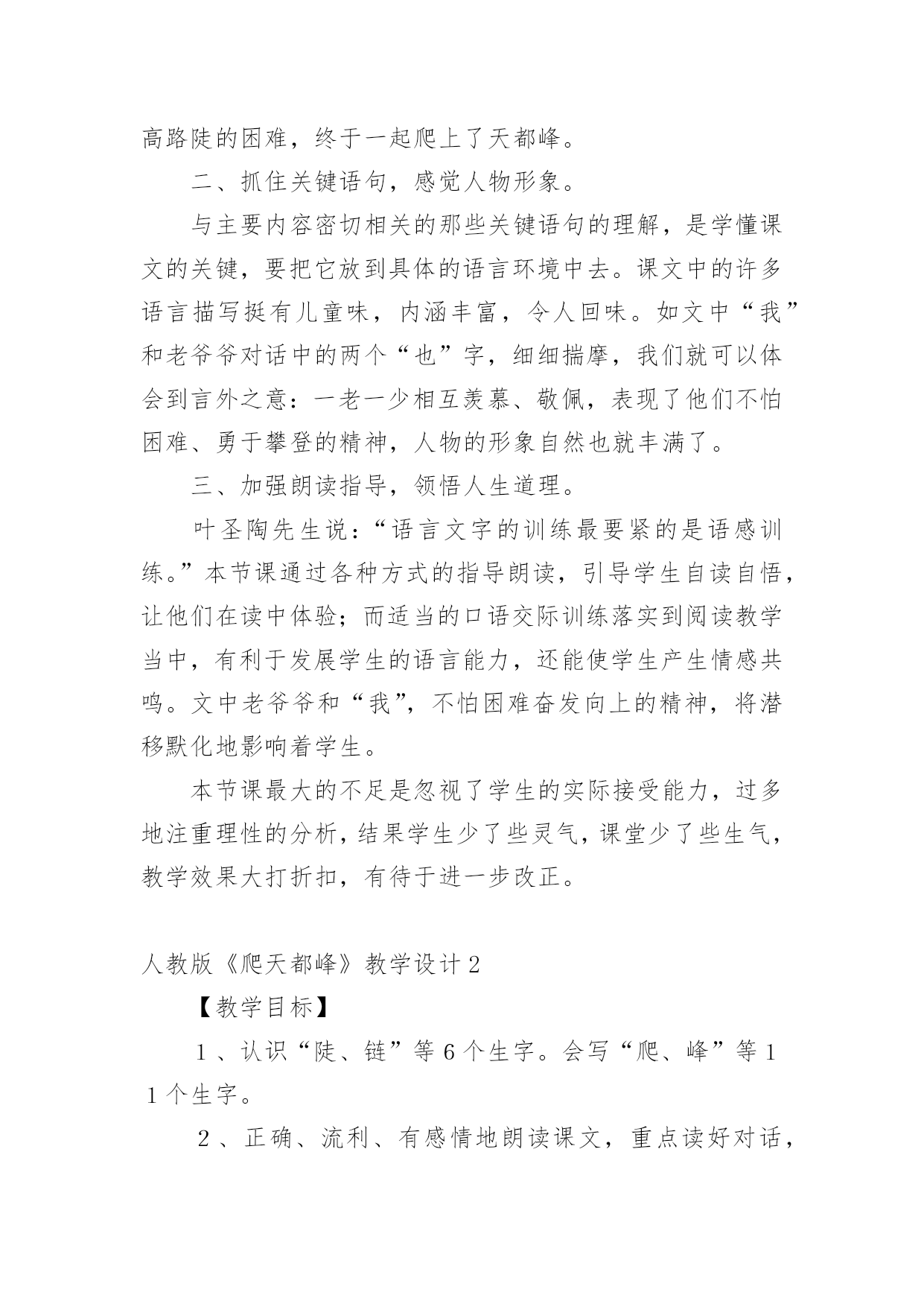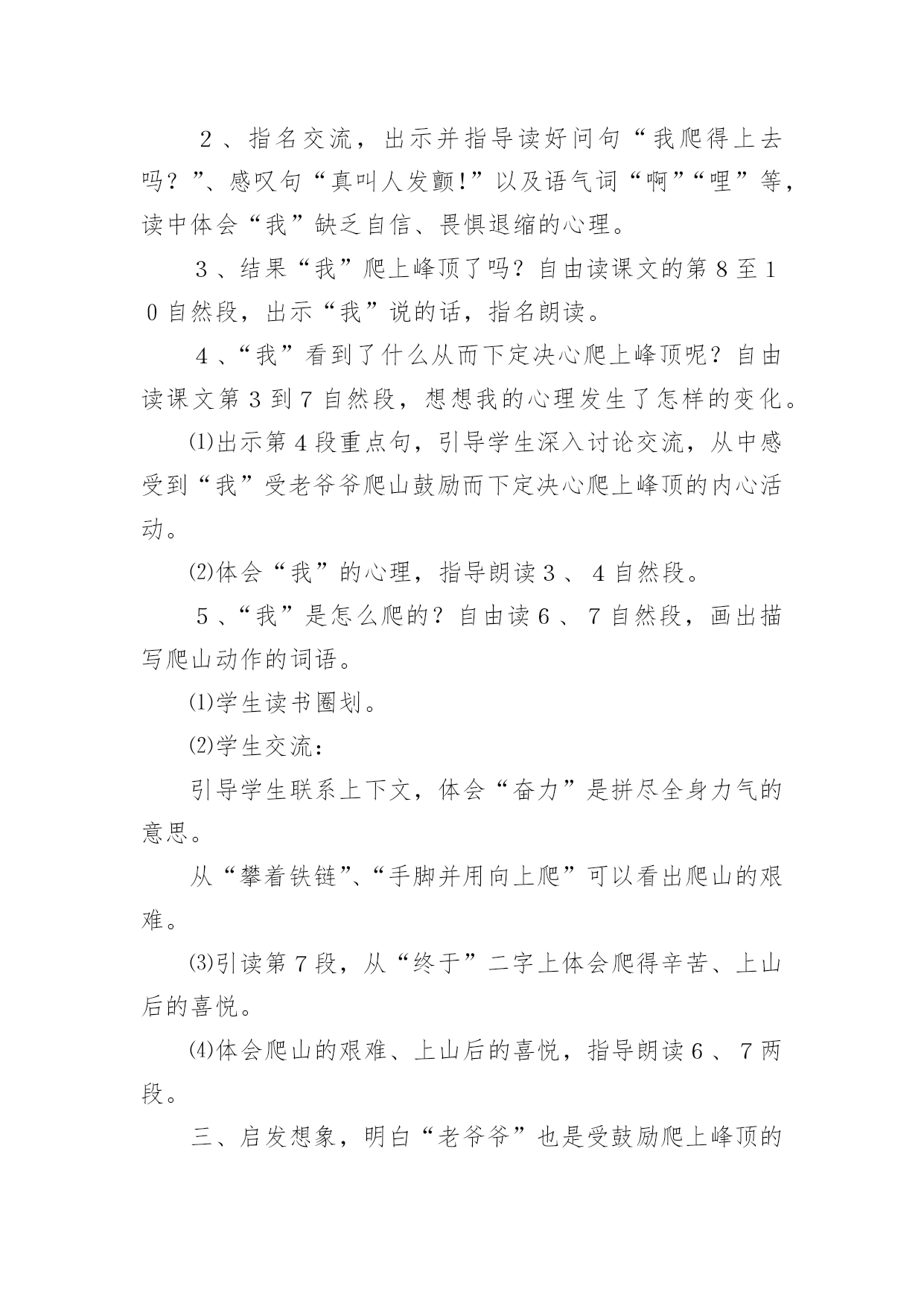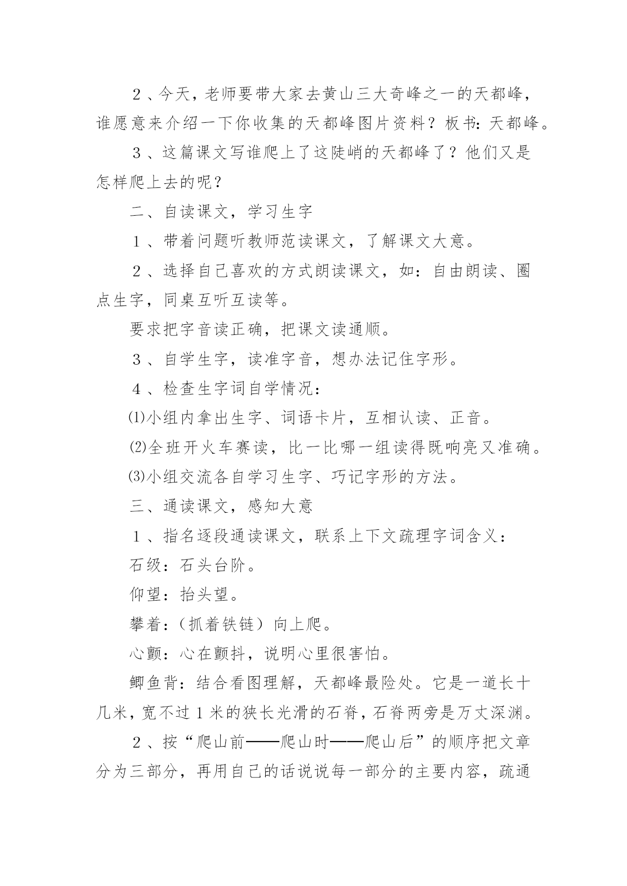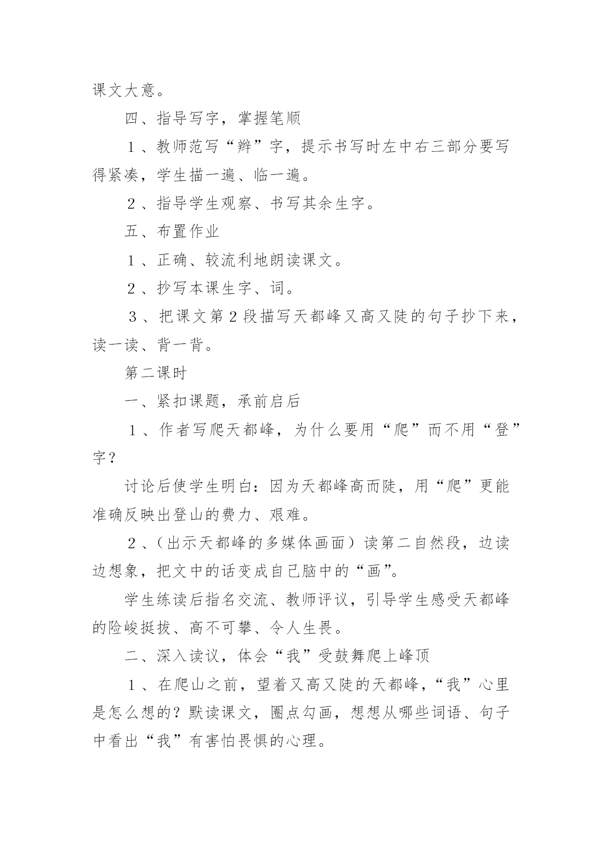 《爬天都峰》教学设计人教版《爬天都峰》教学设计作为一位优秀的人民教师,可能需要进行教学设计编写工作,借助教学设计可以提高教学质量,收到预期的教学效果。那么你有了解过教学设计吗?下面是小编为大家整理的人教版《爬天都峰》教学设计,欢迎阅读与收藏。人教版《爬天都峰》教学设计1一、教材分析。这是一篇精读课文。课文描写了在暑假里,“我”和爸爸去爬天都峰,路遇一位素不相识的老大爷。我们互相鼓励,克服困难,终于爬上了天都峰。在学习了生字新词的基础上,本课转入深究课文内容,以梳理课文条理,在品词析句的基础上解决教学重点。二、教学目标。1、能正确、流利、有感情地朗读课文,重点读好对话,读出不同人物的语气和心情。2、了解课文1~7自然段的内容,体会“我”和老爷爷如何在相互鼓舞下,坚定信心爬上天都峰的过程。3、培养学生从小不怕困难,奋发向上的品格。三、教学重点。理解天都峰高、陡的特点及“我”和老爷爷爬上天都峰的艰难。四、教学资料准备。1、教学挂图。2、课件。五、教学过程。(一)、揭题,设疑激趣。上课时我们学习了第3课的生字新词,接下去我们来深入理解课文。1、(师故意将课题误写成“登天都峰”)让学生指正题目中的错误。2、释疑:课题中为什么用“爬”而不用“登”?3、在学生讨论的基础上,出示挂图。这里有一幅天都峰的图片。请大家仔细观察一下,天都峰给你怎样的感受?那么,课文又是如何来描写天都峰的呢?(通过辨析“爬天都峰”与“登天都峰”的优劣,引出天都峰“高与陡”的特点;再通过图片展示,使学生对天都峰的`险峻峭拔有了更为直观的印象。)(二)、细读课文,深入理解。1、学习第2自然段。(1)指名读,读出“又高又陡,令人望而生畏”的感觉。(2)说说课文是怎样把天都峰的“高”与“陡”写具体的?教师在学生回答的基础上板书:A、高:“抬头望”、“这么高”、“云彩上”“我爬得上去吗?”――――(犹豫、怀疑)有什么好处?B、陡:“笔陡”、“天上挂下来”、“发颤”什么叫“发颤”?真的害怕吗?(3)指导学生有感情地朗读,以读促思,以读促情。(4)小结,悟理。写天都峰的高与陡,正说明爬上天都峰非常不容易,那是需要勇气、力量和决心的。(对重点词句“有感情地朗读”,能使学生更深入地理解文章,也是中低段学生学写句子的有效途径。)2、学习3~5自然段。那么,面对又高又陡的天都峰,想要爬上峰顶的除了我和爸爸,还有谁?那是一位怎样的老爷爷?你怎么知道他也是来爬天都峰的?(1)课件出示句子:小朋友,你也来爬天都峰?老爷爷,你也来爬天都峰?(2)思考:他们所说的话中都有一个“也”字,这个“也”是什么意思?(言下之意就是“和我一样”。)他们是互相怀疑吗?表现了他们什么精神?学生分组讨论。(3)教师小结:天都峰那么高,那么陡,我年纪这么小,老爷爷年纪那么大,却都来爬。我们是互相惊叹,互相钦佩。表现了这一老一少不怕困难,勇于攀登的精神。(4)分角色朗读。读出两个人之间互相羡慕、佩服的语气。(一个“也”字,在文中并不显眼,但通过点拔,进行挖掘,使学生感觉到这个词语在表达上的作用,让学生感受语言文字的无穷魅力。)3、学习第6~7自然段。受老爷爷的影响,我开始爬天都峰。那么,我是怎样爬的?(1)课件出示句子,填空。我()向峰顶爬去。A、“奋力”是什么意思?B、课文是怎样来描写我“奋力”爬山的?(“攀着铁链上”“手脚并用向上爬”)“手脚并用”是什么意思?为什么要这样爬?(2)我们攀着铁链,手脚并用,奋力向上爬,结果怎样?A、“终于”是什么意思?B、从这个词中,体会到了怎样的心情?(3)拓展,启发想象。为什么会有这种感觉呢?假设你是文中的“我”或老爷爷,在爬山途中,你会怎样去鼓励对方?爬上峰顶,“我”和老爷爷会说些什么,做些什么,又会有哪些感觉?(4)指导朗读。(通过创设的语境,让学生自然地融入课文,达到文本合一的境界,并从中领悟做人的道理。)(三)、课堂小结,领悟道理。学习如登山,我们只有不怕困难,知难而上,凭着坚强的毅力、非凡的勇气,才能攀上知识的高峰。(四)布置作业。把课文第2自然段描写天都峰又高又陡的句子抄下来,读一读,背一背。(积累好词好句,学以致用,来拓展语文学习的广阔天地。)[课后反思]《登天都峰》是新课程标准实验教材三年级上册第一组中的第三篇课文。根据教材的体系编排,考虑低年级到中年级的衔接,结合本班学生的实际,我在教学中力图体现以下这些特点:一、紧扣重点段落,理解课文内容。“窥一斑而见全豹。”在学生整体感知课文的基础上,我着力于指导学生学习课文的重点段落——“我”和老爷爷爬天都峰的经过。“我们”在爬山途中,相互鼓励,克服山高路陡的困难,终于一起爬上了天都峰。二、抓住关键语句,感觉人物形象。与主要内容密切相关的那些关键语句的理解,是学懂课文的关键,要把它放到具体的语言环境中去。课文中的许多语