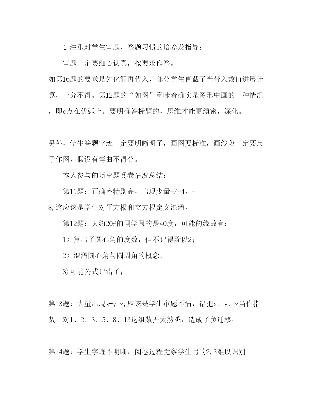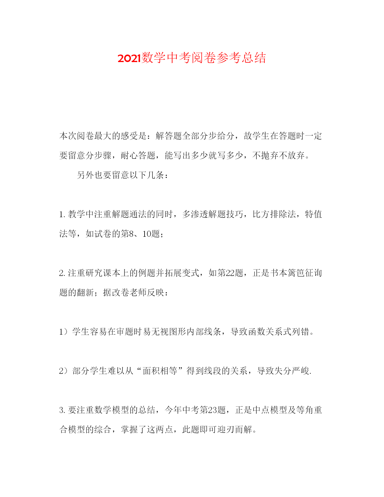 2021数学中考阅卷参考总结本次阅卷最大的感受是:解答题全部分步给分,故学生在答题时一定要留意分步骤,耐心答题,能写出多少就写多少,不抛弃不放弃。另外也要留意以下几条:1.教学中注重解题通法的同时,多渗透解题技巧,比方排除法,特值法等,如试卷的第8、10题;2.注重研究课本上的例题并拓展变式,如第22题,正是书本篱笆征询题的翻新;据改卷老师反映:1)学生容易在审题时易无视图形内部线条,导致函数关系式列错。2)部分学生难以从“面积相等”得到线段的关系,导致失分严峻.3.要注重数学模型的总结,今年中考第23题,正是中点模型及等角重合模型的综合,掌握了这两点,此题即可迎刃而解。4.注重对学生审题、答题习惯的培养及指导;审题一定要细心认真,按要求作答。如第16题的要求是先化简再代入,部分学生直截了当带入数值进展计算,一分不得。第12题的“如图”意味着确实是图形中画的一种情况,即c点在优弧上。要明确答标题的,思维才能更缜密,深化。另外,学生答题字迹一定要明晰明了,画图要标准,画线段一定要尺子作图,假设有弯曲不得分。本人参与的填空题阅卷情况总结:第11题:正确率特别高,出现少量+/-4,-8,这应该是学生对平方根和立方根定义混淆。第12题:大约20%的同学写的是40度,可能的缘故有:1)算出了圆心角的度数,但不记得除以2;2)混淆圆心角与圆周角的概念;3)可能公式记错了;第13题:大量出现x+y=z,应该是学生审题不清,错把x、y、z当作指数,对1、2、3、5、8、13这组数据太熟悉,造成了负迁移,第14题:学生字迹不明晰,阅卷过程觉察学生写的2,3难以识别。