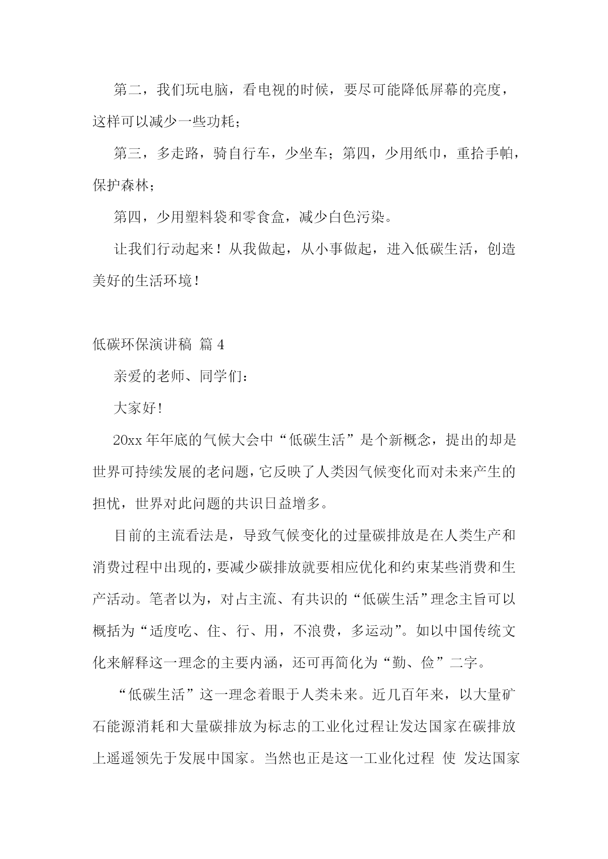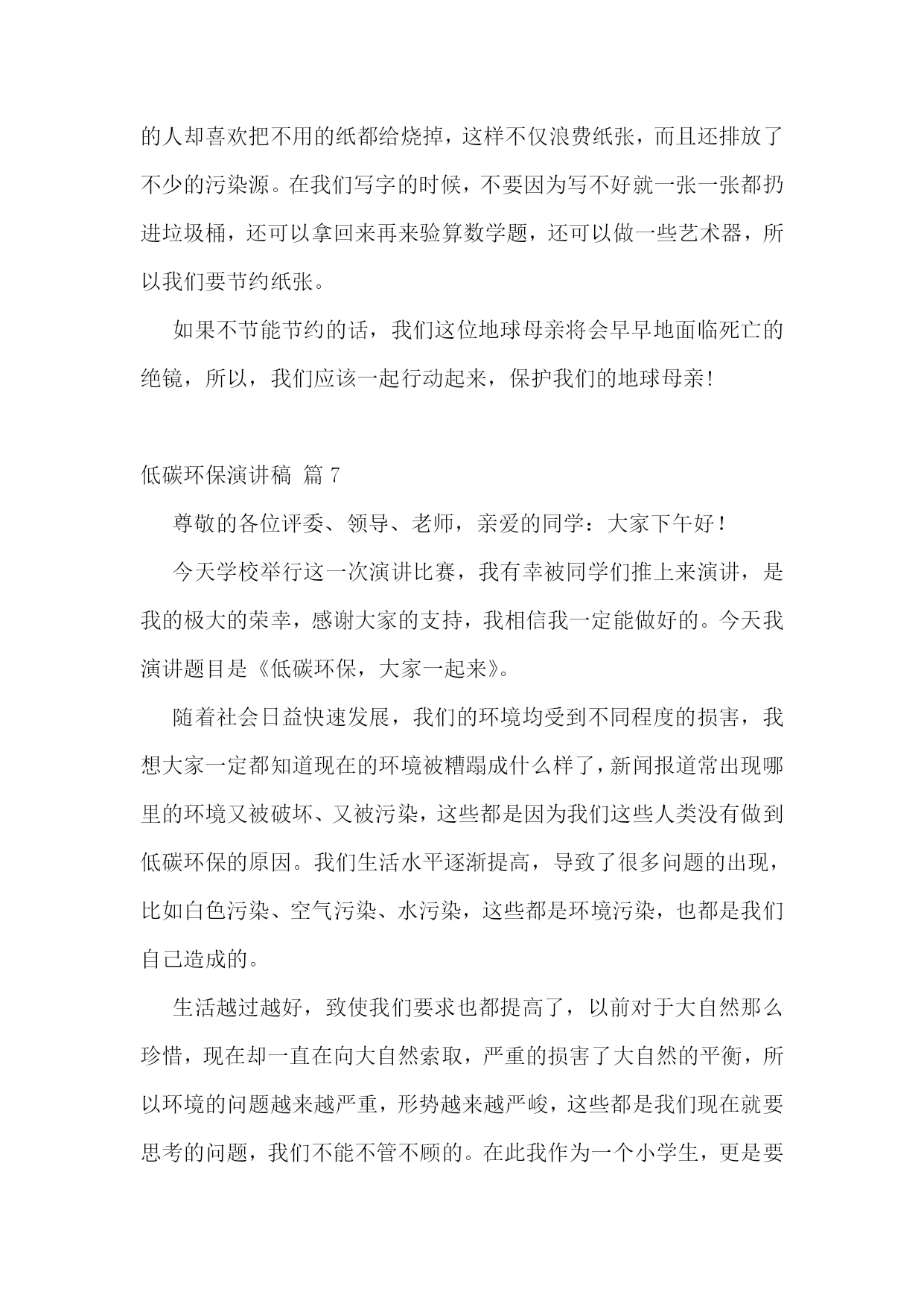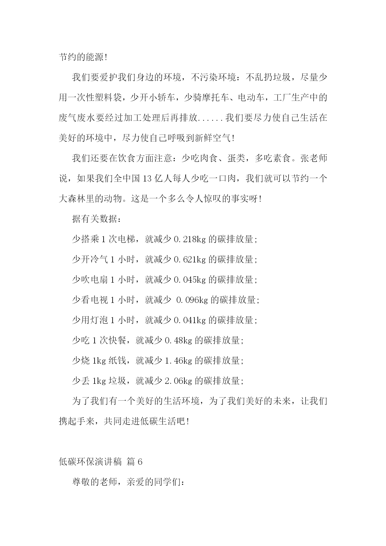 低碳环保演讲稿低碳环保演讲稿篇1尊敬的各位老师、亲爱的同学们:大家好!我是初二3班的xx,今天是六一儿童节,首先祝初一年级的同学们节日快乐!我演讲的题目是《环保与我同行》。谁不希望头顶的天空湛蓝如镜?谁不希望脚下的大地绿草如茵?想必大家还记得著名作家欧亨利的小说《最后一片叶子》中这句话“当最后一片叶子落下时,生命就都结束了,我也得离开这个世界而去了……”曾记得,英国人因为无规划扩大生产,排放废气;于是在1873年、1883年、1892年发生了三次伦敦毒雾事件,侵吞了1800人的生命作为赔偿;因为空气污染,20xx年,我们生活的北京,1月份仅有4天空气质量达到优良;20xx年全年,74个城市中空气达标城市由3个增加到8个,京津冀仍然是污染重灾区。这时,我们不禁要反问自己——这一切,难道不是人类为追求物质生活所带来的灾害吗?1972年6月5日到6月16日,联合国在瑞典首都斯德哥尔摩召开了人类环境会议。这是人类历史上第一次在全世界范围内研究保护人类环境的会议,标志着人类环境意识的觉醒,6月5日也被确定为“世界环境日”,今年的主题是“可持续消费和生产”。资料显示,威胁人类的十大环境问题分别是:气候变暖、臭氧破坏、生物减少、酸雨蔓延、森林锐减、土地沙化、大气污染、水污染、海洋污染和危险性废物排放,这十大恶魔无时无刻不在对人类的生存环境形成威胁,都需要全人类引起重视。昨天是5月31日世界无烟日。今年是世界卫生组织发起的第28个无烟日,本次世界无烟日的主题是“制止烟草制品非法贸易”。吸烟有毒、成瘾,尤其二手烟已被国际癌症研究署确定为a类致癌物质。中国现有吸烟人数超过3亿,约有7.4亿非吸烟者遭受二手烟侵害,而北京吸烟者的数量也超过了400万人,情况令人担忧。20xx年6月1日也就是今天,是个值得纪念的日子,因为从今天起,北京将实施史上最严禁烟令,并且禁止将烟草向未成年人销售。条例规定,今后XX市所有“带顶、带盖”的工作场所、公共场所、交通工具,都要100%禁烟,违规设立吸烟区的单位和机构最高可罚款3万元。此次首都禁烟堪称史上最严,这无疑也是在环保事业中迈出了重要一步。环保与我同行,践行绿色生活。身为当代中学生,更应该自觉保护环境,争当环保使者,除了自己要提高环保觉悟之外,更有义务提醒周围亲人、朋友、同学,都参与到环境保护中来。今天也是我国《环境保护法》实施后的第一个“环保日”,今年的主题是——践行绿色生活。因此,为了实现这一目标,在这里我谨代表初二3班向大家发出倡议:一、倡导保护环境,养成良好卫生习惯;拒绝随地吐痰、信手涂鸦、乱扔垃圾、踩踏草坪等不文明行为;二、节约资源。随手关灯,关电扇、空调等;倡导绿色出行,远离烟草制品;三、倡导全面阅读,打造书香校园;言行文明得体,共创和谐校园。共创绿色生活,共创绿色环境,共建绿色家园。从现在起,让我们行动起来,将绿色作为我们生活的主旋律,用爱心去关注环境的变化,用热情去传播环保的理念,用行动肩负起环保的重任!谢谢大家!低碳环保演讲稿篇2亲爱的老师、同学们:大家好!随着科学技术的发展,随着人类生活的进步,人们很容易步入高碳生活的节奏里。因此,低碳生活的倡导显得尤为必要,各种媒体上也在大量宣传低碳生活方式。说到低碳生活,我爷爷就是一个不折不扣的践行者。你看:早上洗脸后,他把洗脸水拿去浇花;出门上班前要检查一下家用电器是不是全关了,没关的随手关好;尽量少开私家车上班,天气好就坐公交车或骑自行车;周末去购物时,总要带一只环保袋……也许是受爷爷这个榜样的影响,我的生活方式也悄悄地发生了变化:晚上一个人宅在家里时,以前是灯火辉煌,为自己壮胆,现在是用不着的灯都关了;以前我洗刷时浪费严重,让水哗哗流,现在用水量只有过去的三分之一;以前做作业打草稿,草稿纸一面写了没几行就随手扔进了纸篓,现在我是正反两面都写得满满的;以前看到同学扔废品肯定是无动于衷,现在不忘提醒一句“能不能废物再利用啊”;以前……为了践行低碳生活,有时家人之间也会发生分歧,发生小小的摩擦。比如有一次,我和妈妈去逛超市。妈妈看到一个可以帮助挤牙膏的东西,就要买来,说那样的话可以把牙膏挤得很彻底,一点儿也不浪费。我看了看材料,摇摇头:“别买了,你看,这是用塑料做的。你为了节约一点牙膏,却使地球多了些白色污染,这不是得不偿失吗?”妈妈争辩:“到底是利大于弊,还是弊大于利,你不要妄下结论。”俩人公说公有理,婆说婆有理,难以定夺。践行低碳生活,是每个人的责任和义务,是一个人的综合素养的体现。让我们每个人,都能行动起来,从自身做起,从每件小事做起。低碳环保演讲稿篇3亲爱的同学们:我们经常在网络、电视和报纸上看到“低碳生活”这个词。什么是低碳生活?低碳意味着更低的温室气体排放。这是一种低能耗、低消耗的生活方式。简