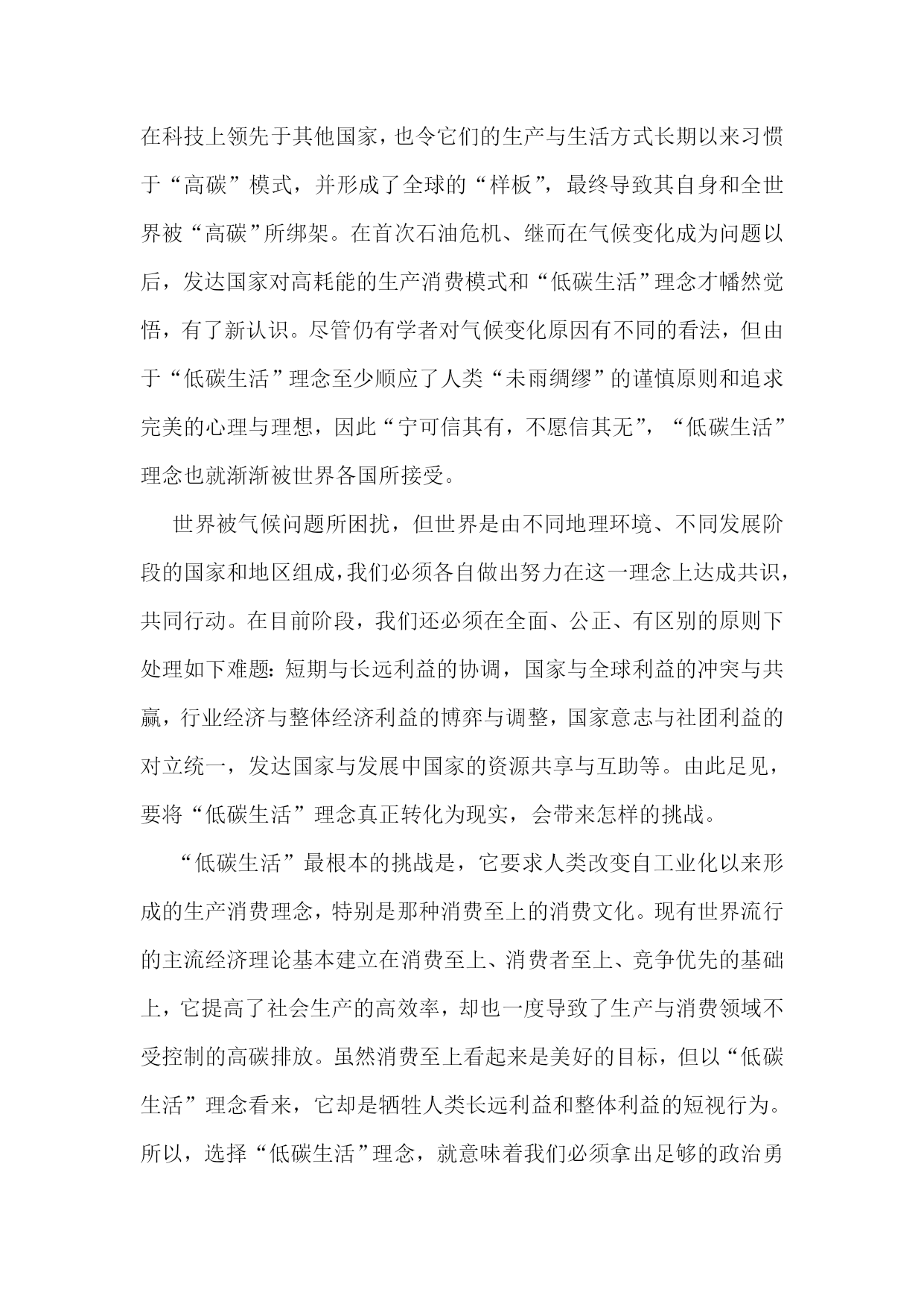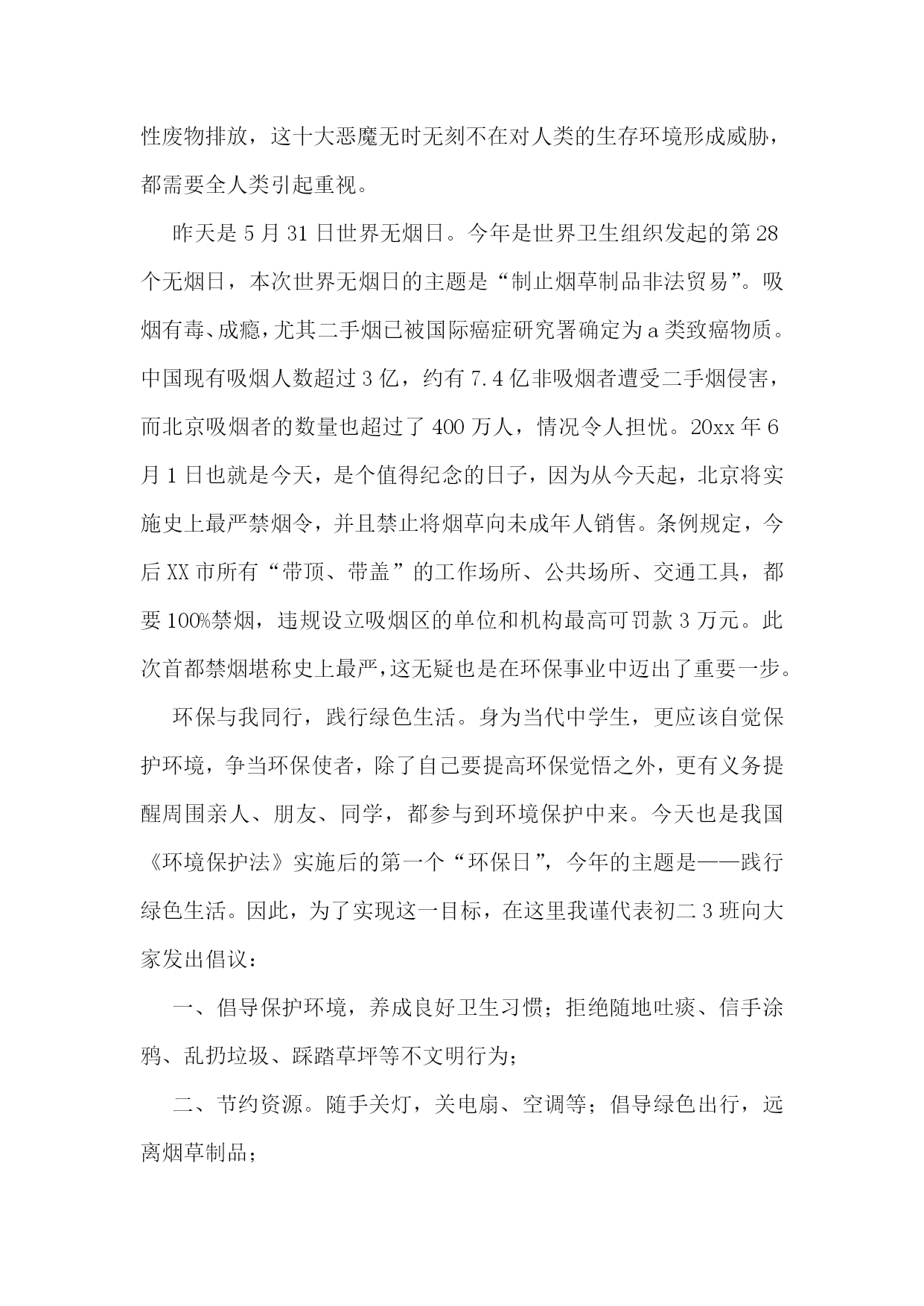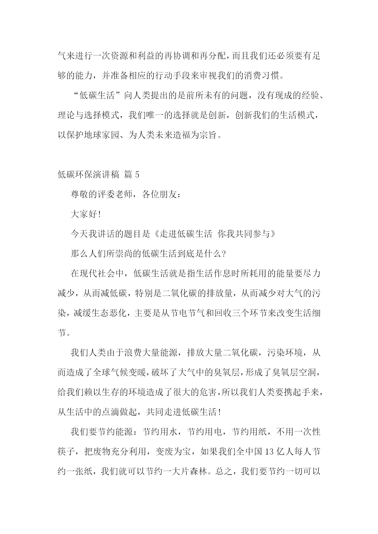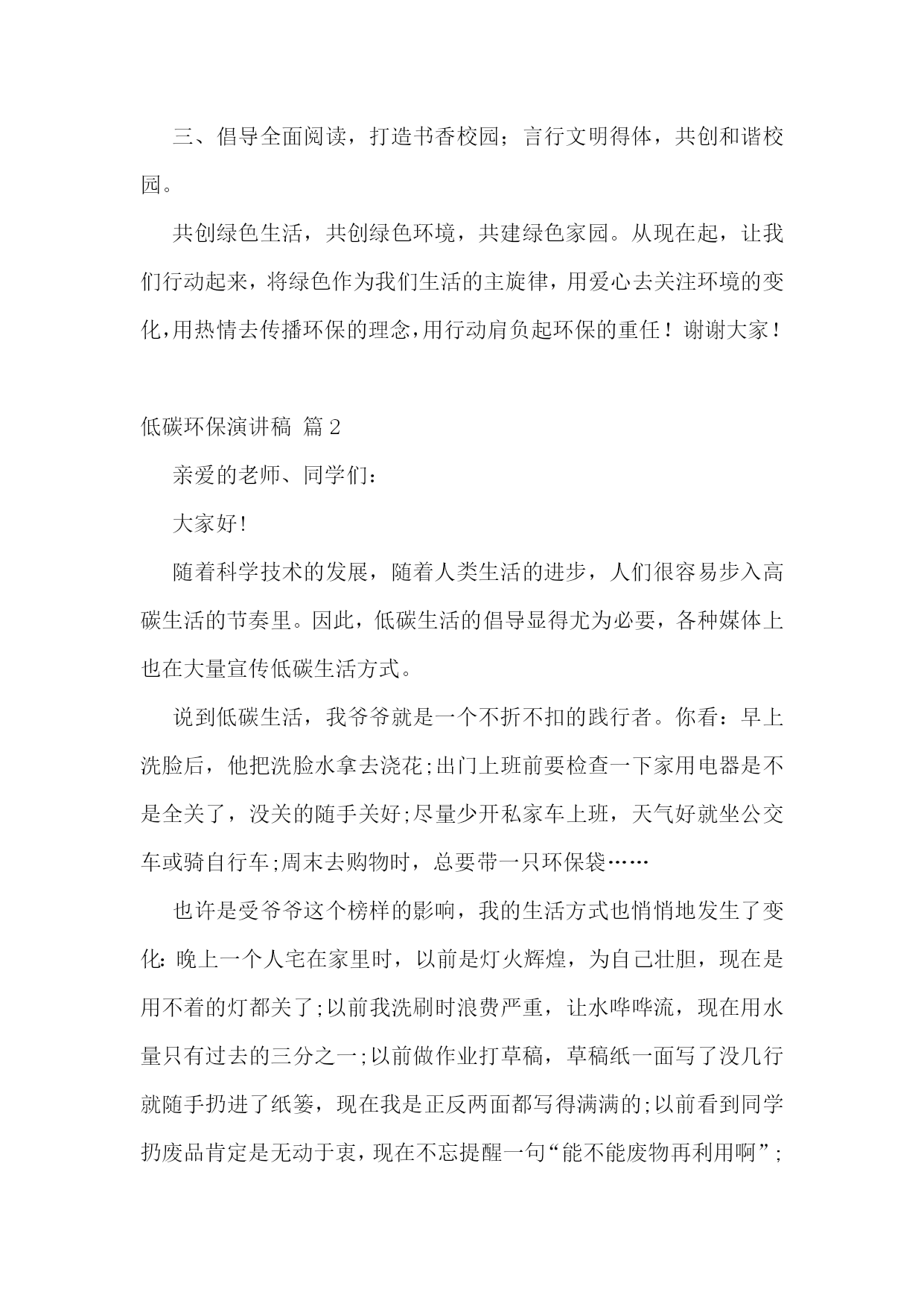 低碳环保演讲稿低碳环保演讲稿篇1尊敬的各位老师、亲爱的同学们:大家好!我是初二3班的xx,今天是六一儿童节,首先祝初一年级的同学们节日快乐!我演讲的题目是《环保与我同行》。谁不希望头顶的天空湛蓝如镜?谁不希望脚下的大地绿草如茵?想必大家还记得著名作家欧亨利的小说《最后一片叶子》中这句话“当最后一片叶子落下时,生命就都结束了,我也得离开这个世界而去了……”曾记得,英国人因为无规划扩大生产,排放废气;于是在1873年、1883年、1892年发生了三次伦敦毒雾事件,侵吞了1800人的生命作为赔偿;因为空气污染,20xx年,我们生活的北京,1月份仅有4天空气质量达到优良;20xx年全年,74个城市中空气达标城市由3个增加到8个,京津冀仍然是污染重灾区。这时,我们不禁要反问自己——这一切,难道不是人类为追求物质生活所带来的灾害吗?1972年6月5日到6月16日,联合国在瑞典首都斯德哥尔摩召开了人类环境会议。这是人类历史上第一次在全世界范围内研究保护人类环境的会议,标志着人类环境意识的觉醒,6月5日也被确定为“世界环境日”,今年的主题是“可持续消费和生产”。资料显示,威胁人类的十大环境问题分别是:气候变暖、臭氧破坏、生物减少、酸雨蔓延、森林锐减、土地沙化、大气污染、水污染、海洋污染和危险性废物排放,这十大恶魔无时无刻不在对人类的生存环境形成威胁,都需要全人类引起重视。昨天是5月31日世界无烟日。今年是世界卫生组织发起的第28个无烟日,本次世界无烟日的主题是“制止烟草制品非法贸易”。吸烟有毒、成瘾,尤其二手烟已被国际癌症研究署确定为a类致癌物质。中国现有吸烟人数超过3亿,约有7.4亿非吸烟者遭受二手烟侵害,而北京吸烟者的数量也超过了400万人,情况令人担忧。20xx年6月1日也就是今天,是个值得纪念的日子,因为从今天起,北京将实施史上最严禁烟令,并且禁止将烟草向未成年人销售。条例规定,今后XX市所有“带顶、带盖”的工作场所、公共场所、交通工具,都要100%禁烟,违规设立吸烟区的单位和机构最高可罚款3万元。此次首都禁烟堪称史上最严,这无疑也是在环保事业中迈出了重要一步。环保与我同行,践行绿色生活。身为当代中学生,更应该自觉保护环境,争当环保使者,除了自己要提高环保觉悟之外,更有义务提醒周围亲人、朋友、同学,都参与到环境保护中来。今天也是我国《环境保护法》实施后的第一个“环保日”,今年的主题是——践行绿色生活。因此,为了实现这一目标,在这里我谨代表初二3班向大家发出倡议:一、倡导保护环境,养成良好卫生习惯;拒绝随地吐痰、信手涂鸦、乱扔垃圾、踩踏草坪等不文明行为;二、节约资源。随手关灯,关电扇、空调等;倡导绿色出行,远离烟草制品;三、倡导全面阅读,打造书香校园;言行文明得体,共创和谐校园。共创绿色生活,共创绿色环境,共建绿色家园。从现在起,让我们行动起来,将绿色作为我们生活的主旋律,用爱心去关注环境的变化,用热情去传播环保的理念,用行动肩负起环保的重任!谢谢大家!低碳环保演讲稿篇2亲爱的老师、同学们:大家好!随着科学技术的发展,随着人类生活的进步,人们很容易步入高碳生活的节奏里。因此,低碳生活的倡导显得尤为必要,各种媒体上也在大量宣传低碳生活方式。说到低碳生活,我爷爷就是一个不折不扣的践行者。你看:早上洗脸后,他把洗脸水拿去浇花;出门上班前要检查一下家用电器是不是全关了,没关的随手关好;尽量少开私家车上班,天气好就坐公交车或骑自行车;周末去购物时,总要带一只环保袋……也许是受爷爷这个榜样的影响,我的生活方式也悄悄地发生了变化:晚上一个人宅在家里时,以前是灯火辉煌,为自己壮胆,现在是用不着的灯都关了;以前我洗刷时浪费严重,让水哗哗流,现在用水量只有过去的三分之一;以前做作业打草稿,草稿纸一面写了没几行就随手扔进了纸篓,现在我是正反两面都写得满满的;以前看到同学扔废品肯定是无动于衷,现在不忘提醒一句“能不能废物再利用啊”;以前……为了践行低碳生活,有时家人之间也会发生分歧,发生小小的摩擦。比如有一次,我和妈妈去逛超市。妈妈看到一个可以帮助挤牙膏的东西,就要买来,说那样的话可以把牙膏挤得很彻底,一点儿也不浪费。我看了看材料,摇摇头:“别买了,你看,这是用塑料做的。你为了节约一点牙膏,却使地球多了些白色污染,这不是得不偿失吗?”妈妈争辩:“到底是利大于弊,还是弊大于利,你不要妄下结论。”俩人公说公有理,婆说婆有理,难以定夺。践行低碳生活,是每个人的责任和义务,是一个人的综合素养的体现。让我们每个人,都能行动起来,从自身做起,从每件小事做起。低碳环保演讲稿篇3亲爱的同学们:我们经常在网络、电视和报纸上看到“低碳生活”这个词。什么是低碳生活?低碳意味着更低的温室气体排放。这是一种低能耗、低消耗的生活方式。简