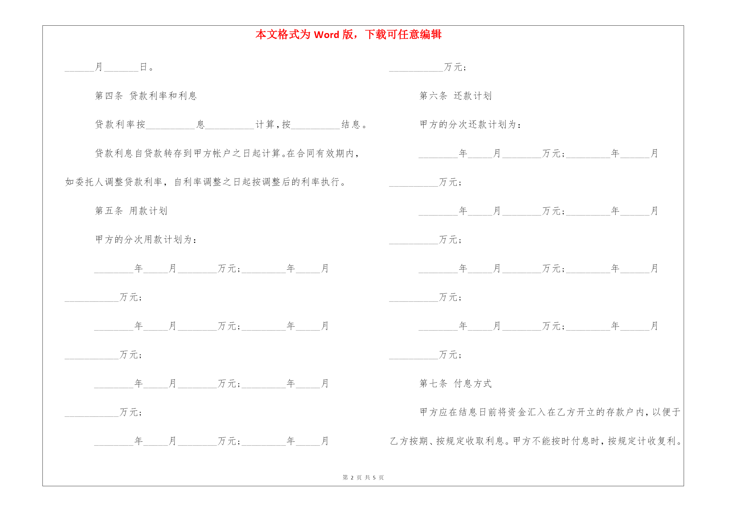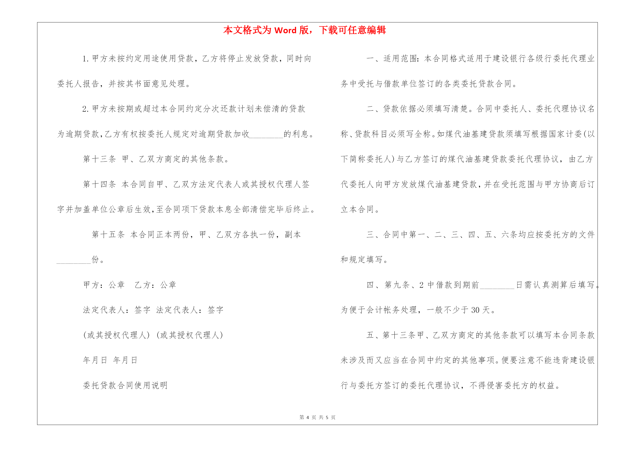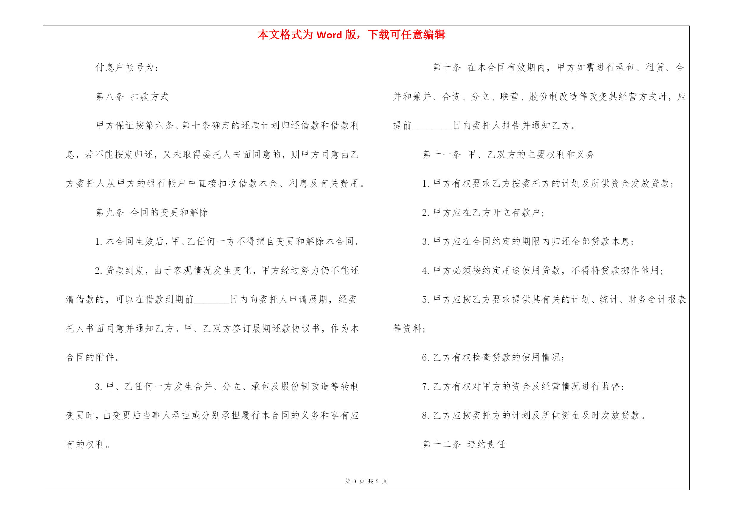 本文格式为Word版,下载可任意编辑第PAGE\*MERGEFORMAT5页共NUMPAGES\*MERGEFORMAT5页公司法人委托贷款合同范本每个新手都会从自己的教训中吸取经验,聪明人则从专业团队的帮助中获益!以下是由我编写整理的公司法人委托贷款合同范本,欢迎阅读。公司法人委托贷款合同贷款种类:合同编号:借款人:住所:电话:法定代表人:开户银行名称:开户帐号:传真:邮政编码:受托贷款人:住所:电话:法定代表人:传真:邮政编码:借款人(以下简称甲方):受托贷款人(以下简称乙方):_______________根据_______________(以下简称委托人)与乙方签订的_______________委托代理协议,由乙方代委托人向甲方发放__________贷款,并在受托范围与甲方协商后订立本合同。第一条借款金额甲方借款金额为人民币(大写)____________________。第二条借款用途甲方借款将用于____________________。第三条借款期限甲方借款期限自________年_____月_____日至________年______月_______日。第四条贷款利率和利息贷款利率按__________息__________计算,按__________结息。贷款利息自贷款转存到甲方帐户之日起计算。在合同有效期内,如委托人调整贷款利率,自利率调整之日起按调整后的利率执行。第五条用款计划甲方的分次用款计划为:________年_____月________万元;_________年_____月___________万元;________年_____月________万元;_________年_____月___________万元;________年_____月________万元;_________年_____月___________万元;________年_____月________万元;_________年_____月___________万元;第六条还款计划甲方的分次还款计划为:________年_____月________万元;_________年______月__________万元;________年_____月________万元;_________年______月__________万元;________年_____月________万元;_________年______月__________万元;________年_____月________万元;_________年______月__________万元;第七条付息方式甲方应在结息日前将资金汇入在乙方开立的存款户内,以便于乙方按期、按规定收取利息。甲方不能按时付息时,按规定计收复利。付息户帐号为:第八条扣款方式甲方保证按第六条、第七条确定的还款计划归还借款和借款利息,若不能按期归还,又未取得委托人书面同意的,则甲方同意由乙方委托人从甲方的银行帐户中直接扣收借款本金、利息及有关费用。第九条合同的变更和解除1.本合同生效后,甲、乙任何一方不得擅自变更和解除本合同。2.贷款到期,由于客观情况发生变化,甲方经过努力仍不能还清借款的,可以在借款到期前_______日内向委托人申请展期,经委托人书面同意并通知乙方。甲、乙双方签订展期还款协议书,作为本合同的附件。3.甲、乙任何一方发生合并、分立、承包及股份制改造等转制变更时,由变更后当事人承担或分别承担履行本合同的义务和享有应有的权利。第十条在本合同有效期内,甲方如需进行承包、租赁、合并和兼并、合资、分立、联营、股份制改造等改变其经营方式时,应提前________日向委托人报告并通知乙方。第十一条甲、乙双方的主要权利和义务1.甲方有权要求乙方按委托方的计划及所供资金发放贷款;2.甲方应在乙方开立存款户;3.甲方应在合同约定的期限内归还全部贷款本息;4.甲方必须按约定用途使用贷款,不得将贷款挪作他用;5.甲方应按乙方要求提供其有关的计划、统计、财务会计报表等资料;6.乙方有权检查贷款的使用情况;7.乙方有权对甲方的资金及经营情况进行监督;8.乙方应按委托方的计划及所供资金及时发放贷款。第十二条违约责任1.甲方未按约定用途使用贷款,乙方将停止发放贷款,同时向委托人报告,并按其书面意见处理。2.甲方未按期或超过本合同约定分次还款计划未偿清的贷款为逾期贷款,乙方有权按委托人规定对逾期贷款加收________的利息。第十三条甲、乙双方商定的其他条款。第十四条本合同自甲、乙双方法定代表人或其授权代理人签字并加盖单位公章后生效,至合同项下贷款本息全部清偿完毕后终止。第十五条本合同正本两份,甲、乙双方各执一份,副本________份。甲方:公章乙方:公章法定代表人:签字法定代表人:签字(或其授权代理人)