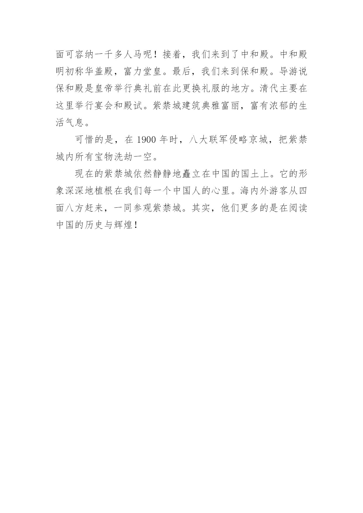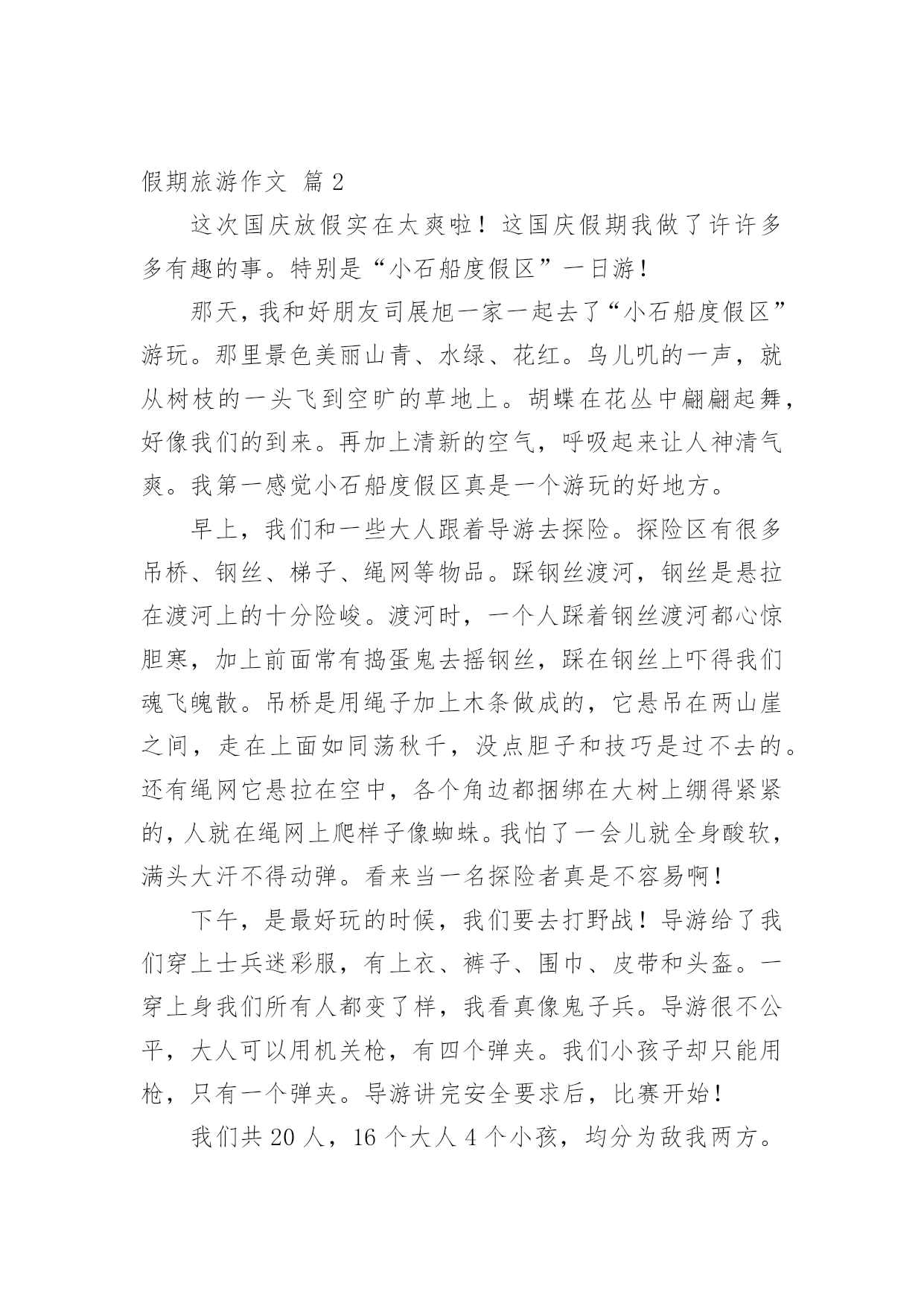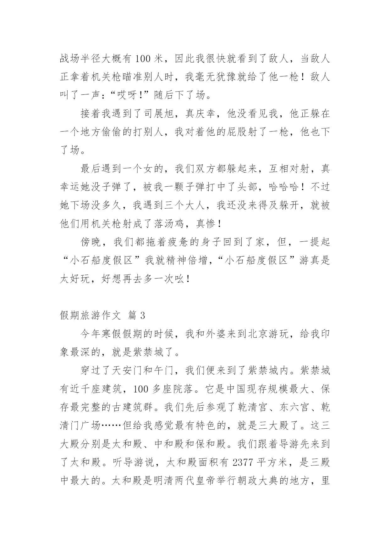 假期旅游作文假期旅游作文合集三篇在平日的学习、工作和生活里,大家都接触过作文吧,作文是一种言语活动,具有高度的综合性和创造性。一篇什么样的作文才能称之为优秀作文呢?以下是小编收集整理的假期旅游作文8篇,供大家参考借鉴,希望可以帮助到有需要的朋友。假期旅游作文篇1在山重水复的桂林令我知道了大自然的美丽,在山清水秀的普者黑令我知道了荷花的美丽,在白雪皑皑的丽江玉龙雪山令我流连忘返。有一个地方是我非常向往的,那就是高楼林立的北京,终于有一次暑假爸爸带我去北京游玩。记得有一次暑假我和爸爸去北京游玩。我们先坐飞机到昆明,再坐飞机到北京。到了那里后,首先印入眼前的是一眼望不到边的飞机场。接着我们坐着导游的车来到了一个酒店住了一天,第二天我们坐着导游的车来到了崇山峻岭的'万里长城,听爸爸说不到长城非好汉。听了爸爸的话,我更是太想登长城了。我们登完长城就来到天安门,听导游说北京天天有玩的,去了天安门后又去景山公园和北海公园……幸福时光就这样过去了,五天的旅游就在北京结束了。我们恋恋不舍的离开了北京。这件事虽然过去了很久,但是在那里的点点滴滴却让我永远不会忘记。假期旅游作文篇2这次国庆放假实在太爽啦!这国庆假期我做了许许多多有趣的事。特别是“小石船度假区”一日游!那天,我和好朋友司展旭一家一起去了“小石船度假区”游玩。那里景色美丽山青、水绿、花红。鸟儿叽的一声,就从树枝的一头飞到空旷的草地上。胡蝶在花丛中翩翩起舞,好像我们的到来。再加上清新的空气,呼吸起来让人神清气爽。我第一感觉小石船度假区真是一个游玩的好地方。早上,我们和一些大人跟着导游去探险。探险区有很多吊桥、钢丝、梯子、绳网等物品。踩钢丝渡河,钢丝是悬拉在渡河上的十分险峻。渡河时,一个人踩着钢丝渡河都心惊胆寒,加上前面常有捣蛋鬼去摇钢丝,踩在钢丝上吓得我们魂飞魄散。吊桥是用绳子加上木条做成的,它悬吊在两山崖之间,走在上面如同荡秋千,没点胆子和技巧是过不去的。还有绳网它悬拉在空中,各个角边都捆绑在大树上绷得紧紧的,人就在绳网上爬样子像蜘蛛。我怕了一会儿就全身酸软,满头大汗不得动弹。看来当一名探险者真是不容易啊!下午,是最好玩的时候,我们要去打野战!导游给了我们穿上士兵迷彩服,有上衣、裤子、围巾、皮带和头盔。一穿上身我们所有人都变了样,我看真像鬼子兵。导游很不公平,大人可以用机关枪,有四个弹夹。我们小孩子却只能用枪,只有一个弹夹。导游讲完安全要求后,比赛开始!我们共20人,16个大人4个小孩,均分为敌我两方。战场半径大概有100米,因此我很快就看到了敌人,当敌人正拿着机关枪瞄准别人时,我毫无犹豫就给了他一枪!敌人叫了一声:“哎呀!”随后下了场。接着我遇到了司展旭,真庆幸,他没看见我,他正躲在一个地方偷偷的打别人,我对着他的屁股射了一枪,他也下了场。最后遇到一个女的,我们双方都躲起来,互相对射,真幸运她没子弹了,被我一颗子弹打中了头部,哈哈哈!不过她下场没多久,我遇到三个大人,我还没来得及躲开,就被他们用机关枪射成了落汤鸡,真惨!傍晚,我们都拖着疲惫的身子回到了家,但,一提起“小石船度假区”我就精神倍增,“小石船度假区”游真是太好玩,好想再去多一次吆!假期旅游作文篇3今年寒假假期的时候,我和外婆来到北京游玩,给我印象最深的,就是紫禁城了。穿过了天安门和午门,我们便来到了紫禁城内。紫禁城有近千座建筑,100多座院落。它是中国现存规模最大、保存最完整的古建筑群。我们先后参观了乾清宫、东六宫、乾清门广场……但给我感觉最有特色的,就是三大殿了。这三大殿分别是太和殿、中和殿和保和殿。我们跟着导游先来到了太和殿。听导游说,太和殿面积有2377平方米,是三殿中最大的。太和殿是明清两代皇帝举行朝政大典的地方,里面可容纳一千多人马呢!接着,我们来到了中和殿。中和殿明初称华盖殿,富力堂皇。最后,我们来到保和殿。导游说保和殿是皇帝举行典礼前在此更换礼服的地方。清代主要在这里举行宴会和殿试。紫禁城建筑典雅富丽,富有浓郁的生活气息。可惜的是,在1900年时,八大联军侵略京城,把紫禁城内所有宝物洗劫一空。现在的紫禁城依然静静地矗立在中国的国土上。它的形象深深地植根在我们每一个中国人的心里。海内外游客从四面八方赶来,一同参观紫禁城。其实,他们更多的是在阅读中国的历史与辉煌!