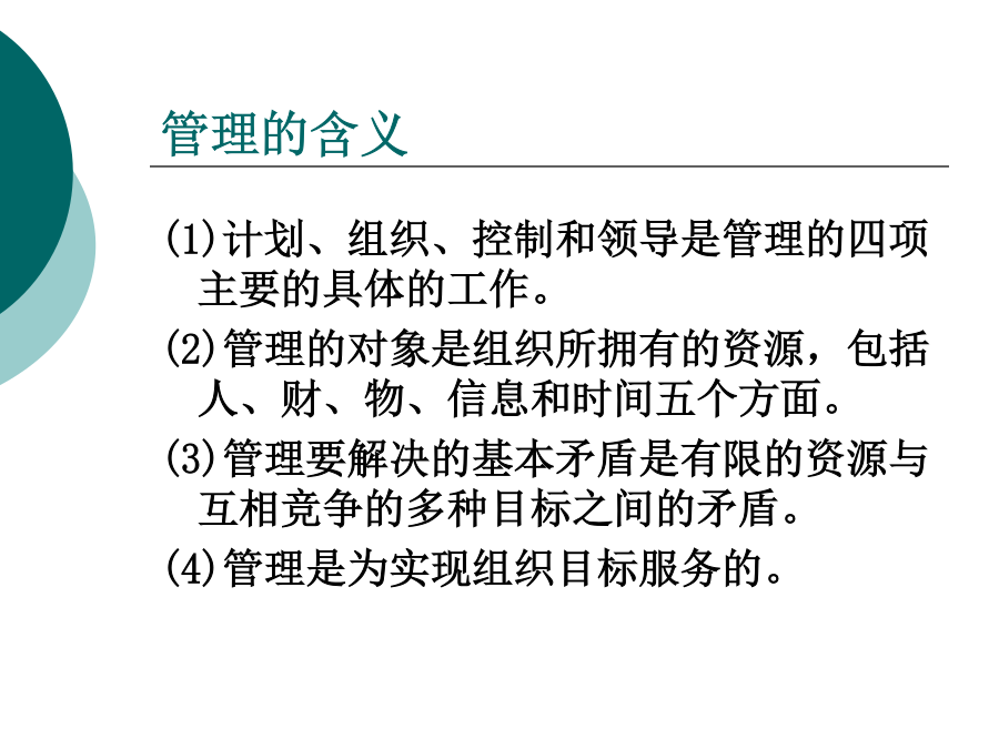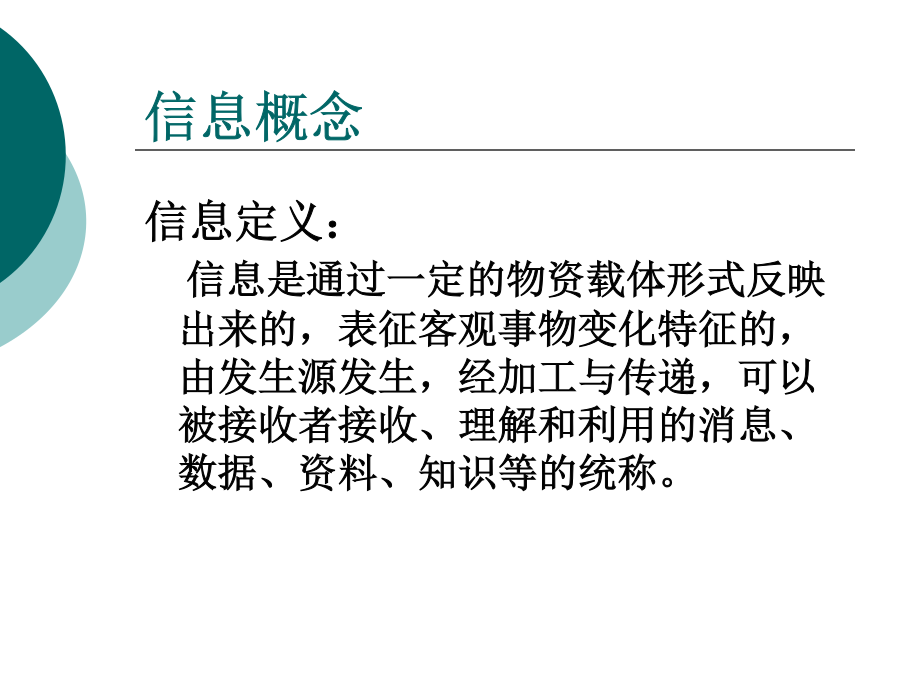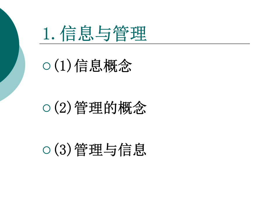 第一章概述1.信息与管理信息概念信息特征信息构成通信过程示意图信息构成要素(1)信源(2)编码和译码(3)信道(4)信宿管理的概念管理的含义管理职能(2)组织“组织”一词具有双重的含义:一是名词意义上的组织,主要指组织形态;二是动词意义上的组织,即指组织工作。组织职能的主要内容包括组织的统计、人员配备、组织的规划与变动、授权等等。(3)领导领导是指激励、引导和影响个人或组织,在一定条件下,实现组织目标的行动过程。(4)控制控制就是将计划的执行情况和计划的要求、目标相对照,然后采取措施纠正计划执行中的偏差,以确保计划目标的实现。企业要素及其管理层次企业的管理一般分为三个层次或三个级别,即高层管理,也称战略管理;中层管理,也称战术管理;基层管理,也称事务管理。这三个管理层次的任务和目标是不同的。如图所示。管理与信息管理的信息需求2.信息技术与信息管理信息技术概念信息技术特征信息技术体系结构微电子技术光子技术与光电子技术分子电子技术信息系统技术信息获取技术信息传输技术信息处理技术信息控制技术信息应用技术信息安全技术信息管理3.物流与物流信息管理物流的概念物流的效用物流的分类物流基本功能包装装卸搬运运输储存流通加工信息处理物流信息物流信息的作用物流信息的特点物流信息管理物流信息管理特点物流信息管理模式思考题