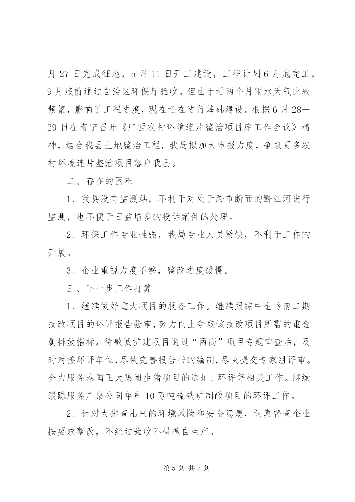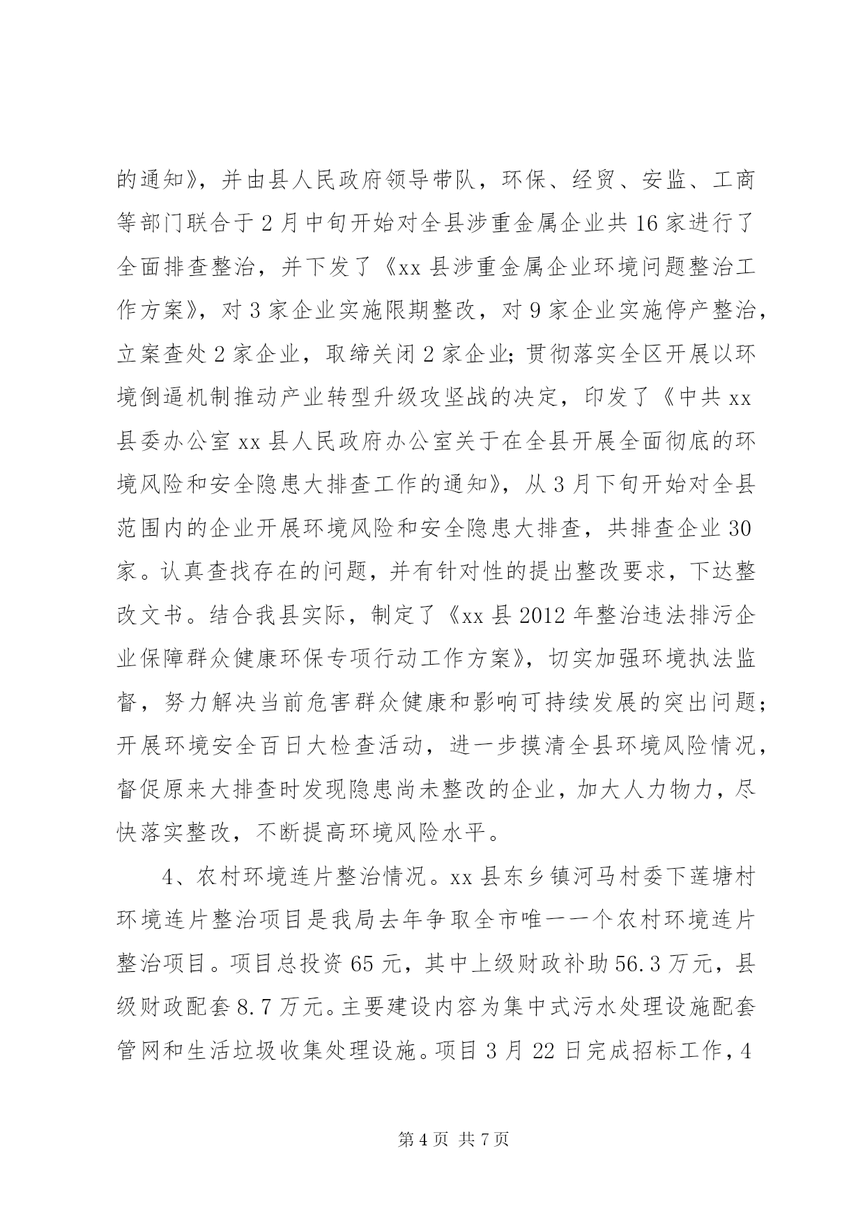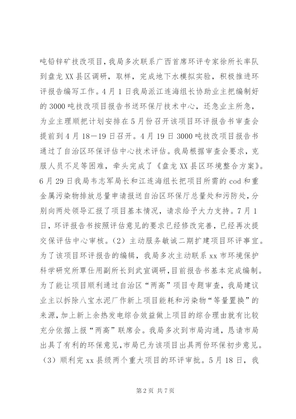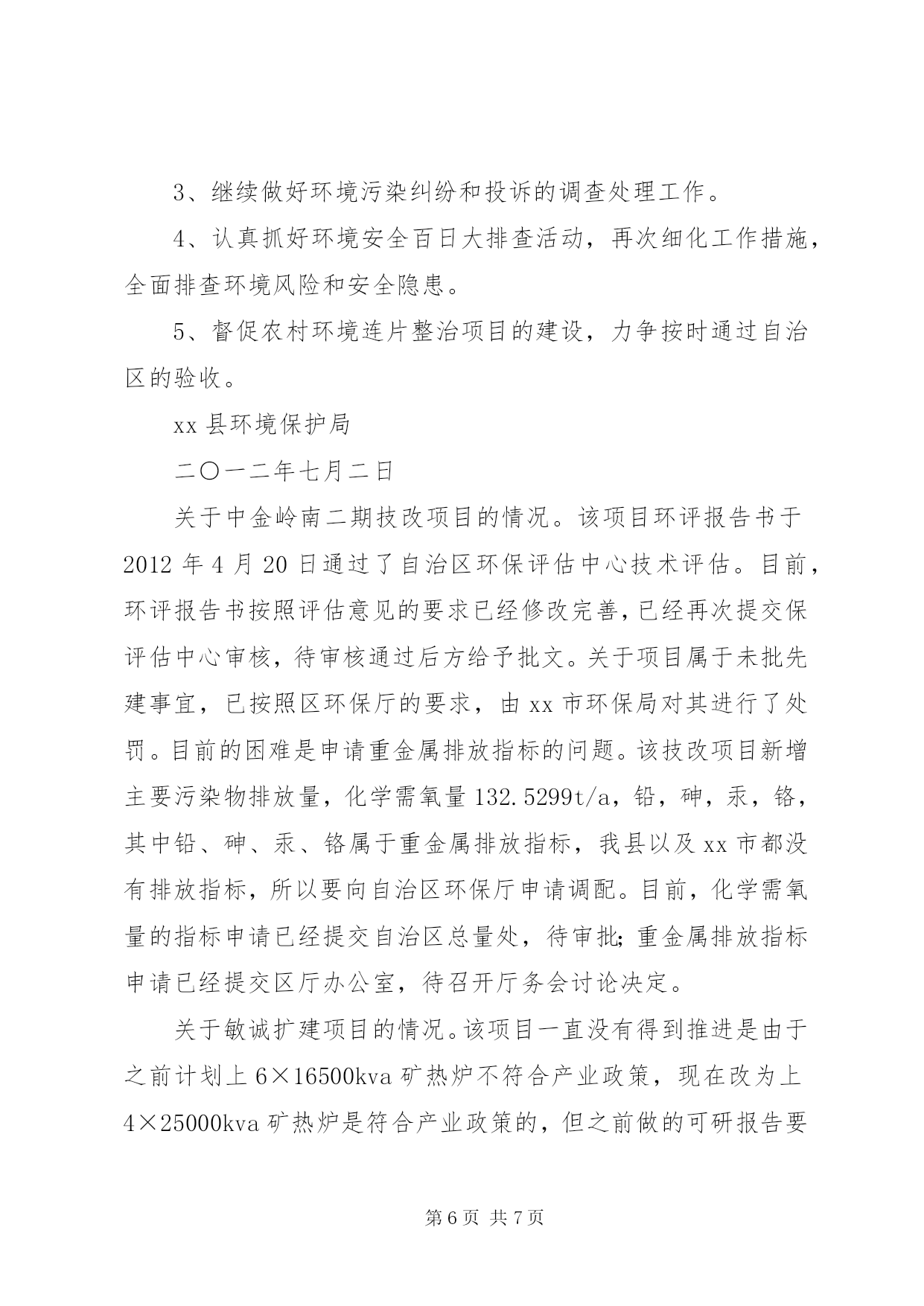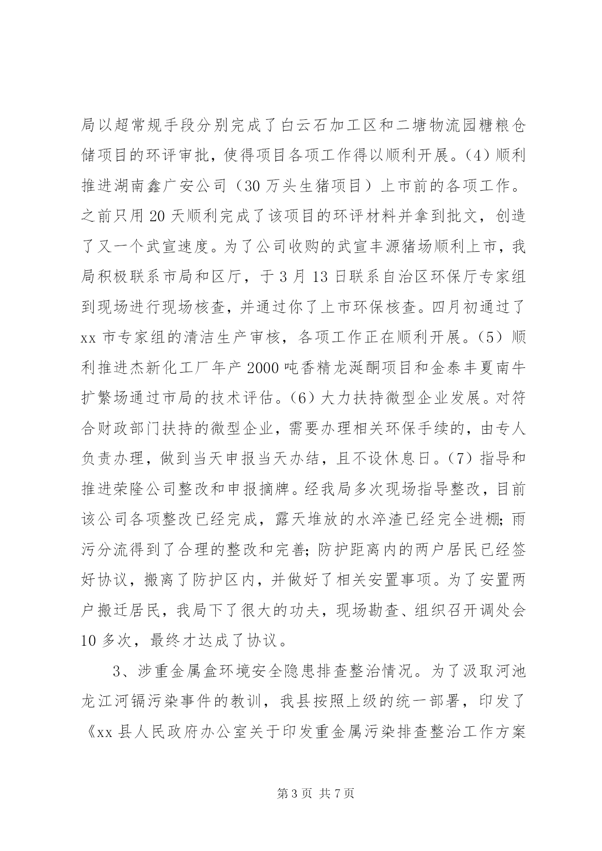 第PAGE\*Arabic\*MERGEFORMAT7页共NUMPAGES\*MERGEFORMAT7页县环保工作汇报材料今年以来,在县委、县府的正确领导和上级环保部门的指导下,我局全体干部职工砥砺奋进,认真按照“两年”活动的工作要求,学用政策、狠抓落实,各项工作得以顺利开展,现将上半年工作总结如下:一、环境保护主要工作开展情况1、主要污染物减排情况。3月23日我县召开了全县环保工作会,部署了20**年的环保工作。根据xx市人民政府下达给我县的主要污染物减排目标,及时制定了2012年主要污染物减排实施方案,确定了2012年我县主要污染物减排项目为思源酒业的酒精废液沼气项目、伟业淀粉厂废水生化处理项目、伟业淀粉厂和金黔湾食品公司的沼气替代燃煤减排项目,将减排任务分解到企业,推动减排工作层层落实。加大对减排设施和加派项目建设监管力度和现场督察力度,以确保减排任务的顺利完成。上半年对有环保设施的企业进行了现场检查56次,检查环保设施35台(套),正常运行35台(套),运行率100%。2、项目环评审批情况。强化环评监管与服务,促进经济转型。按国家产能结构调整要求、环境承载能力严把环评审批关,对重大项目建立绿色通道,加强项目跟踪服务及环保“三同时”管理,促进项目尽快实施、加快建设。(1)全力推进中金岭南二期技改环评工作。为了推进广西中金岭南矿业有限公司日选3000吨铅锌矿技改项目,我局多次联系广西首席环评专家徐所长率队到盘龙XX县区调研,取样,完成地下水模拟实验,积极推进环评报告编写工作。4月1日我局派江连海组长协助业主把编制好的3000吨技改项目报告书送环保厅技术中心,还急业主所急,为业主理顺把计划安排在5月份召开该项目环评报告书审查会提前到4月18-19日召开。4月19日3000吨技改项目报告书通过了自治区环保评估中心技术评估。我局根据审查会要求,克服人员不足等困难,牵头完成了《盘龙XX县区环境整合方案》。6月29日我局韦志军局长和江连海组长把项目所需的cod和重金属污染物排放总量申请报送自治区环保厅总量处和污防处,分别向两处领导汇报了项目基本情况,请求给予大力支持。7月1日,环评报告书按照评估意见的要求已经修改完善,已经再次提交保评估中心审核。(2)主动服务敏诚二期扩建项目环评事宜。为了该项目环评报告的编辑,我局多次主动联系xx市环境保护科学研究所覃仕用副所长到武宣调研,目前报告书基本完成编制。为了能让项目顺利通过自治区“两高”项目专题审查,我局建议业主以拆除八宝水泥厂作新上项目能耗和污染物“等量置换”的来源,加上新上余热发电综合效益做上项目的综合理由就有比较充分依据上报“两高”联席会。我局多次到市局沟通,恳请市局出具了有利的环保意见,市局已为该项目出具两份环保初步意见。(3)顺利完xx县级两个重大项目的环评审批。5月18日,我局以超常规手段分别完成了白云石加工区和二塘物流园糖粮仓储项目的环评审批,使得项目各项工作得以顺利开展。(4)顺利推进湖南鑫广安公司(30万头生猪项目)上市前的各项工作。之前只用20天顺利完成了该项目的环评材料并拿到批文,创造了又一个武宣速度。为了公司收购的武宣丰源猪场顺利上市,我局积极联系市局和区厅,于3月13日联系自治区环保厅专家组到现场进行现场核查,并通过你了上市环保核查。四月初通过了xx市专家组的清洁生产审核,各项工作正在顺利开展。(5)顺利推进杰新化工厂年产2000吨香精龙涎酮项目和金泰丰夏南牛扩繁场通过市局的技术评估。(6)大力扶持微型企业发展。对符合财政部门扶持的微型企业,需要办理相关环保手续的,由专人负责办理,做到当天申报当天办结,且不设休息日。(7)指导和推进荣隆公司整改和申报摘牌。经我局多次现场指导整改,目前该公司各项整改已经完成,露天堆放的水淬渣已经完全进棚;雨污分流得到了合理的整改和完善;防护距离内的两户居民已经签好协议,搬离了防护区内,并做好了相关安置事项。为了安置两户搬迁居民,我局下了很大的功夫,现场勘查、组织召开调处会10多次,最终才达成了协议。3、涉重金属盒环境安全隐患排查整治情况。为了汲取河池龙江河镉污染事件的教训,我县按照上级的统一部署,印发了《xx县人民政府办公室关于印发重金属污染排查整治工作方案的通知》,并由县人民政府领导带队,环保、经贸、安监、工商等部门联合于2月中旬开始对全县涉重金属企业共16家进行了全面排查整治,并下发了《xx县涉重金属企业环境问题整治工作方案》,对3家企业实施限期整改,对9家企业实施停产整治,立案查处2家企业,取缔关闭2家企业;贯彻落实全区开展以环境倒逼机制推动产业转型升级攻坚战的决定,印发了《中共xx县委办公室xx县人民政府办公室关于在全县开展全面彻底的环境风险和安全隐患大排查工作的通知》,从3月下旬开始对全县范围内的