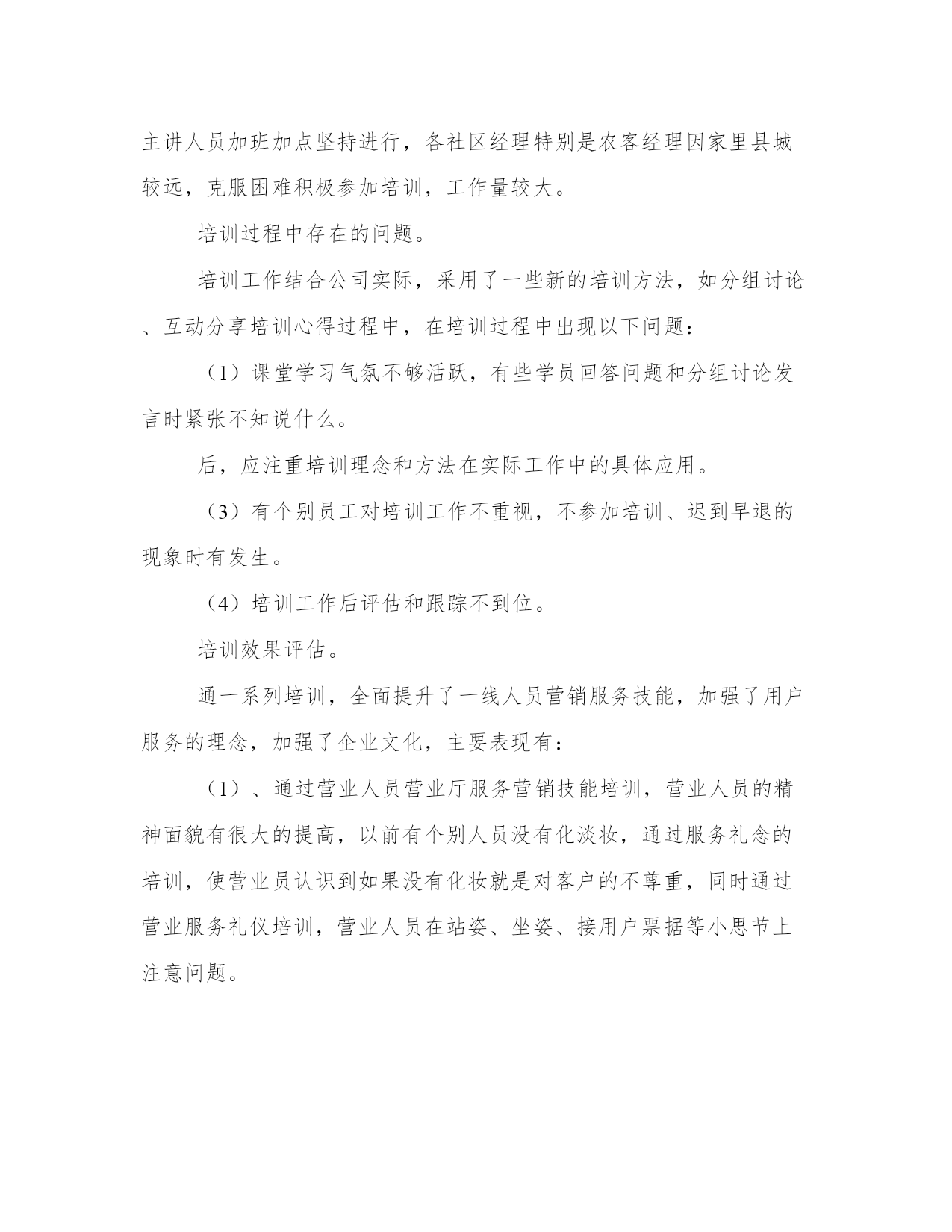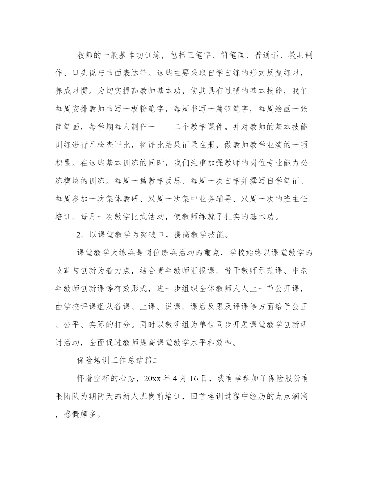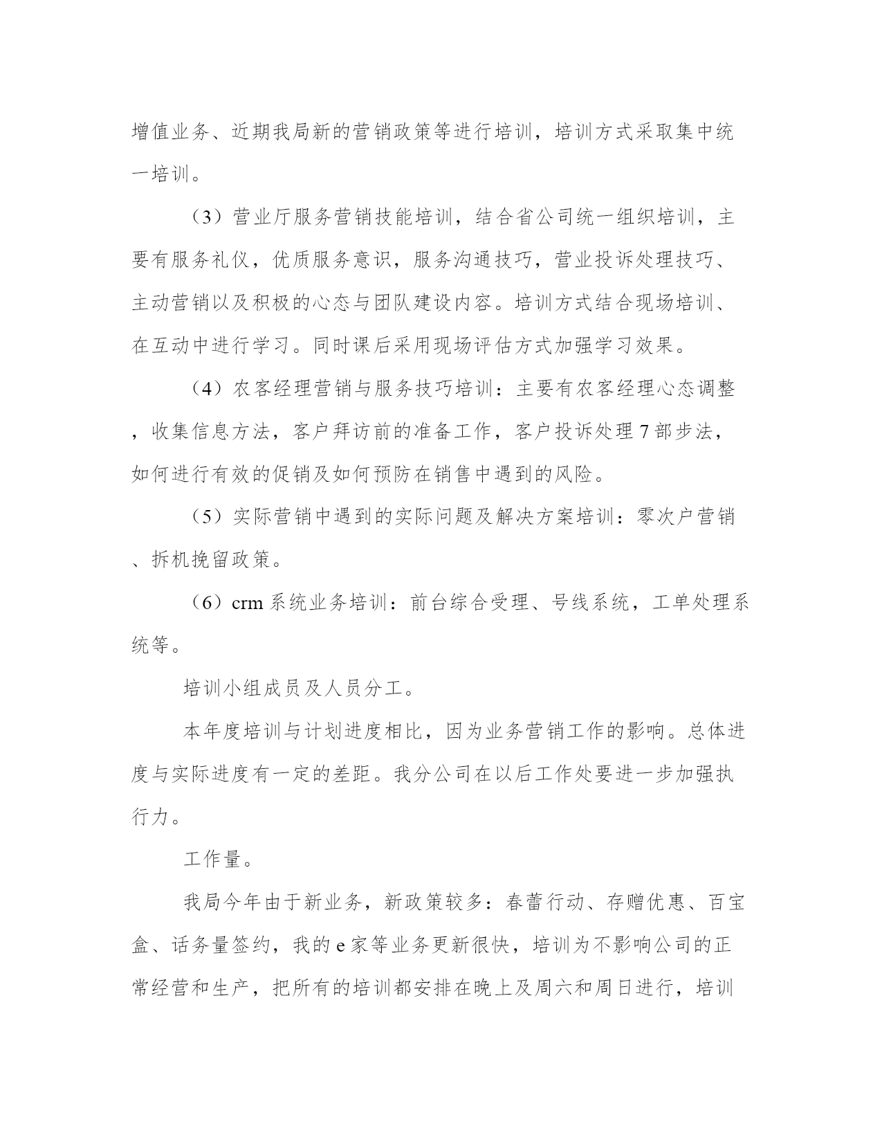 保险培训工作总结(实用20篇)总结是写给人看的,条理不清,人们就看不下去,即使看了也不知其所以然,这样就达不到总结的目的。怎样写总结才更能起到其作用呢?总结应该怎么写呢?下面是小编带来的优秀总结范文,希望大家能够喜欢!保险培训工作总结篇一内训计划,分班次集中授课和现场交流相结合。取得了良好的培训效果。同时组织社区经理,客户经理及营业一线人员进行案例征集活动。上交营销服务案例。最后我公司制定了培训效果评估考核,发放课后培训试题答卷,员工培训调查表及培训考核登记表。培训对象及培训内容。主要培训内容严格按照市公司下发通知精神,同时结合杨凌实际情况组织如下:(1)基础业务及流程(含宽带业务基础知识、最新资费、疑难解答),因我局宽带维护设立专门的数据维护,宽带安装知识不没有在本次培训组织范围内。共计培训课时。(2)新业务培训:因我局市场部设立有固话产品经理、数据产品经理、和小灵通产品经理,针对不同的业务,组织产品经理及内训师共同进行培训,主要对固网彩铃、商务彩铃、一呼双响、农家乐等增值业务、近期我局新的营销政策等进行培训,培训方式采取集中统一培训。(3)营业厅服务营销技能培训,结合省公司统一组织培训,主要有服务礼仪,优质服务意识,服务沟通技巧,营业投诉处理技巧、主动营销以及积极的心态与团队建设内容。培训方式结合现场培训、在互动中进行学习。同时课后采用现场评估方式加强学习效果。(4)农客经理营销与服务技巧培训:主要有农客经理心态调整,收集信息方法,客户拜访前的准备工作,客户投诉处理7部步法,如何进行有效的促销及如何预防在销售中遇到的风险。(5)实际营销中遇到的实际问题及解决方案培训:零次户营销、拆机挽留政策。(6)crm系统业务培训:前台综合受理、号线系统,工单处理系统等。培训小组成员及人员分工。本年度培训与计划进度相比,因为业务营销工作的影响。总体进度与实际进度有一定的差距。我分公司在以后工作处要进一步加强执行力。工作量。我局今年由于新业务,新政策较多:春蕾行动、存赠优惠、百宝盒、话务量签约,我的e家等业务更新很快,培训为不影响公司的正常经营和生产,把所有的培训都安排在晚上及周六和周日进行,培训主讲人员加班加点坚持进行,各社区经理特别是农客经理因家里县城较远,克服困难积极参加培训,工作量较大。培训过程中存在的问题。培训工作结合公司实际,采用了一些新的培训方法,如分组讨论、互动分享培训心得过程中,在培训过程中出现以下问题:(1)课堂学习气氛不够活跃,有些学员回答问题和分组讨论发言时紧张不知说什么。后,应注重培训理念和方法在实际工作中的具体应用。(3)有个别员工对培训工作不重视,不参加培训、迟到早退的现象时有发生。(4)培训工作后评估和跟踪不到位。培训效果评估。通一系列培训,全面提升了一线人员营销服务技能,加强了用户服务的理念,加强了企业文化,主要表现有:(1)、通过营业人员营业厅服务营销技能培训,营业人员的精神面貌有很大的提高,以前有个别人员没有化淡妆,通过服务礼念的培训,使营业员认识到如果没有化妆就是对客户的不尊重,同时通过营业服务礼仪培训,营业人员在站姿、坐姿、接用户票据等小思节上注意问题。另外在营业厅接待用户投诉处理方法上,通过培训也有很大改观,采用用户投诉处理七步法,把大部分用户的对电信服务及其它资费的不理解消灭在萌芽状态。(2)、社区经理(含农客经理)通过”农客经理营销与服务技巧“的培训学习后,首先明确了自己的职责,做为一个社区经理除了正常维护工作外,在营销上还应干什么?如信息收集、客户拜访、客户营销三部曲、投诉处理技巧、促销相关知识等方面有了初步的认识。(3)、强化学习型组的企业文化理念。一、突出重点,抓住主题,为岗位练兵提供保障。以提高教师专业能力为主线,以“构建有效课堂,提升实践能力”为主题,以学校为主体,以教研组、备课组为基本单位,开展基于岗位、基于课堂、基于问题、基于教师发展需求的学习与分析,全面深化校本研修,着力提高教师教书育人的能力,真抓实练,凸显大练兵的时效性,努力为新课程改革服务,为促进学生的全面发展服务,为办好人民满意的教育提供优质的师资保障。二、注重理论学习,加大工作力度,使岗位练兵稳中推进。1、依据文件精神制定本学年岗位练兵。依据xx区中小学岗位大练兵活动实施方案和xx区义务教育课程改革总结表彰暨教师岗位大练兵推进大会精神,结合我校实际情况形成教师岗位大练兵实施方案,制定我校教师岗位练兵。做到计划周密,安排得当。2、加强理论学习,领会精神实质。组织我校教师深入学习了王局长在岗位练兵工作布署会议上的讲话,杨局长在会议明确指出的十项基本功训练内容,重点学习xx区中小学岗位大练兵活动实施方案,布署本校教师岗位大练兵活动,领会精神实质,明确目标与