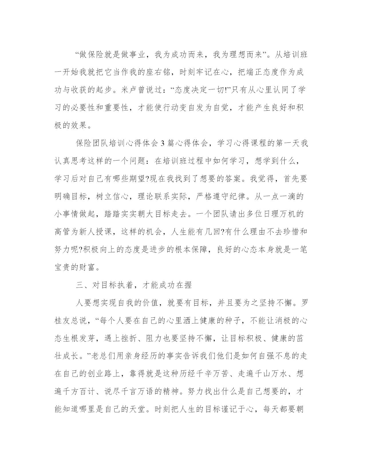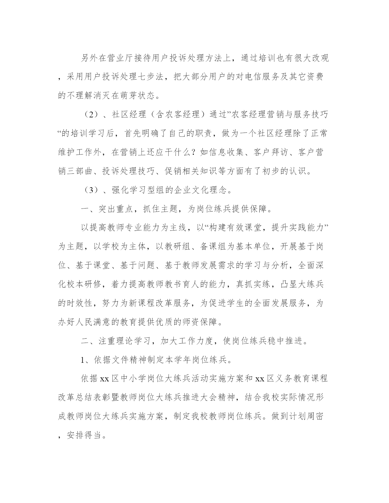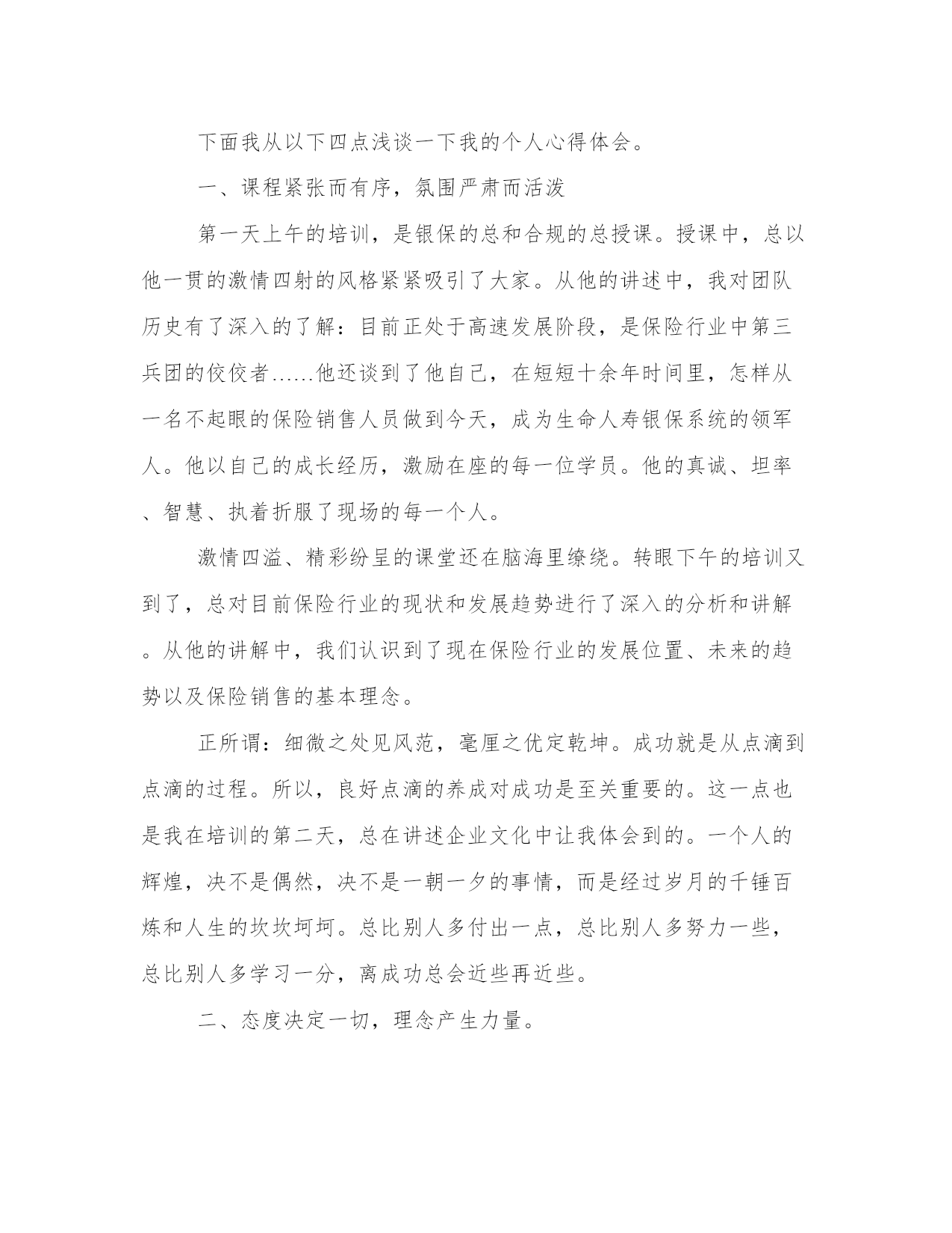保险培训工作总结(实用20篇)总结是写给人看的,条理不清,人们就看不下去,即使看了也不知其所以然,这样就达不到总结的目的。怎样写总结才更能起到其作用呢?总结应该怎么写呢?下面是小编带来的优秀总结范文,希望大家能够喜欢!保险培训工作总结篇一内训计划,分班次集中授课和现场交流相结合。取得了良好的培训效果。同时组织社区经理,客户经理及营业一线人员进行案例征集活动。上交营销服务案例。最后我公司制定了培训效果评估考核,发放课后培训试题答卷,员工培训调查表及培训考核登记表。培训对象及培训内容。主要培训内容严格按照市公司下发通知精神,同时结合杨凌实际情况组织如下:(1)基础业务及流程(含宽带业务基础知识、最新资费、疑难解答),因我局宽带维护设立专门的数据维护,宽带安装知识不没有在本次培训组织范围内。共计培训课时。(2)新业务培训:因我局市场部设立有固话产品经理、数据产品经理、和小灵通产品经理,针对不同的业务,组织产品经理及内训师共同进行培训,主要对固网彩铃、商务彩铃、一呼双响、农家乐等增值业务、近期我局新的营销政策等进行培训,培训方式采取集中统一培训。(3)营业厅服务营销技能培训,结合省公司统一组织培训,主要有服务礼仪,优质服务意识,服务沟通技巧,营业投诉处理技巧、主动营销以及积极的心态与团队建设内容。培训方式结合现场培训、在互动中进行学习。同时课后采用现场评估方式加强学习效果。(4)农客经理营销与服务技巧培训:主要有农客经理心态调整,收集信息方法,客户拜访前的准备工作,客户投诉处理7部步法,如何进行有效的促销及如何预防在销售中遇到的风险。(5)实际营销中遇到的实际问题及解决方案培训:零次户营销、拆机挽留政策。(6)crm系统业务培训:前台综合受理、号线系统,工单处理系统等。培训小组成员及人员分工。本年度培训与计划进度相比,因为业务营销工作的影响。总体进度与实际进度有一定的差距。我分公司在以后工作处要进一步加强执行力。工作量。我局今年由于新业务,新政策较多:春蕾行动、存赠优惠、百宝盒、话务量签约,我的e家等业务更新很快,培训为不影响公司的正常经营和生产,把所有的培训都安排在晚上及周六和周日进行,培训主讲人员加班加点坚持进行,各社区经理特别是农客经理因家里县城较远,克服困难积极参加培训,工作量较大。培训过程中存在的问题。培训工作结合公司实际,采用了一些新的培训方法,如分组讨论、互动分享培训心得过程中,在培训过程中出现以下问题:(1)课堂学习气氛不够活跃,有些学员回答问题和分组讨论发言时紧张不知说什么。后,应注重培训理念和方法在实际工作中的具体应用。(3)有个别员工对培训工作不重视,不参加培训、迟到早退的现象时有发生。(4)培训工作后评估和跟踪不到位。培训效果评估。通一系列培训,全面提升了一线人员营销服务技能,加强了用户服务的理念,加强了企业文化,主要表现有:(1)、通过营业人员营业厅服务营销技能培训,营业人员的精神面貌有很大的提高,以前有个别人员没有化淡妆,通过服务礼念的培训,使营业员认识到如果没有化妆就是对客户的不尊重,同时通过营业服务礼仪培训,营业人员在站姿、坐姿、接用户票据等小思节上注意问题。另外在营业厅接待用户投诉处理方法上,通过培训也有很大改观,采用用户投诉处理七步法,把大部分用户的对电信服务及其它资费的不理解消灭在萌芽状态。(2)、社区经理(含农客经理)通过”农客经理营销与服务技巧“的培训学习后,首先明确了自己的职责,做为一个社区经理除了正常维护工作外,在营销上还应干什么?如信息收集、客户拜访、客户营销三部曲、投诉处理技巧、促销相关知识等方面有了初步的认识。(3)、强化学习型组的企业文化理念。一、突出重点,抓住主题,为岗位练兵提供保障。以提高教师专业能力为主线,以“构建有效课堂,提升实践能力”为主题,以学校为主体,以教研组、备课组为基本单位,开展基于岗位、基于课堂、基于问题、基于教师发展需求的学习与分析,全面深化校本研修,着力提高教师教书育人的能力,真抓实练,凸显大练兵的时效性,努力为新课程改革服务,为促进学生的全面发展服务,为办好人民满意的教育提供优质的师资保障。二、注重理论学习,加大工作力度,使岗位练兵稳中推进。1、依据文件精神制定本学年岗位练兵。依据xx区中小学岗位大练兵活动实施方案和xx区义务教育课程改革总结表彰暨教师岗位大练兵推进大会精神,结合我校实际情况形成教师岗位大练兵实施方案,制定我校教师岗位练兵。做到计划周密,安排得当。2、加强理论学习,领会精神实质。组织我校教师深入学习了王局长在岗位练兵工作布署会议上的讲话,杨局长在会议明确指出的十项基本功训练内容,重点学习xx区中小学岗位大练兵活动实施方案,布署本校教师岗位大练兵活动,领会精神实质,明确目标与