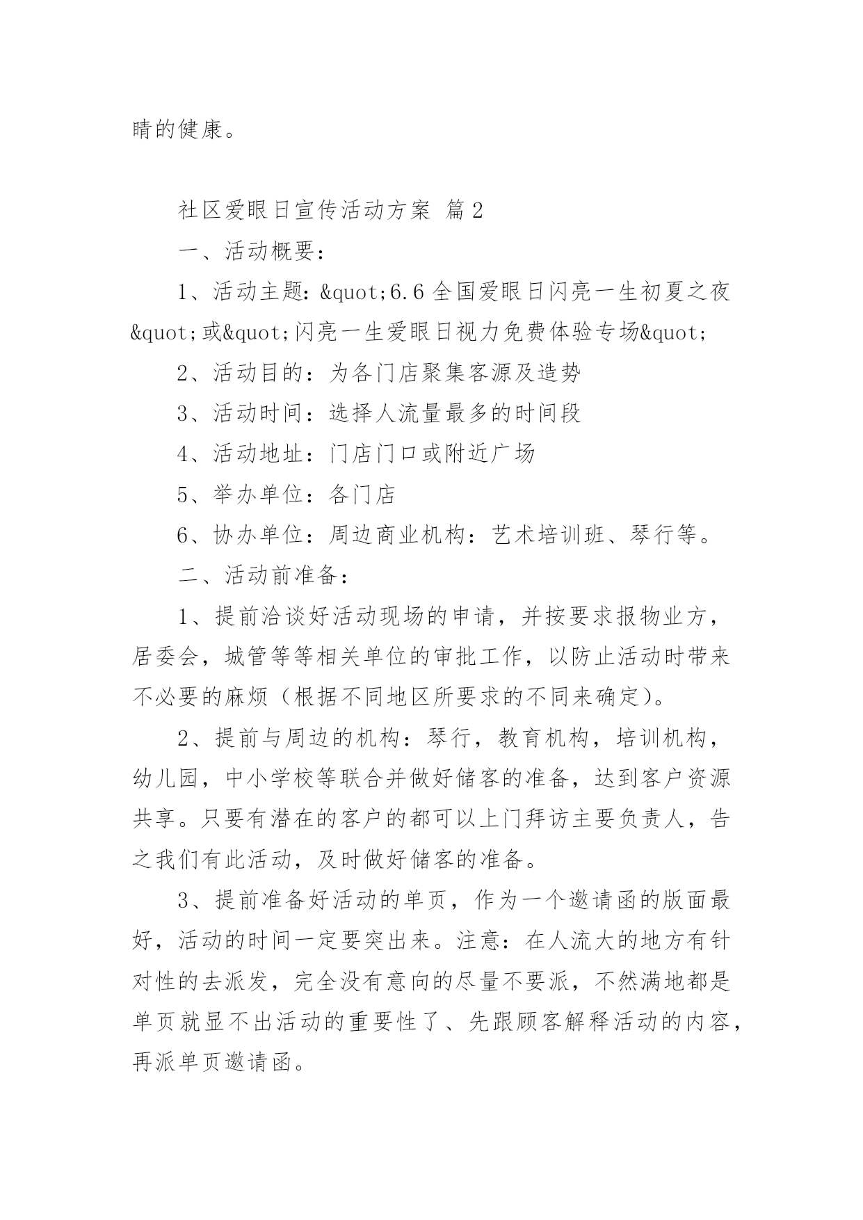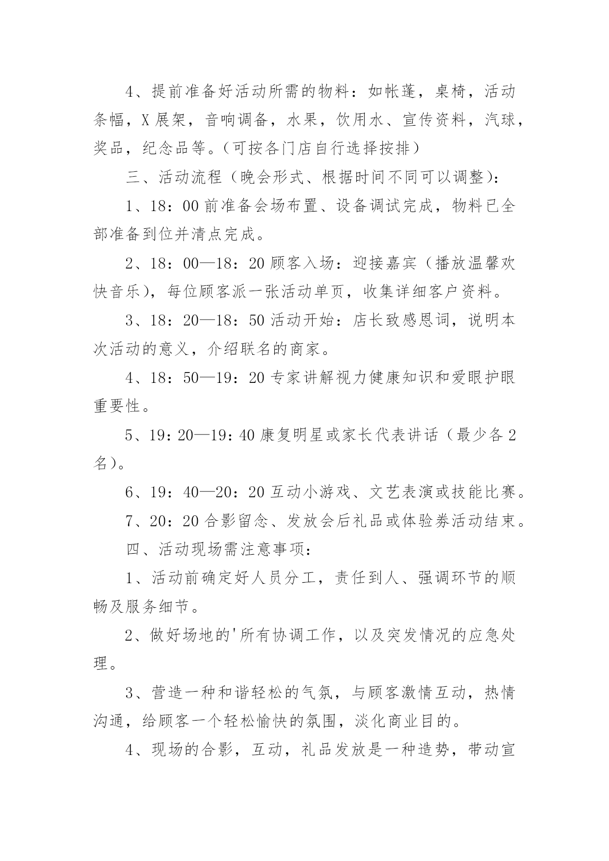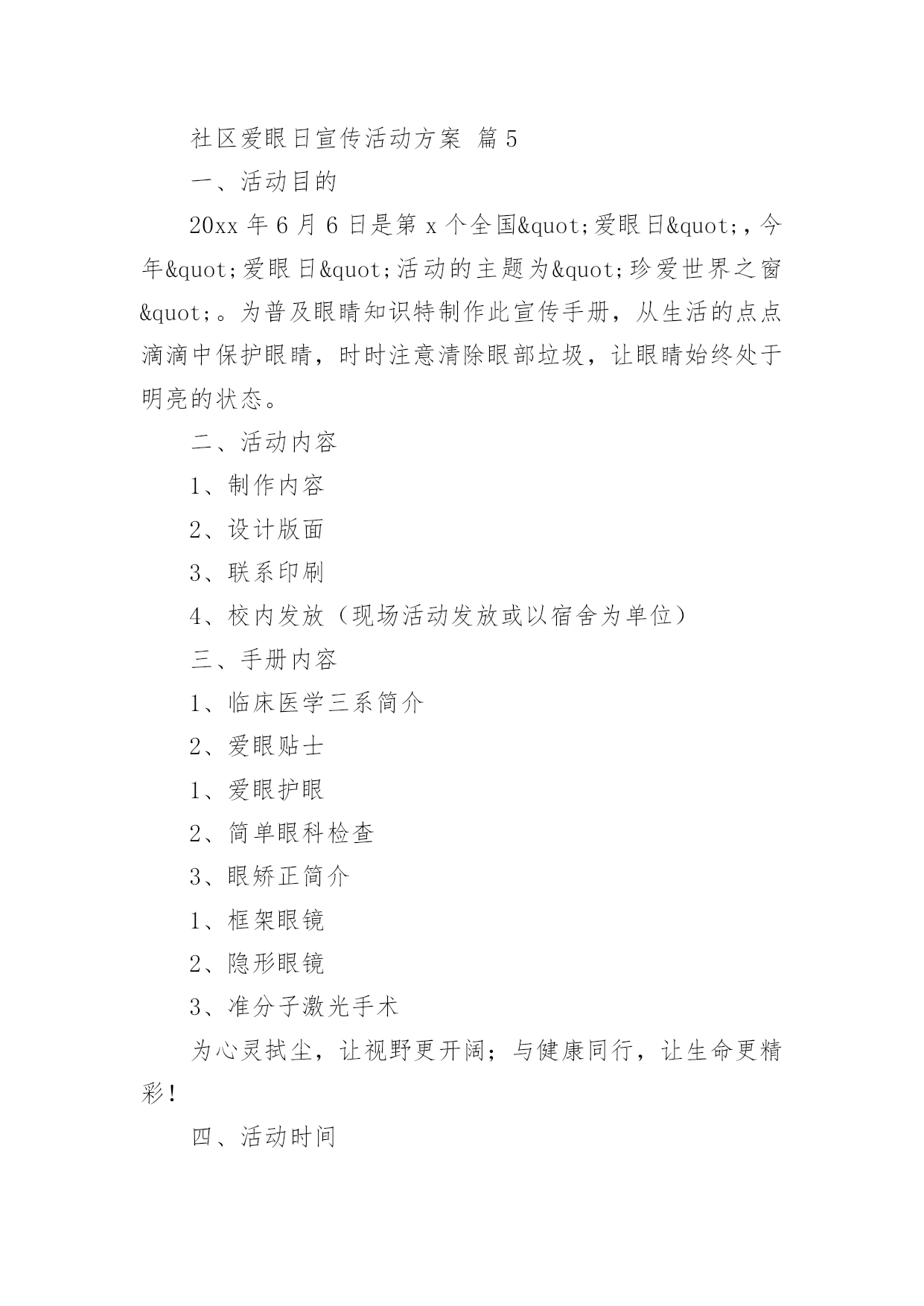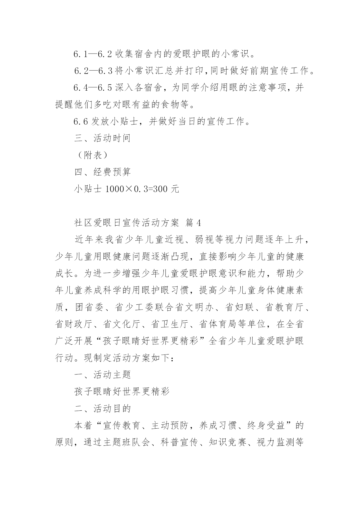 社区爱眼日宣传活动方案社区爱眼日宣传活动方案(精选9篇)方案是从目的、要求、方式、方法、进度等都部署具体、周密,并有很强可操作性的计划。下面是小编整理的社区爱眼日宣传活动方案,欢迎大家分享。社区爱眼日宣传活动方案篇120xx年6月6日是第xx个全国“爱眼日”,今年“爱眼日”活动的主题确定为“关爱青少年眼健康”。在爱眼日到来之际,学生的暑期生活也即将开始,这也让保护视力、关心青少年用眼健康的话题再次成为社会焦点。从爱眼日到整个暑假,是进行视力矫正的最佳时期,每年的爱眼日宣传活动也成为暑期促销的前奏。为了保护全体师生的用眼健康,特制定本方案:一、活动目的:为进一步提高我校师生的眼健康水平,预防青少年近视。二、活动时间:20xx年6月6日三、活动形式:1、以讲座的形式在学校进行宣传。2、联系附属医院眼科医生印发宣传单,详细介绍预防近视的方法。3、由班主任利用主题活动的形式宣传学生如何保护眼睛的健康。社区爱眼日宣传活动方案篇2一、活动概要:1、活动主题:"6.6全国爱眼日闪亮一生初夏之夜"或"闪亮一生爱眼日视力免费体验专场"2、活动目的:为各门店聚集客源及造势3、活动时间:选择人流量最多的时间段4、活动地址:门店门口或附近广场5、举办单位:各门店6、协办单位:周边商业机构:艺术培训班、琴行等。二、活动前准备:1、提前洽谈好活动现场的申请,并按要求报物业方,居委会,城管等等相关单位的审批工作,以防止活动时带来不必要的麻烦(根据不同地区所要求的不同来确定)。2、提前与周边的机构:琴行,教育机构,培训机构,幼儿园,中小学校等联合并做好储客的准备,达到客户资源共享。只要有潜在的客户的都可以上门拜访主要负责人,告之我们有此活动,及时做好储客的准备。3、提前准备好活动的单页,作为一个邀请函的版面最好,活动的时间一定要突出来。注意:在人流大的地方有针对性的去派发,完全没有意向的尽量不要派,不然满地都是单页就显不出活动的重要性了、先跟顾客解释活动的内容,再派单页邀请函。4、提前准备好活动所需的物料:如帐蓬,桌椅,活动条幅,X展架,音响调备,水果,饮用水、宣传资料,汽球,奖品,纪念品等。(可按各门店自行选择按排)三、活动流程(晚会形式、根据时间不同可以调整):1、18:00前准备会场布置、设备调试完成,物料已全部准备到位并清点完成。2、18:00—18:20顾客入场:迎接嘉宾(播放温馨欢快音乐),每位顾客派一张活动单页,收集详细客户资料。3、18:20—18:50活动开始:店长致感恩词,说明本次活动的意义,介绍联名的商家。4、18:50—19:20专家讲解视力健康知识和爱眼护眼重要性。5、19:20—19:40康复明星或家长代表讲话(最少各2名)。6、19:40—20:20互动小游戏、文艺表演或技能比赛。7、20:20合影留念、发放会后礼品或体验劵活动结束。四、活动现场需注意事项:1、活动前确定好人员分工,责任到人、强调环节的顺畅及服务细节。2、做好场地的'所有协调工作,以及突发情况的应急处理。3、营造一种和谐轻松的气氛,与顾客激情互动,热情沟通,给顾客一个轻松愉快的氛围,淡化商业目的。4、现场的合影,互动,礼品发放是一种造势,带动宣传和销售。5、要注意安全,时常提醒安全问题,关注现场的总体安全和对周边住户的影响。五、活动后需注意事项:1、活动结束以后,要做一个活动的总结,有哪方面好的和不足的一定要记下来,店面共同学习讨论,下次再搞活动的时候根据不同的店面市场情况就可以吸取经验做得更好。2、要把活动收集到的客户资料重新分类整理好,后期根据当时客户的情况进行跟踪回访。3、把活动中有宣传力的相片整理出来,在店面或店外展现出来,作为一个宣传亮点。4、做些持续升温的小活动,如《爱眼护眼小征文》,挑选出好的文章给予奖励。社区爱眼日宣传活动方案篇3一、活动目的爱眼,护眼,从身边做起,从小事做起。为进一步加强同学们在日常生活中的护眼知识,珍爱双眼,生活学习更加美好,特组织此次活动,加强同学们的爱眼知识。二、活动内容收集宿舍内爱眼护眼的小常识汇总并发放到各宿舍,有效的做好宿舍内的宣传工作。活动流程如下6.1—6.2收集宿舍内的爱眼护眼的小常识。6.2—6.3将小常识汇总并打印,同时做好前期宣传工作。6.4—6.5深入各宿舍,为同学介绍用眼的注意事项,并提醒他们多吃对眼有益的食物等。6.6发放小贴士,并做好当日的宣传工作。三、活动时间(附表)四、经费预算小贴士1000×0.3=300元社区爱眼日宣传活动方案篇4近年来我省少年儿童近视、弱视等视力问题逐年上升,少年儿童用眼健康问题逐渐凸现,直接影响少年儿童的健康成长。为进一步增强少年儿童爱眼护眼意识和能力,帮助少年儿童养成科学的用眼护眼习惯,提高少年儿童身体健康素质,团省委、省少