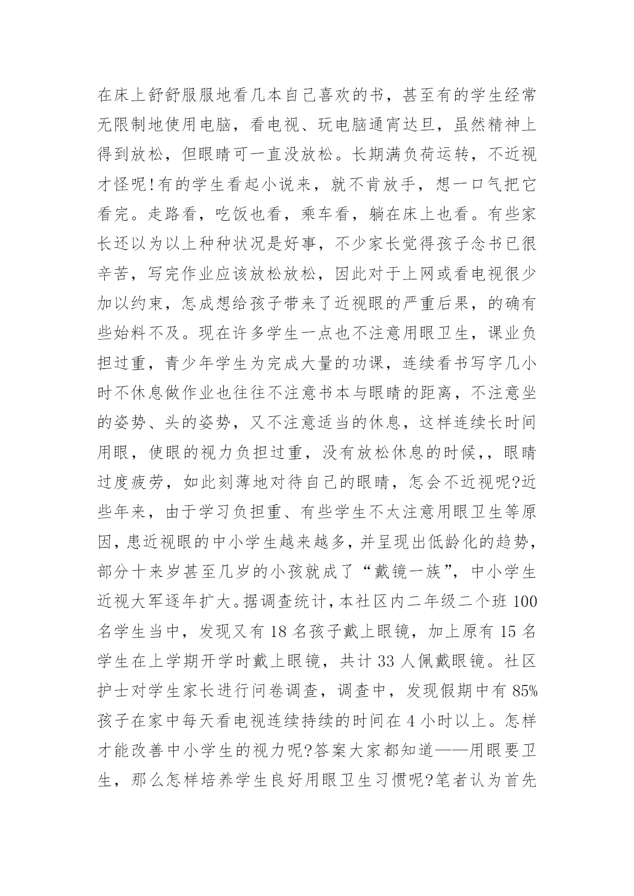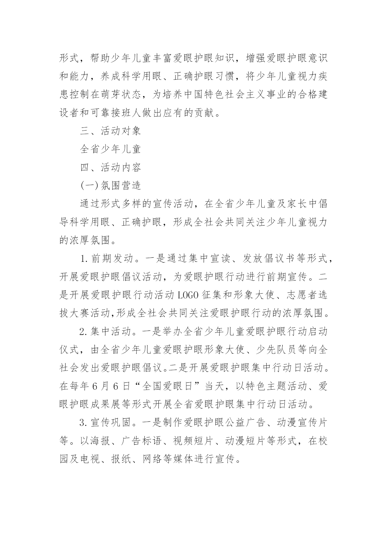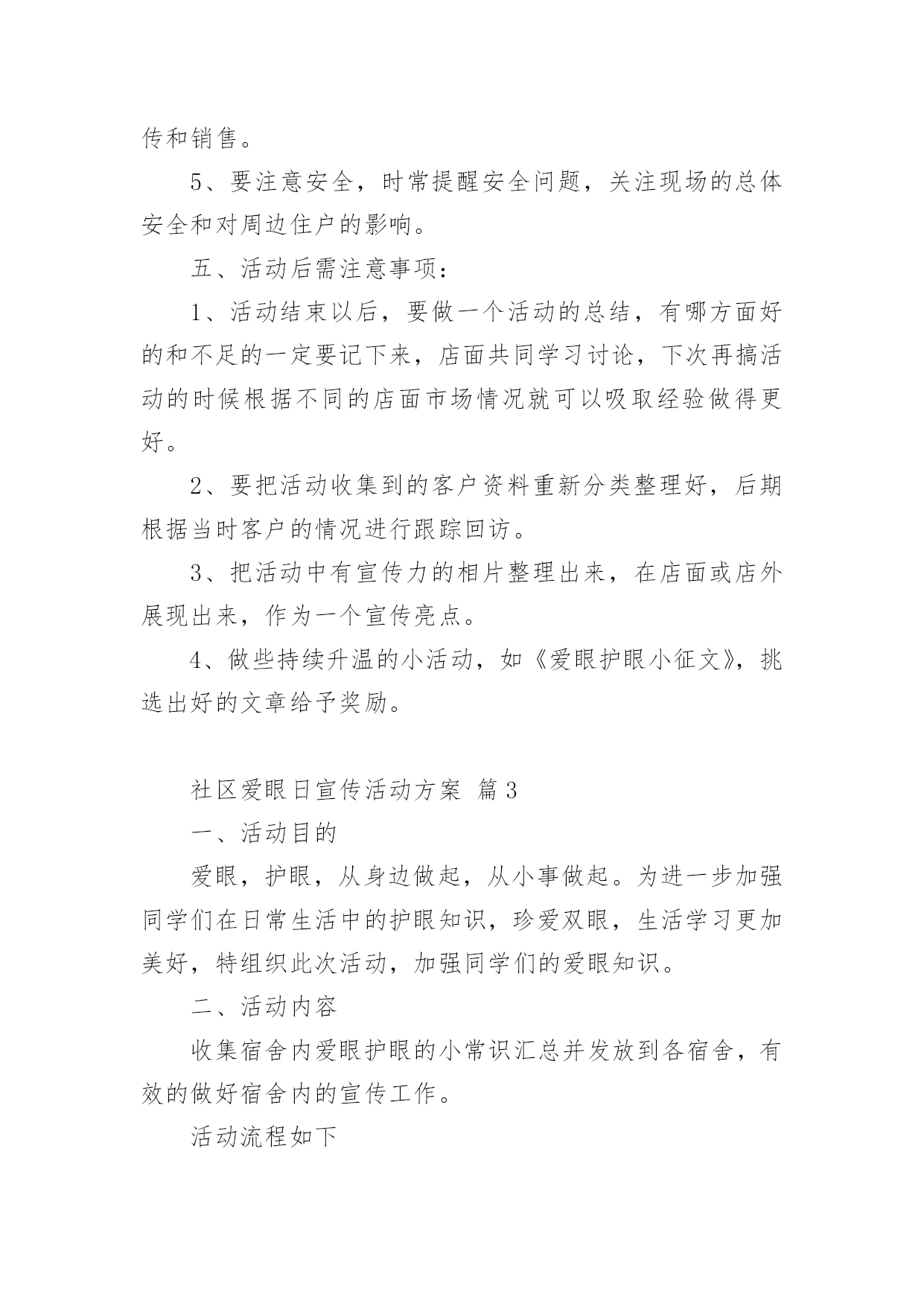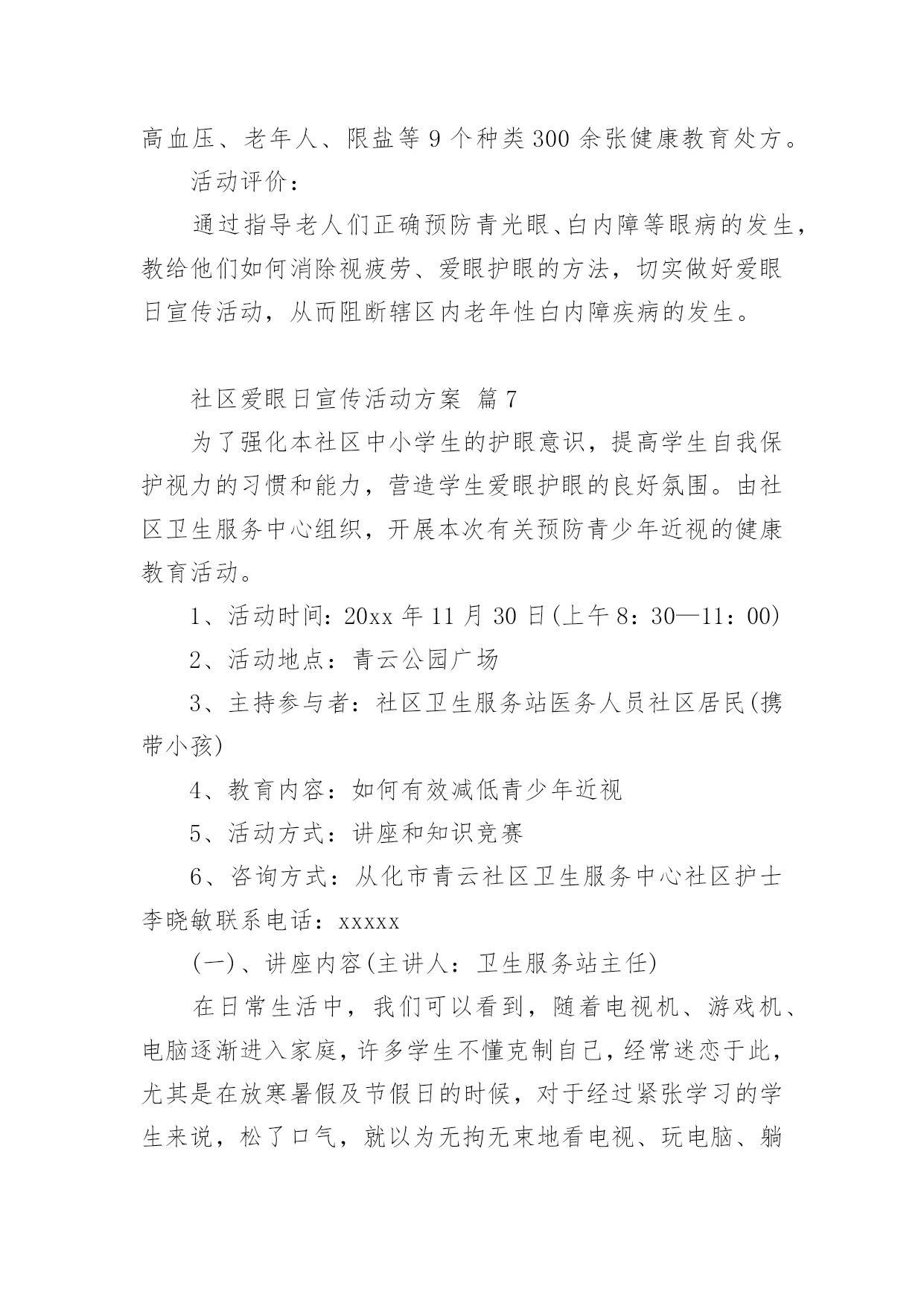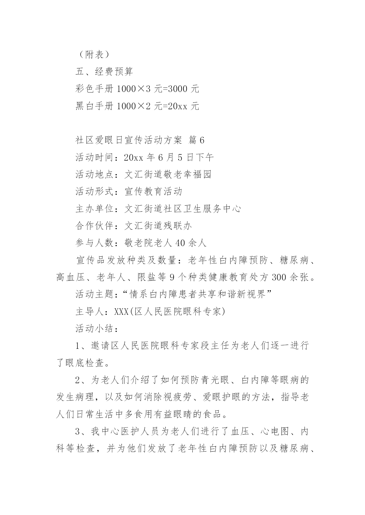社区爱眼日宣传活动方案社区爱眼日宣传活动方案(精选9篇)方案是从目的、要求、方式、方法、进度等都部署具体、周密,并有很强可操作性的计划。下面是小编整理的社区爱眼日宣传活动方案,欢迎大家分享。社区爱眼日宣传活动方案篇120xx年6月6日是第xx个全国“爱眼日”,今年“爱眼日”活动的主题确定为“关爱青少年眼健康”。在爱眼日到来之际,学生的暑期生活也即将开始,这也让保护视力、关心青少年用眼健康的话题再次成为社会焦点。从爱眼日到整个暑假,是进行视力矫正的最佳时期,每年的爱眼日宣传活动也成为暑期促销的前奏。为了保护全体师生的用眼健康,特制定本方案:一、活动目的:为进一步提高我校师生的眼健康水平,预防青少年近视。二、活动时间:20xx年6月6日三、活动形式:1、以讲座的形式在学校进行宣传。2、联系附属医院眼科医生印发宣传单,详细介绍预防近视的方法。3、由班主任利用主题活动的形式宣传学生如何保护眼睛的健康。社区爱眼日宣传活动方案篇2一、活动概要:1、活动主题:"6.6全国爱眼日闪亮一生初夏之夜"或"闪亮一生爱眼日视力免费体验专场"2、活动目的:为各门店聚集客源及造势3、活动时间:选择人流量最多的时间段4、活动地址:门店门口或附近广场5、举办单位:各门店6、协办单位:周边商业机构:艺术培训班、琴行等。二、活动前准备:1、提前洽谈好活动现场的申请,并按要求报物业方,居委会,城管等等相关单位的审批工作,以防止活动时带来不必要的麻烦(根据不同地区所要求的不同来确定)。2、提前与周边的机构:琴行,教育机构,培训机构,幼儿园,中小学校等联合并做好储客的准备,达到客户资源共享。只要有潜在的客户的都可以上门拜访主要负责人,告之我们有此活动,及时做好储客的准备。3、提前准备好活动的单页,作为一个邀请函的版面最好,活动的时间一定要突出来。注意:在人流大的地方有针对性的去派发,完全没有意向的尽量不要派,不然满地都是单页就显不出活动的重要性了、先跟顾客解释活动的内容,再派单页邀请函。4、提前准备好活动所需的物料:如帐蓬,桌椅,活动条幅,X展架,音响调备,水果,饮用水、宣传资料,汽球,奖品,纪念品等。(可按各门店自行选择按排)三、活动流程(晚会形式、根据时间不同可以调整):1、18:00前准备会场布置、设备调试完成,物料已全部准备到位并清点完成。2、18:00—18:20顾客入场:迎接嘉宾(播放温馨欢快音乐),每位顾客派一张活动单页,收集详细客户资料。3、18:20—18:50活动开始:店长致感恩词,说明本次活动的意义,介绍联名的商家。4、18:50—19:20专家讲解视力健康知识和爱眼护眼重要性。5、19:20—19:40康复明星或家长代表讲话(最少各2名)。6、19:40—20:20互动小游戏、文艺表演或技能比赛。7、20:20合影留念、发放会后礼品或体验劵活动结束。四、活动现场需注意事项:1、活动前确定好人员分工,责任到人、强调环节的顺畅及服务细节。2、做好场地的'所有协调工作,以及突发情况的应急处理。3、营造一种和谐轻松的气氛,与顾客激情互动,热情沟通,给顾客一个轻松愉快的氛围,淡化商业目的。4、现场的合影,互动,礼品发放是一种造势,带动宣传和销售。5、要注意安全,时常提醒安全问题,关注现场的总体安全和对周边住户的影响。五、活动后需注意事项:1、活动结束以后,要做一个活动的总结,有哪方面好的和不足的一定要记下来,店面共同学习讨论,下次再搞活动的时候根据不同的店面市场情况就可以吸取经验做得更好。2、要把活动收集到的客户资料重新分类整理好,后期根据当时客户的情况进行跟踪回访。3、把活动中有宣传力的相片整理出来,在店面或店外展现出来,作为一个宣传亮点。4、做些持续升温的小活动,如《爱眼护眼小征文》,挑选出好的文章给予奖励。社区爱眼日宣传活动方案篇3一、活动目的爱眼,护眼,从身边做起,从小事做起。为进一步加强同学们在日常生活中的护眼知识,珍爱双眼,生活学习更加美好,特组织此次活动,加强同学们的爱眼知识。二、活动内容收集宿舍内爱眼护眼的小常识汇总并发放到各宿舍,有效的做好宿舍内的宣传工作。活动流程如下6.1—6.2收集宿舍内的爱眼护眼的小常识。6.2—6.3将小常识汇总并打印,同时做好前期宣传工作。6.4—6.5深入各宿舍,为同学介绍用眼的注意事项,并提醒他们多吃对眼有益的食物等。6.6发放小贴士,并做好当日的宣传工作。三、活动时间(附表)四、经费预算小贴士1000×0.3=300元社区爱眼日宣传活动方案篇4近年来我省少年儿童近视、弱视等视力问题逐年上升,少年儿童用眼健康问题逐渐凸现,直接影响少年儿童的健康成长。为进一步增强少年儿童爱眼护眼意识和能力,帮助少年儿童养成科学的用眼护眼习惯,提高少年儿童身体健康素质,团省委、省少