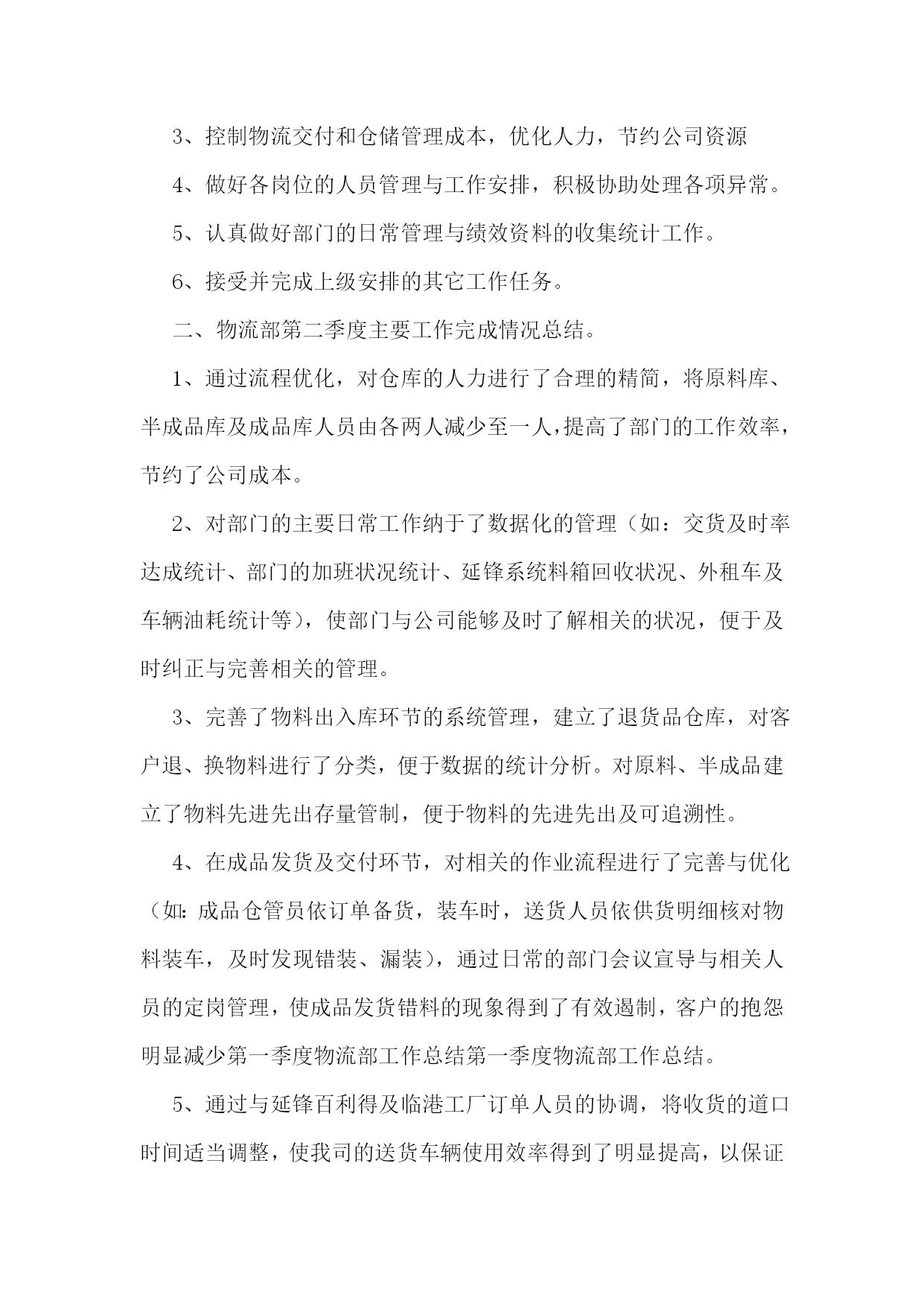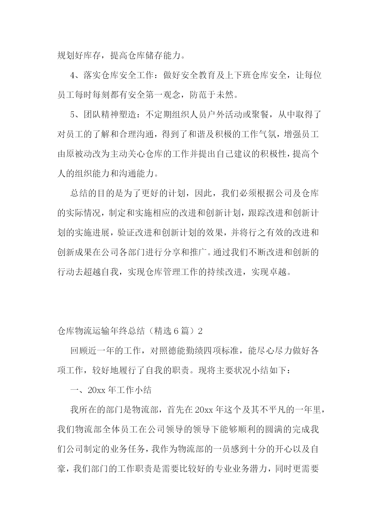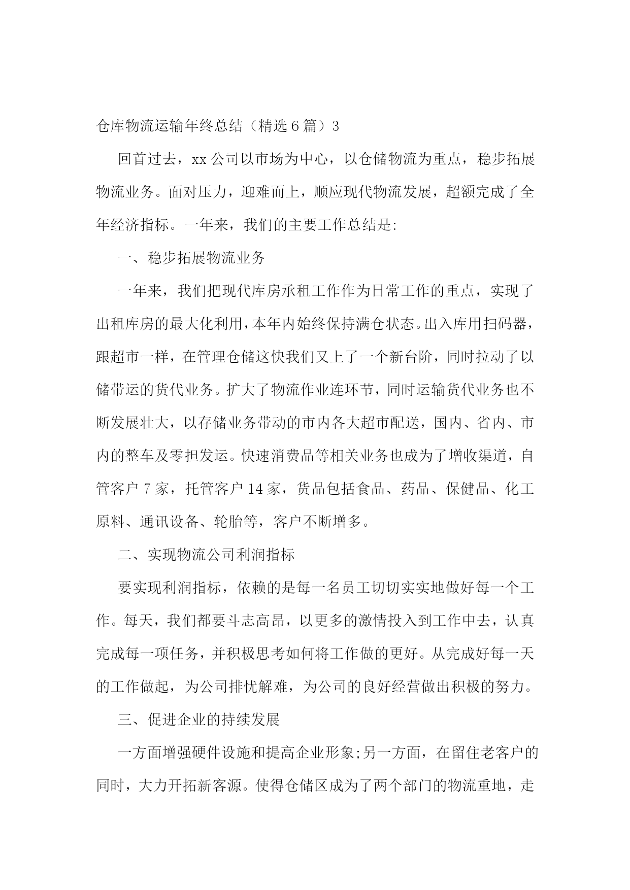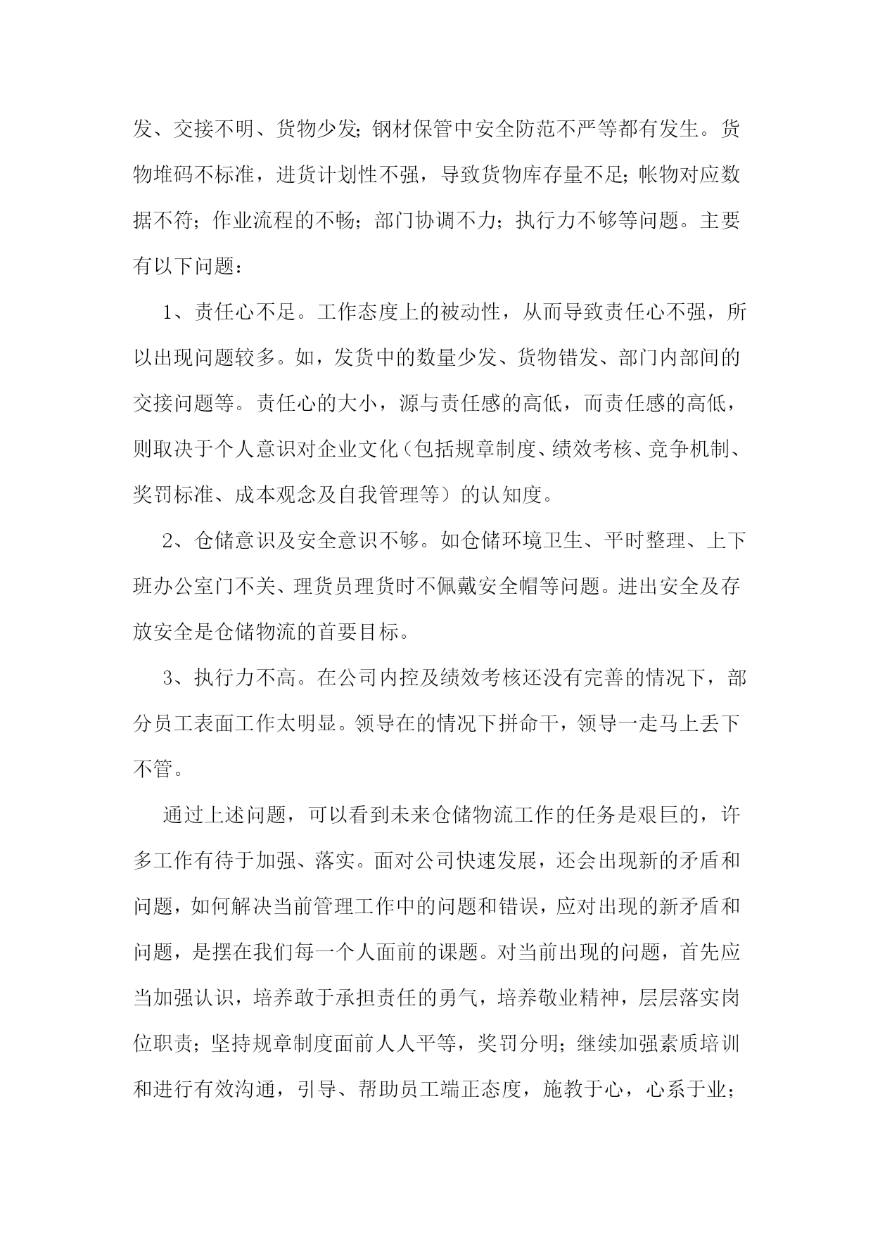 仓库物流运输年终总结仓库物流运输年终总结(精选6篇)1回顾20xx年的工作,在公司领导的带领下,在各部门同事的通力协作下,仓储物流中心经过了一年的努力,从人员的不稳定再到组织框架的重新修订,仓储物流中心克服了各种困难,有条不紊的完成了各项工作任务。现在总结如下:一、仓储物流中心20xx年度完成工作情况1、20xx年度仓储物流中心进钢材数量总共15万吨,出货数量为15万吨。其中工程物流部进货10万吨,出货10万吨。现货贸易部进货5万吨,出货5万吨。2、完成了仓储物流中心道路的全面硬化工作。为了能让钢材更好的堆放以及更好的保护,修建了钢材堆位。对钢材存货区进行了编码,使得更快、更准的找到钢材所放的位置。3、为了更好的规范仓库钢材的作业工作,仓储物流中心与海南荣程投资有限公司达成一致增添了两台大型龙门吊。使得装卸货效率逐渐提高。4、为了更好的协调货物进出规范。仓储物流中心与海南元力通运输服务有限公司达成合作,使得钢材从入库到出库不管效率还是人员安全等方面有了质的飞跃。二、20xx年仓储物流中心工作中遇到的问题仓储物流工作的进步是显著的,然而,也存在许多问题和不足。如接收货中的货物损坏及包装破损处理不及时;出库配送中的货物错发、交接不明、货物少发;钢材保管中安全防范不严等都有发生。货物堆码不标准,进货计划性不强,导致货物库存量不足;帐物对应数据不符;作业流程的不畅;部门协调不力;执行力不够等问题。主要有以下问题:1、责任心不足。工作态度上的被动性,从而导致责任心不强,所以出现问题较多。如,发货中的数量少发、货物错发、部门内部间的交接问题等。责任心的大小,源与责任感的高低,而责任感的高低,则取决于个人意识对企业文化(包括规章制度、绩效考核、竞争机制、奖罚标准、成本观念及自我管理等)的认知度。2、仓储意识及安全意识不够。如仓储环境卫生、平时整理、上下班办公室门不关、理货员理货时不佩戴安全帽等问题。进出安全及存放安全是仓储物流的首要目标。3、执行力不高。在公司内控及绩效考核还没有完善的情况下,部分员工表面工作太明显。领导在的情况下拼命干,领导一走马上丢下不管。通过上述问题,可以看到未来仓储物流工作的任务是艰巨的,许多工作有待于加强、落实。面对公司快速发展,还会出现新的矛盾和问题,如何解决当前管理工作中的问题和错误,应对出现的新矛盾和问题,是摆在我们每一个人面前的课题。对当前出现的问题,首先应当加强认识,培养敢于承担责任的勇气,培养敬业精神,层层落实岗位职责;坚持规章制度面前人人平等,奖罚分明;继续加强素质培训和进行有效沟通,引导、帮助员工端正态度,施教于心,心系于业;继续加强专业知识,产品知识,职业技能的学习培训,理论与实践相结合,避免工作失误及问题的出现,提高工作质量。然而所有学习、工作的重点,都取决于行动的落实,如何培养创新的落实意识,如何打造高效落实的团队,如何创建良好的执行文化,如何管理好时间促落实,如何为落实制定制度保障,并掌握有效落实的重要方法,这都要求我们要有坚持不懈的韧劲,要有坚定不移的意志,真正以实际行动,一步一个脚印去实践目标,实施计划,最终达到设定的目标和标准。三、20xx年工作计划1.20xx年度的工作内容、计划及重心针对以上提到的问题和薄弱环节,20xx年对仓库工作计划及重心主要围绕“完善及优化仓库作业流程提高工作效率、完善库存提高数据准确、加强部门之间沟通提高发货效率及品质要求、落实仓库安全工作、提高团队精神”等几个方面开展工作。2.工作开展思路1、完善及优化仓库作业流程提高工作效率:简化及优化工作流程,提高工作能力。2、完善库存提高数据准确:针对库存数据加强自盘工作,改善及完善盘点流程,避免因盘点人员所导致的问题,落实盘点所出现的问题,进一步完善账目及出入库管理从根源解决问题。3、加强部门之间沟通提高工作效率及品质:完善安全库存,提高发货能力及合理库存,加强与相关部门沟通,提前了解钢材到货明细,规划好库存,提高仓库储存能力。4、落实仓库安全工作:做好安全教育及上下班仓库安全,让每位员工每时每刻都有安全第一观念,防范于未然。5、团队精神塑造:不定期组织人员户外活动或聚餐,从中取得了对员工的了解和合理沟通,得到了和谐及积极的工作气氛,增强员工由原被动改为主动关心仓库的工作并提出自己建议的积极性,提高个人的组织能力和沟通能力。总结的目的是为了更好的计划,因此,我们必须根据公司及仓库的实际情况,制定和实施相应的改进和创新计划,跟踪改进和创新计划的实施进展,验证改进和创新计划的效果,并将行之有效的改进和创新成果在公司各部门进行分享和推广。通过我们不断改进和创新的行动去超越自我,实现仓库管理工作的持续改进,实现卓越。仓库物流运输年终总结(精选6篇)2回顾近一年的工作,对