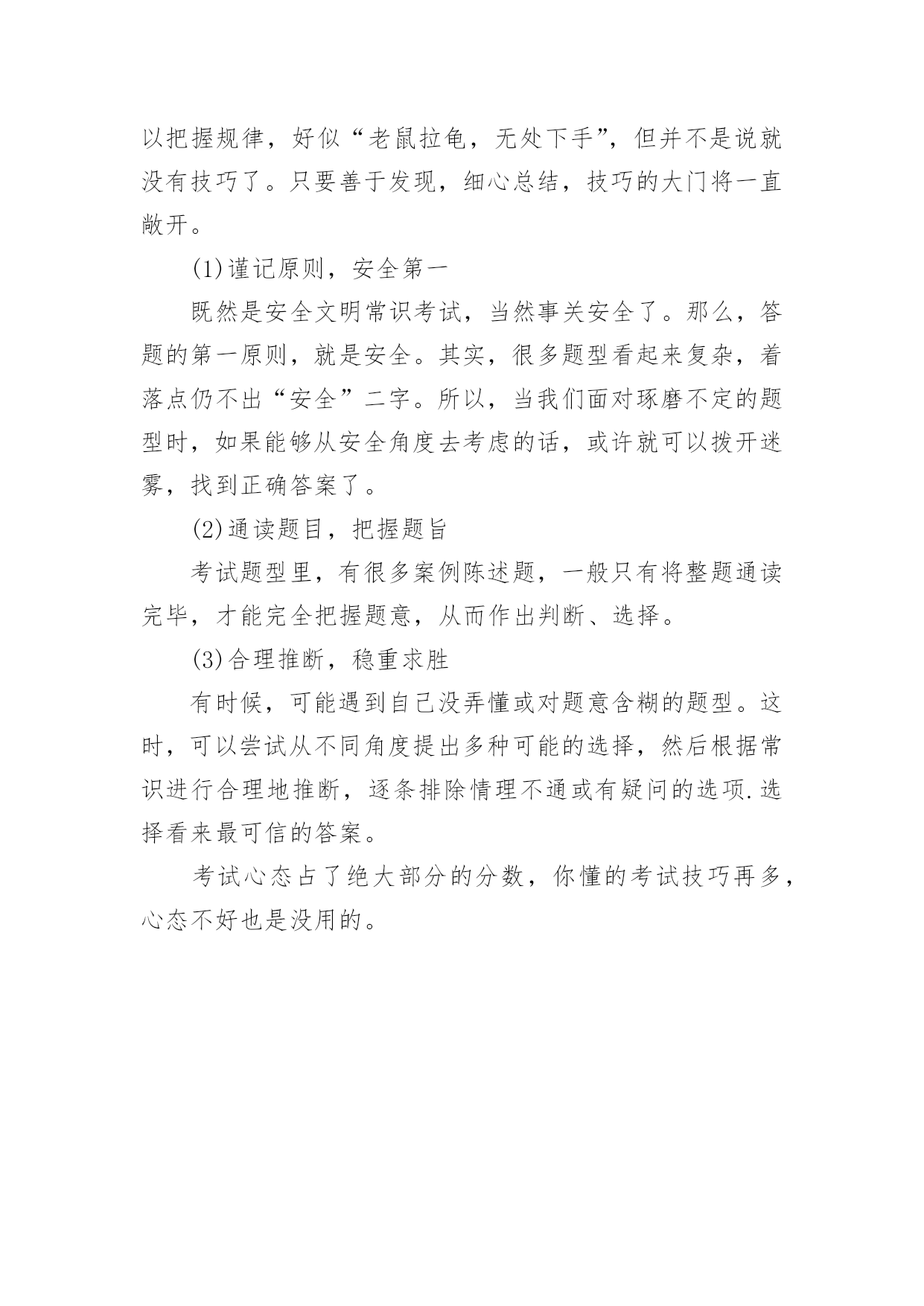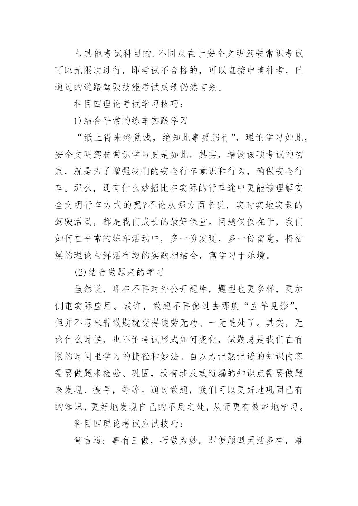 驾考科目四理论考试技巧驾考科目四理论考试技巧科目四是驾考的最后一项,也因为是最后一项,许多学员放松警惕或者过度紧张,这对考试都是不利的。下面是小编整理了一些关于科目四理论考试技巧秘籍的相关资料,供你参考。科目四理论考试考试内容与形式:根据公安部公布的123号令,在原科目三道路驾驶技能考试之后,将增加一项考试内容,即安全文明驾驶常识考试。作为科目三考试的一部分,看起来是个新项目,其实不过是将原科目一中有关安全文明驾驶要求、复杂条件下的安全驾驶技能以及紧急情况下的临危处置等知识单列出来,以灵活多变、客观实用的题型,检验诸位准驾驶人的安全文明意识,目的在于提醒广大驾驶人注意文明驾车、安全行车。科目四理论考试考核内容包括:安全文明驾驶操作要求、恶劣气象和复杂道路条件下的安全驾驶知识、爆胎等紧急情况下的临危处置方法以及发生交通事故后的处置知识等。整个考试共50道题,与科目一理论考试一样,也是在计算机上进行。题目多以案例、图片、动画等形式为主,题型有判断题、单项选择题和多项选择题三种。规定满分为100分,若达到90分即为合格。与其他考试科目的.不同点在于安全文明驾驶常识考试可以无限次进行,即考试不合格的,可以直接申请补考,已通过的道路驾驶技能考试成绩仍然有效。科目四理论考试学习技巧:1)结合平常的练车实践学习“纸上得来终觉浅,绝知此事要躬行”,理论学习如此,安全文明驾驶常识学习更是如此。其实,增设该项考试的初衷,就是为了增强我们的安全行车意识和行为,确保安全行车。那么,还有什么妙招比在实际的行车途中更能够理解安全文明行车方式的呢?不论从哪方面来说,实时实地实景的驾驶活动,都是我们成长的最好课堂。问题仅仅在于,我们如何在平常的练车活动中,多一份发现,多一份留意,将枯燥的理论与鲜活有趣的实践相结合,寓学习于乐境。(2)结合做题来的学习虽然说,现在不再对外公开题库,题型也更多样,更加侧重实际应用。或许,做题不再像过去那般“立竿见影”,但并不意味着做题就变得徒劳无功、一无是处了。其实,无论什么时候,也不论考试形式如何变化,做题总是我们在有限的时间里学习的捷径和妙法。自以为记熟记透的知识内容需要做题来检验、巩固,没有涉及或遗漏的知识点需要做题来发现、搜寻,等等。通过做题,我们可以更好地巩固已有的知识,更好地发现自己的不足之处,从而更有效率地学习。科目四理论考试应试技巧:常言道:事有三做,巧做为妙。即便题型灵活多样,难以把握规律,好似“老鼠拉龟,无处下手”,但并不是说就没有技巧了。只要善于发现,细心总结,技巧的大门将一直敞开。(1)谨记原则,安全第一既然是安全文明常识考试,当然事关安全了。那么,答题的第一原则,就是安全。其实,很多题型看起来复杂,着落点仍不出“安全”二字。所以,当我们面对琢磨不定的题型时,如果能够从安全角度去考虑的话,或许就可以拨开迷雾,找到正确答案了。(2)通读题目,把握题旨考试题型里,有很多案例陈述题,一般只有将整题通读完毕,才能完全把握题意,从而作出判断、选择。(3)合理推断,稳重求胜有时候,可能遇到自己没弄懂或对题意含糊的题型。这时,可以尝试从不同角度提出多种可能的选择,然后根据常识进行合理地推断,逐条排除情理不通或有疑问的选项.选择看来最可信的答案。考试心态占了绝大部分的分数,你懂的考试技巧再多,心态不好也是没用的。
