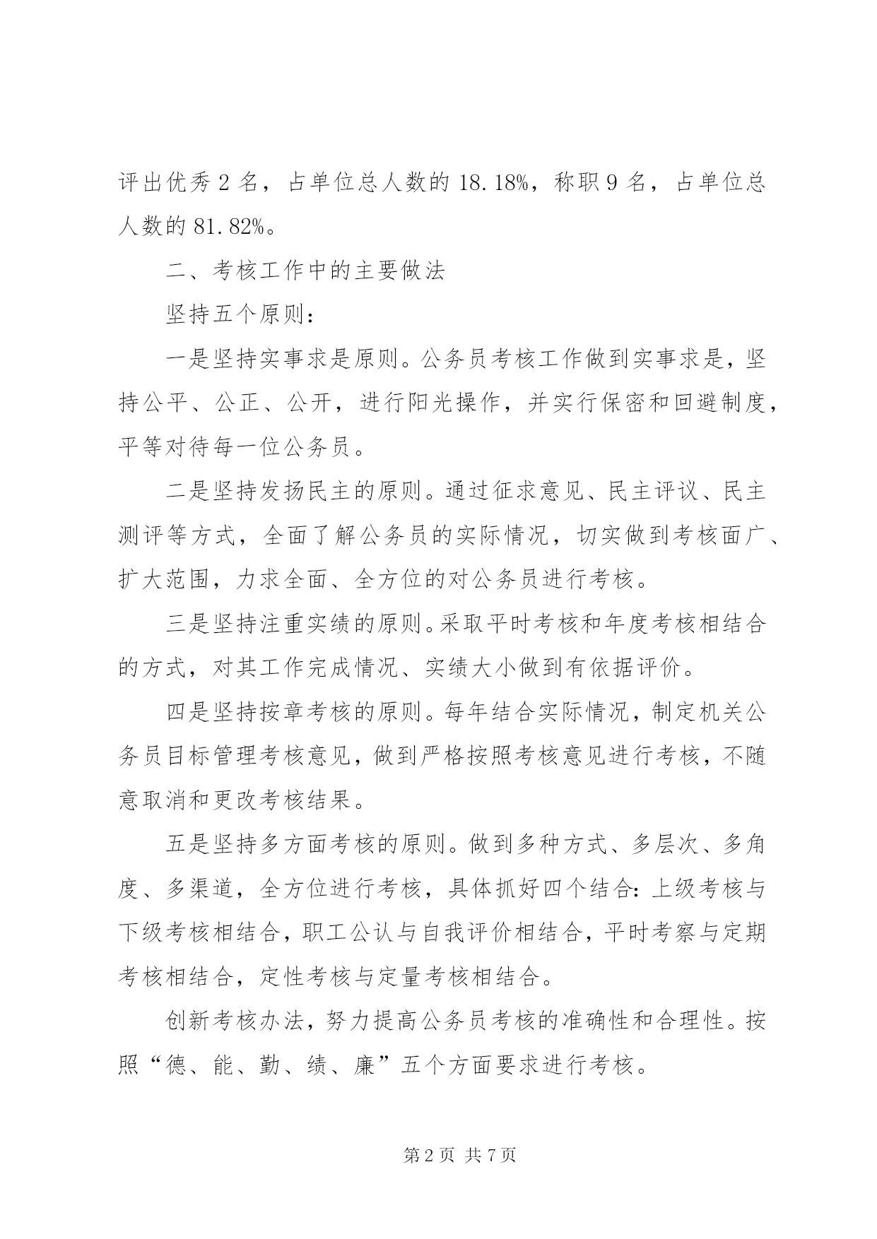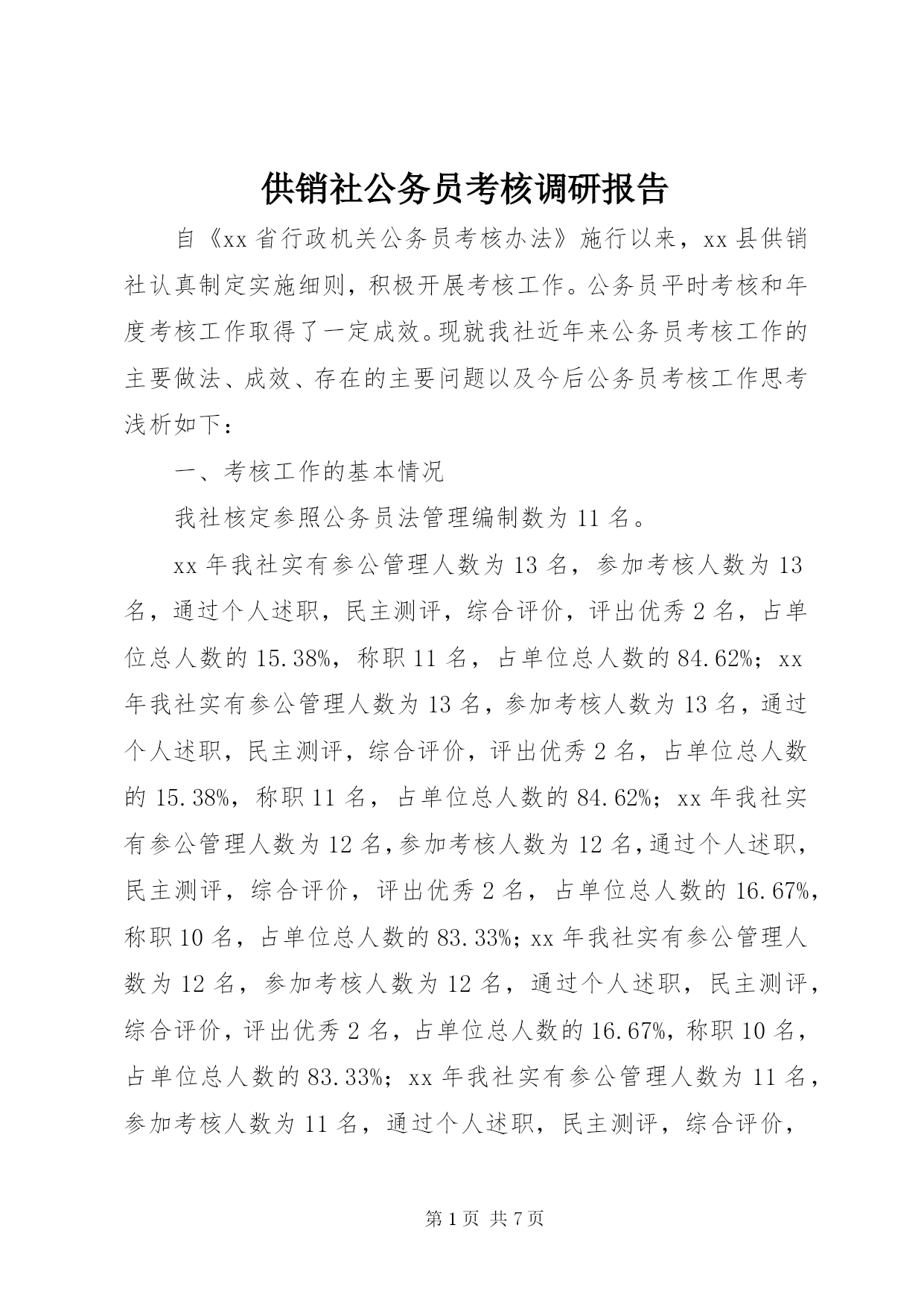 第PAGE\*Arabic\*MERGEFORMAT7页共NUMPAGES\*MERGEFORMAT7页供销社公务员考核调研报告自《xx省行政机关公务员考核办法》施行以来,xx县供销社认真制定实施细则,积极开展考核工作。公务员平时考核和年度考核工作取得了一定成效。现就我社近年来公务员考核工作的主要做法、成效、存在的主要问题以及今后公务员考核工作思考浅析如下:一、考核工作的基本情况我社核定参照公务员法管理编制数为11名。xx年我社实有参公管理人数为13名,参加考核人数为13名,通过个人述职,民主测评,综合评价,评出优秀2名,占单位总人数的15.38%,称职11名,占单位总人数的84.62%;xx年我社实有参公管理人数为13名,参加考核人数为13名,通过个人述职,民主测评,综合评价,评出优秀2名,占单位总人数的15.38%,称职11名,占单位总人数的84.62%;xx年我社实有参公管理人数为12名,参加考核人数为12名,通过个人述职,民主测评,综合评价,评出优秀2名,占单位总人数的16.67%,称职10名,占单位总人数的83.33%;xx年我社实有参公管理人数为12名,参加考核人数为12名,通过个人述职,民主测评,综合评价,评出优秀2名,占单位总人数的16.67%,称职10名,占单位总人数的83.33%;xx年我社实有参公管理人数为11名,参加考核人数为11名,通过个人述职,民主测评,综合评价,评出优秀2名,占单位总人数的18.18%,称职9名,占单位总人数的81.82%。二、考核工作中的主要做法坚持五个原则:一是坚持实事求是原则。公务员考核工作做到实事求是,坚持公平、公正、公开,进行阳光操作,并实行保密和回避制度,平等对待每一位公务员。二是坚持发扬民主的原则。通过征求意见、民主评议、民主测评等方式,全面了解公务员的实际情况,切实做到考核面广、扩大范围,力求全面、全方位的对公务员进行考核。三是坚持注重实绩的原则。采取平时考核和年度考核相结合的方式,对其工作完成情况、实绩大小做到有依据评价。四是坚持按章考核的原则。每年结合实际情况,制定机关公务员目标管理考核意见,做到严格按照考核意见进行考核,不随意取消和更改考核结果。五是坚持多方面考核的原则。做到多种方式、多层次、多角度、多渠道,全方位进行考核,具体抓好四个结合:上级考核与下级考核相结合,职工公认与自我评价相结合,平时考察与定期考核相结合,定性考核与定量考核相结合。创新考核办法,努力提高公务员考核的准确性和合理性。按照“德、能、勤、绩、廉”五个方面要求进行考核。从制度入手,规范平时考核工作。将平时考核体现在日常管理的细微处,以制度规范平时考核的各项指标,制定切合实际的管理制度,并以此作为平时考核的内容。从操作环节入手,加强年度考核工作力度。在量化考核标准、严格考核程序、提高考核质量方面狠下功夫。在考核中我们对德、能、勤、绩、廉五个方面作了细化,逐层分解成多个指标,使全体干部职工在德、能、勤、绩、廉的掌握上有一个统一的参考标准,考德。干部政治觉悟和思想品德。考能。组织协调和领导能力、解决分析问题的能力、独挡一面的工作和管理能力、语言表达能力、专业知识水平、身体健康状况等。考勤。工作积极性和主动性、组织纪律性、工作责任感、工作在岗率和工作效率。考绩。统筹工作实绩,做到平时考核与年终考核相结合,实行滚动考核。考廉。干部廉洁自律情况,树立清廉形象。从而使测评过程能更充分地体现民主化的要求,对提高干部考核工作的针对性、准确性起到了积极的作用。从激励作用的发挥入手,注重考核结果的使用。考核的效果,一是以考有成效为方向,进一步规范平时考核工作。实践证明,平时考核必须形成规章,建立制度,我们在调查研究的基础上,制定一个完善平时考核工作的意见,以规范平时考核工作。二是以考有所据为支点,进一步完善年度考核标准。考核标准在公务员考核中至关重要,我社年度考核以德、能、勤、绩、廉为基础,主要考核干部的工作成效、工作作风和廉洁自律等情况,三是以考有所用为目标,进一步完善考核工作的“三个机制”。干部考核工作必须建立相应的激励机制、反馈机制和回访机制,只有这样,才能构筑完整的年度考核体系,才能真正有助于干部的工作和成长。三、考核工作成效:经过几年的考核实践,我们充分认识到,考核工作作为一项基础性的工作,在公务员管理中起到了关键性的作用,主要体现在三个方面:通过考核,加快了公务员管理的制度化建设。从我社公务员管理的运行情况看,考核工作作为公务员管理的中心环节,使得公务员管理制度中的各个环节环环相扣,紧密联系。考核贯穿于公务员管理的全部过程,它既是一种评价方式,也是一种监督手段,考核作为任免奖惩的依据,使得公务员管理有了一个尺度和杠杆,也增强了公务员管理的可操作性。考核工作做得好,公务员管理