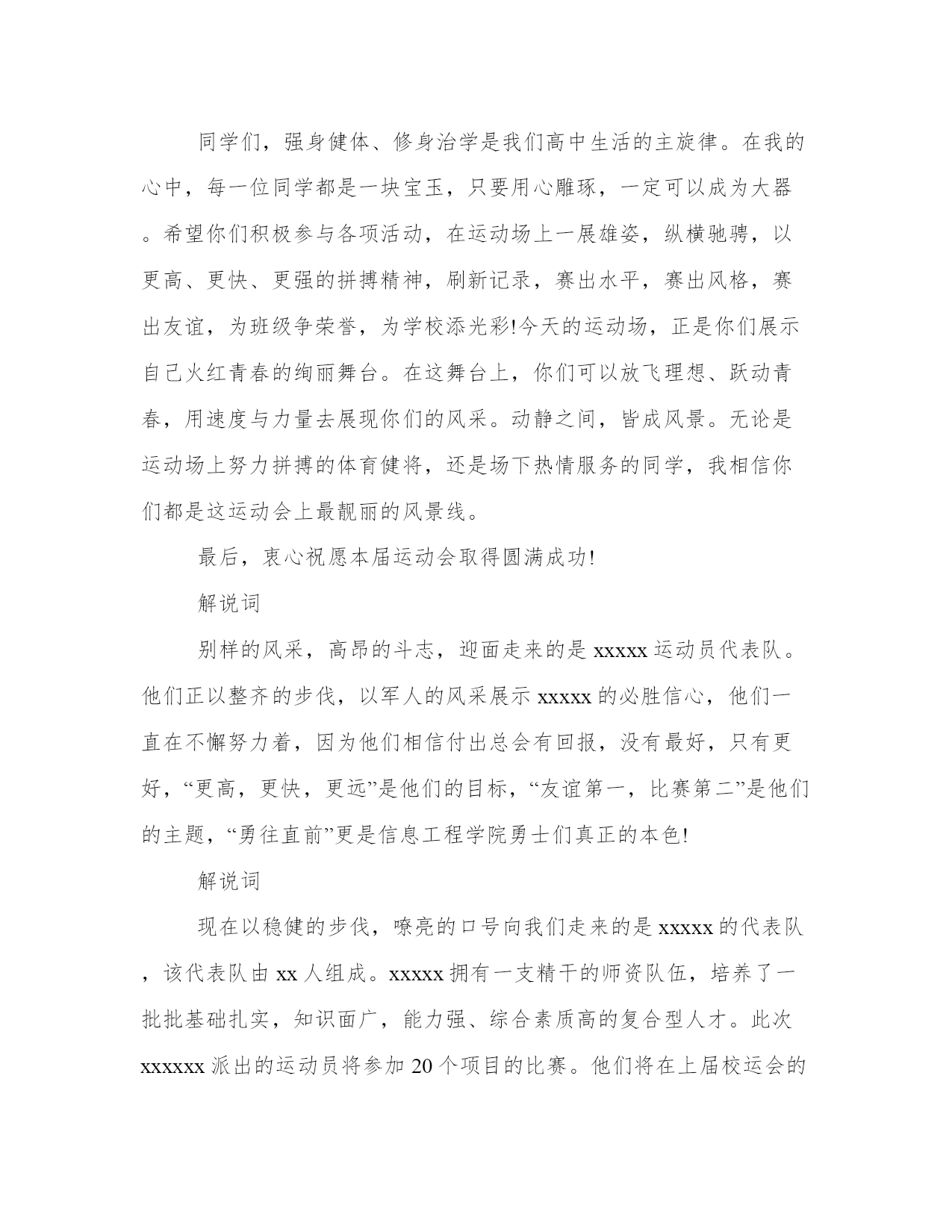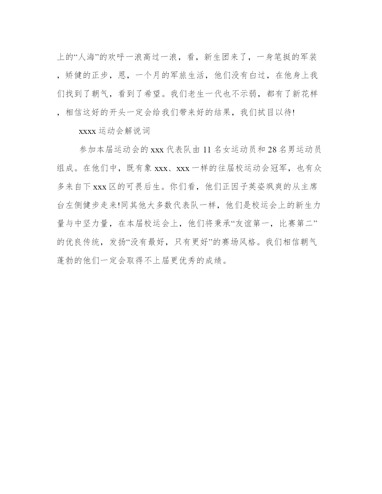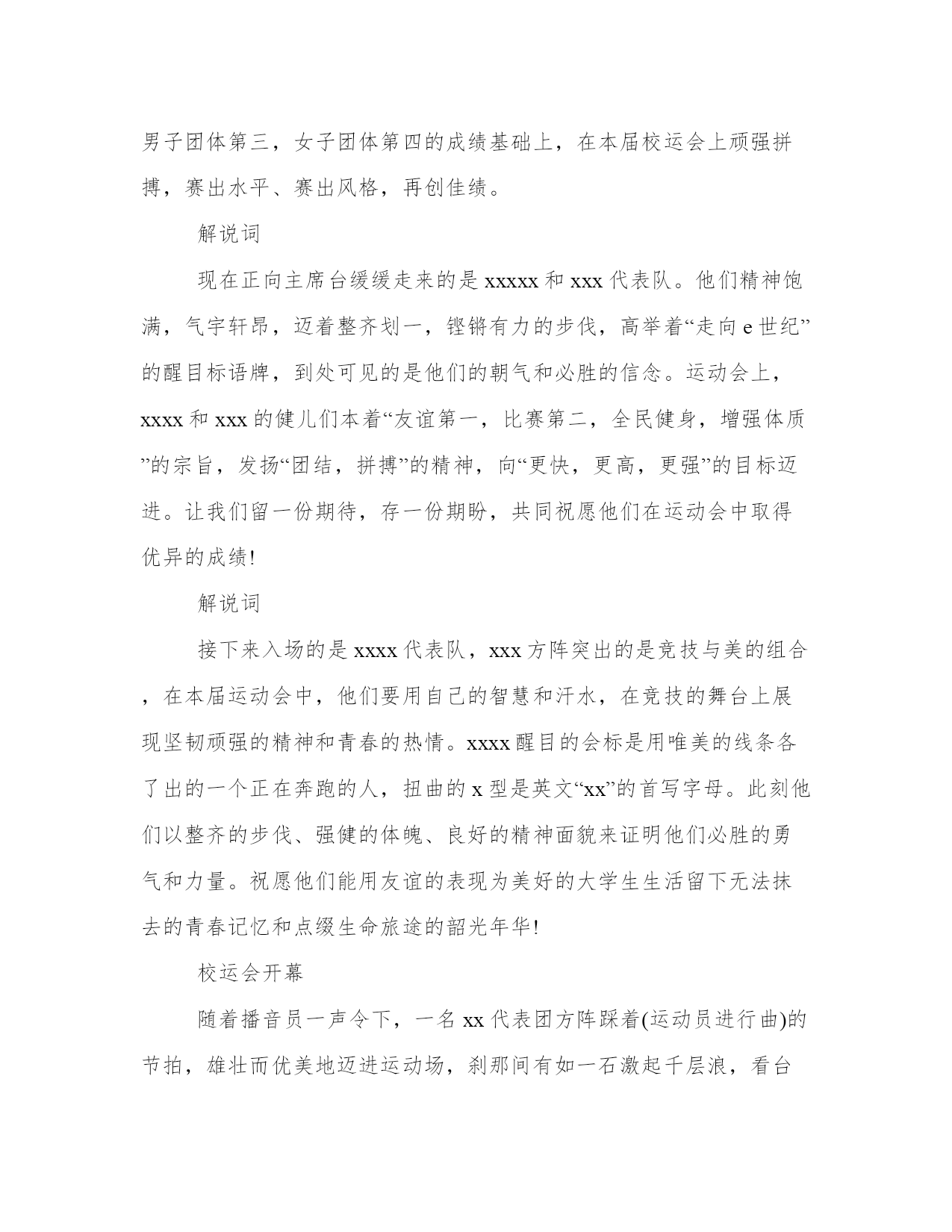 教师运动会致辞范本在沐浴xx届六中全会春风,伴随“神八”与“天宫”太空之吻的喜悦中,我们迎来了学校第23届运动会。在此,我谨代表学校对这次盛会的举办表示热烈的祝贺!对在运动会准备工作中付出辛勤劳动的教师和同学们表示衷心的感谢!XX年对我校来说是不平凡的一年。一是恰逢学校建校30周年。校庆的成功举办,良好师生风貌和办学成就的展示,让我们深感骄傲和自豪;二是历时半年的校园文化工程全面完成,今天校园丹桂飘香,大“凤”展翅,亭台楼阁,一个崭新而又充满活力的校园环境呈现在我们眼前,为我们学习工作提高美好的场所;三是学校的教育教学质量跃上新的台阶,今年高考再创佳绩,受到社会的广泛赞誉,让我们充满了坚定前行的信心和勇气。在这个背景下举办运动会,意义深远。这场盛会,是我校全面贯彻党的教育方针,大力推进素质教育,认真实施新课标的具体体现;是促进学生德,智,体,美,劳全面发展的必要课程;也是检验我校师生精神风貌和身体素质的大好机会。这场盛会,将有利于同学们树立强身健体的意识、掌握基本运动技能、养成良好运动习惯;有利于同学们展现个性、挖掘潜能、提升素质;有利于同学们增强集体荣誉感、班级凝聚力和组织协调能力。我们要把此次运动会办成弘扬二中人坚韧不拔,乘势而上,永不言败的精神盛会和独具特色校园文化的盛会。同学们,强身健体、修身治学是我们高中生活的主旋律。在我的心中,每一位同学都是一块宝玉,只要用心雕琢,一定可以成为大器。希望你们积极参与各项活动,在运动场上一展雄姿,纵横驰骋,以更高、更快、更强的拼搏精神,刷新记录,赛出水平,赛出风格,赛出友谊,为班级争荣誉,为学校添光彩!今天的运动场,正是你们展示自己火红青春的绚丽舞台。在这舞台上,你们可以放飞理想、跃动青春,用速度与力量去展现你们的风采。动静之间,皆成风景。无论是运动场上努力拼搏的体育健将,还是场下热情服务的同学,我相信你们都是这运动会上最靓丽的风景线。最后,衷心祝愿本届运动会取得圆满成功!解说词别样的风采,高昂的斗志,迎面走来的是xxxxx运动员代表队。他们正以整齐的步伐,以军人的风采展示xxxxx的必胜信心,他们一直在不懈努力着,因为他们相信付出总会有回报,没有最好,只有更好,“更高,更快,更远”是他们的目标,“友谊第一,比赛第二”是他们的主题,“勇往直前”更是信息工程学院勇士们真正的本色!解说词现在以稳健的步伐,嘹亮的口号向我们走来的是xxxxx的代表队,该代表队由xx人组成。xxxxx拥有一支精干的师资队伍,培养了一批批基础扎实,知识面广,能力强、综合素质高的复合型人才。此次xxxxxx派出的运动员将参加20个项目的比赛。他们将在上届校运会的男子团体第三,女子团体第四的成绩基础上,在本届校运会上顽强拼搏,赛出水平、赛出风格,再创佳绩。解说词现在正向主席台缓缓走来的是xxxxx和xxx代表队。他们精神饱满,气宇轩昂,迈着整齐划一,铿锵有力的步伐,高举着“走向e世纪”的醒目标语牌,到处可见的是他们的朝气和必胜的信念。运动会上,xxxx和xxx的健儿们本着“友谊第一,比赛第二,全民健身,增强体质”的宗旨,发扬“团结,拼搏”的精神,向“更快,更高,更强”的目标迈进。让我们留一份期待,存一份期盼,共同祝愿他们在运动会中取得优异的成绩!解说词接下来入场的是xxxx代表队,xxx方阵突出的是竞技与美的组合,在本届运动会中,他们要用自己的智慧和汗水,在竞技的舞台上展现坚韧顽强的精神和青春的热情。xxxx醒目的会标是用唯美的线条各了出的一个正在奔跑的人,扭曲的x型是英文“xx”的首写字母。此刻他们以整齐的步伐、强健的体魄、良好的精神面貌来证明他们必胜的勇气和力量。祝愿他们能用友谊的表现为美好的大学生生活留下无法抹去的青春记忆和点缀生命旅途的韶光年华!校运会开幕随着播音员一声令下,一名xx代表团方阵踩着(运动员进行曲)的节拍,雄壮而优美地迈进运动场,刹那间有如一石激起千层浪,看台上的“人海”的欢呼一浪高过一浪,看,新生团来了,一身笔挺的军装,矫健的正步,恩,一个月的军旅生活,他们没有白过,在他身上我们找到了朝气,看到了希望。我们老生一代也不示弱,都有了新花样,相信这好的开头一定会给我们带来好的结果,我们拭目以待!xxxx运动会解说词参加本届运动会的xxx代表队由11名女运动员和28名男运动员组成。在他们中,既有象xxx、xxx一样的往届校运动会冠军,也有众多来自下xxx区的可畏后生。你们看,他们正因子英姿飒爽的从主席台左侧健步走来!同其他大多数代表队一样,他们是校运会上的新生力量与中坚力量,在本届校运会上,他们将秉承“友谊第一,比赛第二”的优良传统,发扬“没有最好,只有更好”的赛场风格。我们相信朝气蓬勃的他们一定会取得不上届更优秀的成绩。