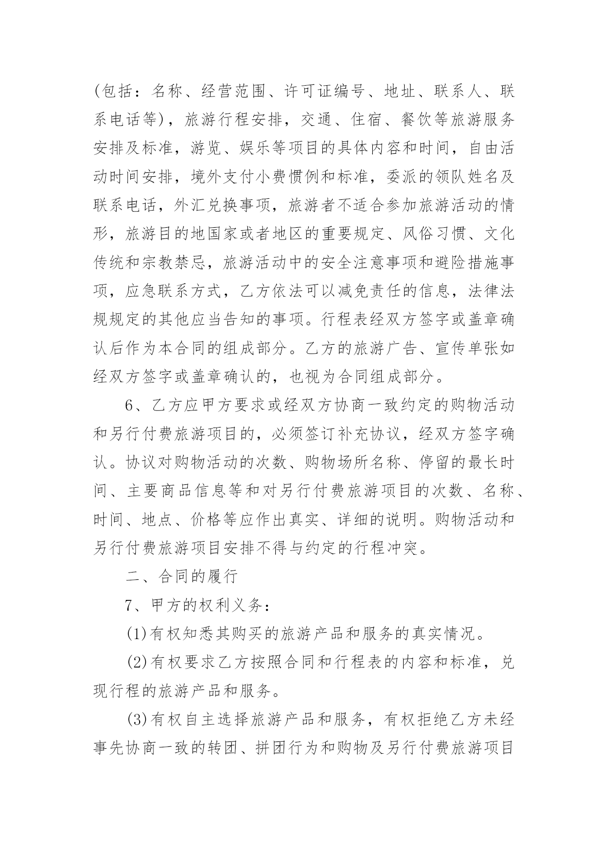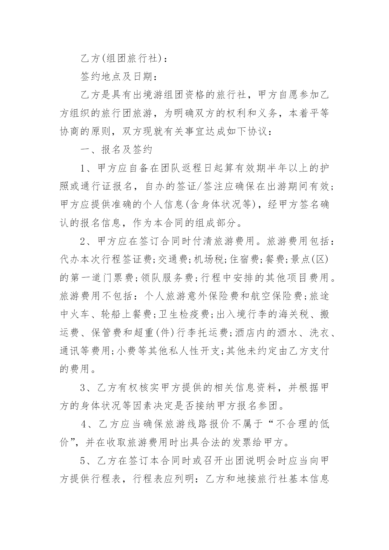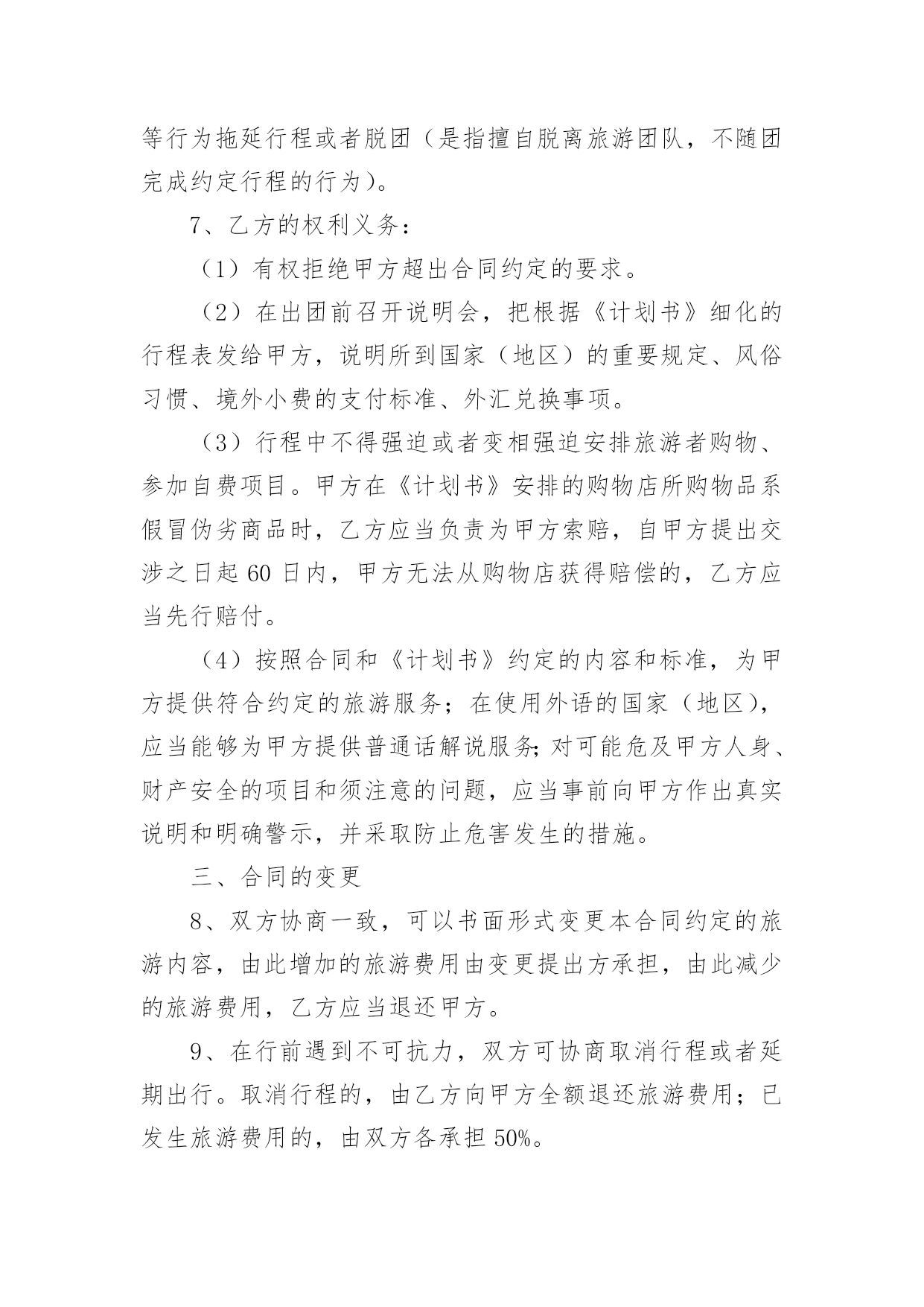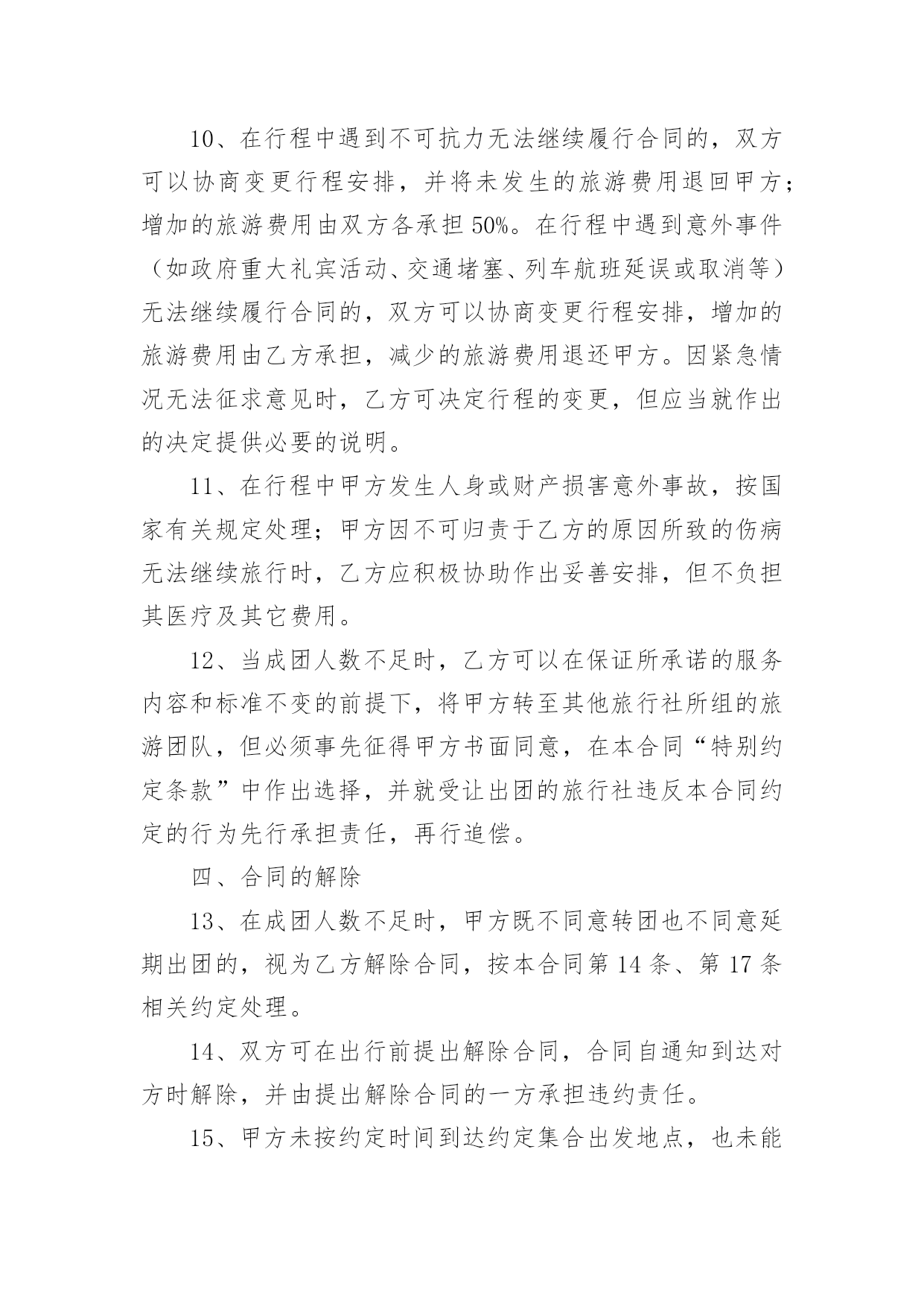 出境旅游组团协议在社会发展不断提速的今天,协议的使用频率呈上升趋势,签订协议可以使双方受到法律的保护。写协议需要注意哪些问题呢?下面是小编帮大家整理的出境旅游组团协议,希望能够帮助到大家。出境旅游组团协议1甲方(团体或个人):___________________________合同编号:____________________________乙方(组团旅行社):___________________________签约地点及日期:______________________乙方是具有出境游组团资格的旅行社,甲方自愿参加乙方组织的旅行团旅游,为明确双方的权利和义务,现就有关事宜达成如下协议:一、报名及签约1、甲方应自备在团队返程日有效期半年以上的护照或通行证报名,自办的签证/签注应确保在出游期间有效;甲方应提供准确的个人信息(含身体状况等),经甲方签名确认的报名信息,作为本合同的组成部分。2、甲方应在签订合同时付清旅游费用。旅游费用包括:乙方代订飞机票(含境外机场税)或火车票等城市间交通费用;旅游观光汽车费用;住宿费;餐费;非自费项目景点(区)的第一道门票费;行程中安排的其他项目费用;导游(领队)服务费,双方另有约定的除外。3、乙方有权根据甲方的身体状况等因素决定是否接纳甲方报名参团。4、乙方收取旅游费用时应出具合法的发票。5、乙方在签订本合同时应当向甲方提供列明旅行社经营范围及经营许可证编号,旅游出发地、途经地和目的地,交通、住宿、餐饮安排及标准,统一安排的游览项目的具体内容及时间,自由活动的时间和次数,购物次数、停留时间及购物店名称,自费项目及价格,经办人及电话,服务监督电话等内容的《旅_____程计划说明书》(以下简称《计划书》)。《计划书》经双方签字或盖章确认后作为本合同的组成部分。乙方的旅游广告、宣传单张如经双方签字或盖章确认,也视为合同组成部分。二、合同的履行6、甲方的权利义务:(1)有权要求乙方按照合同和《计划书》的内容和标准,兑现旅_____程服务。(2)有权拒绝乙方未经事先协商一致的转团行为和合同约定以外的购物及自费项目安排。(3)遵守合同约定,配合领队、导游人员完成旅_____程;遵守我国和旅游目的地国家(地区)的法律法规;尊重旅游目的地国家(地区)的风俗习惯。(4)行程中发生纠纷,应当本着平等协商的原则解决,采取适当措施防止损失的.扩大,不得以拒绝登机(车、船)等行为拖延行程或者脱团(是指擅自脱离旅游团队,不随团完成约定行程的行为)。7、乙方的权利义务:(1)有权拒绝甲方超出合同约定的要求。(2)在出团前召开说明会,把根据《计划书》细化的行程表发给甲方,说明所到国家(地区)的重要规定、风俗习惯、境外小费的支付标准、外汇兑换事项。(3)行程中不得强迫或者变相强迫安排旅游者购物、参加自费项目。甲方在《计划书》安排的购物店所购物品系假冒伪劣商品时,乙方应当负责为甲方索赔,自甲方提出交涉之日起60日内,甲方无法从购物店获得赔偿的,乙方应当先行赔付。(4)按照合同和《计划书》约定的内容和标准,为甲方提供符合约定的旅游服务;在使用外语的国家(地区),应当能够为甲方提供普通话解说服务;对可能危及甲方人身、财产安全的项目和须注意的问题,应当事前向甲方作出真实说明和明确警示,并采取防止危害发生的措施。三、合同的变更8、双方协商一致,可以书面形式变更本合同约定的旅游内容,由此增加的旅游费用由变更提出方承担,由此减少的旅游费用,乙方应当退还甲方。9、在行前遇到不可抗力,双方可协商取消行程或者延期出行。取消行程的,由乙方向甲方全额退还旅游费用;已发生旅游费用的,由双方各承担50%。10、在行程中遇到不可抗力无法继续履行合同的,双方可以协商变更行程安排,并将未发生的旅游费用退回甲方;增加的旅游费用由双方各承担50%。在行程中遇到意外事件(如政府重大礼宾活动、交通堵塞、列车航班延误或取消等)无法继续履行合同的,双方可以协商变更行程安排,增加的旅游费用由乙方承担,减少的旅游费用退还甲方。因紧急情况无法征求意见时,乙方可决定行程的变更,但应当就作出的决定提供必要的说明。11、在行程中甲方发生人身或财产损害意外事故,按国家有关规定处理;甲方因不可归责于乙方的原因所致的伤病无法继续旅行时,乙方应积极协助作出妥善安排,但不负担其医疗及其它费用。12、当成团人数不足时,乙方可以在保证所承诺的服务内容和标准不变的前提下,将甲方转至其他旅行社所组的旅游团队,但必须事先征得甲方书面同意,在本合同“特别约定条款”中作出选择,并就受让出团的旅行社违反本合同约定的行为先行承担责任,再行追偿。四、合同的解除13、在成团人数不足时,甲方既不同意转团也不同意延期出团的,视为乙方解除合同,按本合同第14条、第17条相关约定处理。14、双方可在出行前提出解除合同