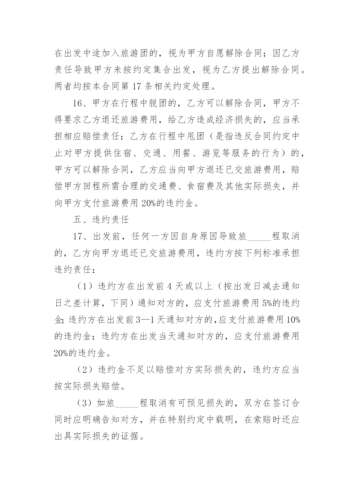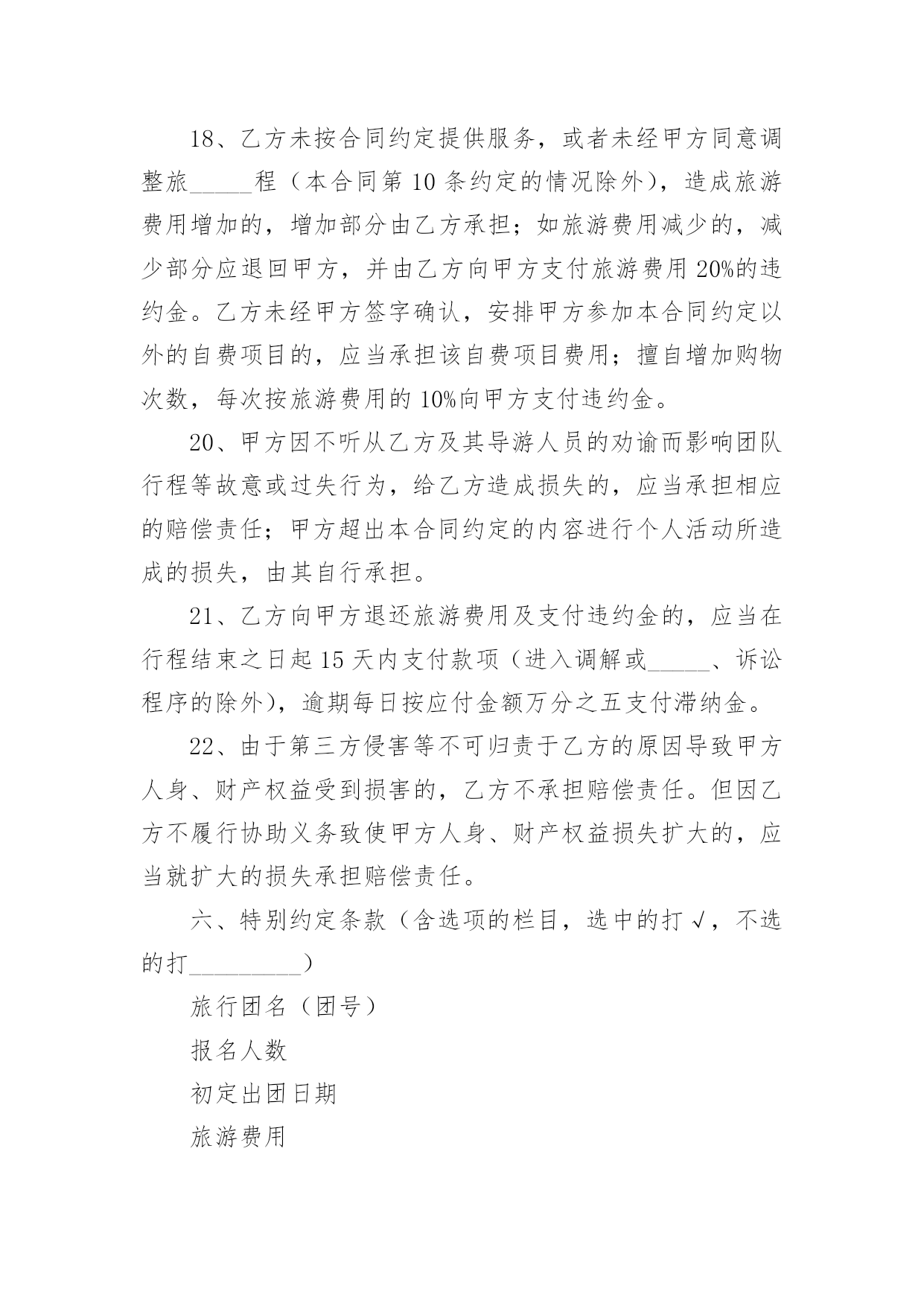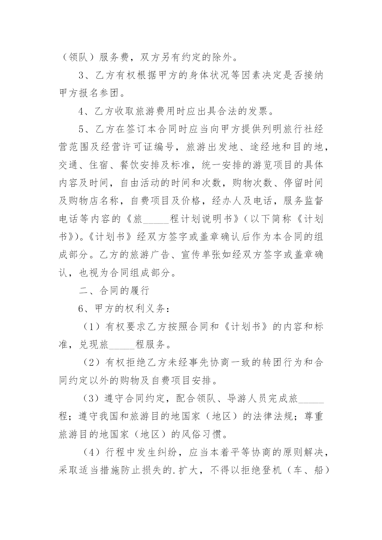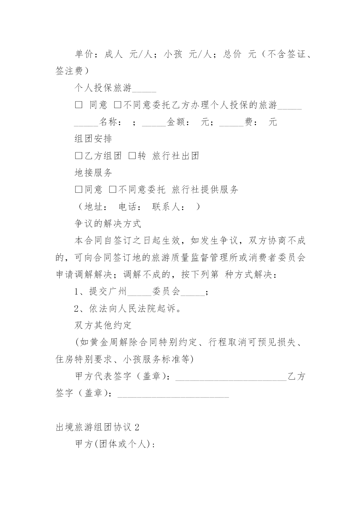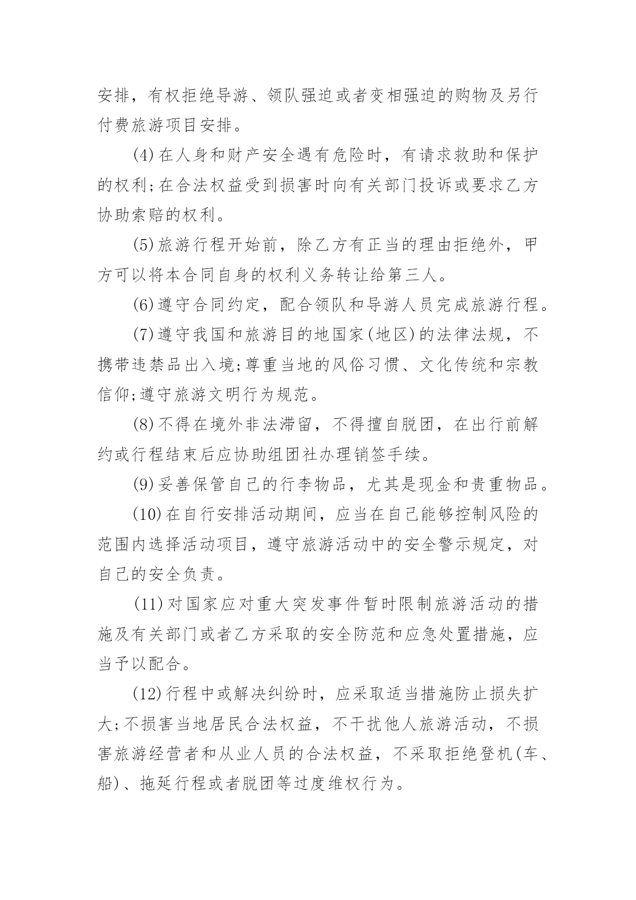 出境旅游组团协议在社会发展不断提速的今天,协议的使用频率呈上升趋势,签订协议可以使双方受到法律的保护。写协议需要注意哪些问题呢?下面是小编帮大家整理的出境旅游组团协议,希望能够帮助到大家。出境旅游组团协议1甲方(团体或个人):___________________________合同编号:____________________________乙方(组团旅行社):___________________________签约地点及日期:______________________乙方是具有出境游组团资格的旅行社,甲方自愿参加乙方组织的旅行团旅游,为明确双方的权利和义务,现就有关事宜达成如下协议:一、报名及签约1、甲方应自备在团队返程日有效期半年以上的护照或通行证报名,自办的签证/签注应确保在出游期间有效;甲方应提供准确的个人信息(含身体状况等),经甲方签名确认的报名信息,作为本合同的组成部分。2、甲方应在签订合同时付清旅游费用。旅游费用包括:乙方代订飞机票(含境外机场税)或火车票等城市间交通费用;旅游观光汽车费用;住宿费;餐费;非自费项目景点(区)的第一道门票费;行程中安排的其他项目费用;导游(领队)服务费,双方另有约定的除外。3、乙方有权根据甲方的身体状况等因素决定是否接纳甲方报名参团。4、乙方收取旅游费用时应出具合法的发票。5、乙方在签订本合同时应当向甲方提供列明旅行社经营范围及经营许可证编号,旅游出发地、途经地和目的地,交通、住宿、餐饮安排及标准,统一安排的游览项目的具体内容及时间,自由活动的时间和次数,购物次数、停留时间及购物店名称,自费项目及价格,经办人及电话,服务监督电话等内容的《旅_____程计划说明书》(以下简称《计划书》)。《计划书》经双方签字或盖章确认后作为本合同的组成部分。乙方的旅游广告、宣传单张如经双方签字或盖章确认,也视为合同组成部分。二、合同的履行6、甲方的权利义务:(1)有权要求乙方按照合同和《计划书》的内容和标准,兑现旅_____程服务。(2)有权拒绝乙方未经事先协商一致的转团行为和合同约定以外的购物及自费项目安排。(3)遵守合同约定,配合领队、导游人员完成旅_____程;遵守我国和旅游目的地国家(地区)的法律法规;尊重旅游目的地国家(地区)的风俗习惯。(4)行程中发生纠纷,应当本着平等协商的原则解决,采取适当措施防止损失的.扩大,不得以拒绝登机(车、船)等行为拖延行程或者脱团(是指擅自脱离旅游团队,不随团完成约定行程的行为)。7、乙方的权利义务:(1)有权拒绝甲方超出合同约定的要求。(2)在出团前召开说明会,把根据《计划书》细化的行程表发给甲方,说明所到国家(地区)的重要规定、风俗习惯、境外小费的支付标准、外汇兑换事项。(3)行程中不得强迫或者变相强迫安排旅游者购物、参加自费项目。甲方在《计划书》安排的购物店所购物品系假冒伪劣商品时,乙方应当负责为甲方索赔,自甲方提出交涉之日起60日内,甲方无法从购物店获得赔偿的,乙方应当先行赔付。(4)按照合同和《计划书》约定的内容和标准,为甲方提供符合约定的旅游服务;在使用外语的国家(地区),应当能够为甲方提供普通话解说服务;对可能危及甲方人身、财产安全的项目和须注意的问题,应当事前向甲方作出真实说明和明确警示,并采取防止危害发生的措施。三、合同的变更8、双方协商一致,可以书面形式变更本合同约定的旅游内容,由此增加的旅游费用由变更提出方承担,由此减少的旅游费用,乙方应当退还甲方。9、在行前遇到不可抗力,双方可协商取消行程或者延期出行。取消行程的,由乙方向甲方全额退还旅游费用;已发生旅游费用的,由双方各承担50%。10、在行程中遇到不可抗力无法继续履行合同的,双方可以协商变更行程安排,并将未发生的旅游费用退回甲方;增加的旅游费用由双方各承担50%。在行程中遇到意外事件(如政府重大礼宾活动、交通堵塞、列车航班延误或取消等)无法继续履行合同的,双方可以协商变更行程安排,增加的旅游费用由乙方承担,减少的旅游费用退还甲方。因紧急情况无法征求意见时,乙方可决定行程的变更,但应当就作出的决定提供必要的说明。11、在行程中甲方发生人身或财产损害意外事故,按国家有关规定处理;甲方因不可归责于乙方的原因所致的伤病无法继续旅行时,乙方应积极协助作出妥善安排,但不负担其医疗及其它费用。12、当成团人数不足时,乙方可以在保证所承诺的服务内容和标准不变的前提下,将甲方转至其他旅行社所组的旅游团队,但必须事先征得甲方书面同意,在本合同“特别约定条款”中作出选择,并就受让出团的旅行社违反本合同约定的行为先行承担责任,再行追偿。四、合同的解除13、在成团人数不足时,甲方既不同意转团也不同意延期出团的,视为乙方解除合同,按本合同第14条、第17条相关约定处理。14、双方可在出行前提出解除合同