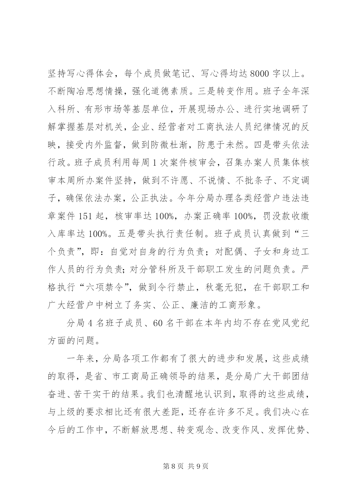 第PAGE\*Arabic\*MERGEFORMAT9页共NUMPAGES\*MERGEFORMAT9页工商局班子述职述廉报告今年,在市局的正确领导下,分局班子认真学习贯彻十六届三中、四中全会精神,团结带领干部职工全面履行工商行政管理职能,充分发挥市场经济卫士作用,在监管执法、班子建设、廉政建设等方面取得了很大进展。现述职如下:一、团结带领干部职工全面完成年度目标任务按照市局的工作思路,分局班子团结进取,开拓创新,真抓实干,努力克服各种困难,狠抓各项关键性工作的落实,在全局干部职工的支持配合和共同努力下,各项工作有了突破性进展。(一)依法严格规范市场主体资格。一是坚持依法登记,严把市场准入关。全年新登记注册企业共计391户,发展新办个体工商户277户,办理变更登记企业1082户,注销登记企业66户。二是结合年检工作强化市场主体监管。全年共年检企业2167户,年检率达90.7%。个体工商户验照316户,滚动验照率达49.6%。三是设立受理大厅。对原繁琐、拖拉、多口审核的登记程序进行改革,现统一由分局受理,实行一审一核制,简化办照环节,提高了办照效率。(二)加强汽车市场和运输市场的整治力度。共检查汽车企业132户,个体工商户296户,查出有违法违章行为的38户(次),被立案查处34起。2004年8月份以来,分局会同有关部门在两个专业市场,组织开展了“百里百辆靓车环黄河巡展”活动,举办了“中国2004首届西北汽车市场发展高峰论坛”。参加了市局组织的重点工作现场观摩会,会上,分局介绍了做好**汽车市场监管工作的经验做法。为了克服和纠正消防安全薄弱环节、消除消防隐患,确保各市场安全无事故,分局适时在**货运集散中心组织了消防安全演习,提高了广大经营户的消防安全意识。12月2日,召开了**汽车流通协会成立大会,现已发展汽车企业单位会员72户。(三)强化生产要素市场管理。一是加强对中介机构和经纪人的日常监管。回访检查各类中介机构113户,巡查记载经济户口83户(册),查出擅自变更登记事项的16户,被责令改正的11户,办理、规范变更登记的16户,查阅评估、验资、审计档案资料共678份,对查出存在问题的27份档案,督促其限期予以纠正和规范。2004年8月,筹备成立了“**市经纪人协会”。现已发展会员145户。二是整顿规范建筑市场。对**市区从事建筑施工用钢管扣件、生产资料、废旧品市场及加工制作厂家、租赁经营等7个点进行专项检查,检查经营户37家,共检查架杆数量3830吨,扣件21万套,模板数量(面积)达13.6万平方米。全年监督工程招投标36项,工程总造价达13亿元。在招标现场取消了3家建筑企业的投标资格。三是加大金融市场的监管力度。检查金融企业1102户,对发现有问题的企业,根据情节轻重分别予以处罚。四是加强房地产市场的整治。回访巡查房地产企业353户,下达责令改正通知书16份,查处违法违章企业26户(起)。对举办“2004**房地产交易展示会”的主办单位、参展企业的主体资格进行了审查。(四)着力抓好有形市场的监管整治工作。一是积极开展食品安全专项整治。建立健全了食品安全检查责任制,使局领导、科所长、管理干部明确了各自的职责范围,各工商所长是该辖区食品安全第一责任人,相关业务科室对食品安全工作负指导责任,实行食品安全失职一票否决制。因职责明确,措施得力,分局食品安全工作开展得顺利有序,尚未发现任何问题。二是强化证照检查。各所对市场经营户逐店逐户进行检查,规范持照户,查处取缔无照户,逐步使市场持照率达96%,亮照率达98%。三是认真做好商品准入工作。各所对经营食品、电线、电缆、开关、闸合等商品的经营户,实行索证、索票和建立台帐等制度,确保了关系国计民生商品的健康安全。五是认真做好禽流感疫情的防控工作,确保了市场秩序的稳定。六是全力做好“两费”收缴工作。分局把“两费”收缴作为一项事关全局的重要工作,真抓实干,确保全年任务的完成。共收缴“两费”为720320元,占52万元目标任务数的138.5%。七是主动介入**化工原料市场的监管。(五)依法行政,加大案件查处力度。为加强法制建设,促进依法行政工作,分局按照组织程序,内设组建了法规科,同时强化案件核审制度,确定每周四为案件审核日,还着重抓了执法人员法律法规的培训,请XX省人民政府法制办法规处的领导宣讲《行政许可法》;分局利用1天时间,召开了由执法人员参加的案审会,抽调本局30份、借调外单位10份共40份成功案例进行观摩学习,提高了大家的执法办案水平,确保了案件查处质量和行政处罚的公正性和准确性。全年共查处违法违章案件151起,罚没款432310元,于去年同期结案82起、罚没款159300元相比分别增长了84%和171%,与市局年初下达的一般程序案件30起的目标任务相比,超额