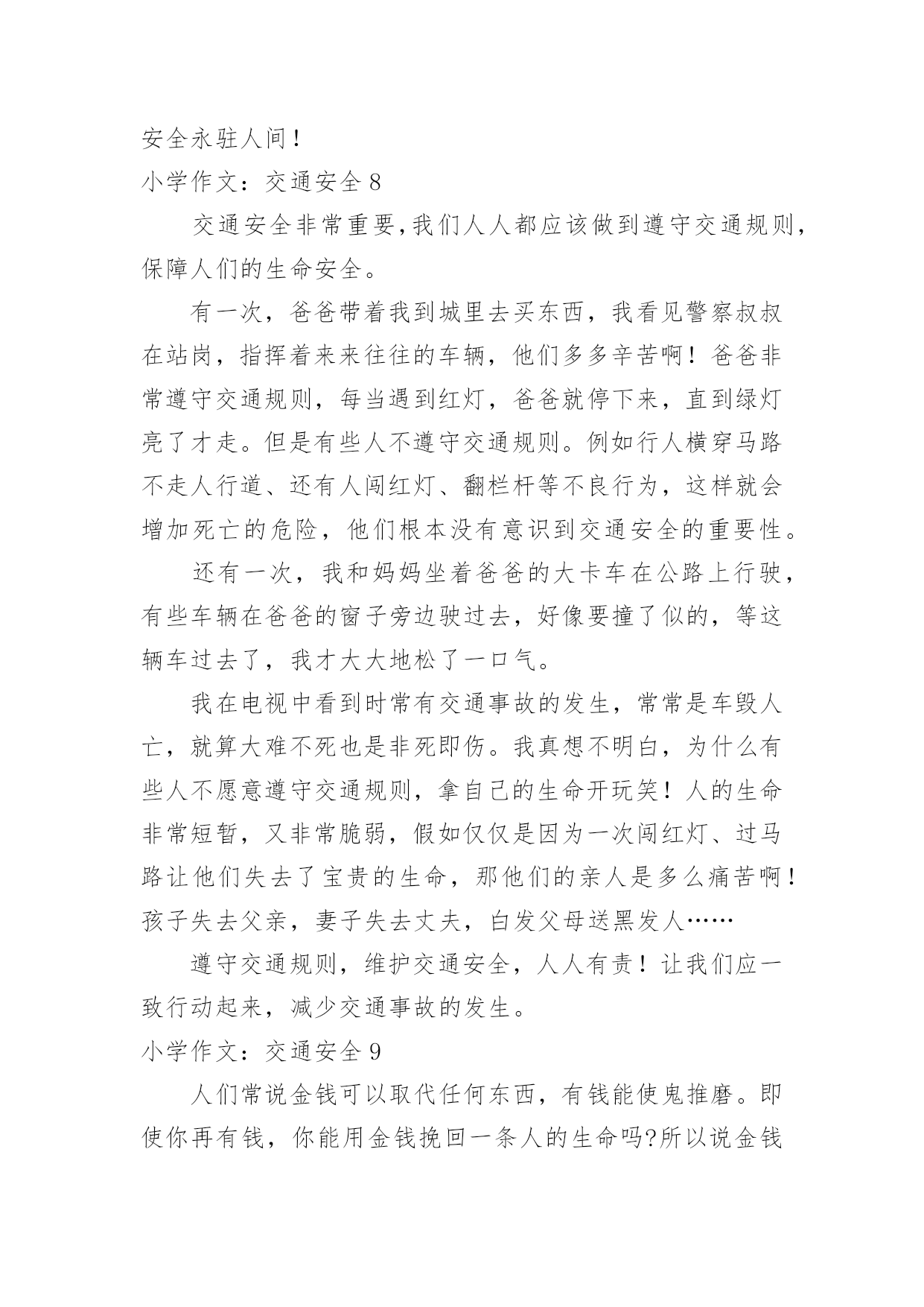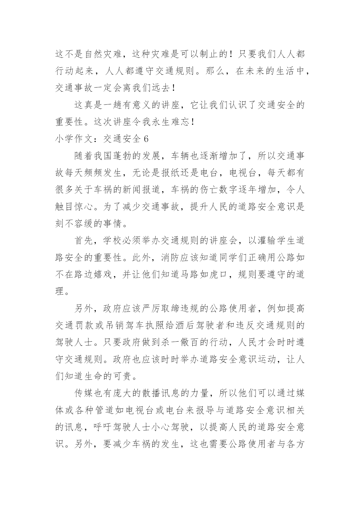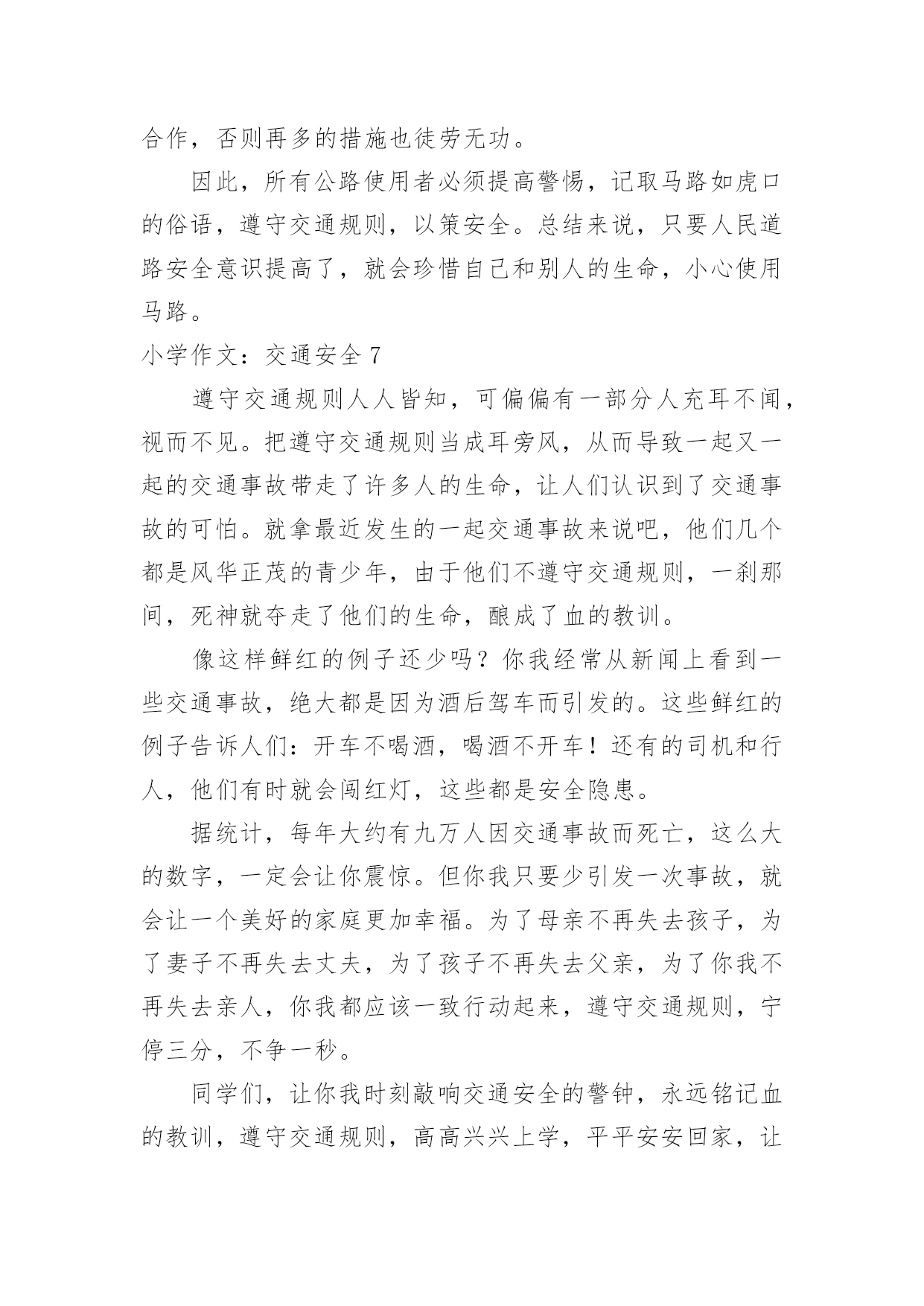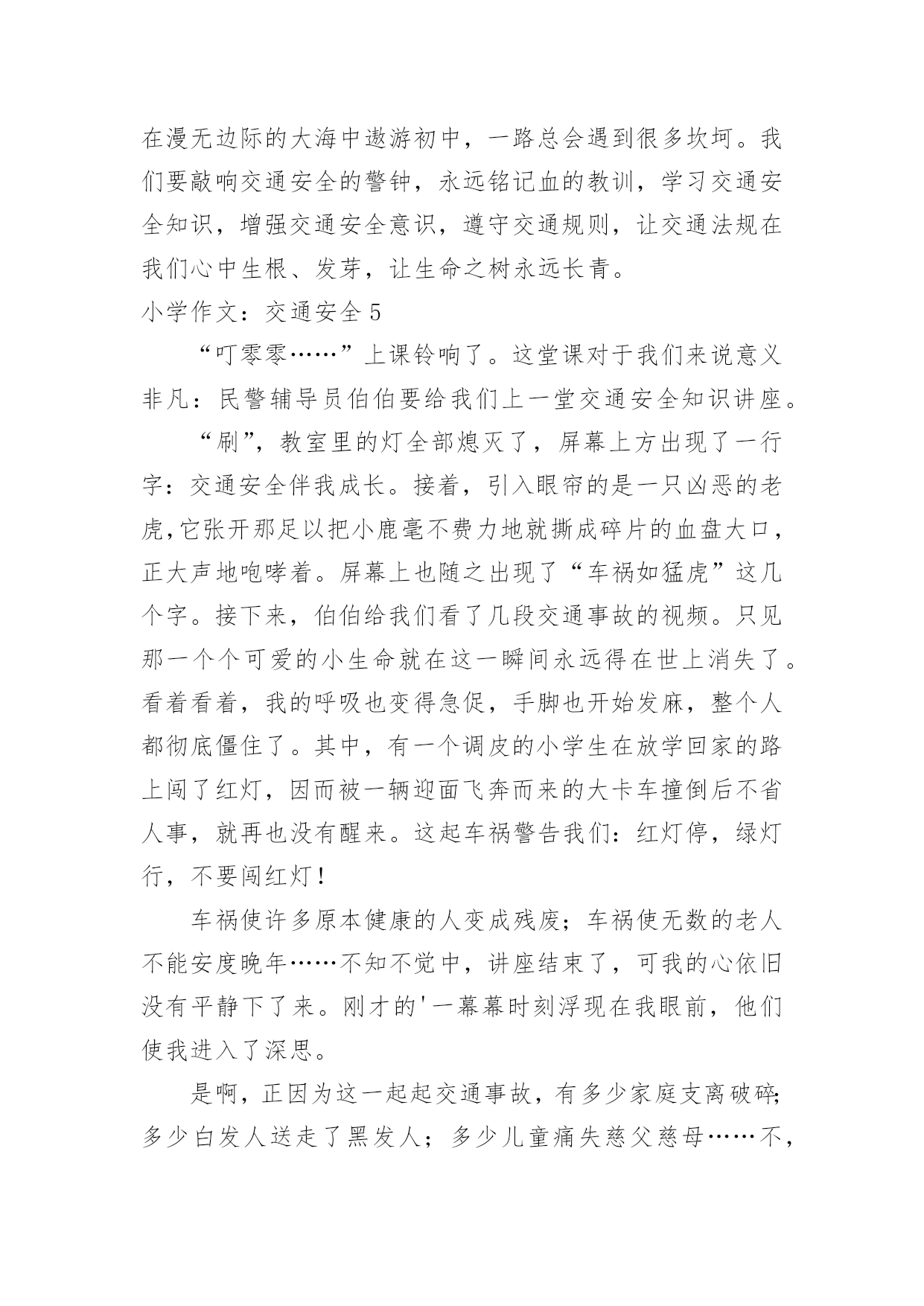 小学作文:交通安全小学作文:交通安全在日复一日的学习、工作或生活中,大家总免不了要接触或使用作文吧,作文一定要做到主题集中,围绕同一主题作深入阐述,切忌东拉西扯,主题涣散甚至无主题。相信许多人会觉得作文很难写吧,下面是小编为大家收集的小学作文:交通安全,希望能够帮助到大家。小学作文:交通安全1在生活中,左右看,不在路上跑和玩,看见红灯停一停,看见绿灯向前行。幼时,爸爸妈妈常常教导我,不要在马路上玩,不要闯红灯,黄灯慢行。长大了,在学校里,老师也常常教育我们,人车各行其道,走路要走人行道,不要闯红灯,要遵守交通法规。学校也经常举行交通安全活动,让我们收获不少。最近,我也有那一幅惊人的交通故事:那一天,我放学回家,在那个十字路口,我正要过马路,啊,绿灯了,我向左右看了看,见没汽车,就向前走去,只听“唔”的一声,我向右边一看,一辆汽车正向我飞奔而来,我进退两难,这辆车好像并没有停下来,显然,他在闯红灯,我往后一退,那辆汽车在我面前绝尘而去,尾气害得我呛了几下,我回头一看,那辆车已无影无踪,好险哪!后来,我又在报纸上看到了几则重大交通事故:8月6日,沪昆高速特大交通事故至17人死亡。8月9日傍晚,在日湖公园旁的人行道上,13岁的蓉蓉被出租车撞了,在昏迷中……现在我已经将交通规则牢牢地记在心上:当我们走在繁忙的大街上,我会拉着爸爸妈妈的手,靠街道的右边走。穿过马路时,我们先左右看再走在斑马线上;有一天,爸爸送我上学,嗨!又是红灯,虽然我心急万分,但还是提醒他不要闯红灯,爸爸也是一个遵守交通的人。朋友们:让我们一起自觉准受交通规则,让明天,更加美好。小学作文:交通安全2每当看一起起的交通事故,那一刻,我们深深的感触到人得一生真的很短暂,一定要珍惜生命,注意安全。安全事故,深究其原因,还是因为“安全整顿”没有深深地触及到每个人的灵魂,“安全第一,预防为主”的方针没有真正落到实处,部分同学还存在不健康的安全思想,认为出现安全事故是运气不好,安全意识相当淡薄。你是否明白?一起安全事故的发生,对于一个企业来讲,其损失是可以弥补的,可对于一个家庭来讲,却是一场天塌地陷的灾难。难道你真的就愿意愧对那日夜期盼你平安归来的父母吗?生命对于每个人来说只有仅仅的一次,我们没有理由不珍爱自己的生命啊!其次,我们要牢固树立“安全第一,预防为主”的思想,提高安全意识,增强安全责任心,时时刻刻绷紧“安全”这根弦,克服侥幸心理,消除麻痹大意的松懈思想,把安全工作落实到学习中。再次,我们要加强安全学习,通过学习,增强安全知识,同时吸取事故教训,做到警钟长鸣。在实际生活中,严格贯规贯制,杜绝任何误操作事故的发生。同学们,“安全防范,人人有责”这不应该只是一句口号。一个人的生命是宝贵而短暂的,大家都应该珍惜生命,远离事故,让“安全”这个永恒的主题深深烙印在我们每一个人的脑海里!让我们的每一天,每一刻都平平安安!小学作文:交通安全3安全———这个词你必须念过、写过,也必须说过。但是从类没有人真正做到过。安全在我们的生活中,好比是一颗定时炸弹,也许一不留心,就被无情的死神夺取了生命。安全的危险常在于交通中,虽然有些人谨记交通规则,可不少人还是为了方便而不遵守交通规则。我曾听说过这样一件事:有个小女孩的父亲正骑着自行车去学校接他的女儿,途中,一辆大卡车违反规定,往父亲这儿开来,自行车与大卡车相撞,小女孩的爸爸当场被死神夺走了性命,一命呜呼。他多么期望自我能活下来啊,看着自我的女儿茁壮成长……而正在学校像平常一样等她的爸爸的小女孩,突然发觉爸爸怎样还没来,是不是出事了?当她得知爸爸已经死了时,顿时撕心裂肺,扑在爸爸的尸体上,大喊着:爸爸,你不能死,你不能死!如果每个人都能做到遵守交通规则,或许就不会有这种事情发生在我们的生活中,也不会有更多的人因亲人丧生车祸中而痛苦着,为了这样,我们因行动起来,遵守交通规则,以免发生意外。行动起来,安全驾驶,并听从交警的指挥,不违反规定,使生活中少一场车祸,多一份安全。小学作文:交通安全4随着经济社会快速发展,道路通行条件不断改善,交通事业也随之迅猛发展。车辆川流不息地在公路上行驶,交通事故时时刻刻都会发生,它就像颗威力十足的炸药,一时大意,这颗埋伏在我们生活中的炸弹就会爆炸,炸得家庭破碎,炸得人心悲苦。因此,交通安全人人须知,交通规则人人要遵守。我听说过这样一个故事:有一个五年级的小学生,他的学习成绩十分优秀,在同学眼里他是个“智多星”;在老师眼里他是个“小帮手”;在父母眼里,他是个“乖宝贝”、“开心果”。有一天放学,他十分兴奋,因为他帮了老师的忙,所以老师给了他几颗奶糖。他高兴的捧着“战利品”一蹦一跳地在马路上穿行,他心里想着:这颗糖分给妈妈,这颗呢给爸爸,而这颗给我自己。而就在他准备过马路时,一辆大型中巴车飞速行驶过来,他由于想快些回家,