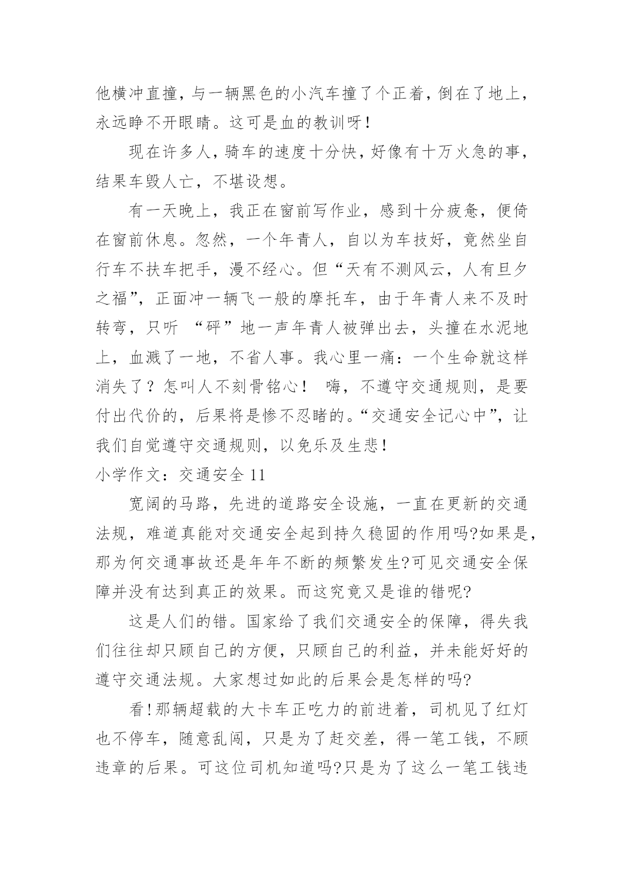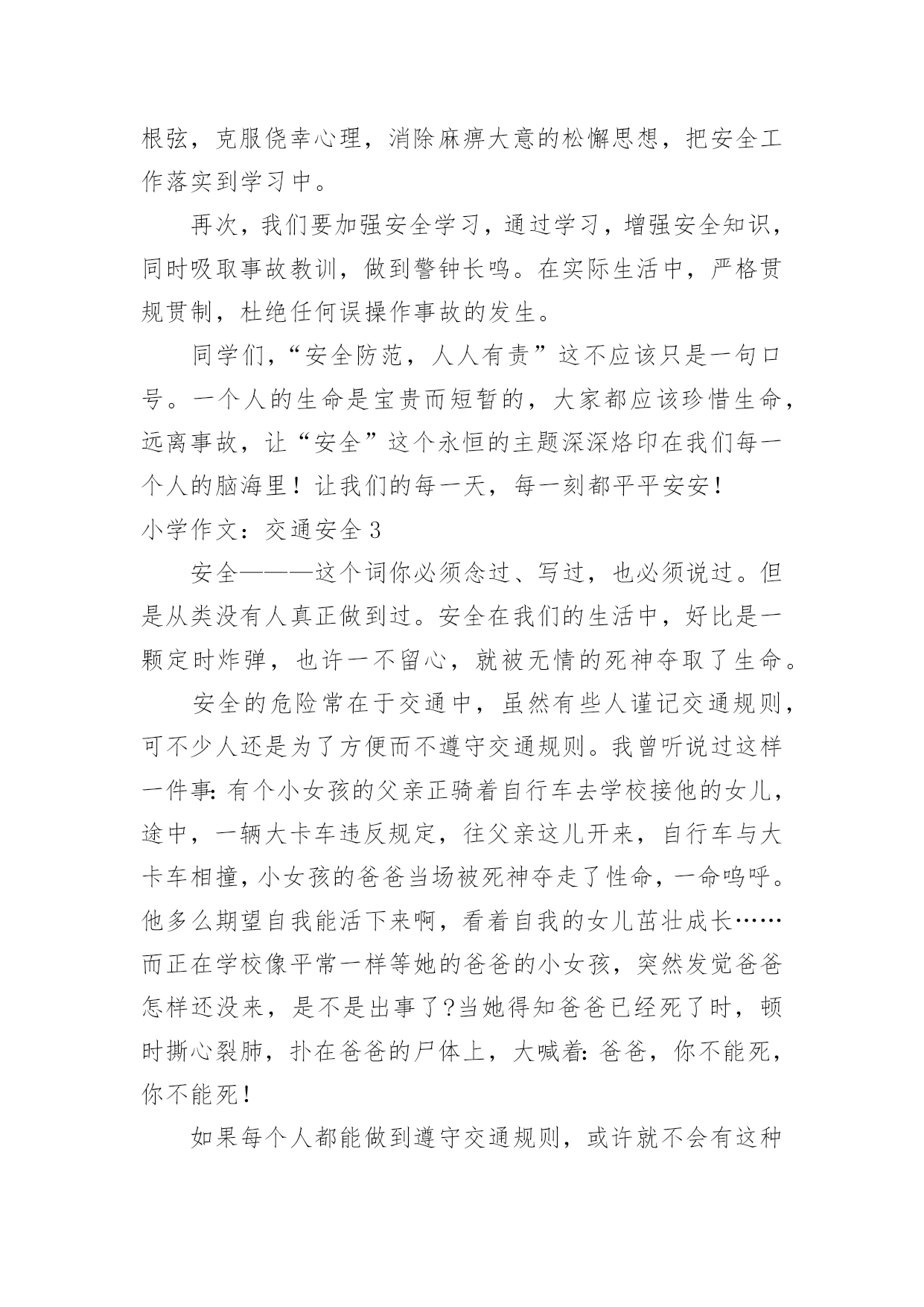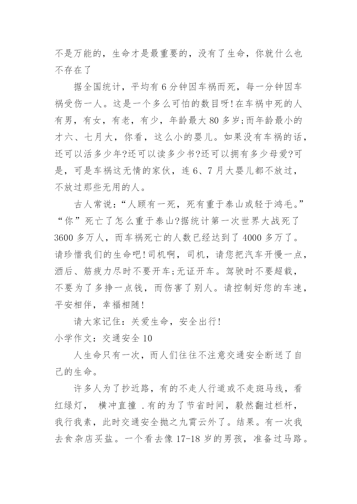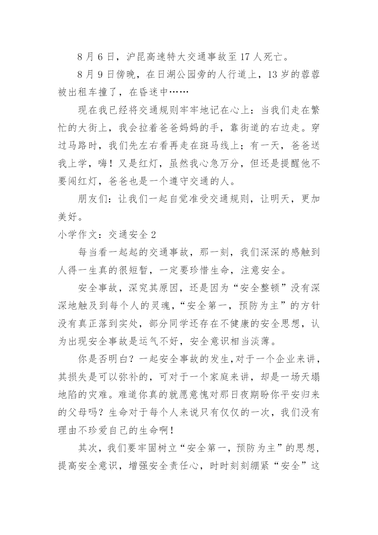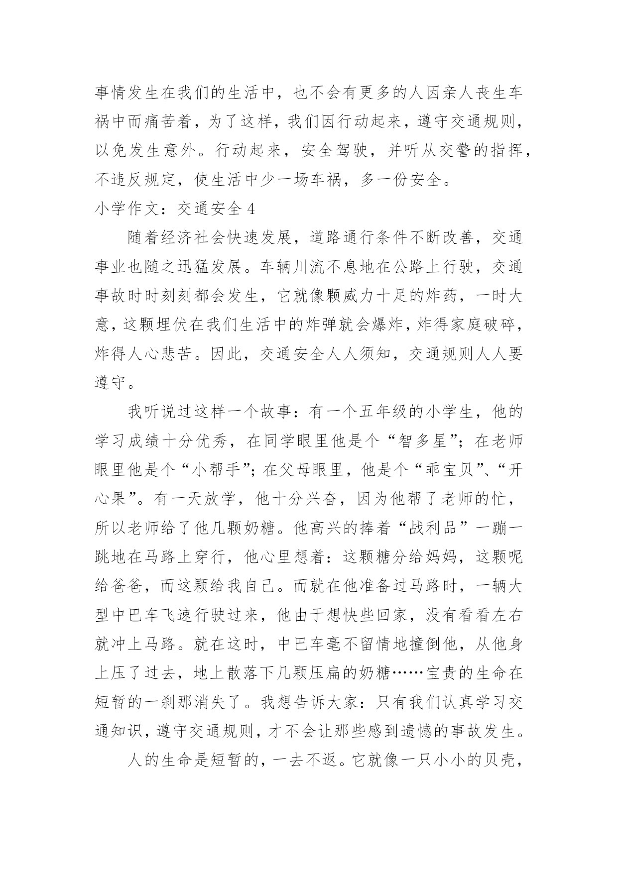 小学作文:交通安全小学作文:交通安全在日复一日的学习、工作或生活中,大家总免不了要接触或使用作文吧,作文一定要做到主题集中,围绕同一主题作深入阐述,切忌东拉西扯,主题涣散甚至无主题。相信许多人会觉得作文很难写吧,下面是小编为大家收集的小学作文:交通安全,希望能够帮助到大家。小学作文:交通安全1在生活中,左右看,不在路上跑和玩,看见红灯停一停,看见绿灯向前行。幼时,爸爸妈妈常常教导我,不要在马路上玩,不要闯红灯,黄灯慢行。长大了,在学校里,老师也常常教育我们,人车各行其道,走路要走人行道,不要闯红灯,要遵守交通法规。学校也经常举行交通安全活动,让我们收获不少。最近,我也有那一幅惊人的交通故事:那一天,我放学回家,在那个十字路口,我正要过马路,啊,绿灯了,我向左右看了看,见没汽车,就向前走去,只听“唔”的一声,我向右边一看,一辆汽车正向我飞奔而来,我进退两难,这辆车好像并没有停下来,显然,他在闯红灯,我往后一退,那辆汽车在我面前绝尘而去,尾气害得我呛了几下,我回头一看,那辆车已无影无踪,好险哪!后来,我又在报纸上看到了几则重大交通事故:8月6日,沪昆高速特大交通事故至17人死亡。8月9日傍晚,在日湖公园旁的人行道上,13岁的蓉蓉被出租车撞了,在昏迷中……现在我已经将交通规则牢牢地记在心上:当我们走在繁忙的大街上,我会拉着爸爸妈妈的手,靠街道的右边走。穿过马路时,我们先左右看再走在斑马线上;有一天,爸爸送我上学,嗨!又是红灯,虽然我心急万分,但还是提醒他不要闯红灯,爸爸也是一个遵守交通的人。朋友们:让我们一起自觉准受交通规则,让明天,更加美好。小学作文:交通安全2每当看一起起的交通事故,那一刻,我们深深的感触到人得一生真的很短暂,一定要珍惜生命,注意安全。安全事故,深究其原因,还是因为“安全整顿”没有深深地触及到每个人的灵魂,“安全第一,预防为主”的方针没有真正落到实处,部分同学还存在不健康的安全思想,认为出现安全事故是运气不好,安全意识相当淡薄。你是否明白?一起安全事故的发生,对于一个企业来讲,其损失是可以弥补的,可对于一个家庭来讲,却是一场天塌地陷的灾难。难道你真的就愿意愧对那日夜期盼你平安归来的父母吗?生命对于每个人来说只有仅仅的一次,我们没有理由不珍爱自己的生命啊!其次,我们要牢固树立“安全第一,预防为主”的思想,提高安全意识,增强安全责任心,时时刻刻绷紧“安全”这根弦,克服侥幸心理,消除麻痹大意的松懈思想,把安全工作落实到学习中。再次,我们要加强安全学习,通过学习,增强安全知识,同时吸取事故教训,做到警钟长鸣。在实际生活中,严格贯规贯制,杜绝任何误操作事故的发生。同学们,“安全防范,人人有责”这不应该只是一句口号。一个人的生命是宝贵而短暂的,大家都应该珍惜生命,远离事故,让“安全”这个永恒的主题深深烙印在我们每一个人的脑海里!让我们的每一天,每一刻都平平安安!小学作文:交通安全3安全———这个词你必须念过、写过,也必须说过。但是从类没有人真正做到过。安全在我们的生活中,好比是一颗定时炸弹,也许一不留心,就被无情的死神夺取了生命。安全的危险常在于交通中,虽然有些人谨记交通规则,可不少人还是为了方便而不遵守交通规则。我曾听说过这样一件事:有个小女孩的父亲正骑着自行车去学校接他的女儿,途中,一辆大卡车违反规定,往父亲这儿开来,自行车与大卡车相撞,小女孩的爸爸当场被死神夺走了性命,一命呜呼。他多么期望自我能活下来啊,看着自我的女儿茁壮成长……而正在学校像平常一样等她的爸爸的小女孩,突然发觉爸爸怎样还没来,是不是出事了?当她得知爸爸已经死了时,顿时撕心裂肺,扑在爸爸的尸体上,大喊着:爸爸,你不能死,你不能死!如果每个人都能做到遵守交通规则,或许就不会有这种事情发生在我们的生活中,也不会有更多的人因亲人丧生车祸中而痛苦着,为了这样,我们因行动起来,遵守交通规则,以免发生意外。行动起来,安全驾驶,并听从交警的指挥,不违反规定,使生活中少一场车祸,多一份安全。小学作文:交通安全4随着经济社会快速发展,道路通行条件不断改善,交通事业也随之迅猛发展。车辆川流不息地在公路上行驶,交通事故时时刻刻都会发生,它就像颗威力十足的炸药,一时大意,这颗埋伏在我们生活中的炸弹就会爆炸,炸得家庭破碎,炸得人心悲苦。因此,交通安全人人须知,交通规则人人要遵守。我听说过这样一个故事:有一个五年级的小学生,他的学习成绩十分优秀,在同学眼里他是个“智多星”;在老师眼里他是个“小帮手”;在父母眼里,他是个“乖宝贝”、“开心果”。有一天放学,他十分兴奋,因为他帮了老师的忙,所以老师给了他几颗奶糖。他高兴的捧着“战利品”一蹦一跳地在马路上穿行,他心里想着:这颗糖分给妈妈,这颗呢给爸爸,而这颗给我自己。而就在他准备过马路时,一辆大型中巴车飞速行驶过来,他由于想快些回家,