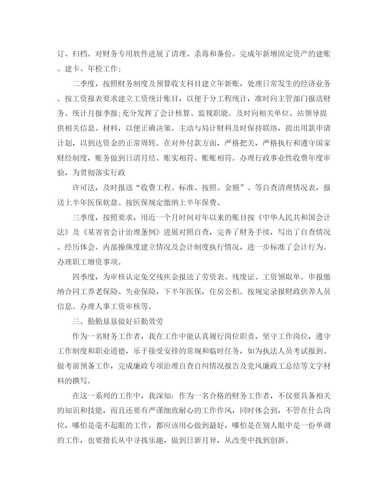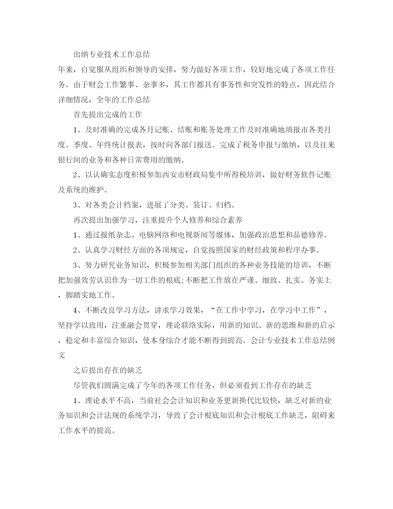 出纳专业技术工作参考总结(通用)出纳专业技术工作总结在这多年的工作经历中,借助领导及同事们的协助指导,通过本身的不断努力,我个人不管是在敬业精神、思想境地,仍然在业务素养、工作才能上都得到进一步提高,并获得了一定的工作成绩,现将本人一年以来的工作、学习情况汇报如下:一、加强学习,注重提升个人修养一是通过杂志报刊、电脑网络和电视新闻等媒体,认真学习贯彻党的道路、方针、政策,深化学习领会党的2021大、努力践行“三个代表”重要思想,不断提高了政治理论水平。加强政治思想和品德修养。二是认真学习财经、廉政方面的各项规定,自觉按照国家的财经政策和程序办事;三是努力研究业务知识,积极参加相关部门组织的各种业务技能的培训,严格按照胡主席同志提出的“勤于学习、擅长制造、乐于奉献”的要求,坚持“讲学习、讲政治、讲正气”,不断把耐得平淡、舍得付出、默默无闻作为本人的准则;不断把加强效劳认识作为一切工作的根底;不断把工作放在严谨、细致、扎实、务实上,脚踏实地工作;四是不断改良学习方法,讲求学习效果,“在工作中学习,在学习中工作”,坚持学以致用,注重融会贯穿,理论联络实际,用新的知识、新的思维和新的启示,稳定和丰富综合知识、让知识伴随年龄增长,使本身综合才能不断得到提高。二、严格履行会计岗位职责,扎实做好本职工作一年来,本人以高度的责任感和事业心,自觉服从组织和领导的安排,努力做好各项工作,较好地完成了各项工作任务。由于财会工作繁事、杂事多,其工作都具有事务性和突发性的特点,因此结合详细情况,按时间性,全年的工作如下:一季度,完成年财务决算收尾工作,办好相关事宜,办理事业年检。认真总结去年的财务工作,并为年订下了财务工作设想。对各类会计档案,进展了分类、装订、归档。对财务专用软件进展了清理、杀毒和备份。完成年新增固定资产的建账、建卡、年检工作;二季度,按照财务制度及预算收支科目建立年新账,处理日常发生的经济业务。按工资报表要求建立工资统计账目,以便于分工程统计,准时向主管部门报送财务、统计月报季报;充分发挥了会计核算、监视职能。及时向相关单位、站领导提供相关信息、材料,以便正确决策。主动与局计财科及时保持联络,提出用款申请计划,以到达资金的正常周转。在对外付款方面,严格把关,严格执行和遵守国家财经制度,账务做到日清月结、账实相符、账账相符。办理行政事业性收费年度审验,为贯彻落实行政许可法,及时报送“收费工程、标准、按照、金额”、等自查清理情况表,报送上半年医保软盘、按医保规定缴纳上半年保费、三季度,按照要求,用近一个月时间对年以来的账目按《中华人民共和国会计法》及《某省省会计治理条例》进展对照自查,完善了财务手续,写出了自查情况、经历体会、内部操纵度建立情况及会计制度执行情况,进一步标准了会计行为。办理职工增资事项。四季度,为审核认定免交残疾金报送了劳资表、残废证、工资领取单。申报缴纳合同工养老保险、失业保险,下半年医保,住房公积。按规定录报财政供养人员信息。办理人事工资审核等。三、勤勤恳恳做好后勤效劳作为一名财务工作者,我在工作中能认真履行岗位职责,坚守工作岗位,遵守工作制度和职业道德,乐于接受安排的常规和临时任务,如为执法人员考试报到、做考前预备工作,完成廉政专项治理自查自纠情况报告及党风廉政工总结等文字材料的撰写。在这一系列的工作中,我深知:作为一名合格的财务工作者,不仅要具备相关的知识和技能,而且还要有严谨细致耐心的工作作风,同时体会到,不管在什么岗位,哪怕是毫不起眼的工作,都应该用心做到最好,哪怕是在别人眼中是一份单调的工作,也要擅长从中寻找乐趣,做到日新月异,从改变中找到创新。出纳专业技术工作总结年来,自觉服从组织和领导的安排,努力做好各项工作,较好地完成了各项工作任务。由于财会工作繁事、杂事多,其工作都具有事务性和突发性的特点,因此结合详细情况,全年的工作总结首先提出完成的工作1、及时准确的完成各月记账、结账和账务处理工作及时准确地填报市各类月度、季度、年终统计报表,按时向各部门报送。完成了税务申报与缴纳,以及往来银行间的业务和各种日常费用的缴纳。2、以认确实态度积极参加西安市财政局集中所得税培训,做好财务软件记账及系统的维护。3、对各类会计档案,进展了分类、装订、归档。再次提出加强学习,注重提升个人修养和综合素养1、通过报纸杂志、电脑网络和电视新闻等媒体,加强政治思想和品德修养。2、认真学习财经方面的各项规定,自觉按照国家的财经政策和程序办事。3、努力研究业务知识,积极参加相关部门组织的各种业务技能的培训,不断把加强效劳认识作为一切工作的根底;不断把工作放在严谨、细致、扎实、务实上,脚踏实地工作。4、不断改良学习方法,讲求学习效果,“在工作中学习,在学习中工作”,坚持学以致用,注