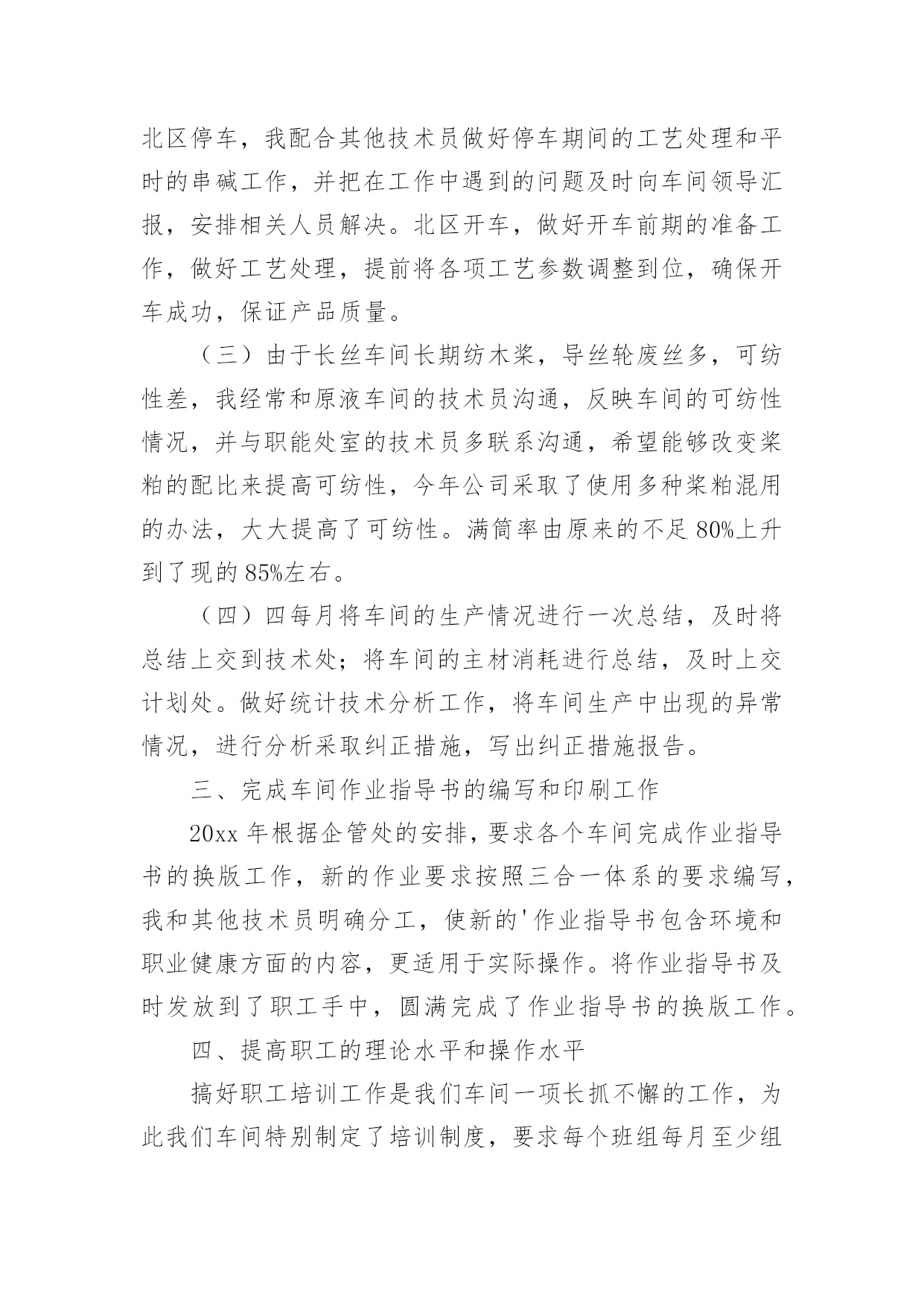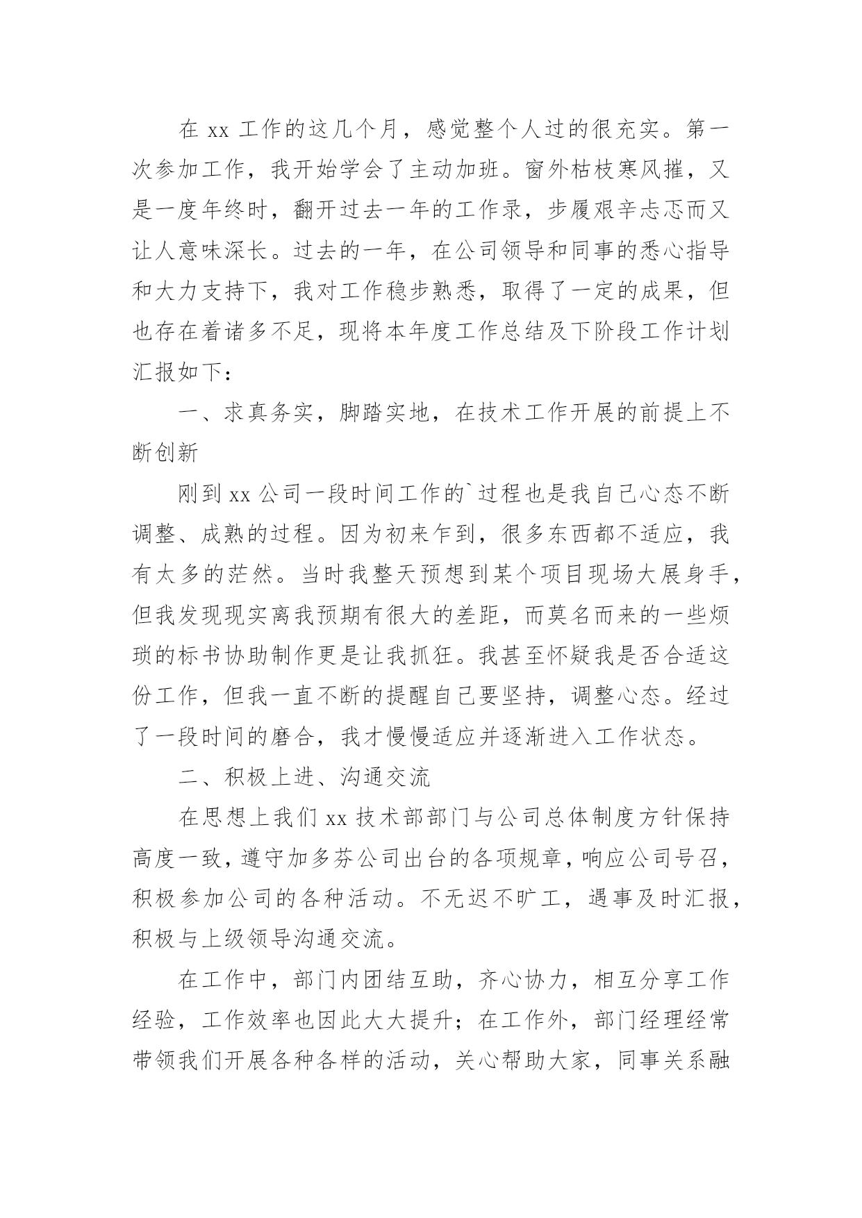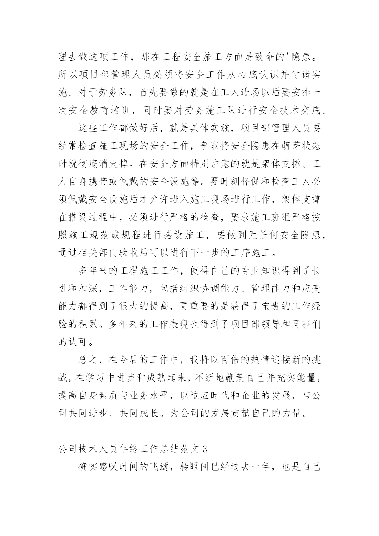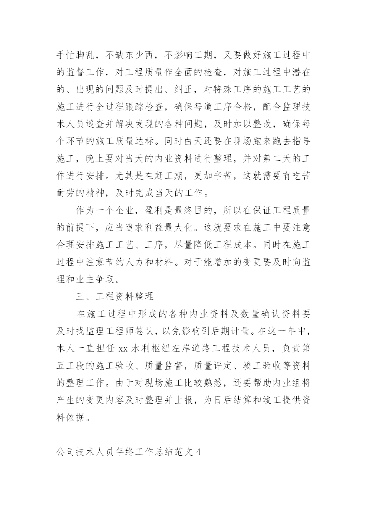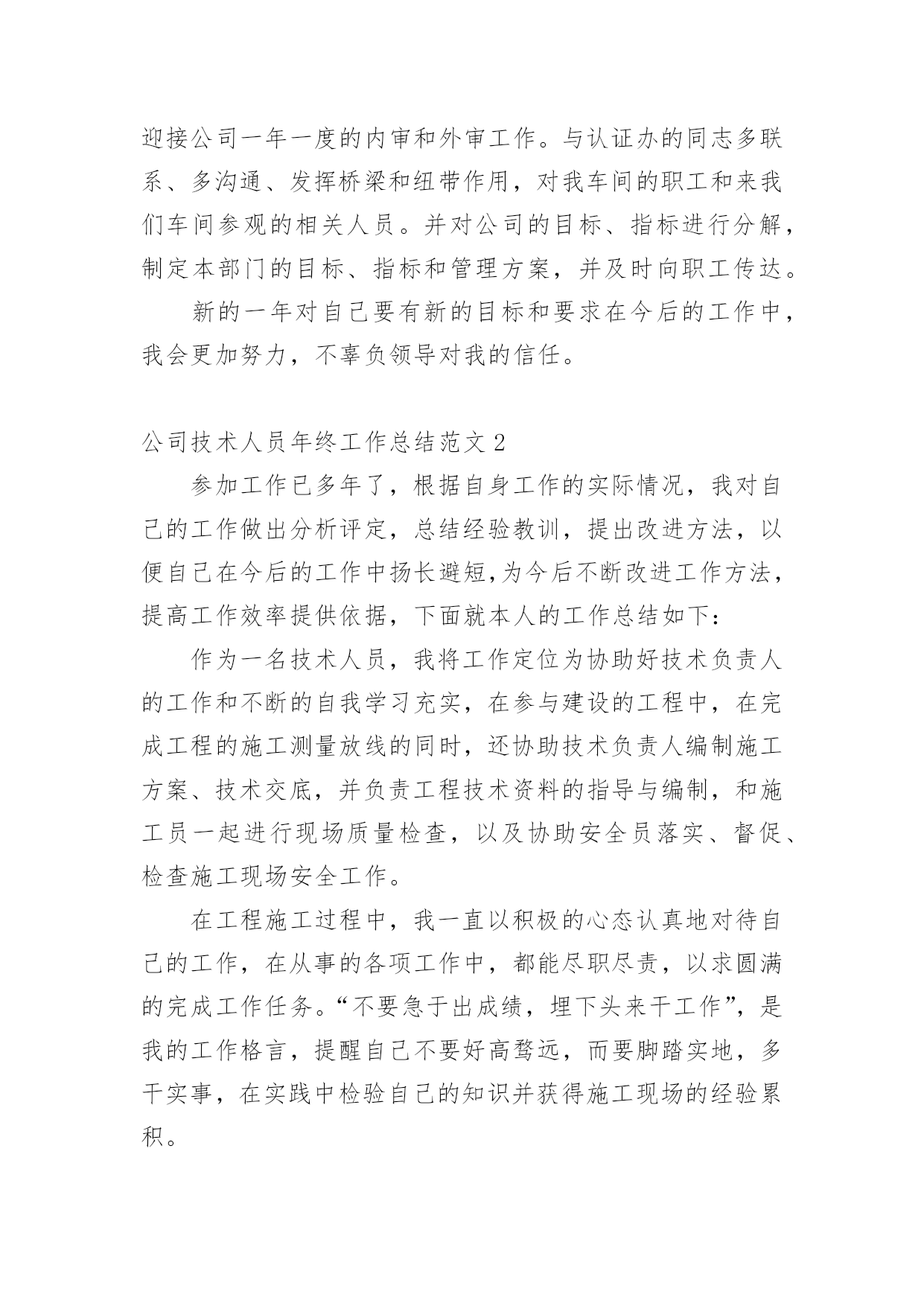 公司技术人员年终工作总结公司技术人员年终工作总结范文公司技术人员年终工作总结范文1紧张的20xx年过去了,过去的一年可以说是不平凡的一年,作为车间的一名技术人员,我在车间领导和同志们的关心和支持下,通过努力工作,为企业做出了应有的贡献。在过去的一年中,我在工作和生活中高标准要求自己,做了很多工作,现将一年来的工作总结如下:一、加强政治理论和技术知识学习在20xx年车间工作中,我紧跟时代的步伐,加强理论知识方面的学习,努力做到认识上有新提高、运用上有新收获,达到指导实践、促进工作、提高工作水平和服务能力的目的,在工作中不断的学习新技术新工艺,不断的充实自己,不断的提高自己的技术水平,来指导自己的工作。二、发扬团队合作精神(一)在平时的工作中,首先做好日常工作,我与车间其他技术员既有分工又有合作,坚持经常和其他技术员进行工作交流,充分发扬民主,杜绝独断专行,统一思想统一步骤,从而圆满完成车间的各项生产任务。20xx年配合其他技术员根据车间可纺性合理安排小修机台和换喷头机台,累计改纺xx台,十几个品种。(二)根据行业协会的精神,20xx年公司要求长丝车间北区停车,我配合其他技术员做好停车期间的工艺处理和平时的串碱工作,并把在工作中遇到的问题及时向车间领导汇报,安排相关人员解决。北区开车,做好开车前期的准备工作,做好工艺处理,提前将各项工艺参数调整到位,确保开车成功,保证产品质量。(三)由于长丝车间长期纺木桨,导丝轮废丝多,可纺性差,我经常和原液车间的技术员沟通,反映车间的可纺性情况,并与职能处室的技术员多联系沟通,希望能够改变桨粕的配比来提高可纺性,今年公司采取了使用多种桨粕混用的办法,大大提高了可纺性。满筒率由原来的不足80%上升到了现的85%左右。(四)四每月将车间的生产情况进行一次总结,及时将总结上交到技术处;将车间的主材消耗进行总结,及时上交计划处。做好统计技术分析工作,将车间生产中出现的异常情况,进行分析采取纠正措施,写出纠正措施报告。三、完成车间作业指导书的编写和印刷工作20xx年根据企管处的安排,要求各个车间完成作业指导书的换版工作,新的作业要求按照三合一体系的要求编写,我和其他技术员明确分工,使新的'作业指导书包含环境和职业健康方面的内容,更适用于实际操作。将作业指导书及时发放到了职工手中,圆满完成了作业指导书的换版工作。四、提高职工的理论水平和操作水平搞好职工培训工作是我们车间一项长抓不懈的工作,为此我们车间特别制定了培训制度,要求每个班组每月至少组织两次职工培训,开展形式多样的职工培训,对于新工转岗工要求有师带徒合同,由技术员鉴定合格后方可独立上岗。今年组织职工做三合一体系知识答卷,加强了职工对三合一体系知识的了解。又利用业余时间组织职工进行三合一体系知识的学习,使职工对公司的方针目标有更好理解等,为公司内审和外审打下良好基础。配合各工段班组搞好青工技术比赛,提高职工实际操作技能。加强新版作业指导书的学习,组织我车间全体职工全部进行了理论知识考试。提高了职工理论知识。xx职工坚持第二个早班学习,由于xx纺丝工是控制车间产品质量的关键岗位。平时很注重纺丝工工艺知识的学习,对影响产品质量的主要工艺要让职工明白,反复的给职工讲,尤其是总经理走访客户后,带回来的脆断丝筒子,让职工亲自感受脆断丝给用户带来损失,让职工在工作中如何避免脆断丝的产生,始终给职工敲响警钟,增强职工在工作中的责任感。五、推进三合一体系在车间的有效运行在过去的一年中积极推进三个体系在本部门的有效运行,认真学习相关的管理和技术知识,编制本部门的年度审核计划,并按照计划组织部门的内审工作,组织车间有关人员对车间的危险源和环境因素进行了重新辨识和完善,对车间的法律法规清单等相关文件进行更新,规范各种报表记录。邀请其他兄弟部门和相关职能处室内审员对本部门进行内部审核,对审核中别人提出的问题,提出改进的议建和建议,推进三合一管理体系在本部门的不断完善和改进,来迎接公司一年一度的内审和外审工作。与认证办的同志多联系、多沟通、发挥桥梁和纽带作用,对我车间的职工和来我们车间参观的相关人员。并对公司的目标、指标进行分解,制定本部门的目标、指标和管理方案,并及时向职工传达。新的一年对自己要有新的目标和要求在今后的工作中,我会更加努力,不辜负领导对我的信任。公司技术人员年终工作总结范文2参加工作已多年了,根据自身工作的实际情况,我对自己的工作做出分析评定,总结经验教训,提出改进方法,以便自己在今后的工作中扬长避短,为今后不断改进工作方法,提高工作效率提供依据,下面就本人的工作总结如下:作为一名技术人员,我将工作定位为协助好技术负责人的工作和不断的自我学习充实,在参与建设的工程中,在完成工程的施工测量放线的同时,还协助技术负责人编制施工方案、技术交底,并负责工程技术资料